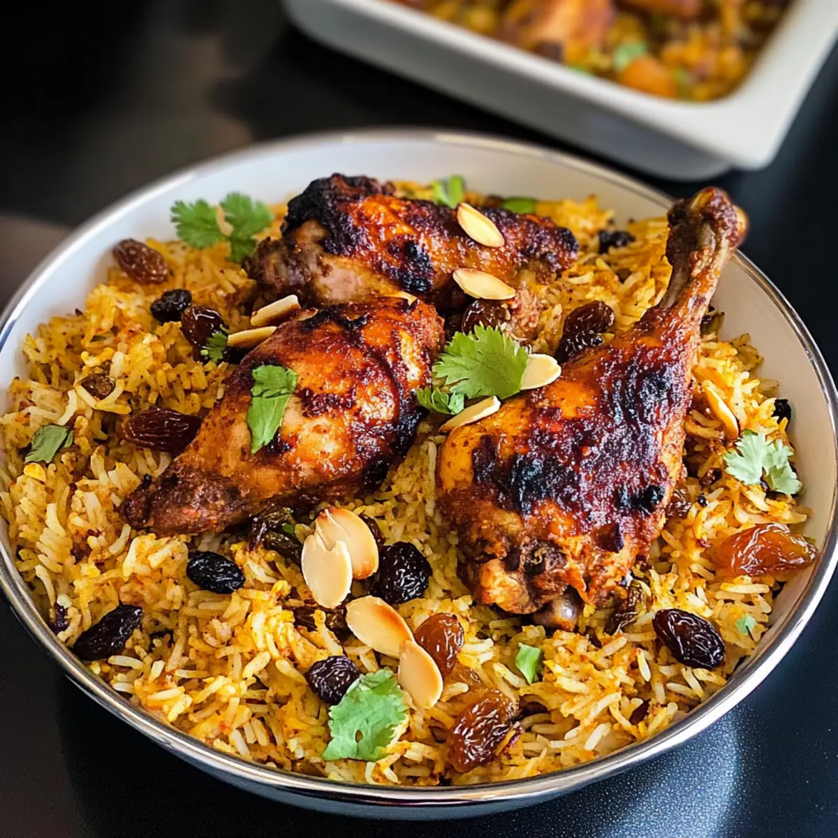 Beim ersten Bissen von Hühnchen Kabsa fühle ich mich sofort in die lebendigen Märkte des Nahen Ostens versetzt, wo die Luft von Gewürzen und köstlichen Aromen erfüllt ist. Dieses traditionelle Gericht vereint perfekt gewürztes, gegrilltes Hühnchen und duftenden Basmati-Reis zu einem wunderbaren Festmahl, das sowohl für den Alltag als auch für besondere Anlässe geeignet ist. Mit seinen intensiven Aromen ist Hühnchen Kabsa nicht nur ein echter Geschmacksgewinner, sondern auch ein unkompliziertes One-Pot-Gericht, das dir Zeit beim Kochen spart und dir die Möglichkeit gibt, mehr Zeit mit deinen Lieben zu verbringen. Bist du bereit, dein Abendessen in eine aromatische Entdeckungsreise zu verwandeln? Lass uns gemeinsam in die Welt des Hühnchen Kabsa eintauchen! Warum ist Hühnchen Kabsa ein Muss? Aromatische Genüsse: Der intensive Gewürzmix verleiht jedem Bissen eine umwerfende Geschmackskomplexität. Einfache Zubereitung: Als unkompliziertes One-Pot-Gericht spart es Zeit beim Kochen und Aufräumen. Vielfältige Variationen: Du kannst mit verschiedenen Zutaten experimentieren, wie z.B. Lamm oder Gemüse. Festliche Stimmung: Perfekt für besondere Anlässe oder ein gemütliches Abendessen mit Freunden und Familie. Sättigende Köstlichkeit: Das saftige Hühnchen auf dem flauschigen Basmati-Reis wird deine Gäste begeistern und ein Gefühl von Heimat erzeugen. Hühnchen Kabsa Zutaten Für die Gewürzmischung: Gemahlener Kardamom – ¼ tsp – Fügt eine blumige Note hinzu, die das Gericht aufwertet. Weißer Pfeffer – Nach Geschmack – Gibt eine subtile Schärfe, die ausgewogen ist. Safran – Eine Prise – Bringt eine goldene Farbe und ein einzigartiges Aroma. Gemahlener Zimt – ½ tsp – Verleiht dem Gericht eine warme, süße Note. Allgewürz – Nach Geschmack – Rundet die Aromen harmonisch ab. Dörre Limette – 1 Stück – Sorgt für eine frische, säuerliche Note. Für die Basis: Öl oder Butter – 2 EL – Eignet sich hervorragend zum Anbraten und für zusätzlichen Geschmack. Verwende Olivenöl für eine leichtere Option. Zwiebeln – 3, in Scheiben geschnitten – Fügen eine süße und herzhafte Balance hinzu. Schalotten können als Ersatz verwendet werden. Frischer Ingwer – 1 EL, gehackt – Bringt eine angenehme Schärfe. Verwende frischen Ingwer für den besten Geschmack. Knoblauch – 1 EL, gehackt – Gibt ein reichhaltiges Aroma. Kann durch Knoblauchpulver ersetzt werden. Grüne Chili – 1 Stück – Bringt eine angenehme Schärfe. Für eine mildere Variante einfach weglassen. Getrocknete Lorbeerblätter – 2 Stück – Kombiniert sich gut mit dem Reis und verstärkt das Aroma. Thymian oder Oregano können als Ersatz dienen. Gewürznelken – 6 Stück – Verleihen dem Gericht eine warme Gewürznote. Verwende weniger, wenn du es milder magst. Kardamomkapseln – 4 Stück – Fügen florale Noten hinzu. Gemahlener Kardamom kann ebenfalls verwendet werden. Zimtstange – 1 Stück – Gibt Wärme und Süße. Gemahlener Zimt ist eine praktikable Alternative. Tomatenmark – 2 EL – Hilft bei der Erstellung einer reichhaltigen Sauce. Dosentomaten sind ein guter Ersatz. Muskatnuss – 1 Prise – Bereichert das Geschmacksprofil. Kann weggelassen werden, wenn nicht vorhanden. Schwarzer Pfeffer – ½ tsp – Fügt eine angenehme Schärfe hinzu. Nach Geschmack anpassen. Kreuzkümmel – ¼ tsp – Bietet einen erdigen Geschmack. Koriander kann ebenfalls verwendet werden. Koriander – ½ tsp – Bringt Frische und Leichtigkeit. Kann reduziert oder weggelassen werden, wenn gewünscht. Karotten – 3, dünn geschnitten – Fügen Süße und Farbe hinzu. Erwäge die Verwendung von Erbsen als Alternative. Dosentomaten – 200 g oder 3 frische, gehackte Tomaten – Sorgen für Feuchtigkeit und Säure. Hühnerbrühewürfel – 2 Stück – Verbessert den Geschmack der Brühe. Selbstgemachte Brühe ist ebenfalls eine hervorragende Wahl. Ganzes Hühnchen – 1,5 kg, in 6 Stücke geschnitten – Das Hauptprotein für das Gericht. kann durch Hühnchenschenkel oder -brust ersetzt werden. Basmati-Reis – 3 Tassen, gewaschen – Bietet ein einzigartiges Aroma und eine besondere Textur. Langkornreis als Alternative ist im Notfall möglich. Rosinen – ¼ Tasse – Bringt eine leichte Süße. Kann weggelassen werden, wenn nicht gewünscht. Wasser – Nach Bedarf zum Kochen des Reises. Salz – Nach Geschmack. Optionale Garnituren: – Rosinen und gehobelte Mandeln für zusätzliche Textur und eine ansprechende Präsentation. Entdecke die Tiefen des Geschmacks mit Hühnchen Kabsa! Step-by-Step Instructions for Hühnchen Kabsa Step 1: Gewürzmischung vorbereiten Vermische in einer Schüssel alle Zutaten für die Kabsa-Gewürzmischung, einschließlich gemahlenem Kardamom, Zimt und allgewürz, und stelle die Mischung beiseite. Diese Gewürze bilden die geschmackliche Grundlage für dein Hühnchen Kabsa und sorgen für ein unverwechselbares Aroma. Step 2: Aromatische Zutaten anbraten Erhitze in einem großen, schwerbodigen Topf bei mittlerer bis hoher Hitze 2 Esslöffel Öl oder Butter. Gib die in Scheiben geschnittenen Zwiebeln, den gehackten Ingwer, den Knoblauch und die grüne Chili hinzu und brate die Mischung 5–7 Minuten lang an, bis die Zwiebeln goldbraun und weich sind. Step 3: Ganze Gewürze hinzufügen Füge die Lorbeerblätter, Gewürznelken, Kardamomkapseln und die Zimtstange in den Topf und brate sie 1 Minute lang mit den anderen Zutaten an. Dies aktiviert die Aromen der Gewürze sowie die des aromatischen Gemüses und bringt die Geschmäcker des Hühnchen Kabsa noch besser zur Geltung. Step 4: Tomaten und Gewürze einmischen Mische 2 Esslöffel Tomatenmark sowie die gemahlenen Gewürze (Muskatnuss, schwarzen Pfeffer, Kreuzkümmel und Koriander) unter die Mischung. Würze mit Salz und koche alles für 1–2 Minuten, bis die Aromen gut miteinander verbunden sind. Diese Grundlage sorgt für eine reiche Soße, die das Hühnchen und den Reis umhüllt. Step 5: Huhn 