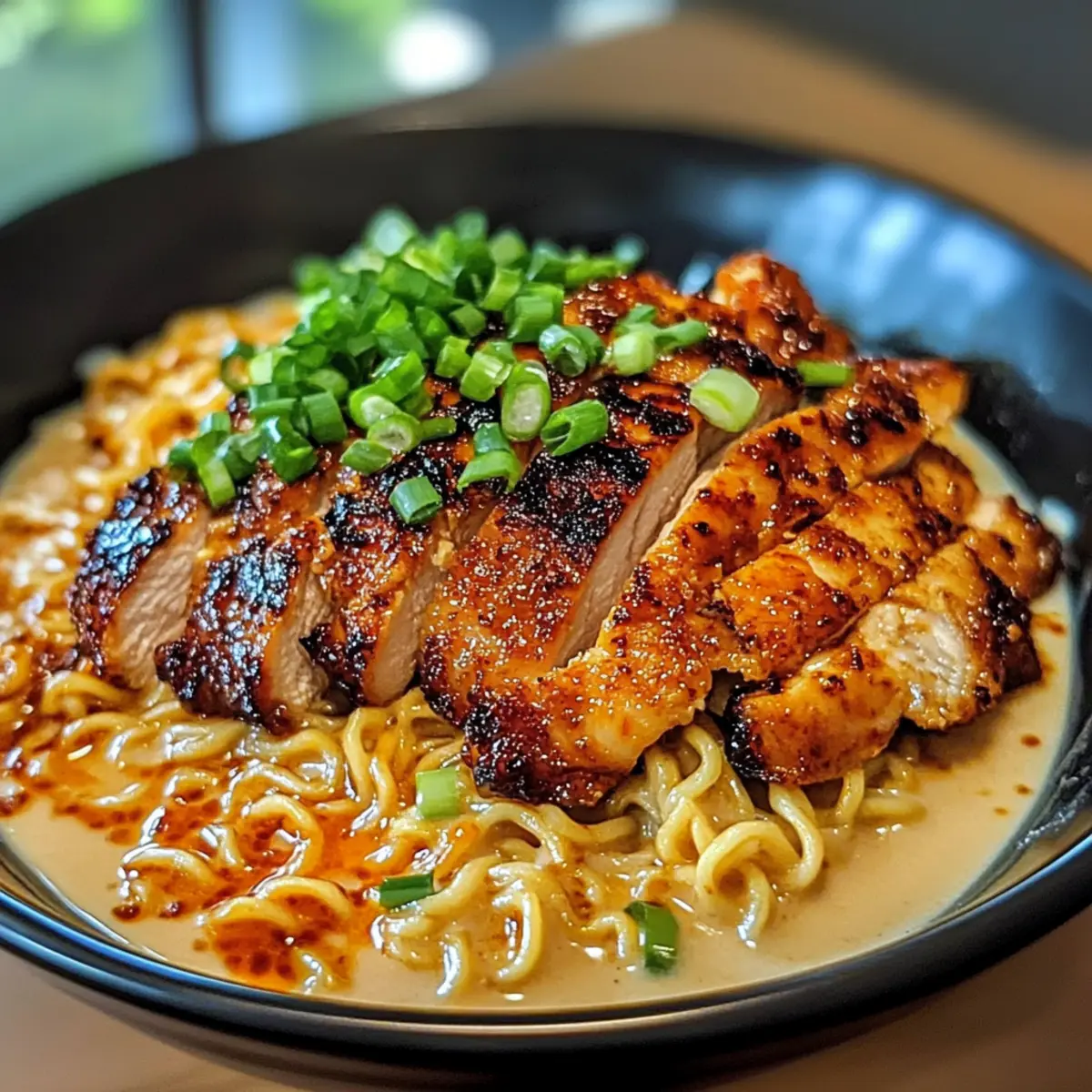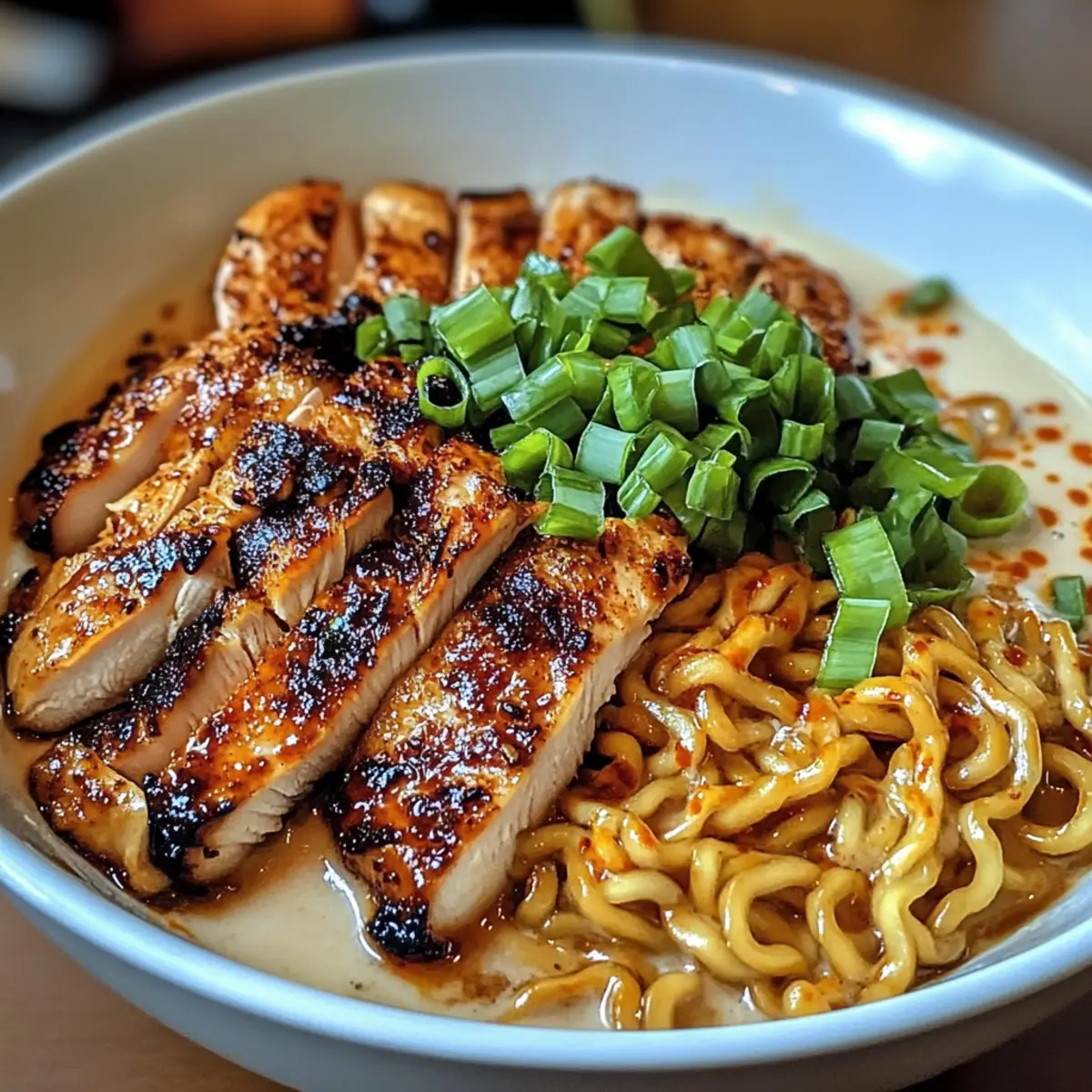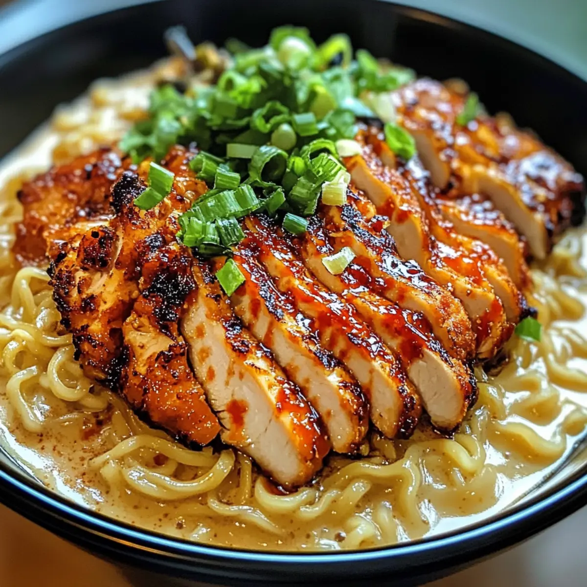 Als ich das letzte Mal in einem kleinen, versteckten Ramen-Laden saß, überkam mich die unverwechselbare Kombination aus würzigem Chili und dem sanften Umarmungseffekt einer cremigen Knoblauchsauce. Dieser Moment inspirierte mich, mein eigenes Rezept für Hühnchen Ramen mit cremiger Knoblauchsauce zu kreieren. Es ist nicht nur ein schnelles Gericht, das in nur 30-40 Minuten zubereitet werden kann, sondern es bietet auch die perfekte Balance zwischen Komfort und aufregendem Genuss. Egal, ob Sie nach einem einfachen Abendessen nach einem langen Tag oder einem Menü für Ihre Freunde suchen, dieses Rezept ist vielseitig und kann leicht variieren, um jede Vorliebe zu erfüllen – sogar für Vegetarier! Wer könnte da widerstehen? Lassen Sie uns gemeinsam in diese geschmackliche Entdeckungsreise eintauchen! Warum werden Sie dieses Rezept lieben? Einfachheit: Die Zubereitung ist unkompliziert und benötigt nur grundlegende Kochkenntnisse. In weniger als 40 Minuten können Sie ein vollwertiges Gericht auf den Tisch bringen. Würzige Geschmacksexplosion: Die Kombination aus Chili und der samtigen Knoblauchsauce sorgt für einen unverwechselbaren, würzigen Genuss, der alle Sinne belebt. Vielseitigkeit: Ob Sie Hühnchen, Tofu oder Pilze bevorzugen – dieses Rezept passt sich Ihren Wünschen an. Komfort in jeder Schüssel: Es vereint die herzhaften Texturen von Ramen und die cremige Sauce, die all Ihre Erwartungen übertreffen wird. Geselliges Essen: Perfekt für ein entspanntes Abendessen mit Freunden oder ein schnelles Mittagessen – jeder wird sich nach mehr sehnen! Für weitere köstliche Ideen, die Sie ausprobieren können, schauen Sie sich mein Rezept für Spinatauflauf Mit Käse oder die herzhaften Butterbohnen Mit Kräutern an! Hühnchen Ramen mit cremiger Knoblauchsauce Zutaten • Hühnchen: Boneless, skinless thighs – Saftiger und zarter Geschmack; Sie können auch Hühnerbrust für eine magerere Option nutzen. • Chili-Pulver: Für Schärfe – Substitute mit geräuchertem Paprika für eine mildere Würze. • Paprika: Für den Geschmack – Fügen Sie eine zusätzliche Tiefe hinzu. • Salz & Pfeffer: Zum Würzen – Verstärkt den Gesamteindruck der Aromen. • Pflanzenöl: Für das Anbraten – Ideal, um das Hühnchen schön zu bräunen. • Hühnerbrühe: Basis der Brühe – Kann durch Gemüsebrühe ersetzt werden, um eine vegetarische Variante zu kreieren. • Sojasauce: Für Umami – Fügt eine herzhaften Tiefe zur Brühe hinzu. • Sesamöl: Für nussiges Aroma – Kann bei Bedarf durch Olivenöl ersetzt werden. • Knoblauch: Für aromatische Tiefe – Verwenden Sie frischen, gehackten Knoblauch für den besten Geschmack. • Schlagsahne: Für die cremige Textur – Passt sich an; fügen Sie mehr Sahne hinzu, um die Brühe dicker zu machen. • Ramen-Nudeln: Kohlenhydratquelle – Bei Vorliebe auch Udon- oder Soba-Nudeln verwenden. • Frühlingszwiebeln: Zur Garnitur – Bringen Sie Frische ins Gericht. • Chiliöl (optional): Für zusätzlichen Kick – Kann weggelassen werden, wenn Sie es milder mögen. Schritt-für-Schritt-Anleitung für Hühnchen Ramen mit cremiger Knoblauchsauce Step 1: Hühnchen marinieren Mischen Sie in einer Schüssel Chili-Pulver, Paprika, Salz und schwarzen Pfeffer. Reiben Sie das Hühnchen großzügig mit der Gewürzmischung ein und lassen Sie es 15 Minuten marinieren, damit die Aromen gut einziehen können. Bereiten Sie währenddessen eine Pfanne für das Anbraten vor. Step 2: Hühnchen anbraten Erhitzen Sie Pflanzenöl in einer großen Pfanne bei mittlerer bis hoher Hitze. Fügen Sie das marinierte Hühnchen hinzu und braten Sie es etwa 5-7 Minuten pro Seite an, bis es goldbraun und durchgegart ist. Wenn das Hühnchen eine Innentemperatur von 75 °C erreicht hat, nehmen Sie es aus der Pfanne und lassen Sie es kurz ruhen, bevor Sie es in Scheiben schneiden. Step 3: Cremige Knoblauchsauce zubereiten In einem kleinen Topf bei mittlerer Hitze Butter schmelzen. Fügen Sie den gehackten Knoblauch hinzu und sautieren Sie ihn, bis er duftet (ca. 1-2 Minuten). Gießen Sie die Schlagsahne dazu und lassen Sie die Mischung leicht köcheln, bis sie etwas eindickt, etwa 3-5 Minuten. Stellen Sie die Sauce dann beiseite. Step 4: Ramen-Nudeln kochen Bringen Sie in einem großen Topf ausreichend Wasser zum Kochen. Fügen Sie die Ramen-Nudeln hinzu und kochen Sie sie entsprechend den Anweisungen auf der Verpackung (in der Regel 3-4 Minuten). Sobald sie al dente sind, gießen Sie die Nudeln ab und stellen Sie sie aside. Step 5: Würzige Brühe herstellen In einem großen Topf bei mittlerer Hitze Sesamöl erwärmen. Geben Sie den restlichen gehackten Knoblauch hinzu und sautieren Sie ihn kurz. Anschließend fügen Sie die Hühnerbrühe, Sojasauce und etwas von der Schlagsahne hinzu und lassen das Ganze 5-7 Minuten sanft köcheln. Rühren Sie gelegentlich um, bis die Brühe knapp anfängt zu köcheln. Step 6: Ramen-Bowl anrichten Teilen Sie die Ramen-Nudeln gleichmäßig auf Schüsseln auf. Gießen Sie die köstliche Brühe über die Nudeln, legen Sie die in Scheiben geschnittenen Hühnchenstücke darauf und träufeln Sie die cremige Knoblauchsauce darüber. Garnieren Sie jede Schüssel mit frischen Frühlingszwiebeln und optionalem Chiliöl für einen letzten Kick. Aufbewahrungstipps für Hühnchen Ramen mit cremiger Knoblauchsauce Zimmertemperatur: Lassen Sie gekochte Ramen-Nudeln nicht länger als 2 Stunden bei Raumtemperatur stehen, um eine Vermehrung von Bakterien zu vermeiden. Kühlschrank: Bewahren Sie die Reste des Hühnchen Ramen mit cremiger Knoblauchsauce in einem luftdichten Behälter im Kühlschrank auf, wo sie bis zu 3 Tage frisch bleiben. Gefrierfach: Packen Sie die Brühe und das Hühnchen in separate luftdichte Gefrierbehälter, um sie bis zu 3 Monate einzufrieren. Die Ramen-Nudeln sollten nicht eingefroren werden, da sie beim Auftauen matschig werden können. Wiederaufwärmen: Erwärmen Sie die Brühe auf dem Herd oder in der Mikrowelle un