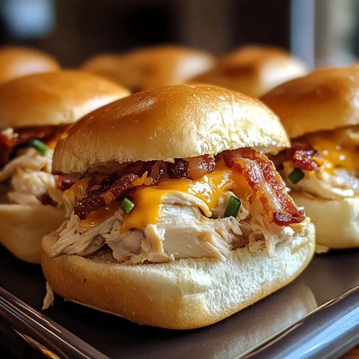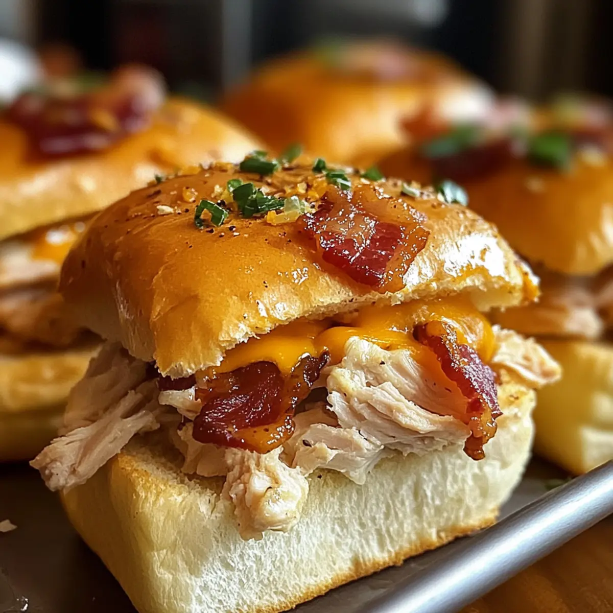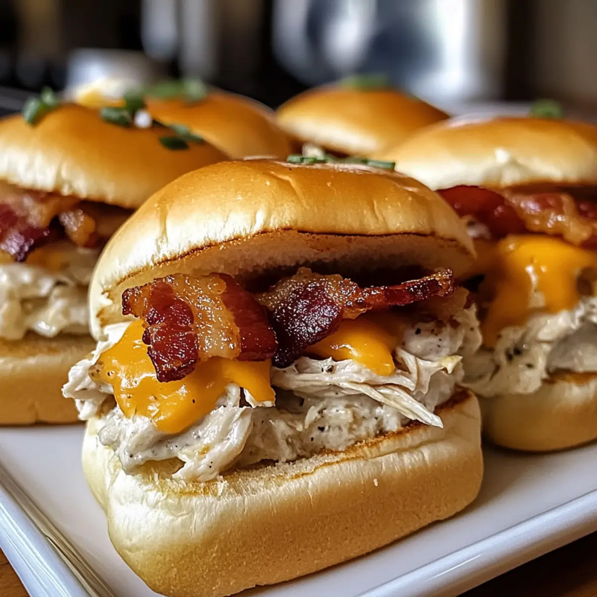 Ein köstlicher Duft schwebt durch die Küche. Es sind die zarten Hühnchen Speck Ranch Schieber, die sich gerade vorbereiten und das Wasser im Mund zusammenlaufen lassen! Diese kleinen Leckerbissen vereinen zartes, zerrissenes Hühnchen, knusprigen Speck und cremiges Ranch-Dressing in einem weichen Brötchen – ideal für gesellige Abende oder Spieleabende mit Freunden. Einer der großartigen Vorteile dieser Rezeptidee ist die schnelle Zubereitungszeit von nur 40 Minuten, sodass du mehr Zeit mit deinen Lieben verbringen kannst. Außerdem sind sie anpassbar – füge deine Lieblingszutaten hinzu oder wechsle die Dressings für einen abwechslungsreichen Genuss. Wer könnte da widerstehen? Lass uns gemeinsam in die Welt dieser köstlichen Sliders eintauchen! Warum sind Hühnchen Speck Ranch Schieber so beliebt? Köstlicher Geschmack: Die Kombination aus zartem Hühnchen, knusprigem Speck und cremigem Ranch-Dressing sorgt für ein Geschmackserlebnis, das alle begeistert. Schnelle Zubereitung: In nur 40 Minuten kannst du ein köstliches Gericht zaubern, ideal für spontane Zusammenkünfte oder gesellige Abende. Vielseitigkeit: Du kannst die Zutaten nach Belieben anpassen – ob mit verschiedenen Käsesorten oder zusätzlichen frischen Zutaten wie Avocado und Jalapeños, die Möglichkeiten sind endlos! Perfekt für jede Gelegenheit: Ob als Snack für einen Filmabend oder auf einer Party, diese Sliders ziehen die Blicke auf sich und hinterlassen einen bleibenden Eindruck. Zusätzlich könntest du sie mit einem frischen Huehnchen Ranch Salat servieren, um dein Menü zu erweitern! Hühnchen Speck Ranch Schieber Zutaten • Bereite dich auf köstliche Geschmackserlebnisse vor! Für die Brötchen • Slider Brötchen – Verwende weiche weiße oder Vollkornbrötchen für die perfekte Basis. Für die Füllung • Hähnchenbrust – Hauptproteinquelle, zart und zerrissen; für eine leichtere Variante kannst du auch Truthahn verwenden. • Speck – Fügt einen knusprigen, salzigen Geschmack hinzu, der das Hähnchen ergänzt; Türkenbacon ist eine gesündere Alternative. • Ranch-Dressing – Sorgt für eine cremige Textur und würzigen Geschmack; du kannst es durch jede cremige Soße oder selbstgemischtes Ranch-Dressing ersetzen. • Geriebener Cheddar-Käse – Geschmolzener Käse sorgt für zusätzlichen Geschmack und Fülle; probiere verschiedene Käsesorten wie Pepper Jack für ein wenig Schärfe. • Olivenöl – Zum Braten des Hähnchens verwendet; kann durch Raps- oder Gemüseöl ersetzt werden. Für die Gewürze • Knoblauchpulver – Verleiht extra Geschmack; nutze es je nach Geschmack. • Zwiebelpulver – Ergänzt die Gewürze für ein ausgewogenes Aroma. • Paprika – Fügt eine leichte Süße und Farbe hinzu. • Salz und Pfeffer – Grundlegende Gewürze, um das Hähnchen zu würzen; passe die Mengen nach deinem Geschmack an. Diese Hühnchen Speck Ranch Schieber sind nicht nur köstlich, sondern auch anpassbar und ideal für jede Zusammenkunft! Schritt-für-Schritt-Anleitung für Hühnchen Speck Ranch Schieber Step 1: Ofen vorheizen Heize den Ofen auf 175 °C (350 °F) vor. Dies ist wichtig, um sicherzustellen, dass deine Hühnchen Speck Ranch Schieber gleichmäßig und schnell garen. Eine gute Vorheizzeit von etwa 10 Minuten hilft deinem Gericht, die perfekte Konsistenz zu erreichen, sobald es in den Ofen kommt. Step 2: Hähnchenbrust zubereiten Würze die Hähnchenbrust mit Knoblauchpulver, Zwiebelpulver, Paprika, Salz und Pfeffer. Erhitze in einer Pfanne bei mittlerer Hitze etwas Olivenöl und brate das Hähnchen 6-7 Minuten auf jeder Seite an, bis es goldbraun und durchgegart ist. Achte darauf, dass die Innentemperatur 75 °C (165 °F) nicht überschreitet, um das Fleisch zart zu halten. Step 3: Hähnchen zerkleinern und mischen Nehme das Hähnchen aus der Pfanne und lasse es einige Minuten abkühlen. Zerkleinere das Fleisch anschließend in einer Schüssel und vermische es gründlich mit dem Ranch-Dressing, bis es gut durchzogen ist. Diese Mischung bildet die köstliche Füllung für deine Hühnchen Speck Ranch Schieber. Step 4: Brötchen vorbereiten Halbiere die Slider-Buns und lege die unteren Hälften in eine Backform. Dies geschieht am besten in einer mittelgroßen Auflaufform, die dir ebenfalls hilft, die Schieber gleichmäßig zu backen. Achte darauf, dass die Brötchen gut nebeneinanderliegen, um das Nachfüllen zu erleichtern. Step 5: Füllung verteilen Verteile die Hähnchenmischung gleichmäßig auf den unteren Hälften der Brötchen. Die Füllung sollte gut verteilt werden, sodass jeder Biss reich an Geschmack ist. Achte darauf, dass die Ränder der Brötchen frei bleiben, sonst wird es beim Backen unordentlich. Step 6: Speck und Käse hinzufügen Lege eine Scheibe Speck auf jede Brötchenhälfte und streue dann großzügig den geriebenen Cheddar-Käse darüber. Der speckige Geschmack zusammen mit dem geschmolzenen Käse wird für eine unwiderstehliche Kombination sorgen. Bereite dich darauf vor, dass die Käse schön schmelzen, wenn sie gebacken werden. Step 7: Brötchen abdecken und backen Setze die oberen Hälften der Brötchen auf die belegten unteren Hälften. Decke die Backform mit Folie ab und backe die Hühnchen Speck Ranch Schieber 15 Minuten lang. Dies hilft, die Feuchtigkeit zu halten und sorgt dafür, dass die Brötchen weich bleiben. Step 8: Folie entfernen und fertig backen Nehme die Folie ab und backe die Schieber weitere 5 Minuten. Dies lässt die Oberseite knusprig werden und der Käse wird zu einer goldbraunen, köstlichen Kruste schmelzen. Achte darauf, sie nicht zu lange zu lassen, damit die Brötchen nicht austrocknen. Step 9: Abkühlen und servieren Lasse die Hühnchen Speck Ranch Schieber nach dem Backen einige Minuten abkühlen. Schneide sie dann in individuelle Portionen und garniere sie nach Wunsch mit frischer Petersilie. Diese heißen, köstlichen Snacks sind bereit, serviert zu werden! Bereite deine Hühnchen Speck Ranch Schieber im V