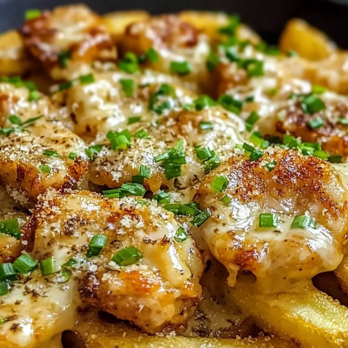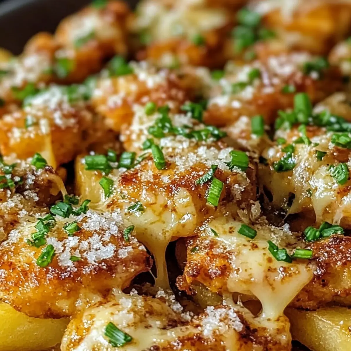 Perfekte Textur: Knusprige Pommes treffen auf zartes Hühnchen und schmelzenden Käse, was bei jedem Bissen ein wahres Genusserlebnis bietet.