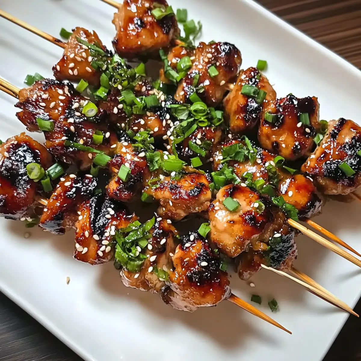 Wenn ich an einen Abend mit Freunden denke, kommt mir sofort der köstliche Duft von Hühnchen Yakitori in den Sinn. Diese japanische Spezialität verwandelt jeden Grillabend in ein geschmackvolles Fest. Juicy, zarte Hühnchenstücke, die in einer süß-salzigen Tare-Sauce glasiert und auf Spießen gegrillt werden, sind nicht nur schnell zubereitet, sondern auch ein echter Hingucker auf jedem Tisch. Das Rezept lässt sich leicht anpassen, sodass du deiner Kreativität freien Lauf lassen kannst – egal, ob du lieber Hühnchenschenkel, Brust oder sogar Gemüse verwendest. Hühnchen Yakitori vereint Einfachheit mit authentischem Geschmack und eignet sich perfekt als herzhaftes Abendessen oder köstlicher Snack für deine nächste Feier. Bereit, deine Gäste zu beeindrucken? Lass uns gleich loslegen! Warum wirst du Hühnchen Yakitori lieben? Einfachheit: Die Zubereitung ist kinderleicht und benötigt nur wenige Zutaten – perfekt für alle, die in der Küche nicht viel Zeit verbringen möchten. Vielseitigkeit: Du kannst das Rezept nach deinem Geschmack anpassen, sei es mit Hühnchen, Gemüse oder sogar Tofu. So bleibt es immer spannend! Reich an Geschmack: Die Kombination aus süßer Tare-Sauce und dem rauchigen Aroma des Grills sorgt für einen unvergesslichen Genuss. Für weitere köstliche Ideen könntest du auch unser Suessscharfes Chili Huehnchen ausprobieren. Für jeden Anlass: Hühnchen Yakitori ist nicht nur ideal für Grillabende, sondern auch ein toller Snack für Partys oder einen entspannten Abend zu Hause. Schnell und lecker: In weniger als 30 Minuten kannst du diesen köstlichen Genuss auf dem Tisch haben – perfekt für spontane Einladungen! Hühnchen Yakitori Zutaten • Überrasche deine Gäste mit diesen einfachen, aber köstlichen Zutaten für Hühnchen Yakitori. Für die Marinade Sojasauce – sorgt für den herzhaften Grundgeschmack; für Glutenunverträglichkeit Tamari verwenden. Mirin – bringt Süße und Tiefe ins Spiel; alternativ Honig oder Zucker verwenden, um den Alkohol zu vermeiden. Sake – verstärkt das Umami; kann durch extra Mirin oder Hühnerbrühe ersetzt werden. Brauner Zucker – sorgt für den perfekten Balanceakt zwischen süß und salzig; Honig ist eine gute Alternative. Knoblauch (1 Zehe, gehackt) – verleiht ein aromatisches Aroma; für einen anderen Geschmack kann auch Knoblauchpulver verwendet werden. Ingwer (ein kleines Stück, dünn geschnitten) – bringt eine frische, würzige Note; frischer Ingwer ist vorzuziehen, gemahlener Ingwer kann ersetzt werden. Für die Spieße Hühnchenfilets/Brust (300 Gramm, in 2,5 cm große Würfel geschnitten) – das Hauptprotein, wobei Oberschenkel für mehr Zartheit sorgen; als Ersatz können auch Hühnerbrust, Tofu oder Meeresfrüchte verwendet werden. Salz und Pfeffer – unverzichtbar für die Würze; nach Geschmack anpassen. Spieße (6-8, aus Bambus oder Metall) – wichtig zum Grillen; Bambusspieße vorher einweichen, um ein Anbrennen zu verhindern. Garnituren (gehackte Frühlingszwiebeln, Sesamsamen) – sorgen für Farbe und zusätzlichen Geschmack; optional zum Servieren. Mit diesen Zutaten zauberst du im Handumdrehen delikate Hühnchen Yakitori und kannst deine Freunde und Familie begeistern! Schritt-für-Schritt-Anleitung für Hühnchen Yakitori Step 1: Hähnchen marinieren In einer Schüssel die Sojasauce, Mirin, Sake, braunen Zucker, Knoblauch und Ingwer gut vermengen. Füge die Hähnchenstücke hinzu, vermische alles gründlich und lasse es 15 Minuten lang marinieren. Während dieser Zeit können die Aromen in das Fleisch eindringen, um das Hühnchen Yakitori besonders geschmackvoll zu machen. Step 2: Spieße vorbereiten Die marinierten Hühnchenstücke auf die Spieße stecken, dabei die Teile abwechselnd mit geschnittenen Frühlingszwiebeln oder anderen Gemüse für zusätzliche Farbe und Geschmack kombinieren. Achte darauf, genügend Platz zwischen den Stücken zu lassen, damit sie gleichmäßig garen. Step 3: Grillen Die Spieße auf den Grill legen, der auf mittelhohe Hitze vorgeheizt ist. Grillen die Spieße etwa 10 Minuten lang, während du sie regelmäßig drehst und mit der verbleibenden Marinade bestreichst. Achte darauf, dass das Hühnchen eine schöne, goldbraune Farbe entwickelt und vollständig durchgegart ist. Step 4: Servieren Sobald das Hühnchen Yakitori fertig ist, die Spieße vom Grill nehmen und nach Belieben mit gehackten Frühlingszwiebeln oder Sesamsamen garnieren. Serviere sie heiß, begleitet von gedämpften Reis und Einlegegemüse, um ein köstliches und authentisches japanisches Erlebnis zu kreieren. Variationen für Hühnchen Yakitori Es ist an der Zeit, deiner Kreativität beim Kochen freien Lauf zu lassen! Nutze diese köstlichen Möglichkeiten, um dein Hühnchen Yakitori zu variieren. Vegetarisch: Verwandle das Rezept mit Tofu oder gemischtem Gemüse für eine köstliche, fleischfreie Option. Süßes und herzhaftes Gemüse eignet sich hervorragend! Meeresfrüchte-Variante: Tausche das Hühnchen gegen Garnelen aus. Diese garen schneller und verleihen deinem Yakitori eine köstliche Meeresnote. Würzige Note: Füge eine Prise Chiliflocken in die Marinade hinzu, um dem Gericht einen feurigen Kick zu verleihen. Ein wenig Hitze macht alles spannender! Zusätzliche Aromen: Experimentiere mit verschiedenen Gewürzen oder Marinaden. Ein Spritzer Yuzu-Saft bringt frische Zitrusnoten und macht die Aromen lebendiger. Gemüsefüllung: Integriere Zucchini, Paprika oder Pilze in die Spieße. Sie verleihen Farbe und zusätzliche Textur. So wird dein Yakitori noch ansprechender! Süßes Upgrade: Tausche den braunen Zucker gegen flüssigen Honig für eine überraschend köstliche Süße. Dies verändert nicht nur den Geschmack, sondern auch die Konsistenz der Glasur. Besondere Garnituren: Garnieren kannst du mit frisch gehacktem Koriander oder gehackten Erdnüssen für einen zusätzlichen Crunch und eine exotische Note. Falls du nach weiteren Ideen suchst, könntest du auch unse