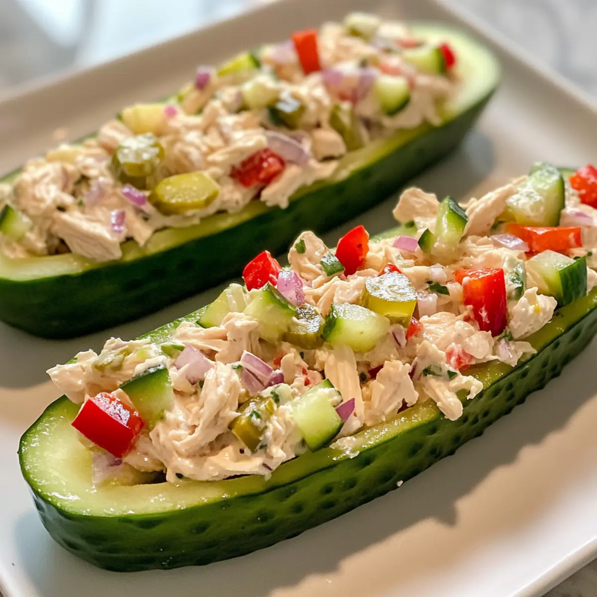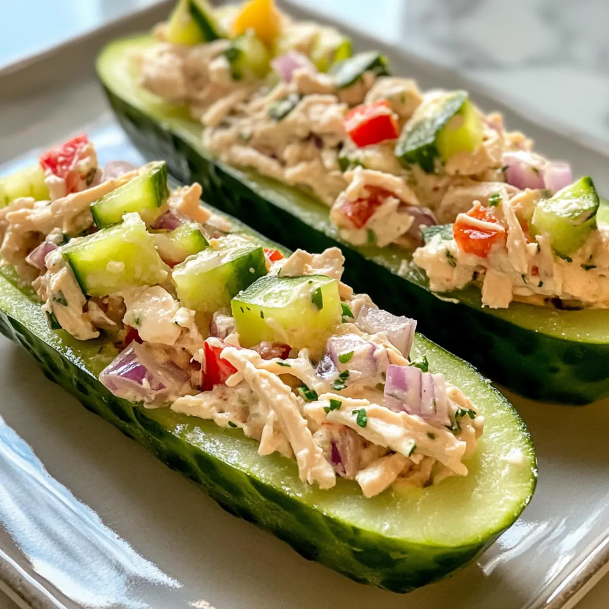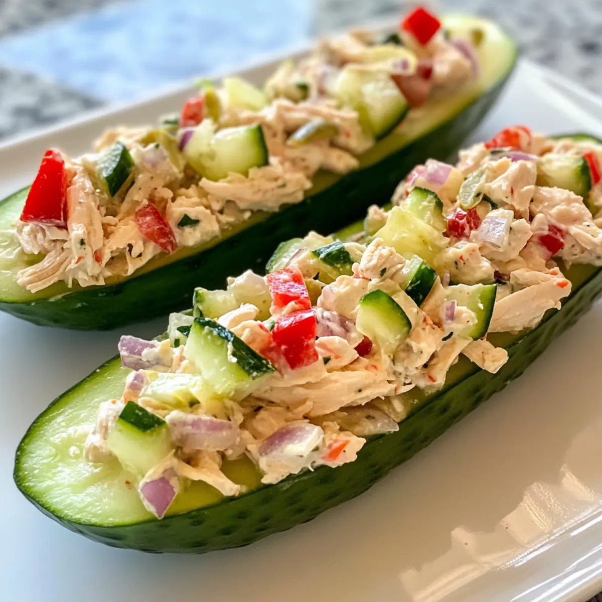 Der Sommer ist da, und mit ihm die Sehnsucht nach erfrischenden, leichten Gerichten! Diese Chicken Salad Cucumber Boats sind genau das – knackige Gurken, gefüllt mit einer herzhaften Hühnersalat-Mischung, die nicht nur köstlich ist, sondern auch schnell zuzubereiten. Perfekt für ein schnelles Mittagessen, bieten sie eine proteinreiche und zugleich kohlenhydratarme Option, die deinem Körper und deiner Seele gut tut. Wenn du nach einer Möglichkeit suchst, mehr Gemüse in deine Ernährung einzubauen, ohne dabei auf Geschmack zu verzichten, dann wird dieses Rezept zum neuen Favoriten in deiner Küche. Ich kann es kaum erwarten, mit dir die Details zu teilen – bist du bereit, deine nächste Mahlzeit aufzupeppen? Warum diese Rezeptur perfekt für dich ist? Frische, knusprige Zutaten: Der crunchige Biss der Gurken kombiniert mit dem herzhaften Hühnchen-Salat ist einfach unwiderstehlich. Schnell und einfach: Mit nur wenigen Zutaten und einer zügigen Zubereitung sind diese Cucumber Boats ideal für stressige Tage. Gesund und nahrhaft: Reich an Proteinen und arm an Kohlenhydraten, unterstützen sie deine gesunde Ernährungsweise perfekt und sind ein hervorragender Snack oder leichtes Mittagessen. Vielseitig: Experimentiere mit verschiedenen Füllungen oder Kräutern und mache jedes Mal eine neue geschmackliche Entdeckung. Perfekt für den Sommer: Diese leckeren Boote sind die ideale Erfrischung an heißen Tagen und werden deine Gäste beeindrucken, egal ob bei einem Grillabend oder einem Picknick. Entdecke auch unsere anderen schnellen Mittagessen für abwechslungsreiche und köstliche Optionen! Hühnchen-Salat Cucumber Boats Zutaten Entdecke die frischen Zutaten für diese köstlichen Cucumber Boats, die nicht nur einfach zuzubereiten sind, sondern auch eine gesunde und proteinreiche Wahl für dein Mittagessen darstellen! Für den Salat • Cucumber – Sie dienen als knackige Basis; wähle englische Gurken für weniger Kerne und eine dickere Haut. • Canned Chicken – Bietet wertvolles Protein; verwende für mehr Geschmack zerrupftes Grillhuhn oder wechsle zu Thunfisch. • Red Bell Pepper – Fügt Süße und Farbe hinzu; du kannst grüne Paprika für weniger Süße oder gewürfelten Sellerie verwenden. • Onion – Verstärkt den Geschmack mit einer aromatischen Schärfe; ersetze durch Frühlingszwiebeln für einen milderen Geschmack. • Pickles – Sorgt für einen pikanten Touch; nutze Dillgurken für Schärfe oder süße Gurken für eine besondere Note. • Banana Peppers – Bringt eine milde Schärfe und Säure; ersetze sie durch Chiliflocken oder lasse sie weg für eine mildere Variante. • Mayo – Verbindet die Zutaten, sorgt für Cremigkeit; griechischer Joghurt ist eine leichtere und gesündere Alternative. • Salt & Pepper – Unverzichtbar für die Würze; passe die Menge nach deinem Geschmack an. Diese Cucumber Boats sind nicht nur ein Genuss, sondern auch eine hervorragende Lösung für alle, die auf der Suche nach schnellen, gesunden Mittagessen sind! Schritt-für-Schritt-Anleitung für Hühnchen-Salat Cucumber Boats Step 1: Zutaten vorbereiten Schneide die rote Paprika, die Zwiebel, die Pickles und die Bananenpaprika sorgfältig in kleine Würfel. Gib die gewürfelten Zutaten in eine große Schüssel und achte darauf, dass alles gleichmäßig verteilt ist. Dies ist der erste Schritt für deine leckeren Hühnchen-Salat Cucumber Boats, der etwa 10 Minuten in Anspruch nimmt. Step 2: Hühnermix zubereiten Lass das Dosenhuhn gut abtropfen und füge es zur Schüssel mit den geschnittenen Zutaten hinzu. Gib 1 Esslöffel Mayonnaise, Salz und Pfeffer nach Geschmack sowie einen Spritzer Picklesaft dazu. Mische alles kräftig für etwa 2 Minuten, bis die Zutaten gut vermengt sind und eine cremige Konsistenz entsteht. Step 3: Gurken vorbereiten Halbiere die englischen Gurken der Länge nach und schneide sie in vier gleich große Stücke. Mit einem Löffel entferne vorsichtig das Innere, um Platz für die Füllung zu schaffen. Achte darauf, die Gurkenboote nicht zu beschädigen. Diese Vorbereitung dauert etwa 5 Minuten. Step 4: Füllen und servieren Löffle die Hühnchen-Salat-Mischung großzügig in die vorbereiteten Gurkenboote. Achte darauf, dass jede Gurke gut gefüllt ist, aber nicht überquillt. Serviere die Hühnchen-Salat Cucumber Boats sofort, um die knusprige Textur der Gurken zu genießen. Aufbewahrungstipps für Hühnchen-Salat Cucumber Boats Zimmertemperatur: Die Cucumber Boats sollten idealerweise sofort serviert werden, um ihre Knackigkeit zu bewahren. Bei Raumtemperatur sind sie bestenfalls für 1–2 Stunden geeignet. Kühlschrank: Übrig gebliebene Hühnchen-Salat-Mischung kann in einem luftdichten Behälter bis zu 3 Tage im Kühlschrank aufbewahrt werden. Halte sie getrennt von den Gurken, um Sumpfbildung zu vermeiden. Gefrierschrank: Es wird nicht empfohlen, gefüllte Cucumber Boats einzufrieren, da die Gurken beim Auftauen matschig werden. Die Hühnchen-Salat-Mischung kann jedoch bis zu 2 Monate eingefroren werden, bevor sie verloren an Qualität. Aufwärmen: Sollte die Hühnchen-Salat-Mischung eingefroren gewesen sein, lasse sie über Nacht im Kühlschrank auftauen und genieße sie kalt, damit der frische Geschmack erhalten bleibt. Meal Prep für Hühnchen-Salat Cucumber Boats Diese Hühnchen-Salat Cucumber Boats sind perfekt, um mühelos Zeit zu sparen! Du kannst die Hühnchen-Salat-Mischung bis zu 3 Tage im Voraus zubereiten, indem du die roten Paprika, Zwiebeln, Pickles und Bananenpaprika klein schneidest und sie mit gut abgetropftem Hühnerfleisch, Mayo, Salz und Pfeffer vermengst. Um die Frische zu bewahren, bewahre die Salatmischung in einem luftdichten Behälter im Kühlschrank auf. Schneide die Gurken jedoch erst kurz vor dem Servieren, um ihre Knackigkeit zu erhalten und eine matschige Konsistenz zu vermeiden. Wenn du bereit bist zu genießen, fülle einfach die vorbereiteten Gurken mit dem köstlichen Hühnchen-Salat – ein schneller und ge