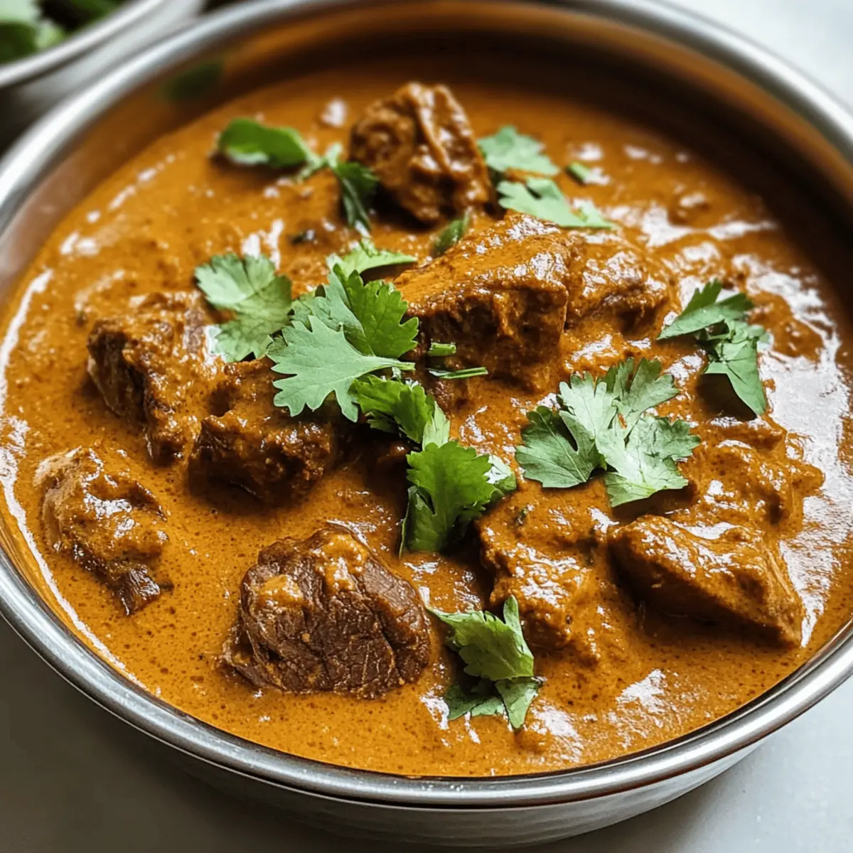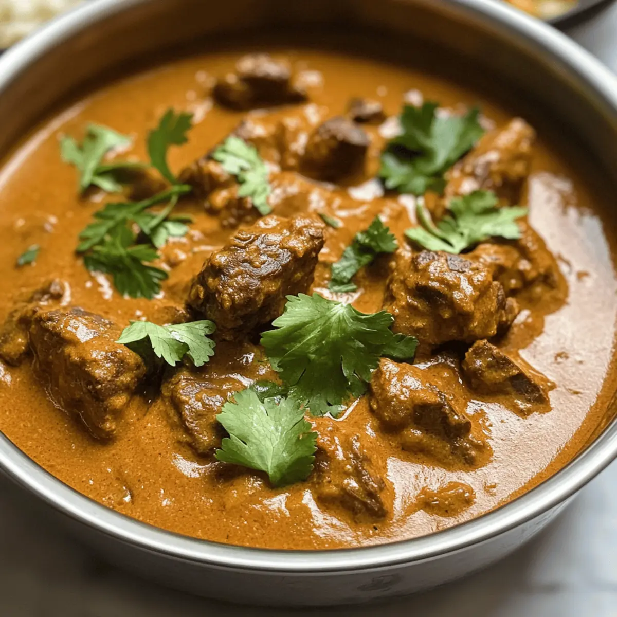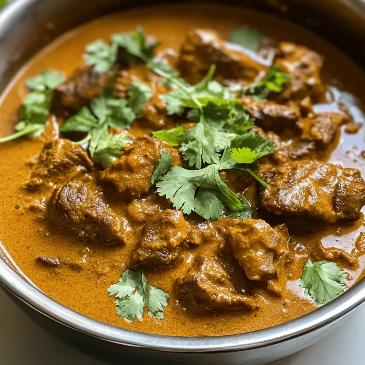 Der Duft von Gewürzen und das Geräusch von köchelndem Fleisch erinnern mich an stimmungsvolle Abende in der Küche. Heute lade ich euch ein, gemeinsam mit mir die wunderbare Welt des Creamy Indian Beef Korma Curry zu erkunden. Dieses Rezept bringt nicht nur die Aromen Indiens auf eure Teller, sondern bietet auch die perfekte Lösung für einen stressfreien Abend – einfach zuzubereiten und vollgepackt mit kräftigem Geschmack! Mit seiner cremigen Sauce, die aus Cashewkernen und Joghurt besteht, sowie seiner milden Würze ist dieses Curry nicht nur ein Fest für die Sinne, sondern auch eine wärmende Umarmung für die Seele. Seid ihr bereit, eure Geschmacksnerven auf eine köstliche Reise zu schicken? Warum wird euch dieses Rezept begeistern? Einfachheit, das Rezept ist unkompliziert und benötigt nur grundlegende Kochfähigkeiten, sodass auch Kochanfänger problemlos mitmachen können. Reiche Aromen, die Kombination aus Gewürzen und cremigem Joghurt sorgt für einen robusten, unverwechselbaren Geschmack, der garantiert begeistert. Vielseitigkeit, ihr könnt das Rezept leicht anpassen, indem ihr zum Beispiel Hühnchen anstelle von Rindfleisch verwendet. Zeitersparnis, die langsame Kochmethode ermöglicht es den Aromen, sich intensiv zu entfalten, während ihr andere Dinge erledigt. Geselligkeit, serviert das Korma mit warmem Naan oder Basmati-Reis und genießt gemeinsam mit Freunden und Familie ein festliches Essen. Indisches Rindfleisch Korma Curry Zutaten • Entdeckt die perfekten Zutaten für ein unwiderstehliches indisches Rindfleisch Korma Curry. Für das Fleisch • Rindfleisch (Chuck/Bruststück) – Wählt zarte Stücke, die beim langsamen Kochen weich werden. Für die Basis • Ghee/Pflanzenöl – Ghee verleiht einen traditionellen Geschmack; Neutralöl kann ersetzt werden. • Zwiebel – Sorgt für Süße und Geschmack; fein gehackt für gleichmäßiges Garen. • Knoblauch – Verstärkt das Aroma; für eine stärkere Infusion klein gehackt. • Frischer Ingwer – Fügt Wärme hinzu; gerieben für bessere Mischung. Gewürze • Gemahlener Kreuzkümmel – Bringt Erdigkeit; kann durch Koriander ersetzt werden. • Gemahlener Koriander – Verleiht eine zitrusartige Note; Austausch mit Kreuzkümmel möglich. • Gemahlener Zimt – Sorgt für Wärme; ein Hauch Muskatnuss kann ebenfalls verwendet werden. • Gemahlene Nelken – Gebt einen tiefen, aromatischen Geschmack; sparsam verwenden. • Gemahlener Kardamom – Steigert die Komplexität; sowohl gemahlene als auch ganze Hülsen können verwendet werden. Flüssigkeiten • Rinderbrühe – Basisflüssigkeit zum Kochen; für leichtere Varianten kann Hühner- oder Gemüsebrühe genutzt werden. • Naturjoghurt – Fügt Cremigkeit und Säure hinzu; Vollfett wird für die beste Textur empfohlen. • Kokosmilch – Trägt zur cremigen, nussigen Basis bei; schwerer Rahm kann für weniger Kokosgeschmack verwendet werden. Für die Verfeinerung • Cashewkerne – Sorgt für Nussigkeit und dickt die Sauce an; für eine vegane Version püriertes Seidentofu verwenden. • Salz & schwarzer Pfeffer – Essentielle Gewürze; nach Geschmack anpassen. • Zitronensaft – Bringt Frische; kann durch Limettensaft ersetzt werden. • Frischer Koriander – Garnitur für Frische; nach Belieben weglassen oder Minze verwenden. Schritt-für-Schritt-Anleitung für Indisches Rindfleisch Korma Curry Step 1: Fleisch anbraten Erhitze Ghee oder Pflanzenöl in einem großen Topf bei mittlerer bis hoher Hitze. Füge die Rindfleischstücke hinzu und brate sie für 5-7 Minuten an, bis sie von allen Seiten schön gebräunt sind. Entferne das Fleisch und stelle es beiseite in einer Schüssel. Step 2: Zwiebel und Gewürze rösten Reduziere die Hitze auf mittlere Stufe und gebe die fein gehackte Zwiebel in den gleichen Topf. Sauté die Zwiebel für etwa 5-6 Minuten, bis sie weich und goldbraun ist. Füge dann den minced Knoblauch und den geriebenen Ingwer hinzu und brate alles für eine weitere Minute unter ständigem Rühren, um die Aromen zu entfalten. Step 3: Gewürze hinzufügen Streue die gemahlenen Gewürze (Kreuzkümmel, Koriander, Zimt, Nelken, Kardamom) in den Topf und röste sie für etwa 1-2 Minuten. Diese Schritte verleihen dem indischen Rinder Korma Curry eine aromatische Tiefe. Achte darauf, dass die Gewürze nicht anbrennen. Step 4: Sauce mixen In einer separaten Schüssel püriere die eingeweichten Cashewkerne zusammen mit der Kokosmilch zu einer glatten Paste. Gieße diese Mischung zusammen mit der Rinderbrühe und dem Naturjoghurt in den Topf und rühre alles gut um, bis alle Zutaten miteinander verbunden sind. Step 5: Rindfleisch zurück in den Topf Legen das angebratene Rindfleisch zurück in den Topf und bringe die Mischung zum Kochen. Decke den Topf ab und reduziere die Hitze auf niedrige Stufe. Lass das Curry für 1,5 bis 2 Stunden köcheln, bis das Fleisch zart ist und sich die Aromen gut verbunden haben. Step 6: Abschmecken und garnieren Rühre den Zitronensaft in das Korma ein und passe die Gewürze nach Belieben mit Salz und Pfeffer an. Garnieren das Curry vor dem Servieren mit frisch gehacktem Koriander für eine frische Note. Step 7: Servieren Serviere das Indische Rindfleisch Korma Curry heiß zusammen mit fluffigem Basmati-Reis oder warmem Naan für ein komplettes und köstliches Essen. Variationen für Indisches Rindfleisch Korma Curry Entfaltet eure Kreativität in der Küche und passt dieses Rezept nach eurem Geschmack an! Vegan: Ersetzt das Rindfleisch durch Kichererbsen oder Linsen für eine herzhafte pflanzliche Alternative. Diese Varianten sind ebenso nahrhaft und köstlich. Schärfer: Fügt gehackte grüne Chilischoten oder mehr Chili-Pulver hinzu, um das Gericht aufzuheizen. Perfekt für diejenigen, die es gern würzig mögen! Cremiger: Für noch mehr Cremigkeit könnt ihr einen Schuss schwere Sahne oder zusätzlich Joghurt verwenden. Dies verleiht dem Curry eine noch reichhaltigere Textur. Fruchtig: Ergänzt das 