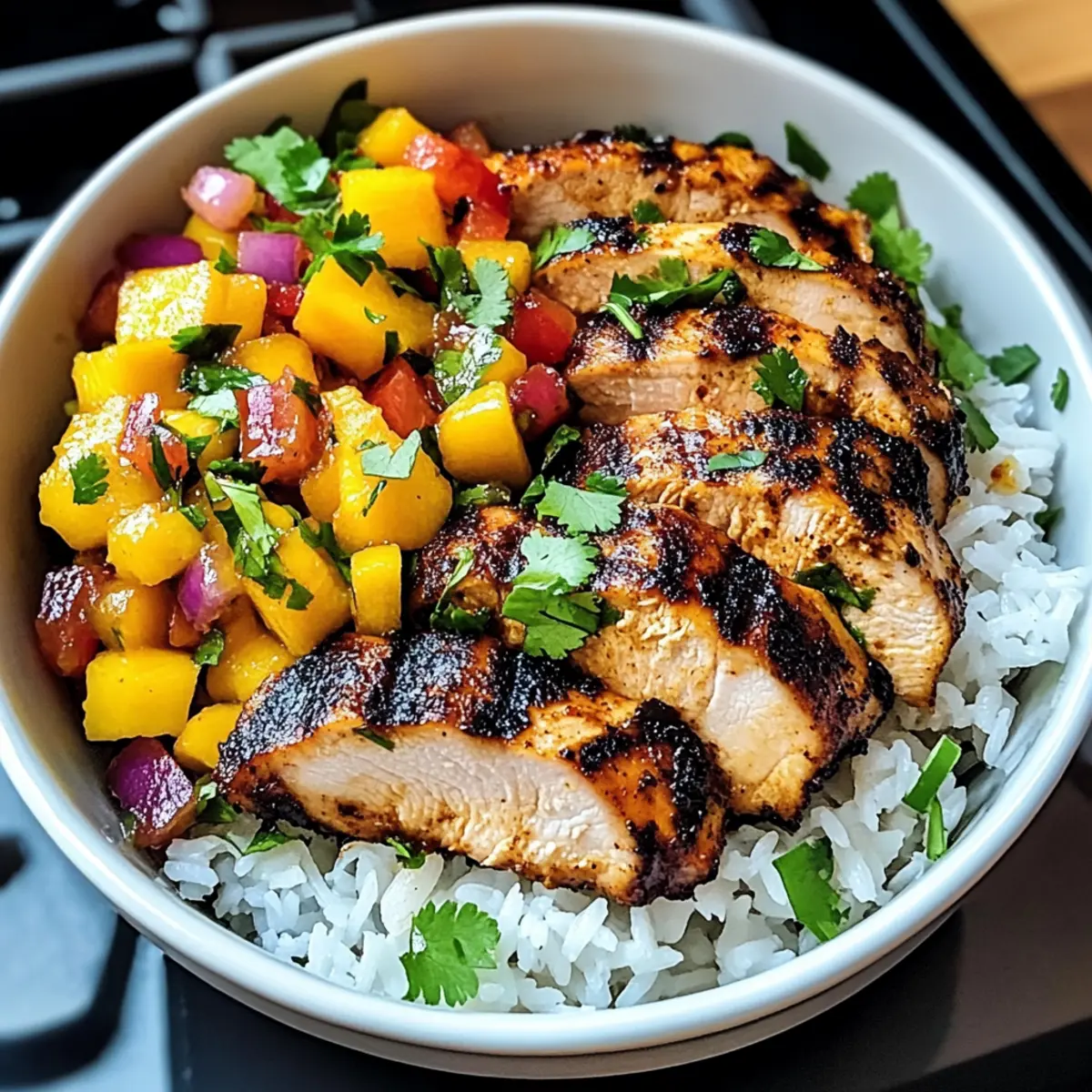 Genießen Sie diese köstlichen Jerk-Hühnchen-Schalen mit Mango-Salsa und Kokosreis – ein perfektes Rezept für eine gesunde und tropische Mahlzeit.