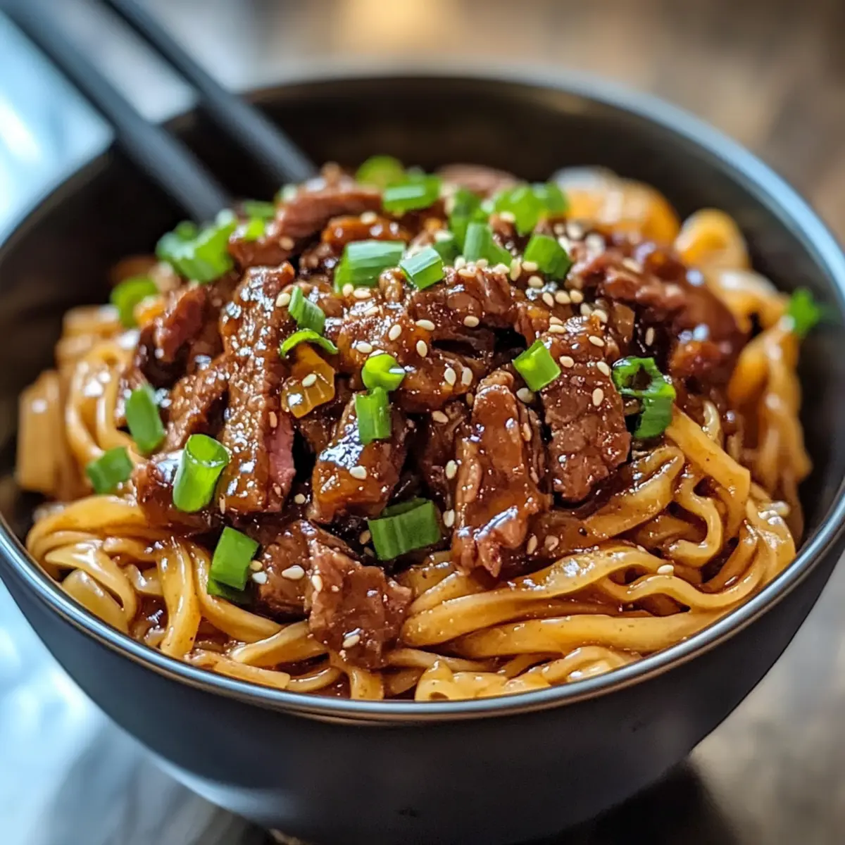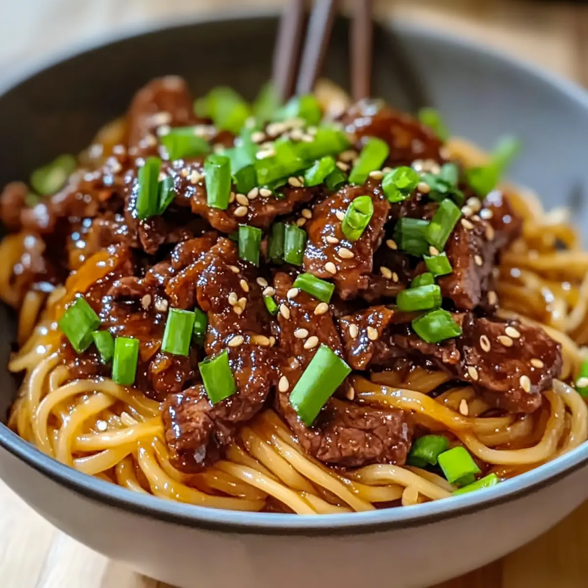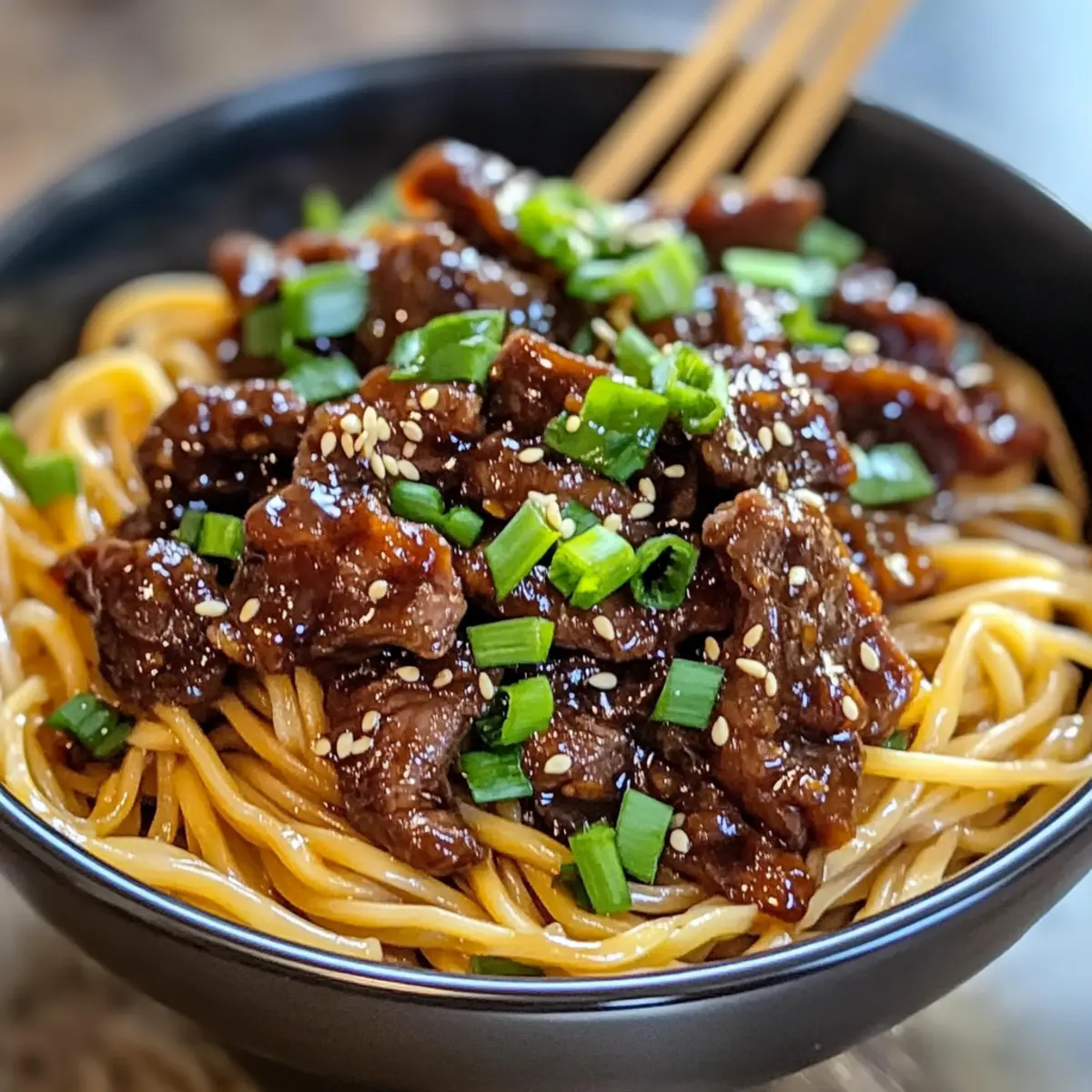Die Zeit drängt, und der Kühlschrank gibt nur die Reste her? Keine Sorge, ich habe das perfekte Rezept für dich: Karamellisierte Rindfleischnudeln! Dieses köstliche Gericht kombiniert zarte Rindfleischstücke in einer glänzenden, süß-salzigen Glasur mit perfekt angebratenen Nudeln. Die Zubereitung ist schnell und einfach, sodass du in weniger als 30 Minuten ein schmackhaftes Abendessen auf den Tisch zaubern kannst – ideal für hektische Wochentage. Und keine Sorge, auch die Geschmacksknospen deiner Familie werden begeistert sein: Dieses Comfort Food ist nicht nur sättigend, sondern auch ein absoluter Hit bei großen und kleinen Essern. Bist du bereit, deine Küche in ein geschmackliches Abenteuer zu verwandeln? Lass uns gleich anfangen! Warum werden Sie dieses Rezept lieben? Einfachheit: Die Zubereitung ist unkompliziert und benötigt nur wenige Zutaten, die du wahrscheinlich schon zu Hause hast. Reiche Aromen: Die Kombination aus süßer Glasur und herzhaftem Rindfleisch sorgt für ein Geschmackserlebnis, das deine Sinne verzaubert. Schnell zubereitet: Mit einer Zubereitungszeit von weniger als 30 Minuten ist dieses Rezept perfekt für hektische Wochentage. Vielfältig: Du kannst das Rezept leicht abwandeln, indem du Rindfleisch gegen Huhn oder Tofu austauschst, oder verschiedene Gemüse hinzufügst für mehr Farbe und Nährstoffe. Familienfreundlich: Dieses Gericht ist bei Groß und Klein ein Hit – es wird garantiert nichts übrig bleiben! Einfache Aufbewahrung: Die Komponenten können im Voraus vorbereitet und einfach wieder aufgewärmt werden, um die Frische zu bewahren, während du schnelle Beilagenideen für ein rundum gelungenes Dinner erhältst. Karamellisierte Rindfleischnudeln Zutaten • Für alle, die neugierig auf das Rezept sind, hier sind die Zutaten, die du brauchst! Für das Rindfleisch Rinderfilet (300 Gramm) – Hauptprotein, das für Reichtum sorgt; kann durch Flank oder Brisket ersetzt werden. Für die Würze Sojasauce (2 Esslöffel) – Verleiht Salzigkeit und Umami; glutenfreie Sojasauce ist eine gute Option für Glutenunverträglichkeiten. Austernsauce (1 Esslöffel) – Verstärkt den herzhaften Geschmack; kann für eine vegetarische Version weggelassen werden. Dunkler Zucker (2 Esslöffel) – Sorgt für Süße und hilft, die karamellisierte Glasur zu bilden; substituiere ihn durch Kokoszucker für eine gesündere Variante. Reisessig (1 Esslöffel) – Fügt eine säuerliche Frische hinzu; kann durch Apfelessig ersetzt werden. Knoblauch (2 Zehen, gehackt) – Verleiht Tiefe im Geschmack; frisch verwenden, damit das Aroma nicht leidet. Ingwer (1 Teelöffel, gerieben) – Bringt Helligkeit in das Gericht; frischer Ingwer ist für den besten Geschmack empfohlen. Chiliflocken (1 Teelöffel) – Sorgt für Würze; nach Geschmack anpassen oder weglassen für eine mildere Variante. Für die Nudeln Nudeln (150 Gramm) – Grundlage des Gerichts; für glutenfreie Optionen Reisnudeln verwenden, oder Eiernudeln für eine angenehme Textur. Rinderbrühe oder Wasser (60 Milliliter) – Dient zum Anpassen der Glasur-Konsistenz; kann für eine vegetarische Variante durch Gemüsebrühe ersetzt werden. Sesamöl (1 Teelöffel) – Verleiht ein angenehmes Aroma; optional und kann weggelassen werden. Für die Garnitur Frühlingszwiebeln (4, in Scheiben) – Für Frische und als Dekoration; kann bei Bedarf durch Schnittlauch ersetzt werden. Sesam (1 Esslöffel) – Für die Garnitur; durch gehackte Erdnüsse ersetzen, wenn gewünscht. Koch dich mit mir durch diese köstlichen Karamellisierte Rindfleischnudeln und erlebe die Aromen, die deine Familie lieben wird! Schritt-für-Schritt-Anleitungen für Karamellisierte Rindfleischnudeln Step 1: Zutaten vorbereiten Schneide das Rinderfilet in dünne Streifen, hacke den Knoblauch und reibe den Ingwer. Die Reisnudeln entsprechend den Verpackungsanweisungen in heißem Wasser einweichen, bis sie weich sind, und anschließend abtropfen lassen. Halte alle Zutaten bereit, um einen reibungslosen Kochprozess für die karamellisierten Rindfleischnudeln zu gewährleisten. Step 2: Fleisch marinieren (optional) Vermische die Rindfleischstreifen in einer Schüssel mit der Sojasauce und dem braunen Zucker. Lasse das marinierte Rindfleisch für 5 bis 10 Minuten ruhen, damit die Aromen gut einziehen. Dieser Schritt sorgt dafür, dass das Fleisch zarter wird und in der späteren Zubereitung mehr Geschmack entfaltet. Step 3: Karamellglasur zubereiten Erhitze 1 Esslöffel neutrales Öl in einer großen Pfanne bei mittlerer Hitze. Füge den braunen Zucker und einen Spritzer Wasser oder Rinderbrühe hinzu und rühre kontinuierlich, bis die Mischung zu einer glänzenden, bernsteinfarbenen Glasur wird – dies dauert etwa 2 bis 3 Minuten. Dies ist die Grundlage für die süß-salzige Note der karamellisierten Rindfleischnudeln. Step 4: Rindfleisch anbraten Gib das marinierte Rindfleisch in die karamellisierte Glasur und brate es ungestört für 1 bis 2 Minuten auf jeder Seite an, bis sich eine schöne Kruste bildet und das Fleisch in der Mitte leicht rosa ist. Achte darauf, das Fleisch nicht zu überkochen, damit es zart bleibt. Step 5: Sauce zubereiten Füge den gehackten Knoblauch und den geriebenen Ingwer in die Pfanne und sauté für etwa 30 Sekunden, bis sie duften. Gib die restliche Sojasauce, die Austernsauce, den Reisessig und die Chiliflocken (falls verwendet) hinzu. Die Mischung erneut umrühren und das Rindfleisch wieder in die Pfanne geben, zusammen mit 60 Millilitern Rinderbrühe, und für 1 bis 2 Minuten köcheln lassen. Step 6: Nudeln beschichten Füge die eingeweichten Reisnudeln in die Pfanne und vermische sie gründlich, damit sie von der Sauce umhüllt werden. Füge bei Bedarf mehr Brühe hinzu, um die gewünschte Dicke der Glasur zu erreichen. Achte darauf, dass die Nudeln gleichmäßig mit der köstlichen Sauce für die karamellisierten Rindfleischnudeln bedeckt sind. Step 7: Fertigstellen und Servieren Träufle das Sesamöl über