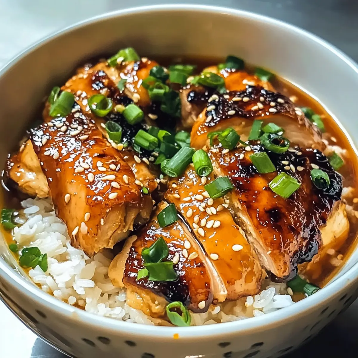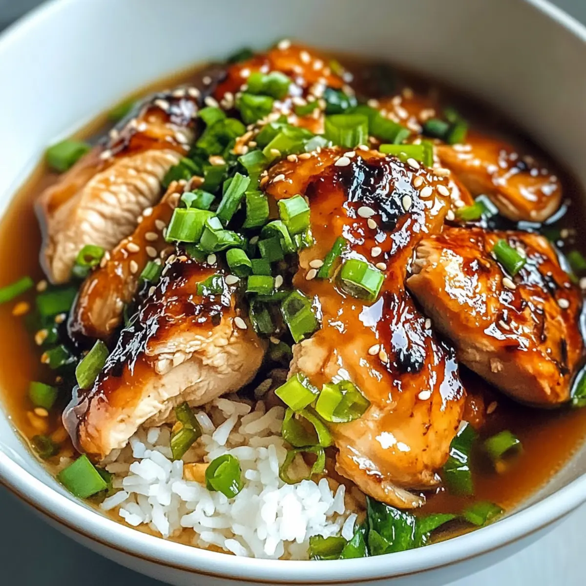 Schneide das gebratene Hähnchen in Scheiben und lege es zurück in die Brühe für 2-3 Minuten, um es wieder aufzuheizen. Serviere das Karamellisierte Soja-Hähnchen über frisch gekochtem weißen Reis und garniere es mit gehackten Frühlingszwiebeln und Sesam. So entsteht dein herzhaftes und aromatisches Gericht!