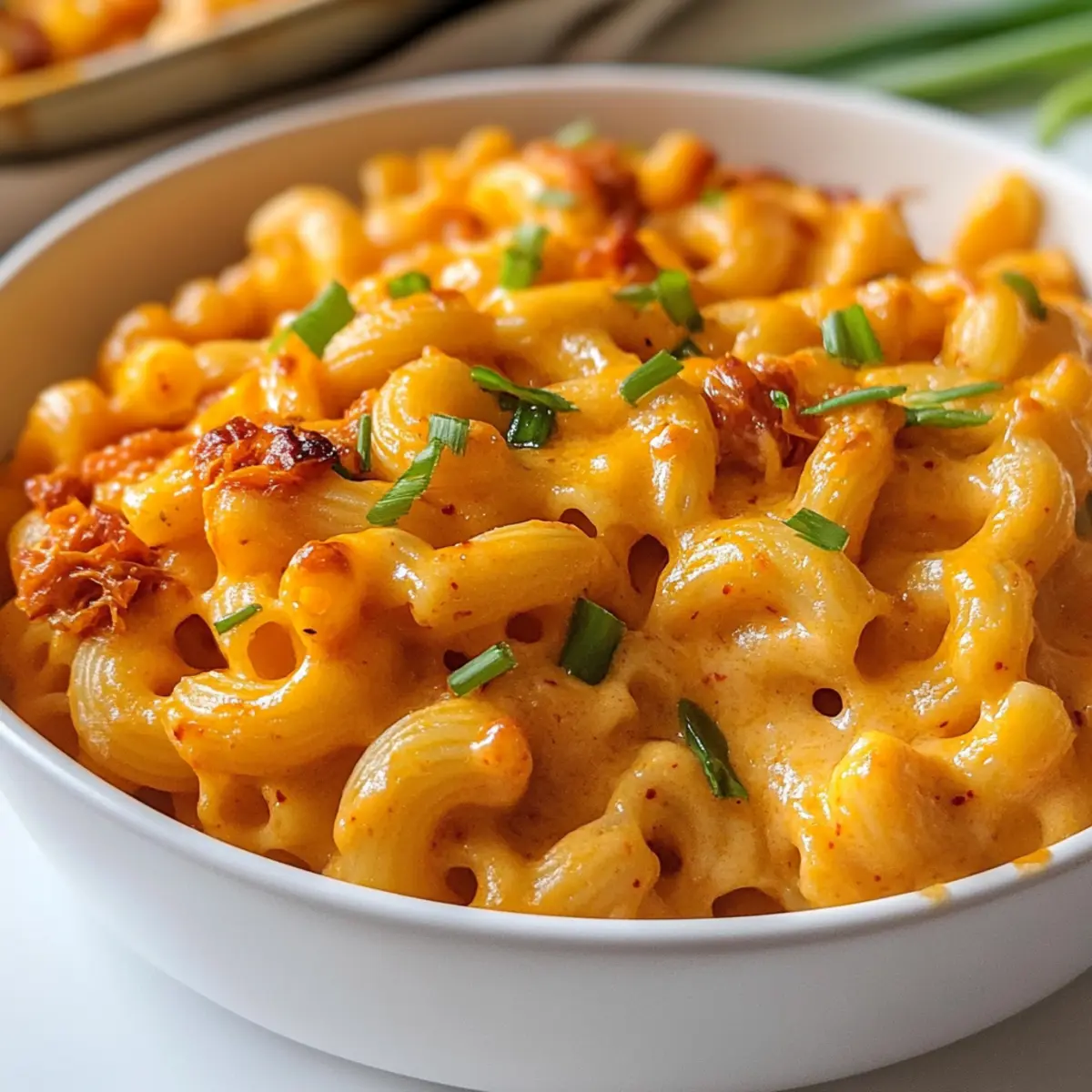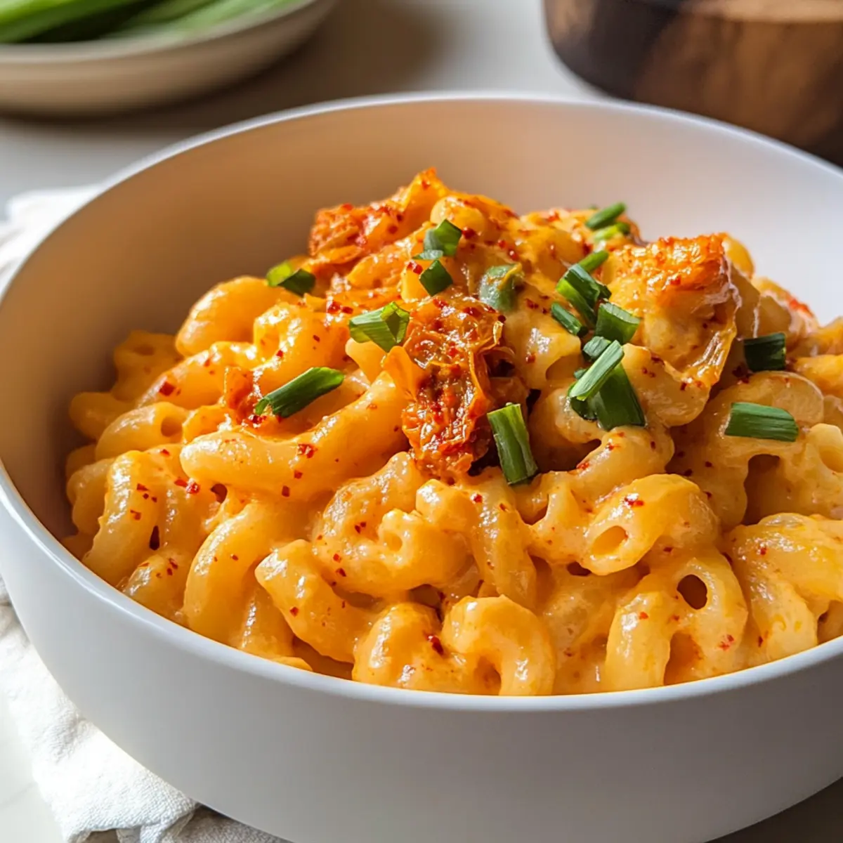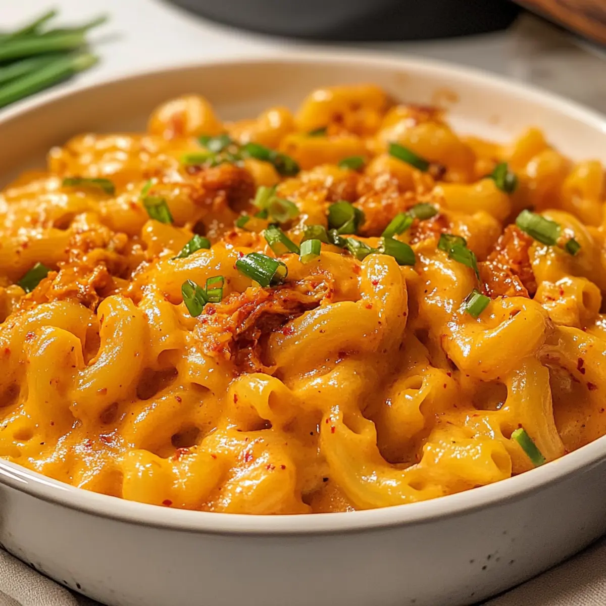 Als ich das erste Mal Kimchi Mac und Käse zubereitet habe, war ich skeptisch – aber ich wollte meiner Liebe zu klassischem Comfort Food einen aufregenden asiatischen Twist verleihen. Das Ergebnis war ein cremiges, käsehaltiges Gericht, das mit der Schärfe und dem Geschmack von Kimchi explodiert – und jetzt freue ich mich darauf, es mit euch zu teilen! Dieses Rezept für Kimchi Mac und Käse vereint das Beste aus beiden Welten: die wohlige Umarmung von traditionellem Mac und Käse, gepaart mit dem würzigen Kick von koreanischem Kimchi. Die Zubereitung ist schnell und einfach, perfekt für alle, die nach einer köstlichen Abwechslung suchen. Egal, ob ihr nach einem tollen Gericht für die nächste Familienfeier sucht oder einfach nur den Abend gemütlich gestalten wollt, dieses Rezept wird garantiert begeistert ankommen! Seid ihr bereit, euer vertrautes Mac und Käse neu zu erfinden? Warum ist Kimchi Mac und Käse so besonders? Kombination von Kulturen: Dieses Rezept vereint den klassischen Geschmack von Mac und Käse mit der pikanten Note von Kimchi, was es zu einem einzigartigen Erlebnis macht. Schnelle Zubereitung: Mit einfachen Zutaten und einer unkomplizierten Zubereitung ist es perfekt für hektische Abende, an denen ihr trotzdem etwas Aufregendes auf den Tisch bringen möchtet. Vielseitig: Ihr könnt verschiedene Kimchi-Sorten verwenden oder sogar mit verschiedenen Käsesorten experimentieren, wie zum Beispiel Gouda oder Peperjack, um neue Geschmäcker zu entdecken. Familienfreundlich: Dieses Gericht erfreut sich großer Beliebtheit und eignet sich hervorragend für Familienfeiern oder gemütliche Abende mit Freunden. Schmackhafte Reste: Die Reste schmecken am nächsten Tag (wenn es welche gibt) noch besser und können einfach aufgewärmt werden – ideal für ein schnelles Mittagessen! Probiert es auch mit weiteren köstlichen Gerichten wie Käse Spinat Einfach oder Spinat Feta Auflauf, um eure Rezeptesammlung zu erweitern! Kimchi Mac und Käse Zutaten Für die Pasta Elbow Pasta – liefert die perfekte Basis und Textur für dieses Gericht; glutenfreie Pasta ist eine tolle Option. Für die Sauce Ungesalzene Butter – sorgt für Reichtum und hilft beim Anbraten des Kimchis; kann durch Olivenöl ersetzt werden, um die Sauce leichter zu machen. Kimchi-Saft – verleiht dem Gericht eine würzige, tangige Note; frischer Kimchi-Saft sorgt für den besten Geschmack. Kimchi – bringt einen knackigen Biss und intensive Aromen ins Gericht; wählt eine Sorte je nach Schärfevorliebe aus. Gochujang – fügt Tiefe und Schärfe hinzu; für weniger Hitze verwendet weniger als angegeben oder ersetzt es durch Gochugaru. Gochugaru – bietet zusätzlichen Chili-Geschmack; nach Belieben anpassen. Salz – hebt den Geschmack des gesamten Gerichts. Weißer Pfeffer – sorgt für eine sanftere Schärfe und erdigen Geschmack; kann durch schwarzen Pfeffer ersetzt werden. Allzweckmehl – dient zur Verdickung der Käsesauce im Roux. Vollmilch – trägt zur Cremigkeit bei; kann durch pflanzliche Milch für eine milchfreie Variante ersetzt werden. Scharfer Cheddar-Käse – bringt einen reichen, würzigen Geschmack; kann durch mildere Käsesorten ersetzt werden. Mozzarella-Käse – sorgt für eine cremige Textur; am besten mit Mozzarella mit niedrigem Feuchtigkeitsgehalt verwenden. Topping-Käse – zusätzliche Menge Cheddar und Mozzarella für eine Käsekruste oben drauf. Für die Garnitur Frühlingszwiebel – frisches Topping für eine leichte Zwiebelnote und Farbakzent. Mit diesen Zutaten könnt ihr euch auf einen aufregenden Genuss durch das Rezept für Kimchi Mac und Käse freuen! Schritt-für-Schritt-Anleitung für Kimchi Mac und Käse Step 1: Pasta kochen Bringt in einem großen Topf salziges Wasser zum Kochen und gebt die Elbow Pasta hinzu. Kocht sie nach Packungsanleitung al dente, etwa 8-10 Minuten. Reserviert vor dem Abgießen eine Tasse des Pastawassers und lasst die Pasta dann gut abtropfen, damit sie bereit für die Kombination mit der cremigen Sauce für Kimchi Mac und Käse ist. Step 2: Ofen vorheizen Heizt den Ofen auf 180°C (350°F) vor und stellt den Rost in die Mitte des Ofens. Dies stellt sicher, dass Kimchi Mac und Käse gleichmäßig gebacken wird und eine knusprige Oberfläche erhält, die perfekt zu dieser cremigen Köstlichkeit passt. Step 3: Kimchi-Roux zubereiten In einem mittelgroßen Topf stellt ihr bei mittlerer Hitze die ungesalzene Butter zum Schmelzen. Fügt die vorbereitete Kimchi, den Kimchi-Saft, Gochujang, Gochugaru, Salz und weißen Pfeffer hinzu. Sautéiert die Mischung 2-3 Minuten lang, bis sie leicht reduziert ist, und rührt dann das Allzweckmehl ein, bis sich die Sauce verdickt und eine glatte Konsistenz erreicht. Step 4: Milch hinzufügen In der reduzierte Mischung könnt ihr langsam die Vollmilch einfließen lassen und dabei ständig mit einem Schneebesen rühren, bis die Sauce vollkommen glatt und ohne Klumpen ist. Dadurch wird die Käsesauce cremiger und erhält eine köstliche Basis für euren Kimchi Mac und Käse. Step 5: Käse einrühren Bei niedriger Hitze fügt ihr den scharfen Cheddar und die Mozzarella zur Sauce hinzu, während ihr kontinuierlich rührt, bis der Käse schmilzt und die Mischung eine cremige, gleichmäßige Textur erhält. Wenn die Sauce zu dick ist, gebt nach Bedarf etwas vom reservierten Pastawasser hinzu, um sie an die gewünschte Konsistenz zu bringen. Step 6: Pasta und Sauce kombinieren Faltet die abgetropfte Pasta vorsichtig unter die Käsesauce, bis sie gleichmäßig bedeckt ist. Diese Kombination zwischen der cremigen Käsesauce und der herzhaften Pasta ist die Essenz des Kimchi Mac und Käse und bringt die Aromen wunderbar zur Geltung. Step 7: Backen Gebe die Pasta-Mischung in eine ofenfeste Auflaufform und verteilt zusätzlich Käse und eventuell Panko darüber für eine knusprige Kruste. Backt das Gericht für 25 Minuten, bis die Oberfläche goldbraun ist. Wenn ihr eine extra Bräunung wünscht, könnt ihr die le