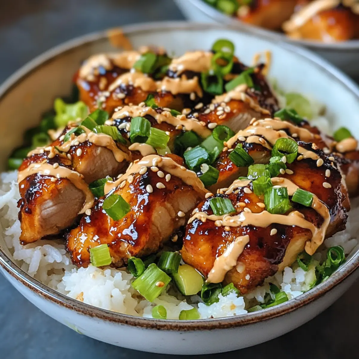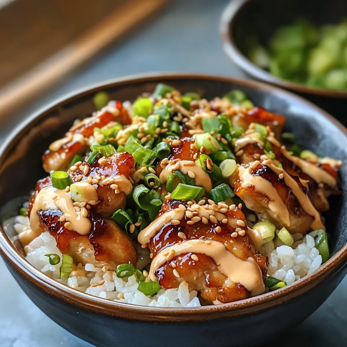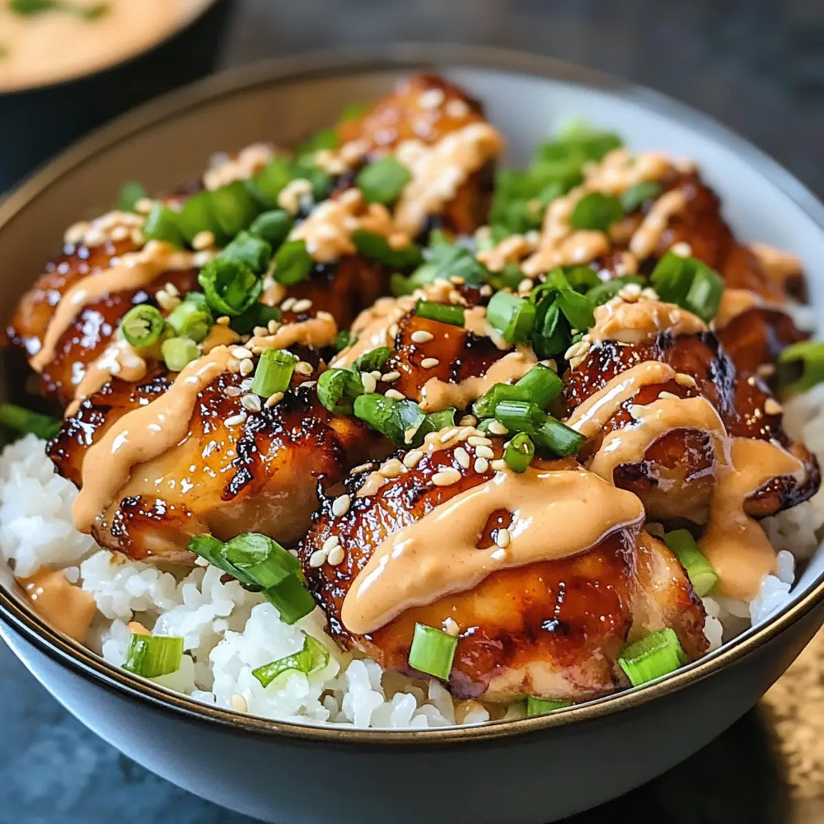 Klebrige Hähnchen-Reis-Schalen mit scharfer Mayo vereinen süße, herzhafte und würzige Aromen. Ein einfaches, aber köstliches Gericht.