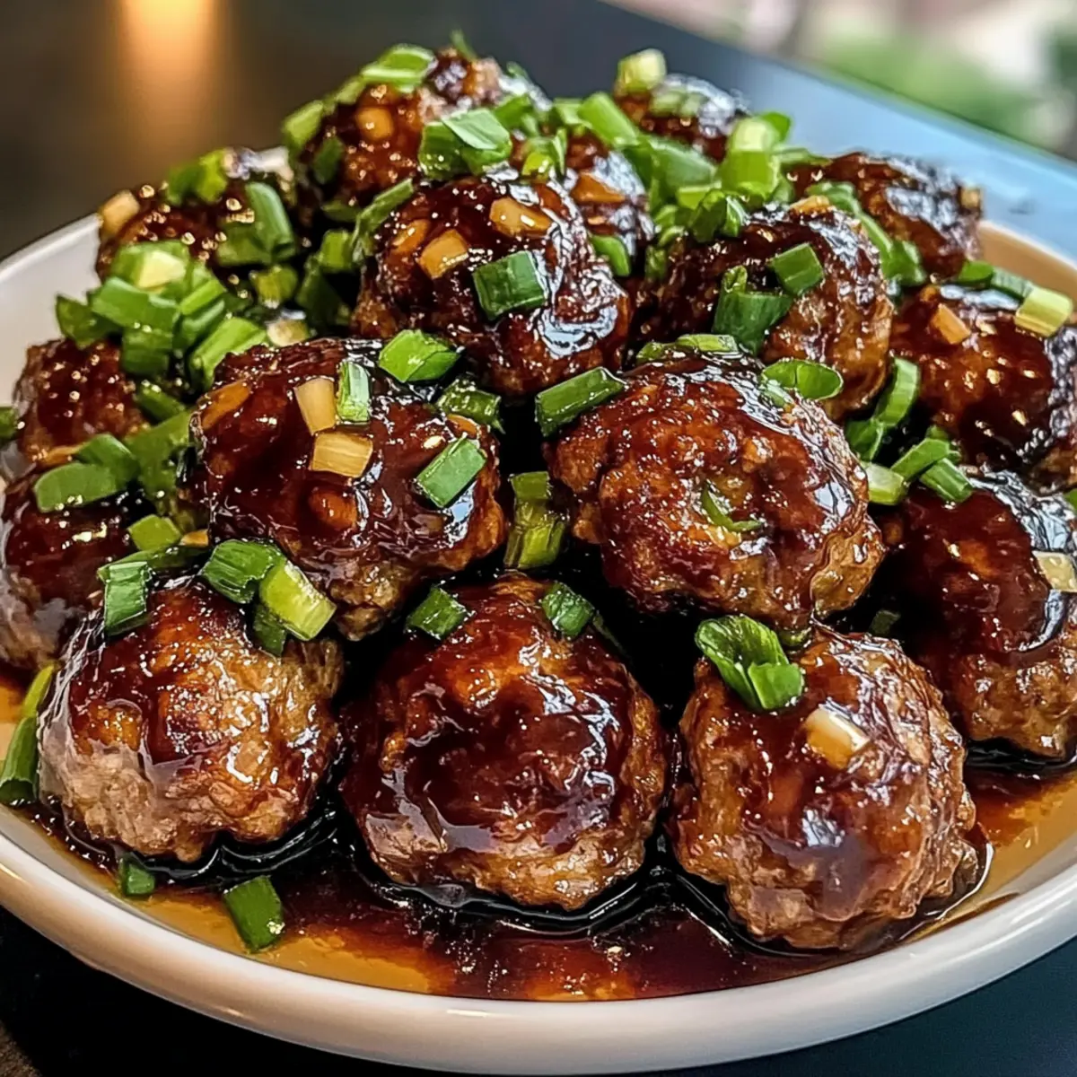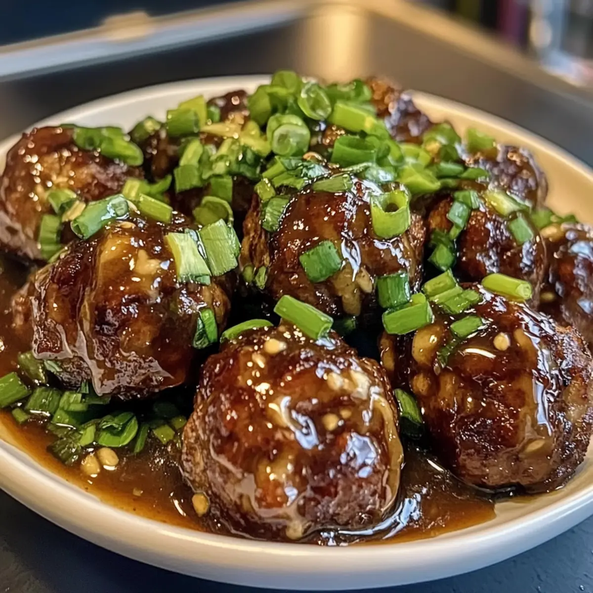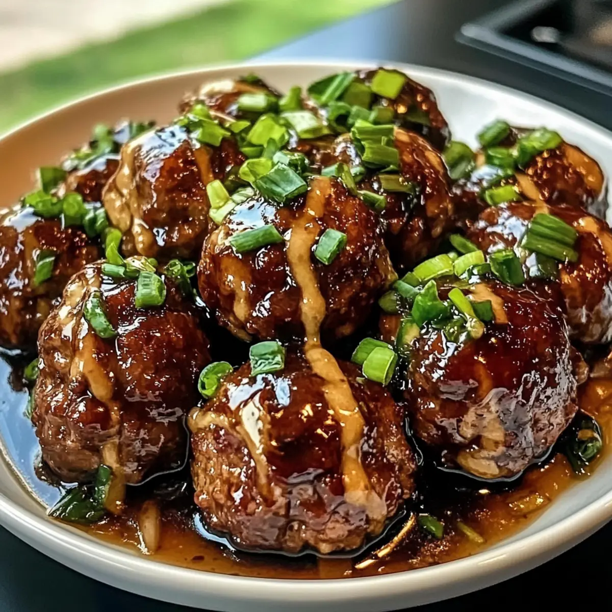 Die fertigen klebrigen Hoisin-Fleischbällchen auf einem schönen Teller anrichten und die Frühlingszwiebel-Sauce kurz vor dem Servieren großzügig darüberträufeln. Diese Kombination aus saftigen Fleischbällchen und lebhafter Sauce macht jedes Essen zu einem besonderen Erlebnis!