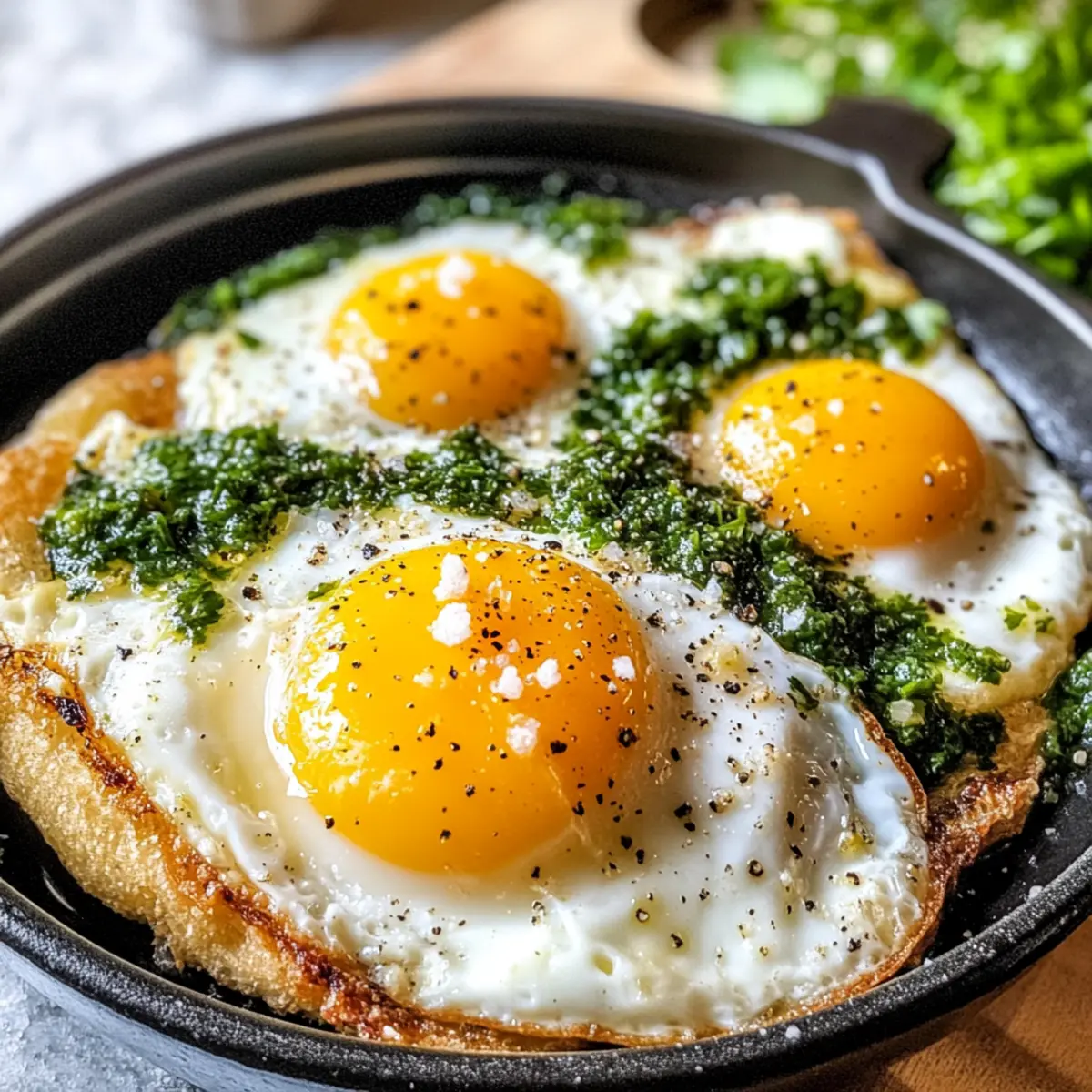 7. Richten Sie die heiße Knoblauch Eier auf einem Teller an und überträufeln Sie sie mit der vorbereiteten Petersilien-Knoblauch-Soße.