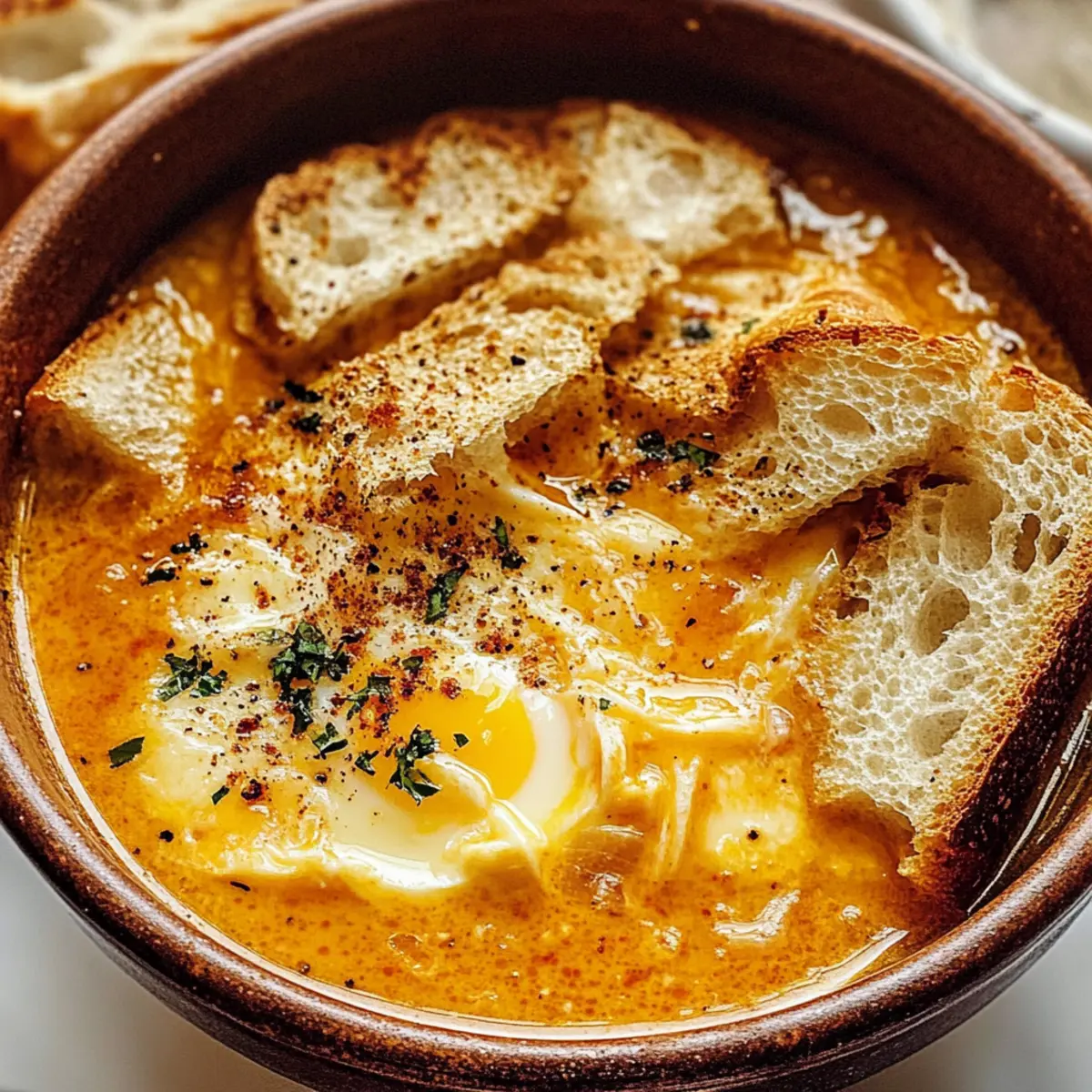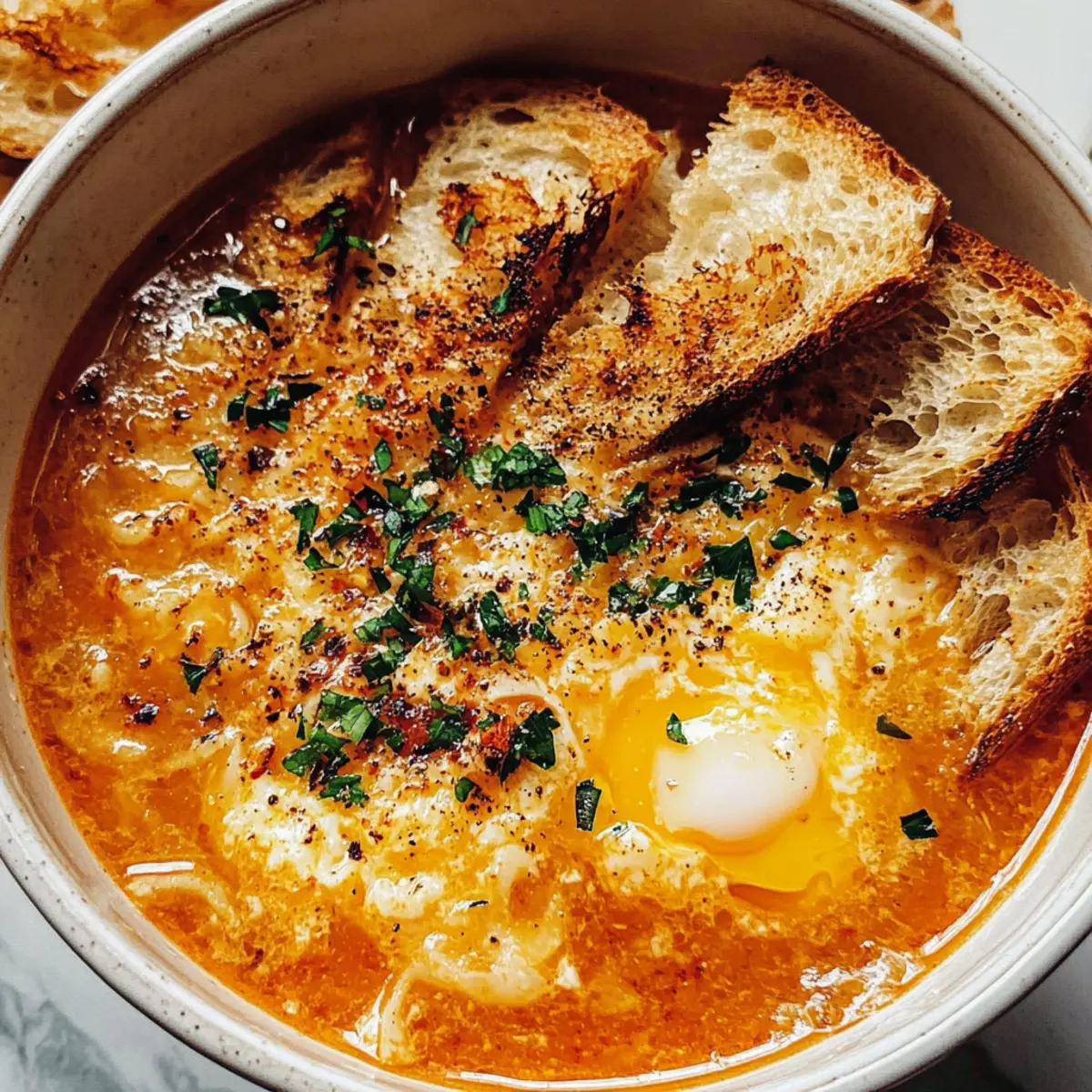Eines Abends, während ich in meiner Küche stand, umgeben von den verführerischen Aromen frischer Zutaten, fiel mein Blick auf die schmucke Knoblauchsuppe, auch bekannt als Sopa de Ajo. Diese herzhafte spanische Spezialität bietet nicht nur einen köstlichen Geschmack, sondern ist auch ein wahrer Seelenwärmer an kalten Tagen. Die Kombination aus kräftigem Knoblauch, zarten Eierfäden und knusprigem Brot schenkt jedem Löffel eine wunderbare Umarmung. Dank ihrer einfachen Zubereitung bleibt sie zudem ein schnelles, aber äußerst befriedigendes Gericht, ideal für alle, die sich nach einem wohltuenden Essen sehnen. Und das Beste? Sie lässt sich ganz leicht vegetarisch zubereiten! Wie wäre es, wenn wir gemeinsam in die Welt dieser schmackhaften Suppe eintauchen? Warum ist Knoblauchsuppe so besonders? Herzliche Wärme: Diese Knoblauchsuppe ist der Inbegriff von Seelenwärme, perfekt für kalte Tage oder nach einem langen Arbeitstag. Einfachheit: Mit nur wenigen Zutaten, darunter frischer Knoblauch und gutes Olivenöl, ist die Zubereitung unkompliziert und schnell. Vielfältiger Genuss: Ob mit Gemüsebrühe für die vegetarische Variante oder als herzhaftes Hauptgericht – diese Suppe passt zu vielen Vorlieben. Wohltuend und nahrhaft: Reich an Geschmack und mit hochwertigem Ei als proteinreiche Zutat, ist sie ebenso nährend wie befriedigend. Unvergessliches Aroma: Der aromatische Duft von gebratenem Knoblauch und geräuchertem Paprika lockt sofort alle an den Tisch. Gönnen Sie sich diese wohltuende Knoblauchsuppe und vielleicht möchten Sie sie mit einer leckeren Beilage wie frischem Brot genießen! Knoblauchsuppe Zutaten Für die Brühe Olivenöl – verleiht der Suppe eine reichhaltige Textur; alternativ kann Gemüseöl verwendet werden. Knoblauch – sorgt für den charakteristischen wärmenden Geschmack; frischer Knoblauch ist für das beste Aroma ideal. Stangenbrot – schafft Textur und Fülle in der Suppe; frisches Brot lässt sich leicht rösten, um das Verweichen zu vermeiden. Geräuchertes Paprikapulver (Pimentón) – fügt eine tiefere Dimension und eine sanfte Rauchigkeit hinzu; reguläres Paprikapulver kann für weniger Rauch verwendet werden. Hühnerbrühe oder Gemüsebrühe – die Basis, die der Suppe Herzhaftigkeit verleiht; verwenden Sie natriumarme Brühe für mehr Kontrolle über den Salzgehalt. Eier – sorgen für zarte Fäden, die in der heißen Suppe entstehen; unverzichtbar für den Proteingehalt. Salz und Pfeffer – essentielle Gewürze zur Geschmacksverstärkung. Gönnen Sie sich diese köstliche Knoblauchsuppe als perfekten Seelenwärmer! Schritt-für-Schritt-Anleitung für Knoblauchsuppe Schritt 1: Knoblauch anbraten Erhitzen Sie in einem großen Topf bei mittlerer Hitze 4 Esslöffel Olivenöl. Fügen Sie die in Scheiben geschnittenen Knoblauchzehen hinzu und braten Sie sie 2-3 Minuten lang an, bis sie duften und goldbraun sind. Rühren Sie dann 1 Teelöffel geräuchertes Paprikapulver unter, um den aromatischen Geschmack zu intensivieren. Schritt 2: Brot hinzufügen Geben Sie 150 g alte Brotwürfel in den Topf und vermengen Sie alles gut, damit das Brot gleichmäßig mit dem Knoblauchöl bedeckt ist. Lassen Sie das Ganze für weitere 3 Minuten rösten, bis das Brot leicht knusprig wird und die Aromen miteinander verschmelzen. Schritt 3: Brühe einfüllen Gießen Sie nun 1 Liter Hühnerbrühe oder Gemüsebrühe in den Topf. Verwenden Sie einen Holzlöffel, um das Brot in kleinere Stücke zu zerbröseln, sodass es die Brühe aufnehmen kann. Erhöhen Sie die Hitze und bringen Sie die Mischung zum starken Köcheln. Schritt 4: Eier hinzufügen Sobald die Brühe kocht, schlagen Sie 2 Eier in einer Schüssel auf und verquirlen Sie diese. Während Sie die Suppe ständig umrühren, gießen Sie langsam die verquirlten Eier in die heiße Brühe, sodass feine Eifäden entstehen. Dies verleiht der Knoblauchsuppe eine cremige Textur. Schritt 5: Abschmecken und anpassen Probieren Sie die Suppe und passen Sie die Konsistenz sowie die Würze an. Bei Bedarf können Sie etwas mehr Brühe, Salz, Pfeffer und geräuchertes Paprikapulver hinzufügen, um den Geschmack zu intensivieren und die perfekte Balance zu erreichen. Schritt 6: Servieren Löffeln Sie die heiße Knoblauchsuppe großzügig in tiefen Schalen. Sie können die Suppe mit einem zusätzlichen Spritzer Olivenöl und einer Prise geräuchertem Paprikapulver garnieren, um das Aroma zu verstärken. Genießen Sie sie sofort und lassen Sie sich von der Wärme und dem köstlichen Geschmack verwöhnen. Expert Tips für Knoblauchsuppe Frischer Knoblauch: Verwenden Sie immer frischen Knoblauch für den besten Geschmack. Vorgegarter oder getrockneter Knoblauch kann den Geschmack der Knoblauchsuppe beeinträchtigen. Brotwahl: Stale Brot verbessert die Textur der Suppe. Frisches Brot lässt sich leicht rösten, um das Verweichen in der Brühe zu vermeiden. Broth Adjustierung: Passen Sie die Menge an Brühe je nach gewünschter Konsistenz an. Für eine dickere Knoblauchsuppe reduzieren Sie die Brühe, um mehr Fülle zu erzielen. Eier richtig hinzufügen: Um die Eifäden perfekt zu formen, gießen Sie die verquirlten Eier langsam hinzu und rühren Sie kontinuierlich. So stellen Sie sicher, dass die Eier nicht stocken. Anpassung der Gewürze: Schmecken Sie die Suppe während des Kochens ab und passen Sie Salz, Pfeffer und Paprika nach Bedarf an. Kleine Anpassungen können den Geschmack erheblich verbessern. Meal Prep für Knoblauchsuppe Diese köstliche Knoblauchsuppe ist einfach perfekt für die Vorbereitung im Voraus! Sie können die Brühe bis zu 3 Tage im Voraus zubereiten und im Kühlschrank aufbewahren. Um die Qualität zu bewahren, lagern Sie das Brot separat; es sollte erst kurz vor dem Servieren in die heiße Suppe gegeben werden, damit es schön knusprig bleibt. Zusätzlich können die Eier ebenfalls bis zu 24 Stunden vorher verquirlt und in einem geschlossenen Behälter im Kühlschrank aufbewahrt werden. Wenn es Ze