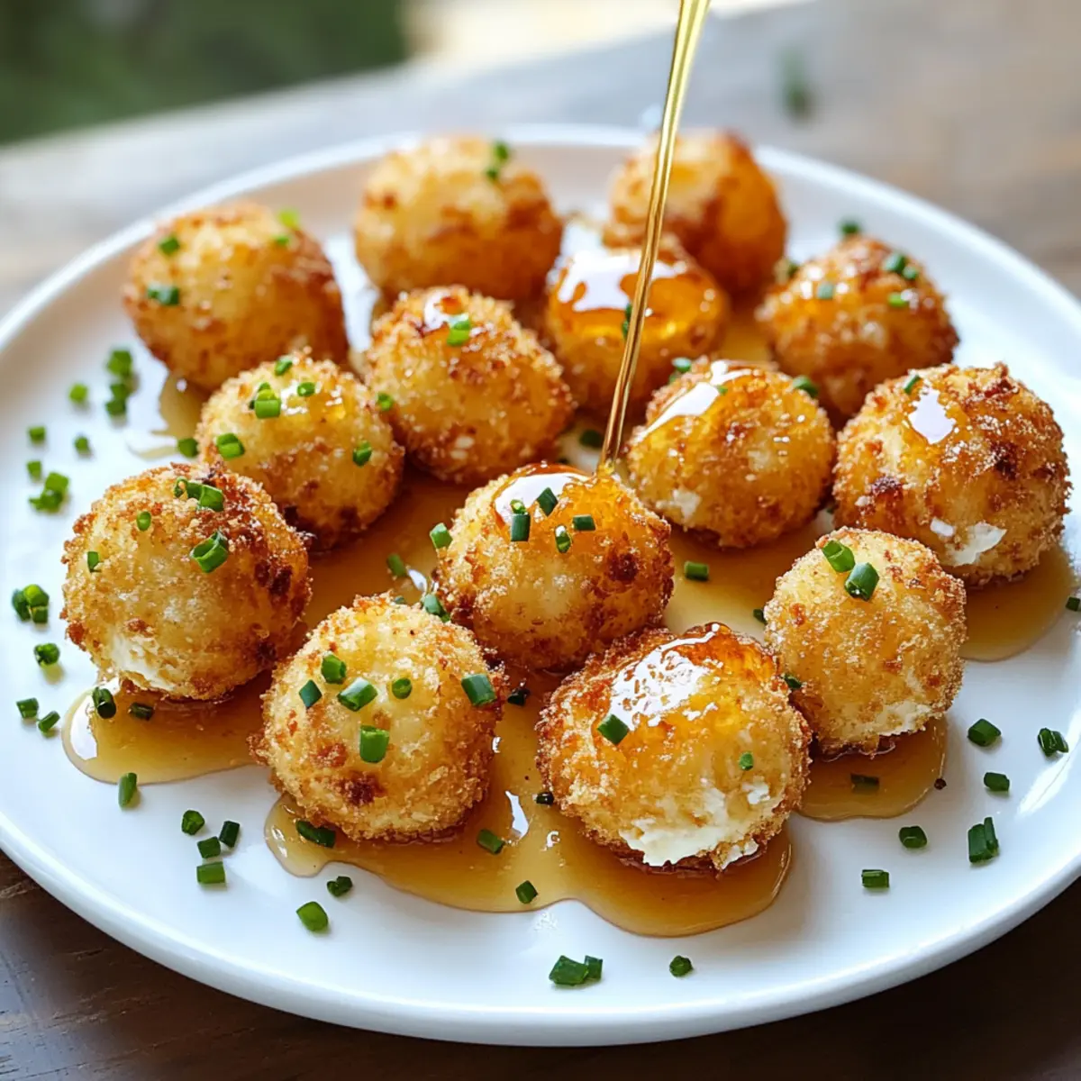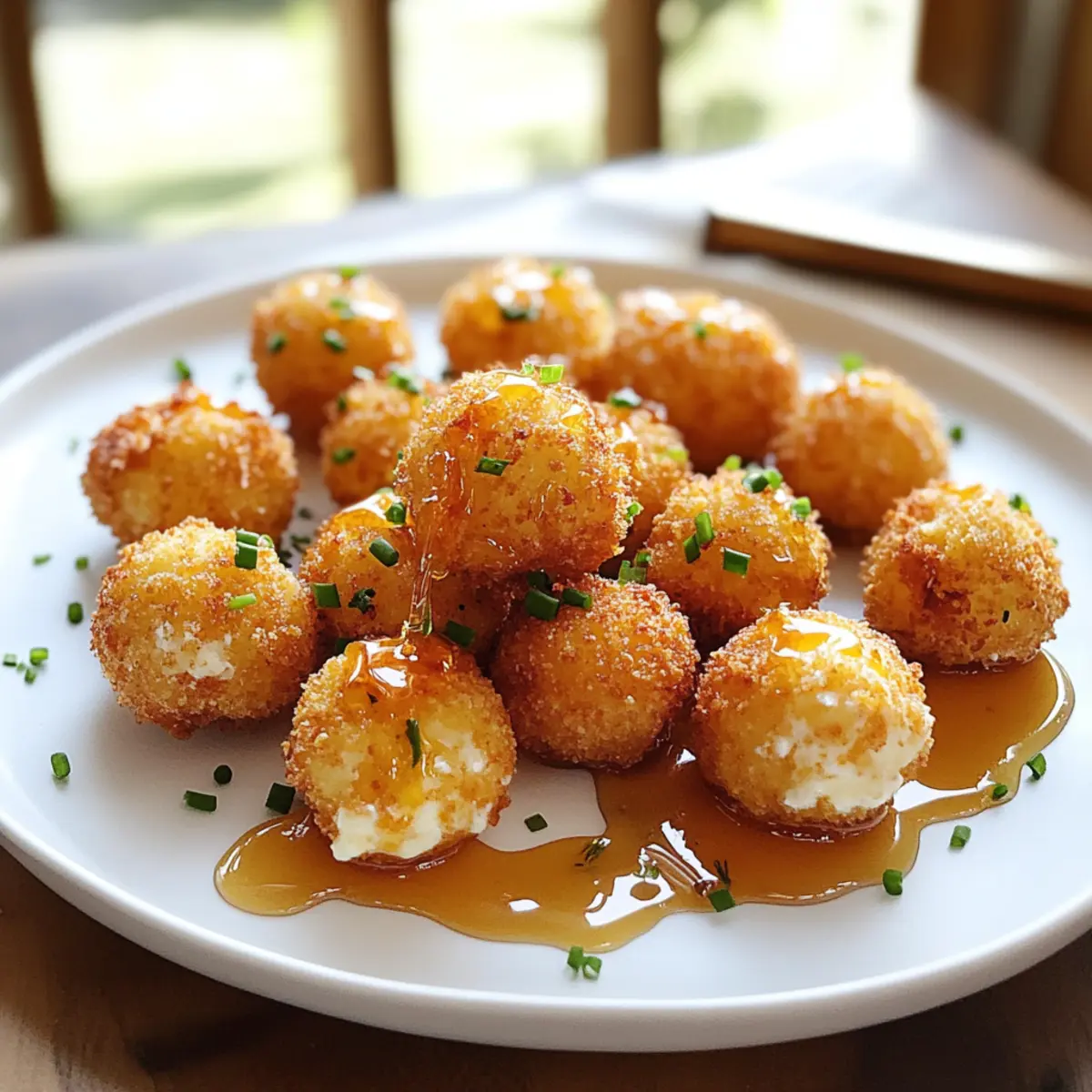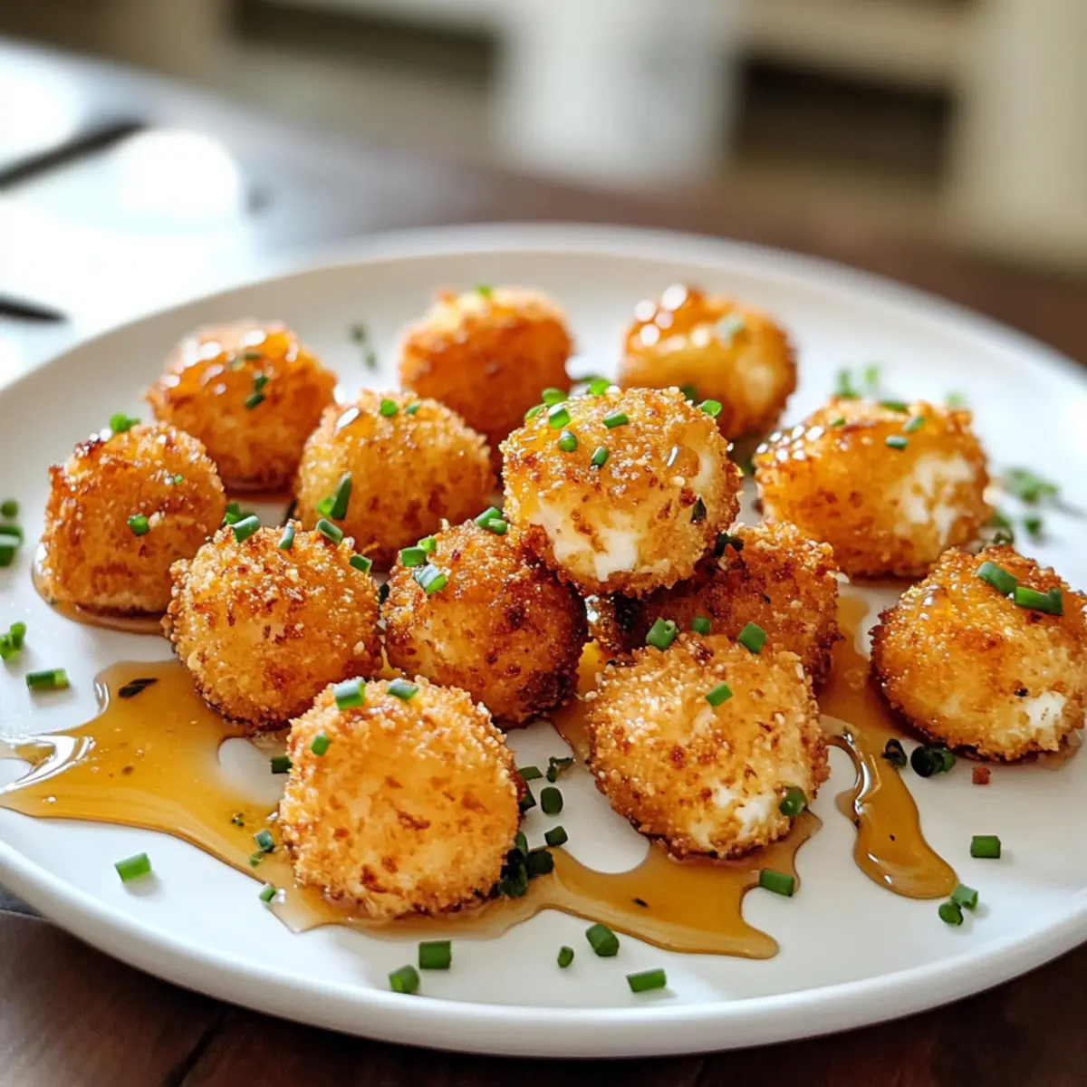 Es gab einen Moment, als ich bei einer Gartenparty diese kleinen, knusprigen Ziegenkäse-Pops mit Honig entdeckte. Sie lagen verlockend auf dem Tisch und ich konnte einfach nicht widerstehen. Diese güldenen Happen sind nicht nur ein Hingucker, sondern auch der perfekte Appetizer, um deine Gäste zu begeistern oder dich selbst an einem gemütlichen Abend zu verwöhnen. Die Kombination aus würzigem Ziegenkäse und dem süßen Honig macht sie zu einem unverzichtbaren Genuss. Mit diesem Rezept für knusprige Ziegenkäse-Pops mit Honig brauchst du nur wenige Zutaten und eine kurze Zubereitungszeit, um ein köstliches Ergebnis zu erzielen. Also, bereit für ein geschmackliches Abenteuer? Lass uns gemeinsam in die Welt dieser delikaten Happen eintauchen! Warum wirst du diese Ziegenkäse-Pops lieben? Knuspriger Genuss: Diese Ziegenkäse-Pops sind außen perfekt goldbraun und knusprig, während sie innen eine cremige Füllung bieten. Zudem ist das Rezept einfach und erfordert nur minimale Küchenkenntnisse. Einfache Zubereitung: Die Schritte sind kurz und unkompliziert, perfekt für spontane Partys oder gemütliche Abende zu Hause. Vielfältige Variationen: Ob du sie mit verschiedenen Kräutern verfeinerst oder mit Gewürzen anpasst, die Möglichkeiten sind endlos. Außerdem sind sie das Highlight jeder Feier und einfach unwiderstehlich! Werfe auch einen Blick auf unsere Sprudelnde Erdbeer Zitronenlimonade oder die erfrischende Pink Flamingo Colada für die perfekte Begleitung zu diesen leckeren Happen! Zutaten für knusprige Ziegenkäse-Pops mit Honig • Diese köstlichen Ziegenkäse-Pops verlangen nach wenigen, aber hochwertigen Zutaten! Für den Teig Allzweckmehl – sorgt für eine ideale Beschichtung des Käses; glutenfreies Mehl kann als Alternative verwendet werden. Schwarzer Pfeffer – verleiht der Panade eine angenehme Schärfe; frisch gemahlener Pfeffer sorgt für den besten Geschmack. Ei – funktioniert als Bindemittel, damit die Beschichtung haften bleibt; ein Leinsamen-Ei ist eine gute vegane Option. Koshersalz – verstärkt den Geschmack der Pops; jede Salzart ist verwendbar, jedoch den Geschmack anpassen. Panko-Semmelbrösel – sorgen für eine luftige und knusprige Textur; herkömmliche Semmelbrösel sind ebenfalls möglich, könnten aber anders ausfallen. Für die Füllung Weicher Ziegenkäse – ist der Hauptdarsteller dieser leckeren Pops; fester Ziegenkäse kann verwendet werden, hat jedoch eine andere Konsistenz. Zum Frittieren Öl (Trauben-, Raps- oder Pflanzenöl) – wird zum Frittieren benötigt; achte darauf, dass das Öl die richtige Temperatur für maximale Knusprigkeit hat. Für die Verfeinerung Honig – bringt eine süße Note, die die Aromen wunderbar ausbalanciert; Ahornsirup kann ebenfalls als Alternativ verwendet werden. Frische Schnittlauch – sorgt für ein frisches, mildes Zwiebelaroma und sieht als Garnitur hübsch aus; andere Kräuter wie Petersilie könnten ebenfalls verwendet werden. Diese knusprigen Ziegenkäse-Pops mit Honig sind der perfekte Snack für jede Feier! Schritt-für-Schritt-Anleitung für Knusprige Ziegenkäse-Pops mit Honig Step 1: Zutaten vorbereiten In einer Schüssel das Allzweckmehl mit dem frisch gemahlenen schwarzen Pfeffer vermengen. In einer anderen Schüssel das Ei, Koshersalz und etwas Wasser verquirlen, bis die Mischung gut verbunden ist. Diese zwei Schritte bilden die Basis für die knusprige Panade der Ziegenkäse-Pops. Step 2: Panko vorbereiten In einer separaten Schüssel die Panko-Semmelbrösel bereitstellen. Sie werden später dazu verwendet, den Ziegenkäse eine extra knusprige Textur zu verleihen. Achte darauf, dass die Brösel gleichmäßig verteilt sind, um das Panieren zu erleichtern. Step 3: Ziegenkäse formen Roll den weichen Ziegenkäse in 24 gleich große, etwa 1 Esslöffel große Bällchen. Diese kleinen, köstlichen Happen bilden das Herzstück unserer knusprigen Ziegenkäse-Pops mit Honig. Lay the formed balls on a plate and ensure they are packed closely. Step 4: Panieren Nimm die Ziegenkäse-Bällchen und wälze sie zuerst im gewürzten Mehl, dann tauche sie in die Eiermischung und schließlich in die Panko-Semmelbrösel. Achte darauf, dass sie gleichmäßig und gut bedeckt sind, um die perfekte Knusprigkeit zu erreichen. Step 5: Kühlen Lege die panierten Ziegenkäse-Pops auf ein Backblech oder einen Teller und stelle sie für etwa 20 Minuten in das Gefrierfach. Dies hilft, die Bällchen zu festigen, damit sie beim Frittieren nicht auseinander fallen. Nutze diese Zeit, um bereits das Öl für das Frittieren vorzubereiten. Step 6: Öl erhitzen In einem tiefen Topf oder einer Fritteuse das Öl (Trauben-, Raps- oder Pflanzenöl) auf etwa 175°C (350°F) erhitzen. Verwende ein Küchenthermometer, um die Temperatur genau zu überwachen. Das heißt, du bist bereit für den nächsten Schritt, wenn das Öl schön heiß und bereit ist, die Ziegenkäse-Pops knusprig zu machen. Step 7: Frittieren Frittier die Ziegenkäse-Pops in kleinen Portionen für etwa 1-2 Minuten oder bis sie goldbraun und knusprig sind. Wende die Bällchen mit einem geschlitzten Löffel, damit sie gleichmäßig garen. Achte darauf, dass du das Öl nicht überfüllst, da dies die Temperatur senken könnte. Step 8: Abtropfen lassen Nach dem Frittieren die Knusprigen Ziegenkäse-Pops auf ein mit Küchenpapier ausgelegtes Blech legen, um überschüssiges Öl abzutropfen. Dies sorgt dafür, dass sie außen perfekt knusprig und nicht fettig sind. Step 9: Servieren Anrichten der Ziegenkäse-Pops auf einer schönen Platte. Mit einem großzügigen Tropfen Honig über die heißen Pops träufeln und nach Belieben mit frisch gehacktem Schnittlauch garnieren. Serviere sie sofort, damit jeder den vollen Geschmack und die Knusprigkeit genießen kann. Variationen für knusprige Ziegenkäse-Pops Lass deiner Kreativität freien Lauf und forme diese Ziegenkäse-Pops nach deinem Geschmack! Glutenfrei: Nutze glutenfreies Mehl und Panko für eine genussvolle Va