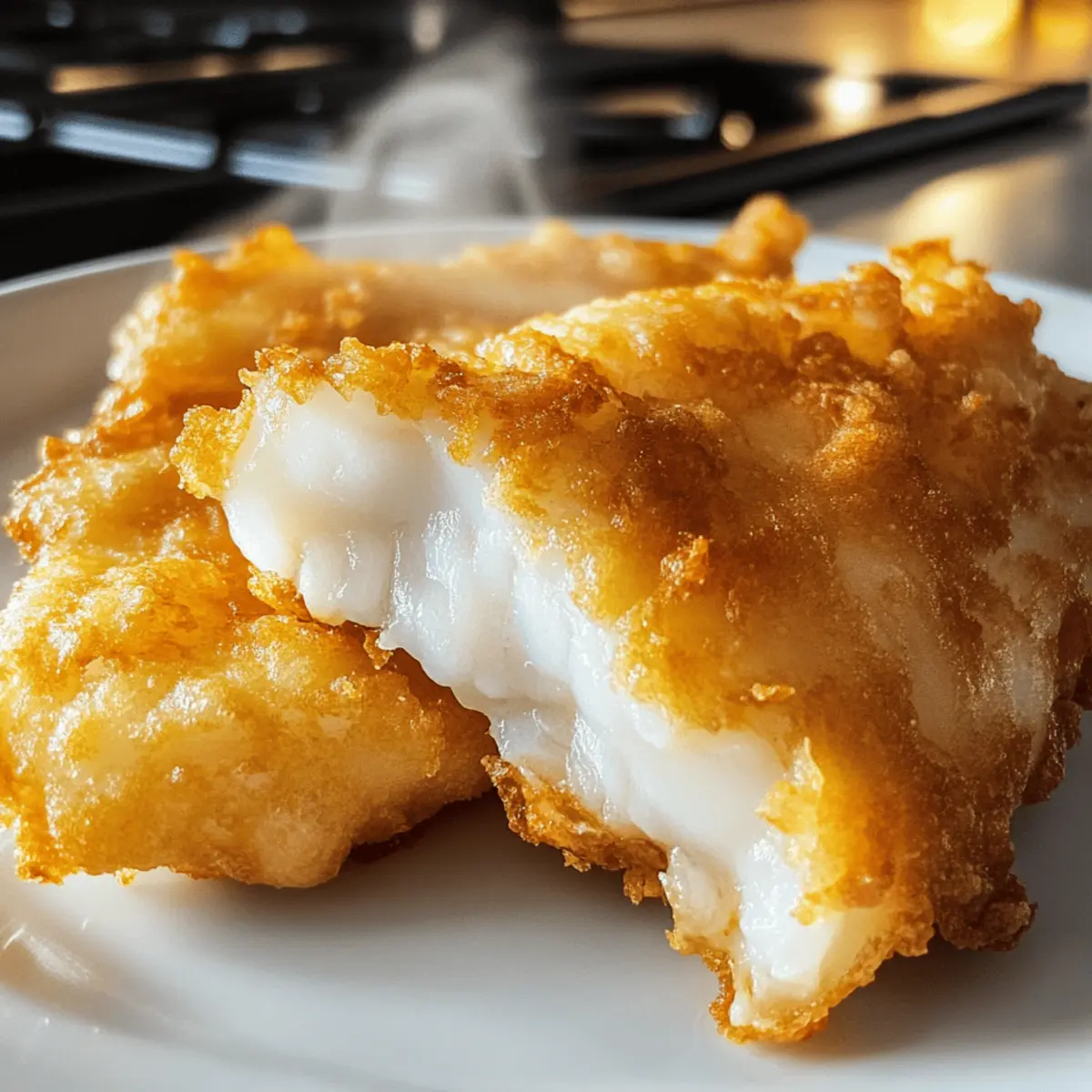 Kürzlich habe ich in einem kleinen Café am Meer den besten, knusprig gebackenen Fisch meines Lebens probiert – zart, goldbraun und perfekt gewürzt. Spontan entschloss ich mich, meine eigene Version von Captain D’s inspirierter, battergetauchter Fischfilets zu kreieren. Diese hausgemachte Köstlichkeit bietet nicht nur einen himmlischen Biss mit einer leichten, luftigen Panade, sondern lässt sich auch kinderleicht und budgetfreundlich zubereiten. Du wirst überrascht sein, wie schnell du eine schmackhafte Alternative zum schnellen Essen selbst auf den Tisch zaubern kannst. Und das Beste? Die Möglichkeiten zur Anpassung mit verschiedenen Gewürzen und Soßen sind nahezu grenzenlos! Bist du bereit für dieses knusprige Abenteuer? Lass uns gleich loslegen! Warum wirst du dieses Rezept lieben? Einfache Zubereitung: Die Schritte sind unkompliziert, du benötigst keine speziellen Fähigkeiten in der Küche. Knuspriger Genuss: Eine perfekte Kombination aus knuspriger Panade und zartem Fisch wird deine Geschmacksknospen begeistern. Kostengünstige Alternative: Diese hausgemachte Variante ist nicht nur erschwinglich, sondern auch viel gesünder als Fast Food. Vielseitigkeit: Experimentiere mit Gewürzen oder Soßen, um das Gericht nach deinem Geschmack anzupassen. Tolle Präsentation: Serviere den Fisch mit klassischen Beilagen wie Pommes oder einem frischen Salat – perfekt für jeden Anlass! Zutaten für den Teigmantel • Mache dich bereit für eine köstliche Kreation! Für den Teig Weizenmehl – sorgt für die Struktur des Teigs; du kannst glutenfreies Mehl verwenden, um eine glutenfreie Version zu kreieren. Backpulver – macht den Teig luftig; achte darauf, dass es frisch ist für beste Ergebnisse. Salz und Pfeffer – verstärken den Geschmack; nach Belieben anpassen. Milch – hydratisiert den Teig und verleiht eine cremige Textur; Buttermilch bietet zusätzlichen Reichtum und einen Hauch von Säure. Für die Fischfilets Fischfilets (z.B. Kabeljau, Tilapia, Schellfisch, Wels) – der Hauptbestandteil; wähle milden und festfleischigen Fisch für die beste Erfahrung. Für das Frittieren Speiseöl – notwendig zum Frittieren; wähle ein Öl mit hohem Rauchpunkt, wie Raps- oder Pflanzenöl. Dieses knusprige Captain D’s Fisch im Teigmantel Rezept wird deine Familie sicher begeistern! Schritt-für-Schritt-Anleitung für das Rezept Knuspriger Captain D’s Fisch im Teigmantel Step 1: Fisch vorbereiten Spüle die Fischfilets gründlich unter kaltem Wasser ab und tupfe sie mit Küchenpapier trocken. Dieser Schritt sorgt dafür, dass die Teighülle später besser haftet. Lege die vorbereiteten Filets auf einen Teller und stelle sie beiseite, während du die restlichen Zutaten vorbereitest. Step 2: Kochmethode vorheizen Wenn du den Fisch im Ofen backen möchtest, heize diesen auf 200 °C vor. Solltest du die Frittiervariante wählen, erhitze in einer tiefen Pfanne oder einem Frittiergerät genug Öl, um den Boden etwa 2-3 cm hoch zu bedecken. Warte, bis das Öl auf etwa 180 °C erhitzt ist, bevor du mit dem Frittieren beginnst. Step 3: Teig zubereiten In einer großen Rührschüssel vermenge das Weizenmehl, Backpulver, Salz und Pfeffer gut miteinander. Gieße nach und nach die Milch hinzu und verrühre alles zu einem glatten Teig, der von der Konsistenz her leicht dickflüssig ist, ähnlich wie Pfannkuchenteig. Achte darauf, dass keine Klumpen entstehen. Step 4: Fisch eintauchen Nimm ein Fischfilet und tauche es vollständig in den vorbereiteten Teig, sodass es gut ummantelt ist. Lass überschüssigen Teig vorsichtig abtropfen, bevor du das Filet in die Pfanne oder auf das Backblech legst. Wiederhole diesen Vorgang für alle Filets, um sicherzustellen, dass jedes gut bedeckt ist. Step 5: Backoption Wenn du den Fisch im Ofen backst, lege die eingetauchten Fischfilets auf ein mit Backpapier ausgelegtes Blech. Backe sie für etwa 15-20 Minuten, bis die Panade goldbraun und knusprig ist. Wende die Filets nach der Hälfte der Zeit, um eine gleichmäßige Bräunung zu gewährleisten. Step 6: Frittieroption Lege die vorbereiteten Fischfilets vorsichtig in das heiße Öl. Frite die Filets für etwa 3-4 Minuten auf jeder Seite, bis sie außen knusprig und goldbraun sind. Achte darauf, sie nicht zu überladen, damit die Temperatur des Öls konstant bleibt. Nach dem Frittieren lasse die Filets auf Küchenpapier abtropfen. Step 7: Servieren Serviere den knusprigen Captain D’s Fisch im Teigmantel heiß auf einem Teller, begleitet von klassischen Beilagen wie Pommes oder einem frischen Salat. Du kannst auch verschiedene Dips wie Tartarsauce oder Cocktailsauce anbieten, um das Gericht optimal zu ergänzen. Was serviere ich zu Captain D’s Fisch im Teigmantel? Lass uns ein vollwertiges Menü zusammenstellen, das die Aromen des knusprigen Fisches perfekt ergänzt und deine Gäste begeistern wird. Cremige Coleslaw: Erfrischend kühle Coleslaw mit einer leichten Mayonnaise- oder Vinaigrette sorgt für einen schönen Kontrast zur knusprigen Textur des Fisches. Pommes Frites: Klassische Pommes bieten die perfekte Kombination aus herzhaft und knusprig, die jeden Bissen abrundet. Zitronenspalten: Frisch gepresster Zitronensaft über dem Fisch hebt die Aromen hervor und verleiht einen spritzigen Kick. Garten-Salat: Ein gemischter Salat mit knackigem Gemüse und einem leichten Dressing bringt frische und Farbe auf den Teller. Kürbiskernbrot: Dieses rustikale Brot ist ideal, um die Aromen der Beilagen aufzunehmen und eignet sich hervorragend, um Reste auf dem Teller in sich aufzunehmen. Eisgekühlte Limonade: Ein kaltes, spritziges Getränk optimal zum Ausgleich der würzigen Noten des Fisches und für eine erfrischende Note. Hausgemachte Tartarsauce: Diese cremige Sauce ist ein Muss, um dem Gericht einen zusätzlichen Geschmackskick zu verleihen und schmeckt einfach köstlich zu frittiertem Fisch. Apfelstrudel: Zum Dessert harmoniert dieser süße Klassiker perfekt zu dem herzhaften Fischgericht und runde