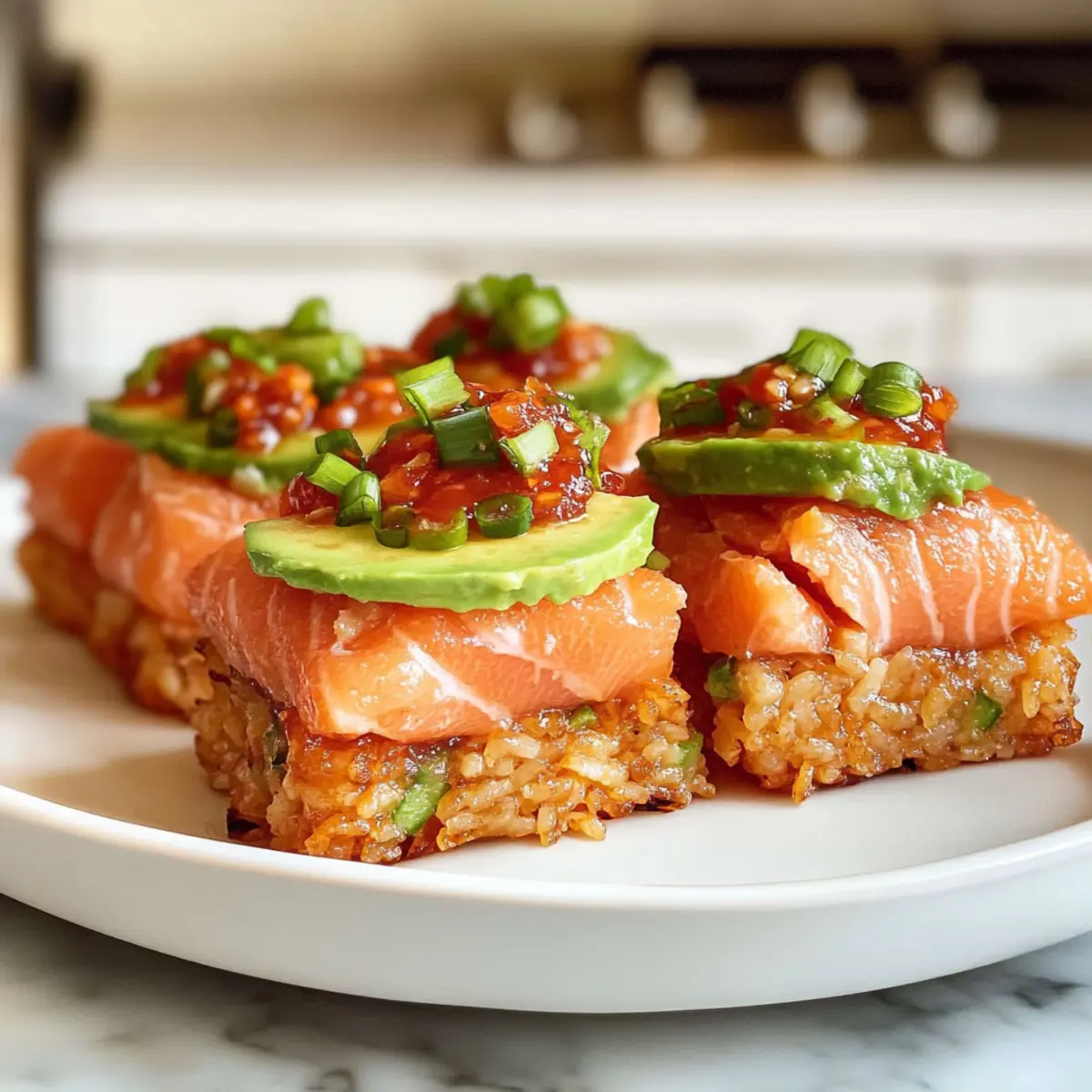 Überall um mich herum erlebe ich gerade die aufregende Fusion von Aromen und Texturen, besonders wenn ich an meinen letzten kulinarischen Triumph denke: knuspriger Reis mit würzigem Lachs. Diese köstliche Kombination aus goldbraunem, knusprigem Reis und einer cremigen, pikanten Lachsfüllung bringt nicht nur frischen Wind in eure Küche, sondern ist auch blitzschnell zubereitet und perfekt für jede Gelegenheit. Mit der bequemen Möglichkeit, verschiedene Meeresfrüchte zu verwenden, bietet dieses asiatisch inspirierte Rezept eine sommerlich frische Note, die bei euren Gästen garantiert Eindruck hinterlässt. Wer kann schon widerstehen, wenn sich samtige Avocado und feurige Jalapeños auf einem knusprigen Bett vereinen? Lasst uns gemeinsam in die Welt dieser verführerischen Köstlichkeit eintauchen, die sowohl für die Feier im Freundeskreis als auch für den gemütlichen Abend zu Hause ideal ist. Seid ihr bereit, eure Geschmacksnerven auf ein neues Level zu heben? Warum dieses Rezept unwiderstehlich ist? Köstliche Aromen: Der knusprige Reis kombiniert sich perfekt mit der würzigen Lachsfülle, um jedem Bissen ein aufregendes Geschmackserlebnis zu geben. Ein frischer Twist: Diese asiatisch inspirierte Delikatesse bringt frische Zutaten wie Avocado und Jalapeño auf den Tisch und macht sie zu einem echten Hit. Rasche Zubereitung: In weniger als 30 Minuten seht ihr vor euch ein Gourmetgericht, das jeden begeistert! Vielfältige Anpassungen: Probiert die Variationsmöglichkeiten mit verschiedenen Meeresfrüchten aus, um das Gericht individuell zu gestalten. Perfekt für Anlässe: Ob als Appetizer oder festliches Gericht – dies ist die ideale Wahl für jedes Event! Zutaten für Knuspriger Reis mit würzigem Lachs • Die perfekte Kombination für einen geschmacklichen Aufschwung! Für den Reis Kurzkornreis (Sushi-Reis) – sorgt für die notwendige Klebrigkeit, damit das Reis-„Kissen“ seine Form behält. Reisessig – bringt die perfekte Säure ins Spiel, um den Reis geschmacklich abzurunden. Zucker – balanciert die Säure des Essigs und verstärkt den Gesamtgeschmack. Koscheres Salz – hebt die Aromen hervor; nach Geschmack hinzufügen. Neutrales Öl (hocherhitzbar) – eignet sich zum Frittieren und sorgt für herrliche Knusprigkeit; Avocadoöl kann auch verwendet werden. Für die Füllung Sushi-Qualität Lachs – der Hauptdarsteller dieses Gerichts; achte auf Frische und Qualität. Alternativ kann auch ahi Thunfisch oder Dosenlachs verwendet werden. Kewpie Mayo – fügt eine reichhaltige Umami-Note hinzu; kann bei Bedarf durch normale Mayo ersetzt werden. Sriracha – sorgt für die gewünschte Schärfe; variiere die Menge je nach Schärfewunsch. Sojasauce – sorgt für die salzige Tiefe; es gibt auch natriumarme Varianten. Geröstetes Sesamöl – verleiht einen nussigen Geschmack; sparsam verwenden, nur für das Drizzeln. Frühlingszwiebel – für Frische und Crunch; fein gehackt als Topping verwenden. Für das Topping Avocado – die glatte Textur ergänzt perfekt den knusprigen Reis und den würzigen Lachs; sollte reif und dünn geschnitten sein. Jalapeño – bringt Wärme und Crunch; frisch in Scheiben schneiden und als Garnitur verwenden. Geröstete weiße Sesamsamen – zum Garnieren; sorgen für eine angenehme Knusprigkeit und visuelle Attraktivität. Süße Chilisauce – verleiht eine süße Note, die die Schärfe perfekt ausgleicht. Mit diesen Zutaten zaubert ihr im Handumdrehen den köstlichen Knusprigen Reis mit würzigem Lachs, der euren Gaumen verwöhnt! Schritt-für-Schritt-Anleitung für Knuspriger Reis mit würzigem Lachs Step 1: Reis vorbereiten Wascht den Kurzkornreis (Sushi-Reis) gründlich unter kaltem Wasser, bis das Wasser klar ist. Kocht den Reis gemäß den Anweisungen auf der Verpackung; verwendet dafür einen Reiskocher oder einen Topf mit Deckel. Lasst den Reis nach dem Kochen etwas abkühlen, um eine ideale Basis für den knusprigen Reis zu schaffen. Step 2: Sushi-Essig zubereiten In einem kleinen Topf kombiniert ihr Reisessig, Zucker und koscheres Salz. Erhitzt die Mischung leicht bei mittlerer Hitze, bis sich Zucker und Salz vollständig aufgelöst haben. Vermischt diesen Sushi-Essig dann vorsichtig mit dem abgekühlten Reis, sodass er die Aromen gleichmäßig aufnimmt. Step 3: Reis pressen Legt eine 20×20 cm große Backform mit Frischhaltefolie aus und gebt den gewürzten Reis hinein. Drückt den Reis mit einem Löffel oder einer flachen Fläche gleichmäßig an, damit er gut zusammenhält. Stellt die Form für etwa 3 Stunden in den Gefrierschrank, damit der Reis fest wird und die Form behält. Step 4: Würzigen Lachs vorbereiten Schneidet den Sushi-Qualität Lachs in kleine Würfel und gebt ihn in eine Schüssel. Fügt Kewpie Mayo, Sriracha, Sojasauce, geröstetes Sesamöl und gehackte Frühlingszwiebeln hinzu. Vermischt alles gut und lasst die Mischung im Kühlschrank ruhen, bis ihr bereit seid, die köstlichen Knusprigen Reisbasis damit zu belegen. Step 5: Reisblöcke frittieren Nehmt den gefrorenen Reis aus der Form und schneidet ihn in gleichmäßige Rechtecke. Erhitzt in einer Pfanne ausreichend neutrales Öl auf mittlerer bis hoher Temperatur. Frittiert die Reisblöcke für etwa 1-2 Minuten pro Seite, bis sie goldbraun und knusprig sind. Achtet darauf, dass sie nicht verbrennen und eine knusprige Textur entwickeln. Step 6: Anrichten Platziert jeden knusprigen Reisblock auf einem Teller. Belegt ihn mit einer Scheibe Avocado, gefolgt von einem Löffel der würzigen Lachsfüllung. Garniert das Ganze mit frischen Jalapeño-Scheiben, einem Spritzer geröstetem Sesamöl und süßer Chilisauce. Zuletzt streut geröstete Sesamsamen darüber, um den Knuspriger Reis mit würzigem Lachs stilvoll zu vollenden. Serviert das Gericht sofort. Was passt zu Knuspriger Reis mit würzigem Lachs? Genießt den unwiderstehlichen Knusprigen Reis mit würzigem Lachs und bereitet damit eine komplette, geschmackliche Offenbarung für eure Gäste! Cremige