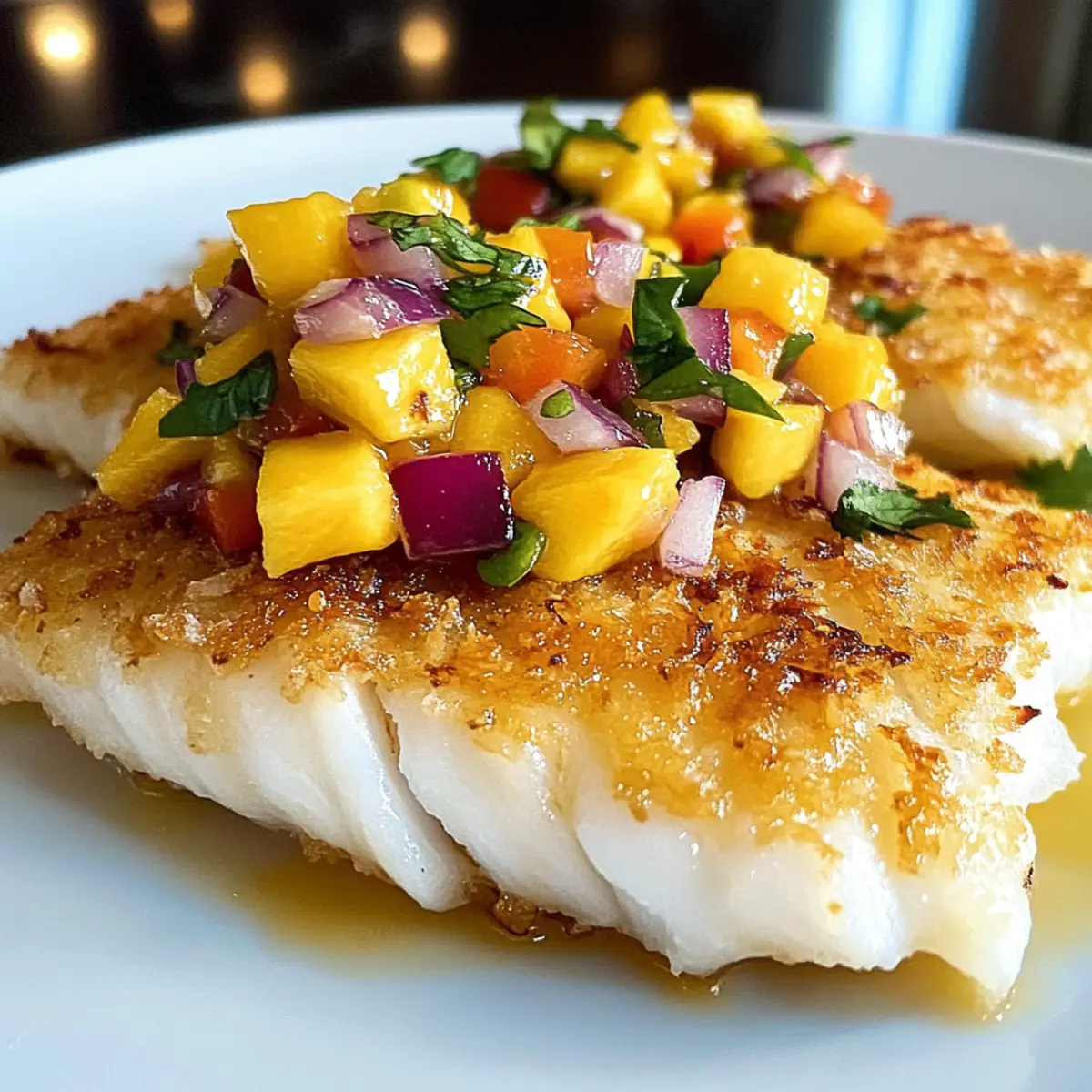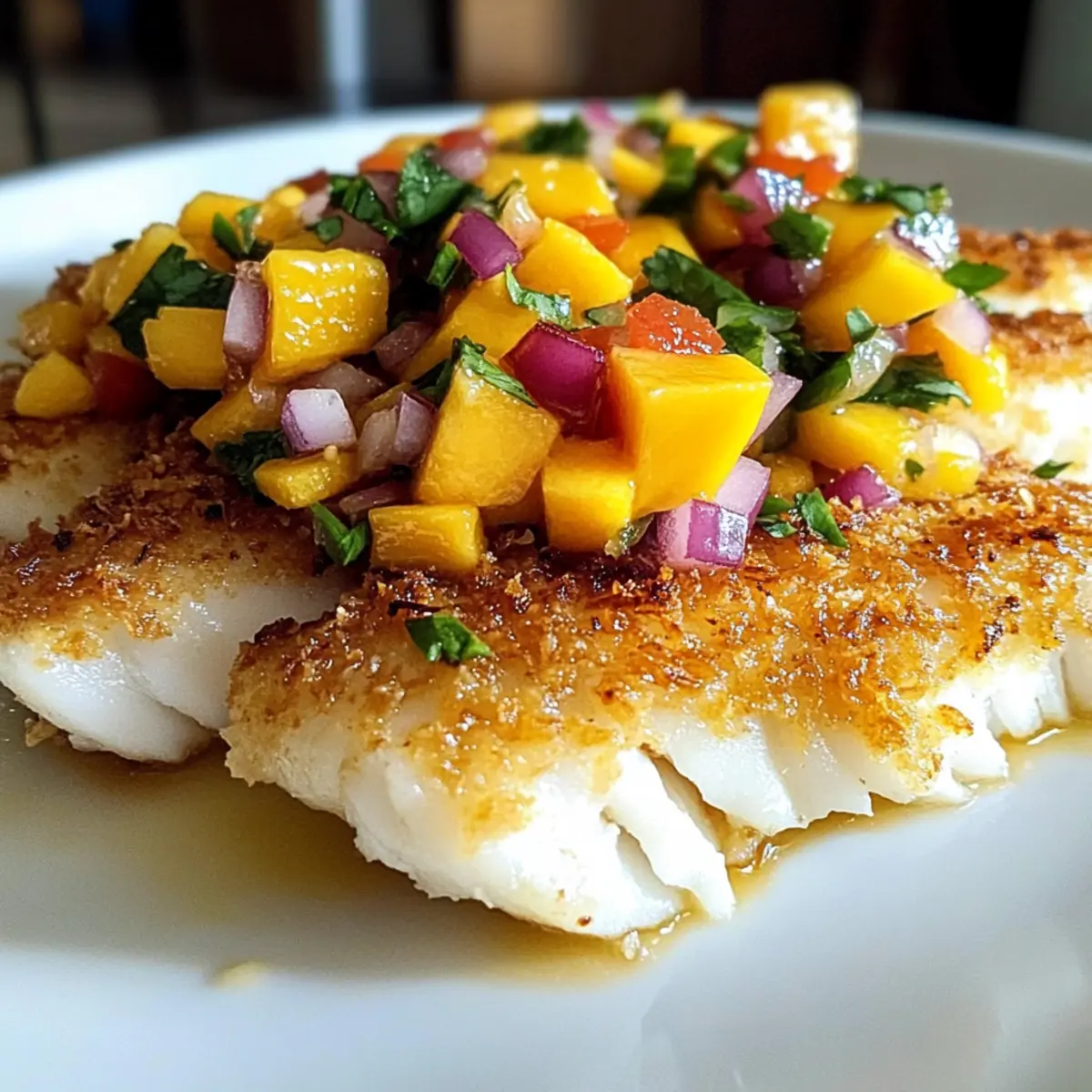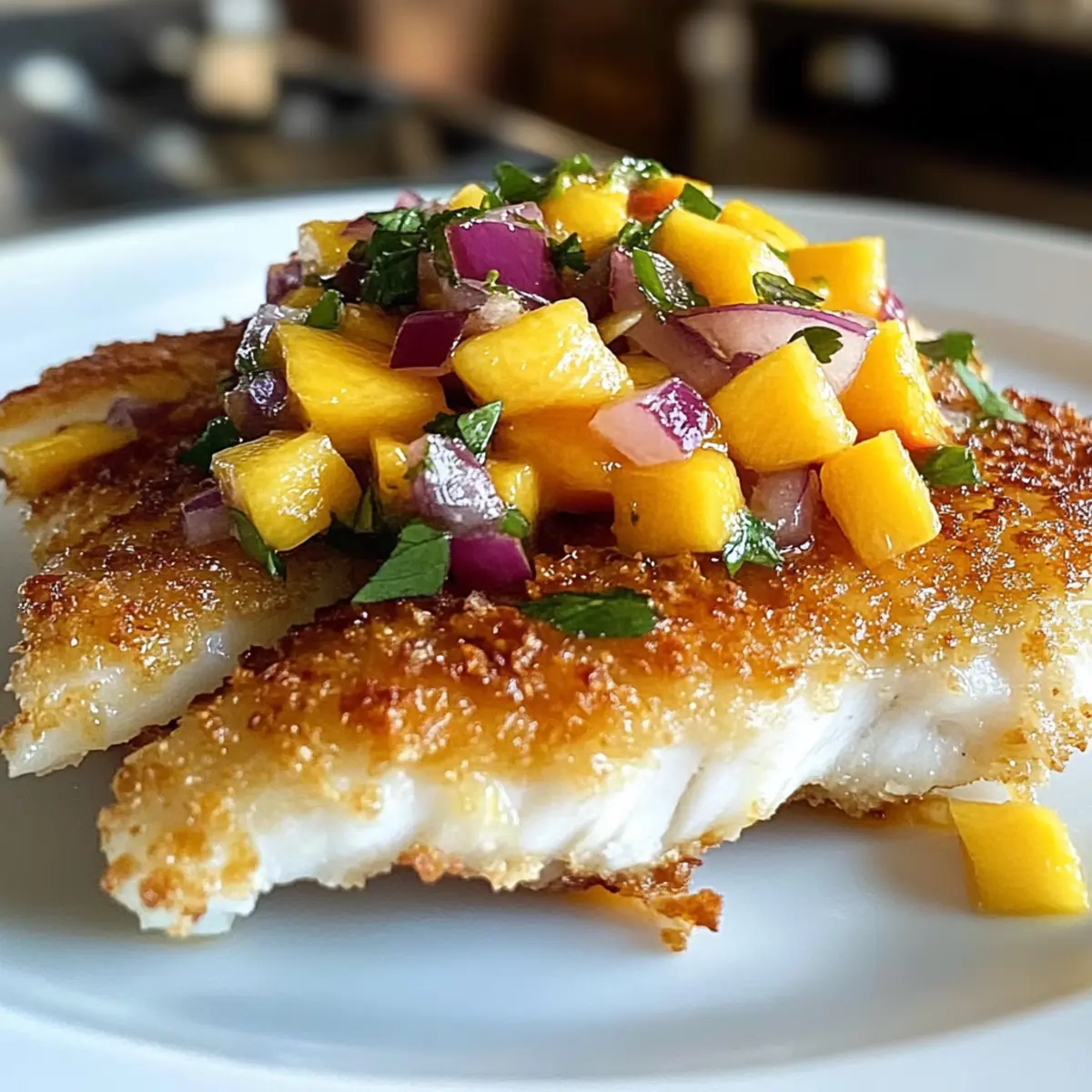 Es gibt nichts Schöneres, als sich nach einem langen Tag in die Küche zu begeben und sich mit einem Gericht zu belohnen, das sich wie ein Kurzurlaub anfühlt. Mein Rezept für Kokosnusskruste Fisch mit Mango Salsa nimmt euch mit auf eine kulinarische Reise in die Tropen. Die Kombination aus einer knusprigen Kokosnusskruste und zartem, saftigem Fisch wird eure Geschmacksknospen verzaubern, während die erfrischende Mango Salsa einen fruchtigen Akzent setzt. Diese einfache, aber beeindruckende Mahlzeit lässt sich blitzschnell zubereiten und ist perfekt für gesellige Abende oder entspannte Familienessen. Bereit, den tropischen Genuss in eurem eigenen Zuhause zu entfachen? Lasst uns gemeinsam starten! Warum ist dieses Rezept so besonders? Einfachheit: Die Zubereitung ist unkompliziert und benötigt nur grundlegende Kochkenntnisse, sodass ihr sofort loslegen könnt. Tropische Aromen: Die Kombination aus knuspriger Kokosnuss und saftigem Fisch entführt euch direkt in die Tropen. Vielseitigkeit: Egal ob mit Tilapia, Lachs oder Catfish – ihr habt die Freiheit, euren Lieblingsfisch zu wählen. Frische Salsa: Die Mango Salsa ist ein gesunder und frischer Begleiter, der jedem Biss das gewisse Etwas verleiht. Schnell zubereitet: In weniger als 30 Minuten könnt ihr das Gericht genießen, ideal für hektische Wochentage. Crowd-Pleaser: Dieses Gericht wird garantiert bei Familie und Freunden gut ankommen – perfekt für die nächste Dinnerparty! Kokosnusskruste Fisch mit Mango Salsa Zutaten • Diese Zutatenliste macht eure tropische Mahlzeit komplett! Für den Fisch Frische Fischfilets – Wählt aus Tilapia, Lachs oder Catfish für den besten Geschmack. Eier (2 große, geschlagen) – Helfen, die Kokosnussmischung am Fisch haften zu lassen. Allzweckmehl (1/4 Tasse) – Unterstützt die Feuchtigkeitsbindung des Fisches während des Kochens. Für die Panade Geraspelte Kokosnuss – Verleiht eine knusprige Textur, die das Gericht besonders macht. Semmelbrösel – Verbessern die Konsistenz der Kruste und machen sie extra knusprig. Salz – Verstärkt den Geschmack des Gerichts. Schwarzer Pfeffer – Bringt eine subtile Würze ins Spiel. Knoblauchpulver – Fügt eine extra Geschmackstiefe hinzu. Paprika – Gibt der Panade Farbe und zusätzlichen Geschmack. Für die Mango Salsa Mango (1 reif, gewürfelt) – Sorgt für die frische und süße Note der Salsa, ideal sind leicht weiche Mangos. Rote Zwiebel (1/2 Tasse, fein gehackt) – Bringt Crunch und einen kräftigen Geschmack. Rote Paprika (1 mittelgroß, gewürfelt) – Fügt Süße und lebendige Farben hinzu. Jalapeño (1 mittelgroß, entkernt und fein gehackt) – Für einen Hauch von Schärfe, nach Geschmack anpassen. Limette (Saft von 1) – Sorgt für Säure und Frische in der Salsa. Diese aufregende Kombination von Zutaten verspricht nicht nur ein schmackhaftes, sondern auch ein gesundes Gericht, perfekt für alle Liebhaber von tropischen Aromen! Schritt-für-Schritt-Anleitung für Kokosnusskruste Fisch mit Mango Salsa Step 1: Panade vorbereiten In einer flachen Schüssel vermischt ihr geraspelte Kokosnuss, Semmelbrösel, Salz, schwarzen Pfeffer, Knoblauchpulver und Paprika. Rührt alles gut um, bis die Zutaten gleichmäßig verteilt sind. Diese Mischung sorgt für die köstliche Kokosnusskruste und sollte bereit sein, während ihr den Fisch vorbereitet. Step 2: Dredging-Setup einrichten In zwei separaten Schalen schlagt ihr die Eier und gebt das Allzweckmehl in die zweite Schüssel. Das Mehl wird helfen, die Feuchtigkeit des Fisches zu binden, während die Eier die Kokosnussmischung anhaften lassen. Stellt sicher, dass alles gut griffbereit ist, bevor ihr mit dem Fisch arbeitet. Step 3: Fisch panieren Nehmt ein Fischfilet und wendet es zuerst in der Mehlmischung, dann taucht ihr es in die verquirlten Eier. Danach drückt ihr das Filet fest in die Kokosnussmischung, sodass es gleichmäßig bedeckt ist. Wiederholt diesen Vorgang für alle Fischfilets, um eine knusprige Kokosnusskruste zu erzielen. Step 4: Öl erhitzen Erhitzt in einer großen Pfanne bei mittlerer Hitze etwa 3-4 Esslöffel Öl. Ein kleiner Test mit einem Stück Fisch hilft euch dabei, die richtige Temperatur zu finden; wenn es sofort zu brutzeln beginnt, ist das Öl bereit für die Fischfilets. Achtet darauf, hochwertiges Öl mit hohem Rauchpunkt wie Raps- oder Pflanzenöl zu verwenden. Step 5: Fisch braten Legt die panierten Fischfilets vorsichtig in die heiße Pfanne und bratet sie für 4-5 Minuten pro Seite, bis sie goldbraun und schön knusprig sind. Kontrolliert die Unterseite, bevor ihr den Fisch wendet; sie sollte schön goldig sein. Nach dem Braten hebt ihr die Filets vorsichtig heraus und lasst sie auf einem Papiertuch abtropfen. Step 6: Salsa zubereiten Während der Fisch brät, kombiniert ihr in einer Schüssel die gewürfelte Mango, gehackte rote Zwiebel, gewürfelte rote Paprika und den gehackten Jalapeño. Lichtet den Saft einer Limette über die Mischung und rührt alles gut um, sodass sich die Aromen verbinden. Die frisch zubereitete Mango Salsa ist der perfekte Begleiter zu eurem Kokosnusskruste Fisch. Step 7: Anrichten und servieren Legt die knusprigen Fischfilets auf einen Teller und gebt großzügig die Mango Salsa darauf. Serviert das Gericht sofort, um den vollen, frischen Geschmack und die knusprige Textur zu genießen. Ihr könnt dazu noch etwas frischen Koriander oder Limettenstücke als Garnitur verwenden! Kokosnusskruste Fisch mit Mango Salsa Variationen Ihr könnt dieses Rezept ganz nach euren Vorlieben anpassen und die Aromen zusätzlich aufwerten! Fischvielfalt: Wählt zwischen Tilapia, Lachs oder auch Snapper – jedes Filet bringt seinen eigenen besonderen Geschmack. Salsa-Twists: Ergänzt die Mango Salsa mit Ananas oder Avocado für ein süßes, cremiges Geschmackserlebnis. Scharf oder mild: Verwendet Cayennepfeffer in der Panade für extra Schärfe oder reduziert die Menge an Jalapeño für eine mildere Salsa. Glutenfrei: Tauscht die Semme