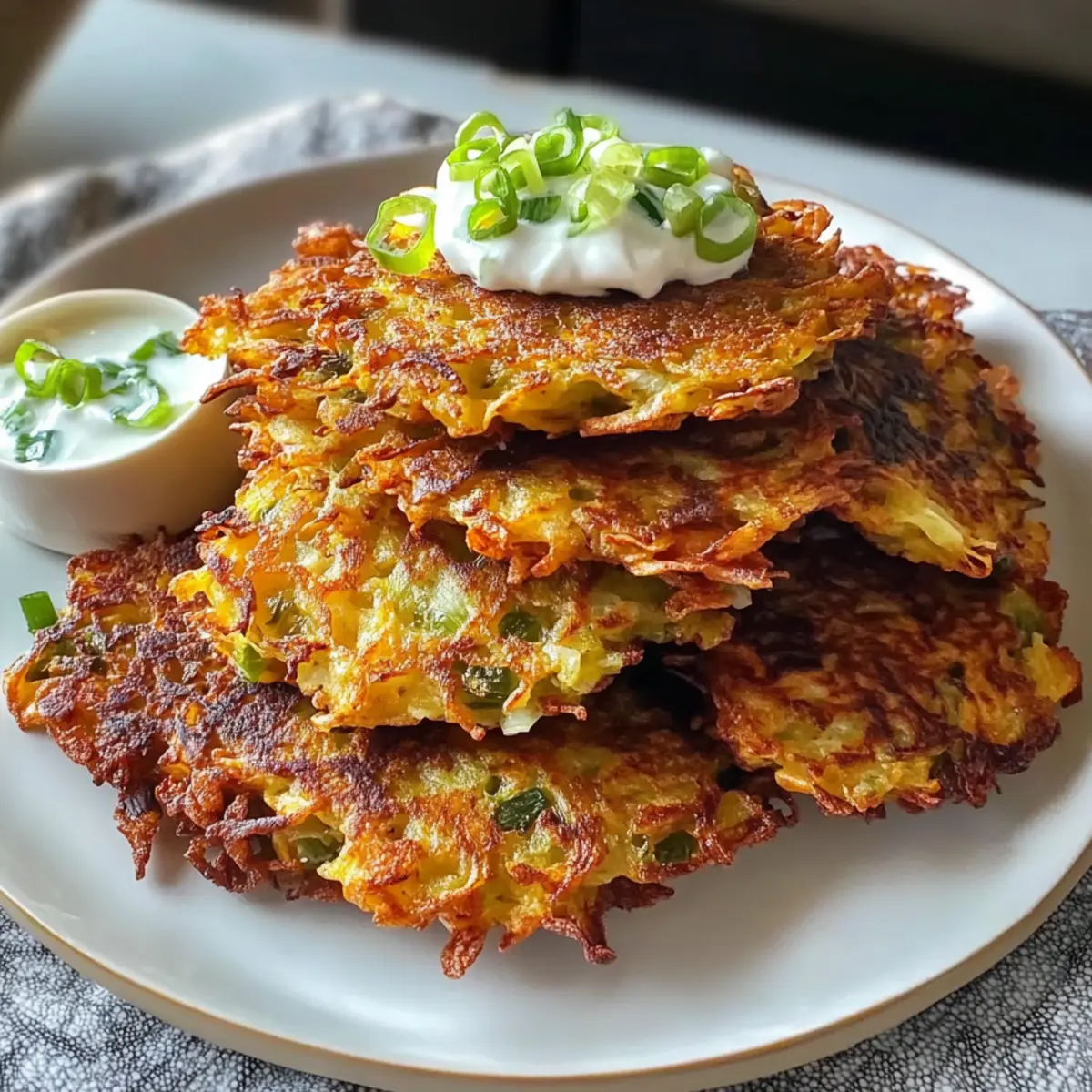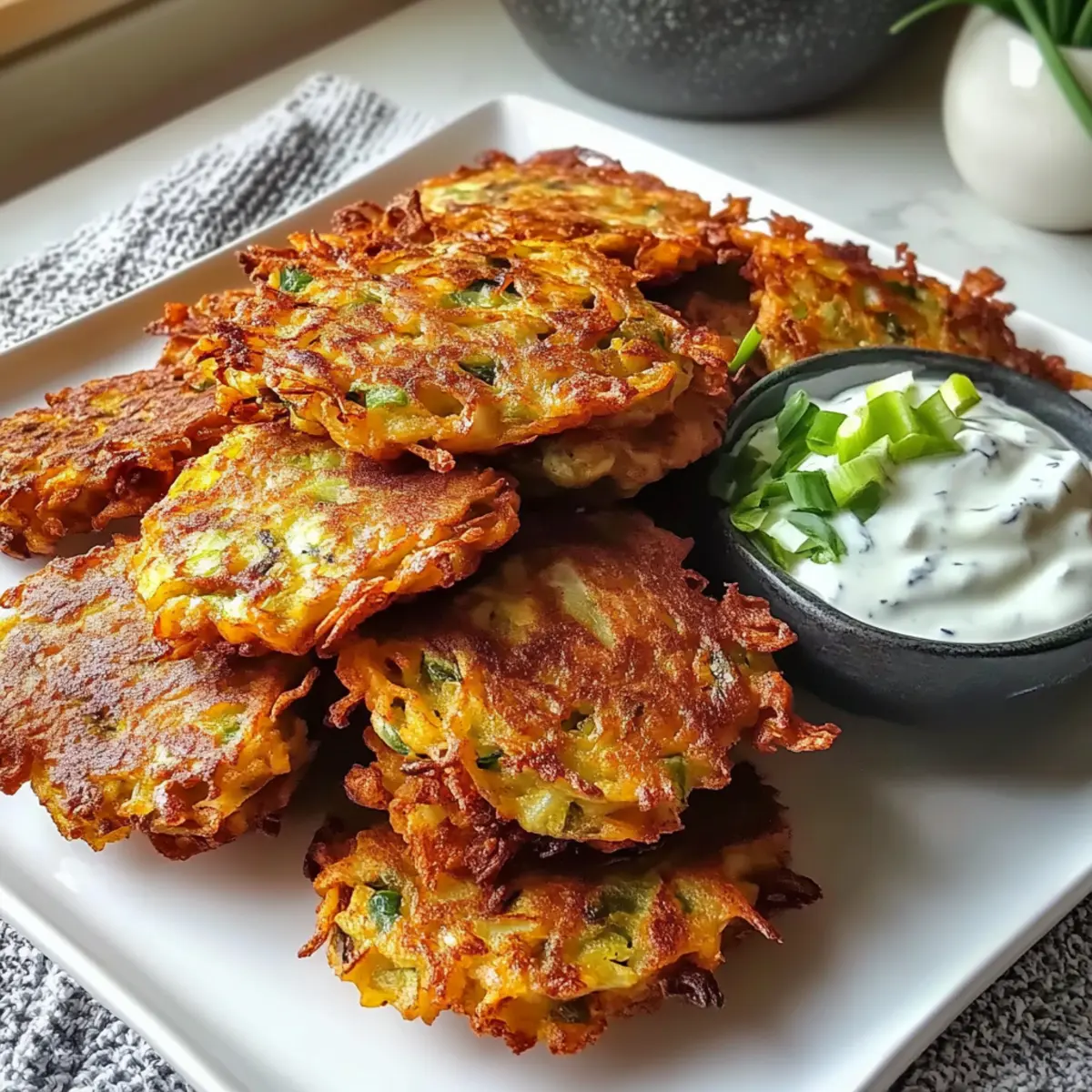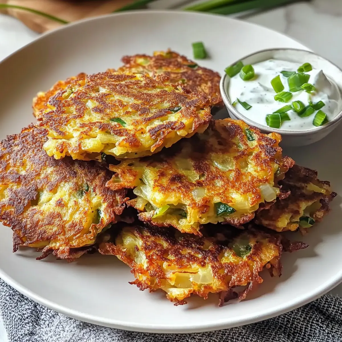 Kürzlich hörte ich, wie meine Nachbarin schwärmte: „Ich habe nie gedacht, dass Kohl so lecker sein kann!“ Da wurde mir klar, dass viele von uns sich schwer tun, mit Gemüse eine wahre Geschmacksexplosion zu kreieren. Mit meinen Krossen Kohlfrikadellen gebe ich Ihnen das perfekte Rezept an die Hand, um ganz ohne Mühe köstliche und knusprige Snacks zu zaubern, die sowohl Kinder als auch Erwachsene begeistern. Diese Fritters sind nicht nur einfach zuzubereiten, sondern auch eine tolle Möglichkeit, Gemüse in der Familie beliebt zu machen. Zudem sind sie vielseitig: ob zum Frühstück, als Beilage oder einfach zwischendurch – sie bringen Abwechslung auf den Tisch. Neugierig, wie Sie diese köstlichen Köstlichkeiten ganz schnell selbst herstellen können? Warum sind Krosse Kohlfrikadellen so beliebt? Vielseitigkeit: Diese Krossen Kohlfrikadellen sind nicht nur ein hervorragender Snack, sondern auch wunderbar als Beilage oder Frühstück geeignet. Einfachheit: Mit nur wenigen Zutaten und ohne komplizierte Prozesse sind sie für jeden schnell zubereitet. Voller Geschmack: Die Kombination aus knusprigem Äußeren und zartem Inneren sorgt für Freude in jedem Bissen. Familienfreundlich: Selbst fährige Gemüsemuffel werden von diesen Fritters begeistert sein! Und wenn Sie Lust auf noch mehr kreative Snacks haben, schauen Sie sich auch meine Knusprigen Blumenzwiebeln Rezept oder Knuspriges Sesam Hühnchen an. Krosse Kohlfrikadellen Zutaten • Sie sind neugierig auf die Krosse Kohlfrikadellen? Hier sind die Zutaten, die Sie benötigen! Für die Frikadellen Grüner Kohl – Liefern Sie das Volumen und die Nährstoffe; für eine zartere Textur können Sie auch Napa-Kohl verwenden. Karotten – Bringen Sie eine natürliche Süße und leuchtende Farbe; keine direkten Alternativen empfohlen, aber andere Wurzelgemüse könnten funktionieren. Frühlingszwiebeln – Verleihen Sie den Fritters einen zusätzlichen Geschmack durch die Verwendung von Zwiebel und Grün; Schnittlauch ist eine milde Alternative. Eier – Binden die Mischung und sorgen für Stabilität; keine Substitutionen empfohlen, da sie wichtig fürs Binden sind. Mehl – Gibt den Fritters Struktur und Knusprigkeit; verwenden Sie glutenfreies Mehl für eine glutenfreie Option. Knoblauch – Fügt Tiefe hinzu; Schalotten können für einen milderen Geschmack verwendet werden. Salz, Pfeffer, Paprika, Koriander, Backpulver – Würzen und helfen bei der Textur; passen Sie die Gewürze nach Ihrem Geschmack an. Neutrales Öl (z.B. Bertolli Extra Light Olivenöl) – Zum Braten, nötig, um die knusprige Textur zu erreichen; auch andere neutrale Öle wie Raps- oder Pflanzenöl sind geeignet. Schritt-für-Schritt-Anleitung für Krosse Kohlfrikadellen Step 1: Gemüse vorbereiten Den grünen Kohl fein hacken und die Karotten grob raspeln. Beides in eine große Schüssel geben. Achten Sie darauf, dass der Kohl und die Karotten gut verteilt sind, um ein gleichmäßiges Ergebnis zu erzielen. Diese Vorarbeit sorgt auch dafür, dass die Krosse Kohlfrikadellen gleichmäßig knusprig werden. Step 2: Aromatische Zutaten kombinieren Die Frühlingszwiebeln in feine Ringe schneiden und den Knoblauch fein hacken. Diese aromatischen Zutaten zur Schüssel mit Kohl und Karotten hinzufügen. Gut vermengen, sodass die Aromen sich gleichmäßig verteilen. Dies gibt den Krossen Kohlfrikadellen einen zusätzlichen Geschmacksschub. Step 3: Trockene Zutaten vermischen In einer separaten Schüssel Mehl, Salz, Pfeffer, Paprika, Koriander und Backpulver gut vermengen. Diese Mischung hilft, die Krosse Kohlfrikadellen an der Oberfläche knusprig zu machen. Stellen Sie sicher, dass keine Klumpen im Mehl sind, bevor Sie die trockenen Zutaten mit den feuchten Zutaten kombinieren. Step 4: Mischungen kombinieren Die Gemüse-Mischung und die Eier zu den trockenen Zutaten geben. Sanft unterheben, bis alles gleichmäßig vermengt ist. Lassen Sie die Mischung für 5–10 Minuten ruhen, damit die Konsistenz fester wird und die Kohlfrikadellen beim Braten besser zusammenhalten. Step 5: Öl erhitzen Eine Pfanne auf mittlerer Hitze vorheizen und das neutrale Öl hineingeben, bis es heiß, aber nicht rauchend ist. Um den richtigen Temperaturpunkt zu erkennen, können Sie einen kleinen Löffel des Teigs hineinlegen – wenn er sofort zu brutzeln beginnt, ist das Öl bereit. Das richtige Öl erhitzen ist entscheidend für eine knusprige Textur der Krossen Kohlfrikadellen. Step 6: Fritters braten Mit einem Löffel portionieren Sie den Teig in das heiße Öl und lassen Sie genügend Platz zwischen den Fritters (mindestens 5 cm Abstand). Die Fritters für etwa 3 Minuten anbraten, bis sie goldbraun sind. Wenden Sie sie vorsichtig und braten Sie die andere Seite, bis sie ebenfalls knusprig und goldbraun ist. Step 7: Abtropfen lassen Die fertigen Krossen Kohlfrikadellen mit einer Schaumkelle aus der Pfanne nehmen und auf ein mit Küchenpapier ausgelegtes Blech legen. So kann das überschüssige Öl abtropfen und die Fritters bleiben schön knusprig. Achten Sie darauf, nicht zu viele Fritters auf einmal zu braten, um eine gleichmäßige Garung zu gewährleisten. Step 8: Servieren Die Krossen Kohlfrikadellen warm servieren, idealerweise mit einer joghurtbasierten Sauce oder frischer Salsa als Dip. Diese Kombination bringt frische Aromen und Kontraste auf den Tisch. Genießen Sie diese köstlichen Snacks oder Beilagen mit Ihrer Familie und Freunden! Lagerungstipps für Krosse Kohlfrikadellen Zimmertemperatur: Lassen Sie die krossen Kohlfrikadellen nach dem Frittieren auf Küchenpapier abkühlen, bevor Sie sie in einem offenen Behälter für kurze Zeit warm halten. Kühlschrank: Bewahren Sie übrig gebliebene Fritters in einem luftdichten Behälter im Kühlschrank auf. Sie bleiben bis zu 4 Tage frisch. Gefrierschrank: Krosse Kohlfrikadellen können bis zu 3 Monate eingefroren werden. Legen Sie sie zwischen Pergamentpapier in einem Gefrierbehälter, um ein Ankleben zu verhindern. Wiedererwä