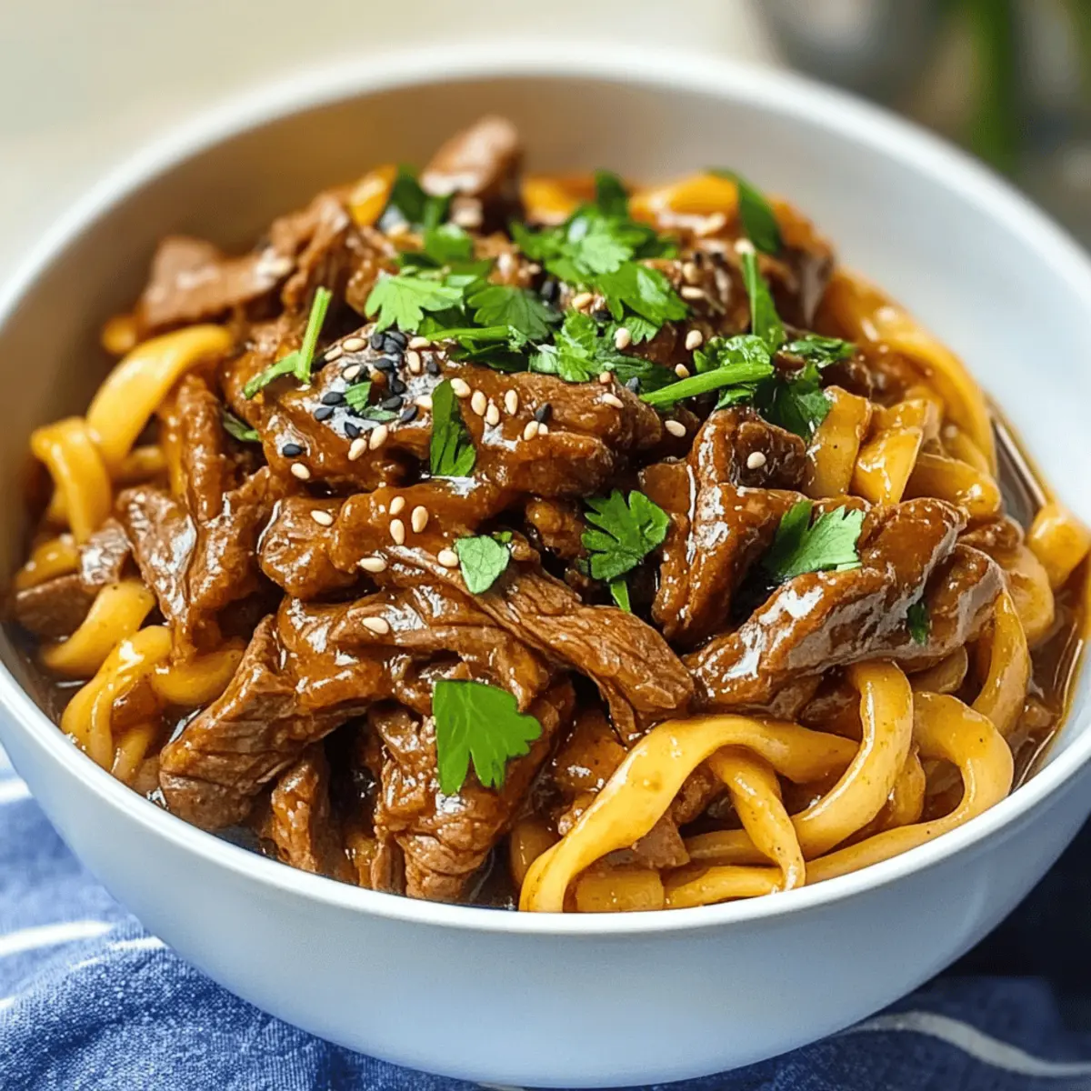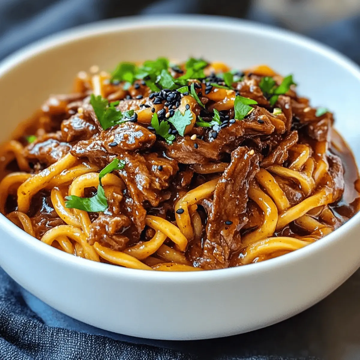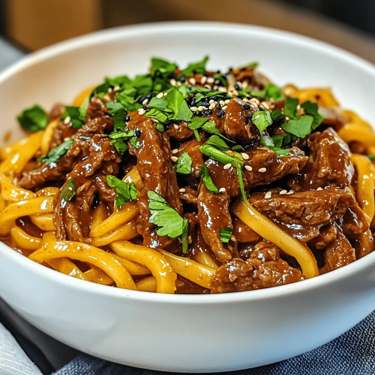 Stell dir vor, ich sitze an einem regnerischen Abend in meiner gemütlichen Küche und der verlockende Duft von Slow Cooker Korean Beef Noodles erfüllt den Raum. Diese schmackhafte Mischung aus zartem Rindfleisch und schnurrenden Udon-Nudeln, umhüllt von einer würzigen Gochujang-Sauce, lässt mich die Hektik des Alltags vergessen. Das Beste daran? Dieses Rezept ist ein echtes Hands-on-Highlight: Es ist nicht nur einfach zuzubereiten, sondern auch perfekt für ein entspanntes Abendessen unter der Woche oder gesellige Wochenendtreffen. Genieß die Aromen der koreanischen Fusion, ganz ohne Stress! Bist du bereit, deine Geschmacksknospen mit einer neuen Lieblingsmahlzeit zu verwöhnen? Warum werden Sie dieses Rezept lieben? Einfachheit: Dieses Rezept ist super unkompliziert und erfordert nur grundlegende Kochkenntnisse – perfekt für alle, die nach einer schnellen Lösung für ein köstliches Abendessen suchen. Aromatische Vielfalt: Die Kombination aus zartem Rindfleisch und würziger Gochujang-Sauce sorgt für ein Geschmackserlebnis, das den Gaumen verzaubert. Vielseitigkeit: Experimentieren Sie mit verschiedenen Nudelsorten wie Soba oder Reisnudeln sowie alternativen Rindfleischstücken, um Ihr individuelles Abendessen zu kreieren. Zeitersparnis: Der Slow Cooker erledigt die Arbeit für Sie – einfach alles reinwerfen und nach 8 Stunden auf ein Festmahl freuen! Familienliebling: Dieses Gericht erfreut garantiert alle, von den Kleinsten bis zu den Großen, und ist eine tolle Möglichkeit, gesunde Zutaten in die Familienküche zu integrieren. Wenn Sie nach weiteren köstlichen Rezepten suchen, probieren Sie auch unseren Koreanischen Chili Blumenkohl – einfach unwiderstehlich! Koreanische Rindfleisch-Nudeln Zutaten • Hinweis: Im Folgenden finden Sie eine sorgfältige Auswahl der Zutaten für unsere köstlichen Koreanischen Rindfleisch-Nudeln – die perfekte Kombination für ein stressfreies Kochen und unvergleichliche Aromen. Für die Sauce: Diced Onion – sorgt für Süße und Tiefe; verwenden Sie gelbe oder weiße Zwiebeln. Gochujang – fügt Hitze und Umami hinzu; passen Sie die Menge nach Ihrem gewünschten Schärfegrad an. Dark Soy Sauce – verleiht tiefen Geschmack und Farbe; reguläre Sojasauce kann als Ersatz dienen. Rice Vinegar – bietet Säure, um die Süße zu balancieren; kann durch Apfelessig ersetzt werden. Packed Brown Sugar – süßt das Gericht und balanciert die Schärfe; weißer Zucker ist eine mögliche Alternative. Garlic-Ginger Paste – infundiert traditionelle Aromen; frischer Knoblauch und Ingwer können verwendet werden. Tomato Paste – fügt Tiefe und Reichhaltigkeit hinzu; kein direkter Ersatz, aber Sie können zerdrückte Tomaten verwenden. Beef Stock – gibt Flüssigkeit und Geschmack; nutzen Sie Gemüsebrühe für eine leichtere Version. Für das Hauptgericht: Ox Cheek (oder gewählter Rindfleischschnitt) – Hauptproteinquelle; für reichhaltigen Geschmack; Alternativen sind Chuck Roast oder Short Ribs. Udon Noodles – Basis des Gerichts; bietet eine zähe Textur; Soba-, Reisnudeln oder Ramen sind geeignete Ersatzprodukte. Für die Garnitur: Chopped Coriander – für Frische und als Garnitur; optional nach Belieben. Black Sesame Seeds – fügt einen nussigen Abschluss hinzu; kann mit gerösteten Sesamkörnern ersetzt werden. Sliced Green Onions – zur Garnitur; verbessert die visuelle Anziehung und den Geschmack. Schritt-für-Schritt-Anleitung für Langsame Kochzeit: Koreanische Rindfleisch-Nudeln Step 1: Sauce vorbereiten Zwiebelwürfel, Gochujang, dunkle Sojasauce, Reisessig, braunen Zucker, Knoblauch-Ingwer-Paste, Tomatenmark und Rinderbrühe in den Slow Cooker geben. Gut umrühren, bis alles gleichmäßig vermischt ist. Diese Grundlage sorgt für die köstliche Sauce, die später das zarte Rindfleisch umhüllt. Step 2: Rindfleisch hinzufügen Das gewählte Rindfleischstück, wie Oxback oder ein anderer Rindfleischschnitt, vorsichtig in den Slow Cooker auf die Sauce legen. Achten Sie darauf, dass das Fleisch vollständig mit der Sauce bedeckt ist, um die Aromen optimal aufzunehmen. Dies bereitet das Fleisch darauf vor, während des langsamen Kochens zart und saftig zu werden. Step 3: Langsam kochen Den Slow Cooker abdecken und auf niedriger Stufe für 8 Stunden einstellen. Dies ermöglicht es dem Rindfleisch, sanft zu garen und die Aromen der Sauce vollständig aufzunehmen. Überprüfen Sie die Farbe und den Duft; das Fleisch sollte nach dieser Zeit zart und aromatisch sein. Step 4: Rindfleisch zerkleinern Nach dem Kochen das zarte Rindfleisch aus dem Slow Cooker nehmen und mit zwei Gabeln shreddern. Das zerkleinerte Fleisch wieder in den Slow Cooker zurückgeben und die Udon-Nudeln sowie den gehackten Koriander hinzufügen. Diese Schritte integrieren das Rindfleisch perfekt in die kommenden Aromen. Step 5: Nudeln kochen Die Hitze des Slow Cookers erhöhen und die Udon-Nudeln für weitere 25 Minuten kochen, bis sie gut durchwärmt und aromatisch sind. Achten Sie darauf, dass die Nudeln die Sauce aufnehmen und schön al dente werden, während sich die köstlichen Aromen vermischen. Step 6: Abschmecken und garnieren Vor dem Servieren die Koreanischen Rindfleisch-Nudeln probieren und nach Belieben mit Salz und Pfeffer abschmecken. Mit schwarzen Sesamkörnern garnieren, um dem Gericht einen nussigen Touch zu verleihen. Die Farben und Aromen verleihen diesem Gericht den letzten Schliff, bevor es auf den Tisch kommt. Variationen der Koreanischen Rindfleisch-Nudeln Fühle dich frei, die koreanischen Rindfleisch-Nudeln ganz nach deinem Geschmack anzupassen und neue Kombinationen auszuprobieren! Glutenfrei: Verwende glutenfreie Sojasauce und Soba-Nudeln für ein köstliches, glutenfreies Gericht. So erhältst du die perfekte Balance aus Geschmack und Diätvorgaben. Dairy-Free: Dies ist eine natürliche Option, da die Zutaten schon milchfrei sind, aber du kannst Kokosmilch hinzufügen, um eine reichhaltigere Sauce zu kreieren. Diese cremige Note