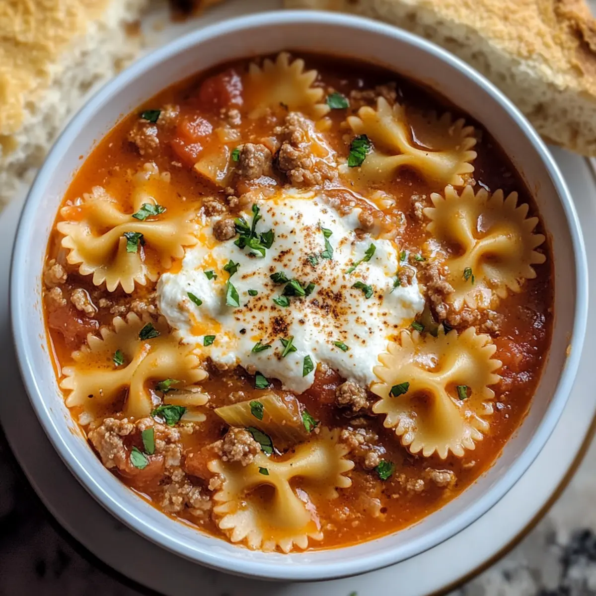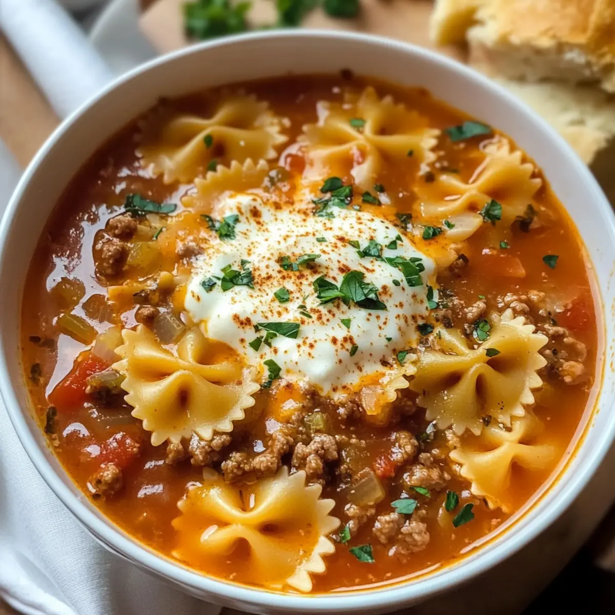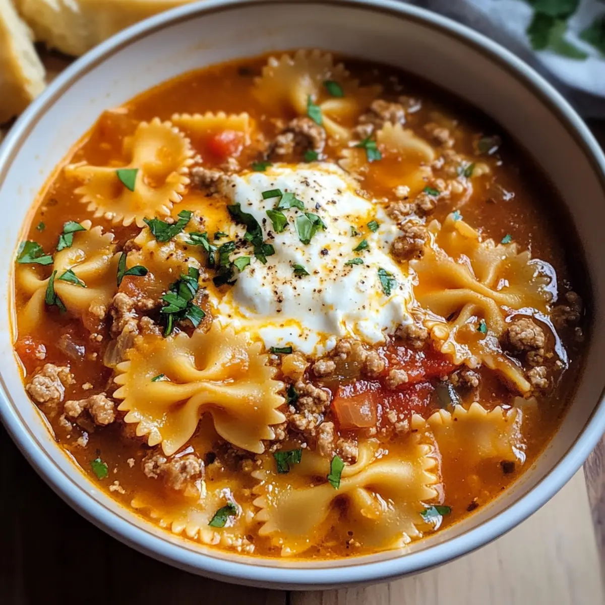 Zwei Dinge, die uns sofort ins Herz steigen lassen: der Duft von frisch gebratenem Rinderhack und die Vorfreude auf ein Menü, das die Familie zusammenbringt. Genau das bietet meine Hearty Lasagna Soup mit Fliegenpilz-Pasta – eine herzhafte, ein-Pfannen-Mahlzeit, die in nur 30 Minuten zubereitet ist. Diese köstliche Suppe kombiniert all die geliebten Geschmäcker klassischer Lasagne in einer warmen, cremigen Umarmung, während die aufwändige Zubereitung entfällt. Perfekt für hektische Abende, wenn die Familie nach etwas Behaglichem ruft, ist dieses Rezept nicht nur einfach, sondern auch richtig vielseitig. Wer würde nicht gerne in diese gemütliche, leckere Schüssel eintauchen? Lasst uns gemeinsam die Zubereitung beginnen und die Freuden dieses herzlichen Gerichts entdecken! Warum wirst du diese Suppe lieben? Einfachheit in Perfektion: Die Zubereitung ist schnell und unkompliziert, perfekt für stressige Wochentage. Herzhafter Geschmack: Die Kombination aus Rinderhack, würzigen Tomaten und aromatischen Kräutern sorgt für ein Geschmackserlebnis, das die ganze Familie begeistern wird. Gemütliches Ein-Pfannen-Gericht: Alles wird in einem Topf zubereitet – weniger Abwasch und mehr Zeit zum Genießen! Vielseitige Variationen: Passe das Rezept nach Belieben an, indem du beispielsweise glutenfreie Pasta verwendest oder frisches Gemüse wie Spinat hinzufügst. Cremige Textur: Die Mischung aus Ricotta und geschmolzenem Käse gibt jedem Löffel eine köstliche Cremigkeit, die an klassische Lasagne erinnert. Die Köstliche Lasagne-Suppe mit Fliegenpilz-Pasta wird zum neuen Favoriten in deiner Rezeptesammlung! Zutaten für die Lasagne-Suppe Für die Brühe Rinderhackfleisch – Hauptquelle für Protein und Geschmack; verwende 80/20 für optimalen Saftgehalt. Würfelige Zwiebel – Fügt Süße und Tiefe hinzu; kann durch Schalotten für einen milderen Geschmack ersetzt werden. Gehackter Knoblauch – Verstärkt das gesamte Aroma; frischer Knoblauch ist immer die beste Wahl. Würfelformige Tomaten (mit Saft) – Bringt Säure und natürliche Süße in die Suppe; ersetzbar durch passierte Tomaten für eine gleichmäßigere Konsistenz. Tomatensauce/Püree – Grundlage und Bindemittel der Suppe; kann durch Tomatenpassata ersetzt werden. Tomatenmark – Konzentriert den Tomatengeschmack; weniger verwenden, wenn die Tomatensauce bereits dick ist. Hühnerbrühe – Flüssige Basis für die Suppe; Gemüsebrühe eignet sich für eine vegetarische Version. Italienische Kräutermischung – Bringt aromatische Komplexität; frische Kräuter wie Basilikum und Oregano können für mehr Frische verwendet werden. Meersalz & schwarzer Pfeffer – Wichtig für die Würzung; nach Geschmack anpassen, da Konserven variieren können. Für die Pasta und Käse Fliegenpilz-Pasta – Sorgt für ein herzhaftes Gefühl; erst in den letzten 10–12 Minuten hinzufügen, um ein Zerfallen zu vermeiden. Ricotta-Käse – Gibt eine cremige Note; in einzelnen Portionen einrühren für bessere Texturkontrolle. Mozzarella- und Parmesan-Käse – Garantiert die klassische Lasagne-Cremigkeit; verwende Low-Moisture-Mozzarella für besseres Schmelzen. Für die Garnitur Frische Petersilie – Für die Garnitur und einen Hauch von Frische; optional, aber verbessert die Präsentation. Diese köstliche Lasagne-Suppe mit Fliegenpilz-Pasta wird dich und deine Familie begeistern! Schritt-für-Schritt-Anleitung für die köstliche Lasagne-Suppe mit Fliegenpilz-Pasta Step 1: Öl erhitzen Erhitze einen 4,5-Liter-Topf bei mittlerer bis hoher Hitze und füge einen Esslöffel Olivenöl hinzu. Warte etwa 1-2 Minuten, bis das Öl heiß ist. Achte darauf, dass es beginnt zu glänzen, bevor du die nächste Zutat hinzufügst. Step 2: Rinderhack anbraten Gib 500 g Rinderhackfleisch, 1 gewürfelte Zwiebel und 3 gehackte Knoblauchzehen in den heißen Topf. Brate alles für 5-7 Minuten an, bis das Fleisch gebräunt und die Zwiebeln weich sind. Lass das Fett abtropfen, um die Suppe nicht zu fettig zu machen. Step 3: Tomaten und Brühe hinzufügen Füge nun eine Dose gewürfelte Tomaten (mit Saft), 400 g Tomatensauce, 2 Esslöffel Tomatenmark und 1000 ml Hühnerbrühe hinzu. Mische diese Zutaten gründlich mit dem angebratenen Fleisch und den Zwiebeln und lass die Suppe für 2-3 Minuten köcheln, bis sie duftet. Step 4: Gewürze und Pasta einrühren Gib 2 Teelöffel italienische Kräuter, 1 Teelöffel Meersalz sowie frisch gemahlenen schwarzen Pfeffer nach Geschmack in den Topf. Rühre dann 250 g rohe Fliegenpilz-Pasta ein. Dies sollte in den letzten 10-12 Minuten der Kochzeit geschehen, um ein Zerfallen der Pasta zu vermeiden. Step 5: Kochen und Umrühren Bringe die Mischung zum Kochen und reduziere dann die Hitze, um die Suppe für 10-15 Minuten sanft köcheln zu lassen. Rühre regelmäßig um, damit die Pasta gleichmäßig gart und nichts am Boden des Topfes ansetzt. Step 6: Konsistenz anpassen Überprüfe nach 10 Minuten die Konsistenz der Suppe. Wenn sie zu dick erscheint, gib nach Belieben mehr Hühnerbrühe oder Wasser hinzu. Lasse die Suppe weiter köcheln, bis die Pasta al dente ist und der Geschmack intensiver wird. Step 7: Käsemischung einrühren Nehme den Topf vom Herd, sobald die Pasta gar ist, und lass ihn kurz abkühlen. Rühre 250 g Ricotta, 200 g geriebenen Mozzarella und 100 g geriebenen Parmesan in die Suppe ein, um eine cremige Textur zu erhalten, die die Lasagne-Suppe mit Fliegenpilz-Pasta perfekt abrundet. Step 8: Servieren und garnieren Serviere die köstliche Lasagne-Suppe in tiefen Tellern und garniere sie nach Belieben mit frischer Petersilie. Dies verleiht dem Gericht eine schöne Farbnote und steigert die appetitliche Wirkung. Genieße die warme Suppe als herzhaftes Familienessen! Lasagne-Suppe mit Fliegenpilz-Pasta: Variationen & Alternativen Lass dich inspirieren, diese köstliche Suppe ganz nach deinem Geschmack anzupassen! Glutenfrei: Verwende glutenfreie Pasta, um die Suppe für alle Diäten zugänglich zu machen. 