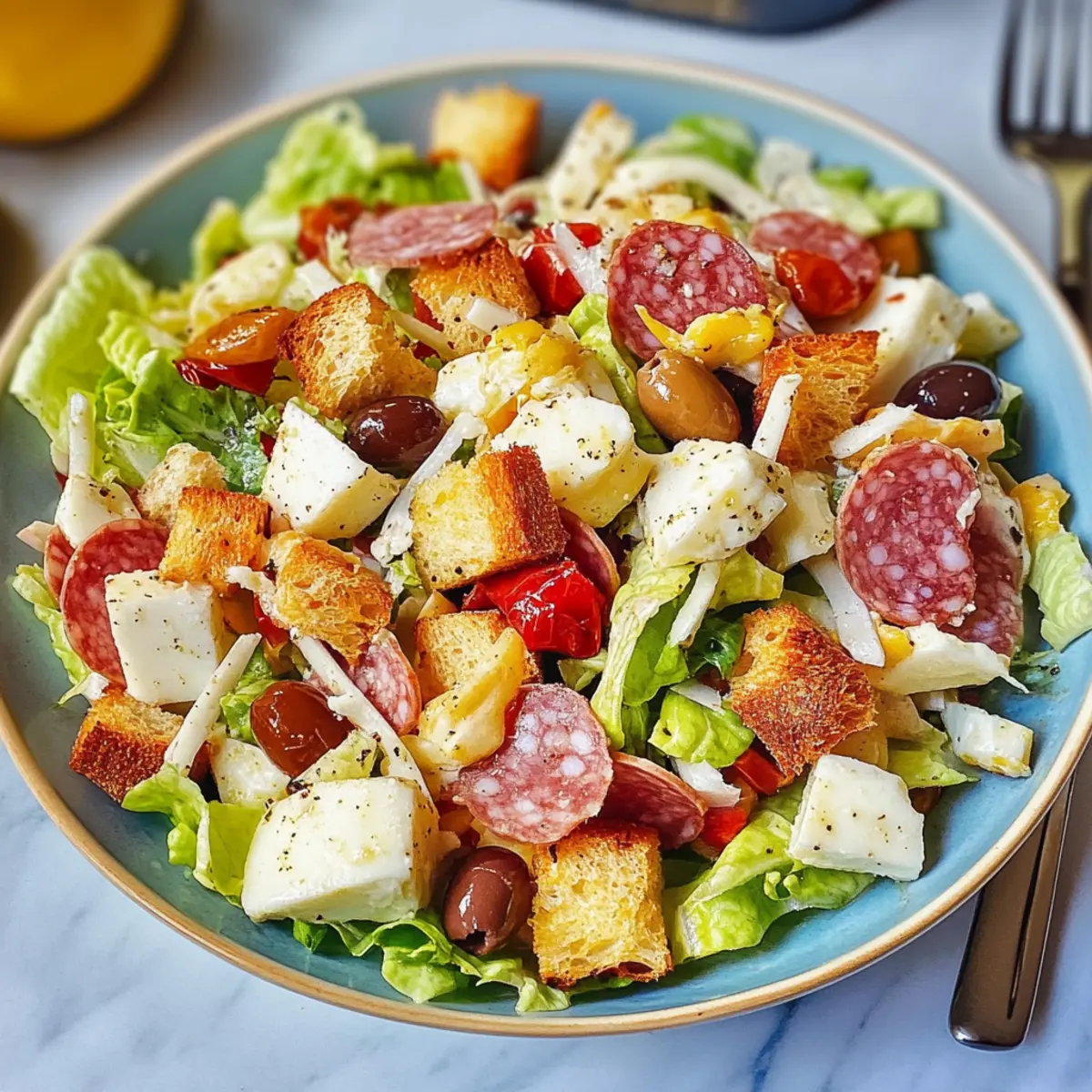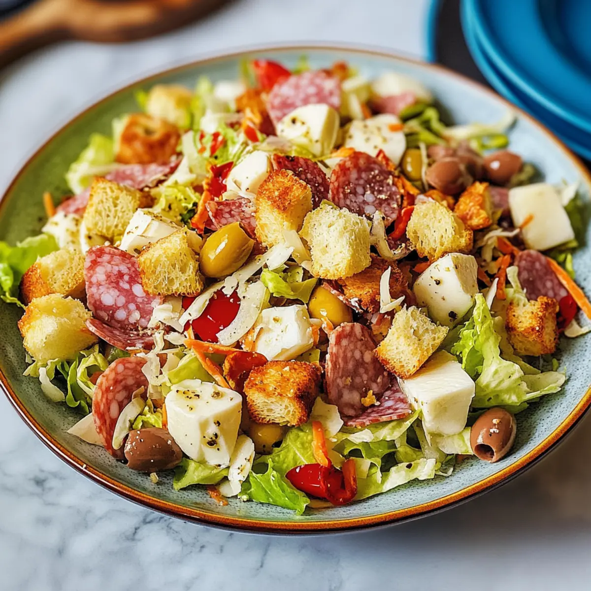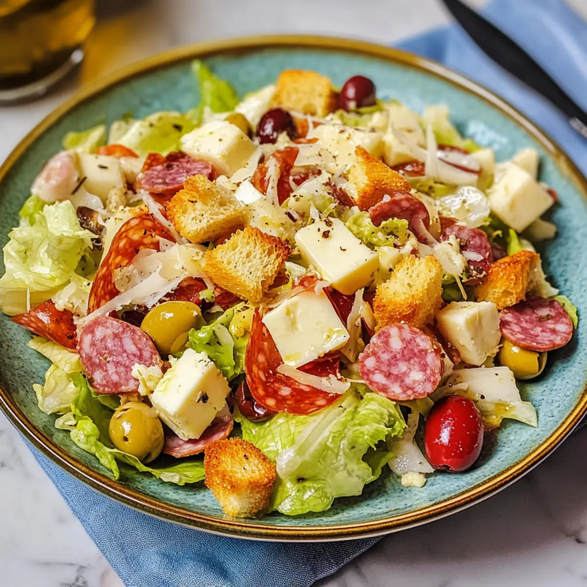Mahlzeit Salat: Ein klassischer italienischer Salat mit knackigem Eisbergsalat, herzhaften Wurstwaren und hausgemachten Croutons, ideal für ein leichtes Mittagessen oder eine Beilage.