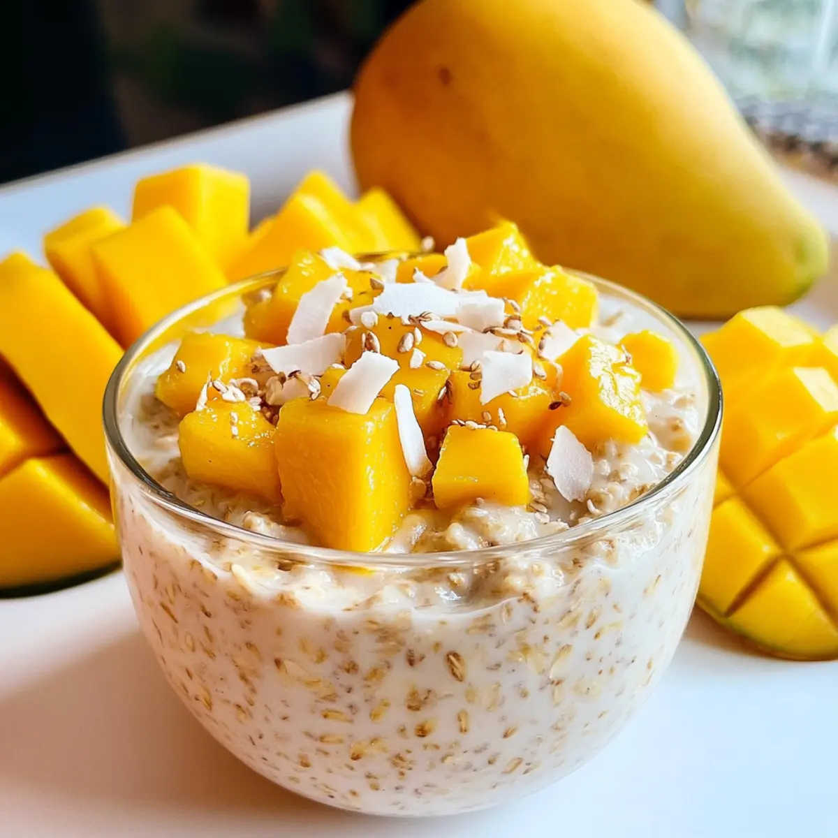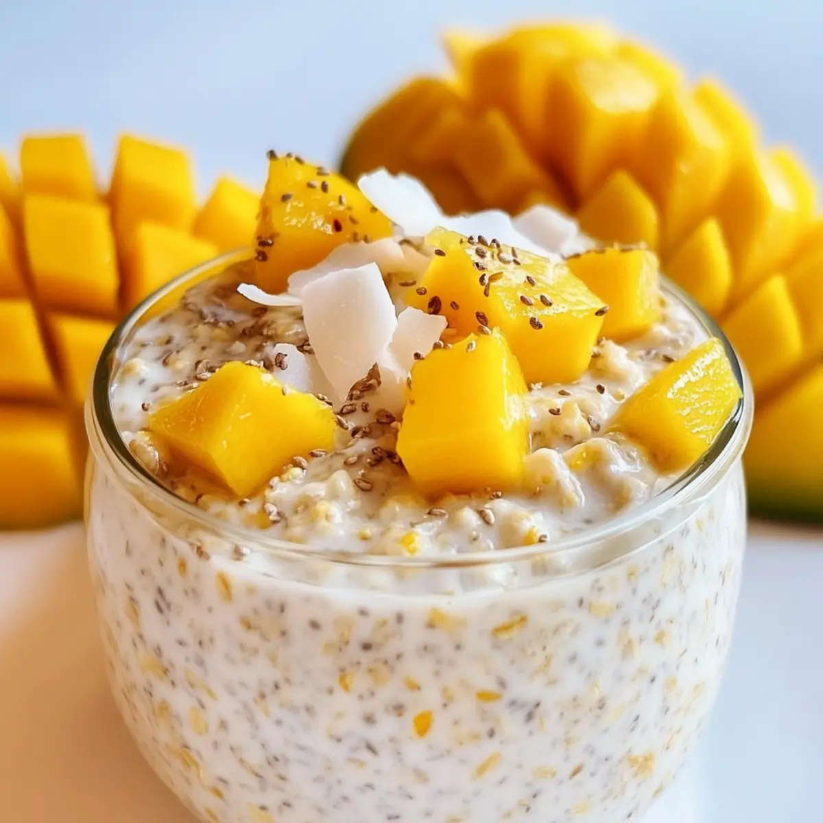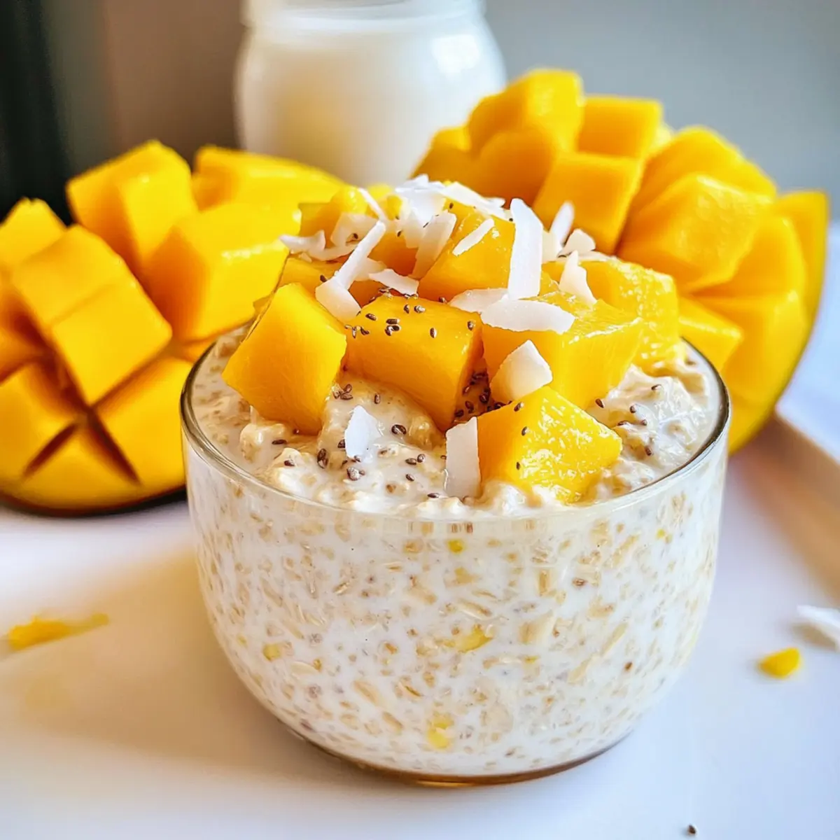 Komm mit mir auf eine kleine Reise in die tropische Sonne, während wir uns an den Mango-Kokos-Nachtpflege-Haferflocken erfreuen! Dieses einfache Rezept ist perfekt für alle, die morgens wenig Zeit haben, aber nicht auf ein köstliches Frühstück verzichten möchten. Mit der cremigen Konsistenz von Kokosmilch und griechischem Joghurt, zusammen mit der natürlichen Süße von reifen Mangos und Honig, ist es nicht nur ein erfrischender Genuss, sondern auch vollgepackt mit Proteinen, gesunden Fetten und Ballaststoffen, die dir bis zum Mittagessen ein Sättigungsgefühl geben. Wer könnte da widerstehen? Bereit, deinen Tag auf köstliche Weise zu starten? Lass uns gemeinsam in die Zubereitung eintauchen! Warum solltest du dieses Rezept ausprobieren? Einfachheit pur: Die Zubereitung ist unkompliziert, sodass du in kurzer Zeit ein gesundes Frühstück zaubern kannst. Kremiger Genuss: Die harmonische Kombination aus Kokosmilch und griechischem Joghurt sorgt für eine wunderbar cremige Textur. Natürliche Süße: Reife Mangos und Honig verleihen den Haferflocken einen köstlichen, fruchtigen Geschmack, der dich jeden Morgen begeistert. Vielseitigkeit: Du kannst die Zutaten nach Belieben anpassen, sei es mit anderen Früchten oder verschiedenen Milchalternativen. Ideal für Meal Prep: Bereite mehrere Portionen vor und genieße dieses tropische Frühstück über die Woche verteilt! Mango-Kokos-Nachtpflege-Haferflocken Zutaten Hinweis: Diese köstlichen Mango-Kokos-Nachtpflege-Haferflocken sind glutenfrei und enthalten keinen Haushaltszucker, was sie zu einer gesunden Frühstückswahl macht. Für die Haferflocken • Rolled Oats – Die Basis für Struktur und Ballaststoffe; verwende glutenfreie Haferflocken für eine glutenfreie Version. • Chia Seeds – Verantwortlich für die Dicke und eine gute Quelle für Omega-3-Fettsäuren; Flachsamen sind eine ähnliche Alternative. Für die cremige Mischung • Coconut Milk – Fügt Cremigkeit und einen reichen Kokosgeschmack hinzu; Mandelmilch funktioniert gut als Alternative. • Greek Yogurt – Sorgt für einen cremigen und proteinreichen Genuss; für Veganer kann Joghurt auf pflanzlicher Basis verwendet werden. • Honey – Der natürliche Süßstoff, der den Geschmack verfeinert; Maple Syrup ist eine tolle vegane Option. Für den fruchtigen Genuss • Mango – Bringt natürliche Süße und fruchtigen Geschmack; frische oder gefrorene Pfirsiche sind eine schmackhafte Alternative. Für den extra Genuss • Shredded Coconut – Verstärkt den Kokosgeschmack und fügt Textur hinzu; kann zur Kalorienreduktion weggelassen werden. Genieße diese Mango-Kokos-Nachtpflege-Haferflocken und lass dich vom tropischen Geschmack jeden Morgen verwöhnen! Schritt-für-Schritt-Anleitung für Mango-Kokos-Nachtpflege-Haferflocken Step 1: Trockenmischung vorbereiten In einer mittelgroßen Schüssel die Haferflocken, Chia-Samen und die Hälfte des geriebenen Kokosnuss vermengen. Rühre die Zutaten gründlich um, bis sie gut kombiniert sind. Die Mischung sollte gleichmäßig und locker wirken, was dir einen soliden Grundstein für deine Mango-Kokos-Nachtpflege-Haferflocken gibt. Step 2: Feuchte Zutaten mischen In einer separaten Schüssel die Kokosmilch, den griechischen Joghurt und den Honig gut miteinander verquirlen, bis eine cremige und einheitliche Masse entsteht. Achte darauf, dass keine Klumpen zurückbleiben. Diese Mischung sorgt für die cremige Konsistenz deines Frühstücks und wird das tropische Aroma der Haferflocken wunderbar unterstützen. Step 3: Kombination der Zutaten Gieße die feuchte Mischung über die trockenen Zutaten in der ersten Schüssel. Rühre alles gründlich mit einem Löffel oder einem Schneebesen um, bis die Haferflocken gleichmäßig mit der Kokos-Joghurt-Mischung bedeckt sind. Dies dauert etwa 1-2 Minuten; achte darauf, dass sich alle Zutaten gut verbunden fühlen. Step 4: Mango hinzufügen Die gewürfelte Mango vorsichtig in die Mischung einarbeiten, indem du sie mit einem Spatel oder Löffel leicht unter die Haferflocken hebst. Sei sanft, damit die Stückchen nicht zerdrückt werden und die Frische der Mango in jedem Bissen erhalten bleibt. Diese fruchtige Zutat verleiht den Mango-Kokos-Nachtpflege-Haferflocken eine natürliche Süße. Step 5: Portionieren und kühlen Die Mischung gleichmäßig auf zwei luftdichte Behälter verteilen. Verschließe die Behälter gut und stelle sie in den Kühlschrank, sodass die Haferflocken mindestens 4 Stunden oder über Nacht durchziehen können. Dies lässt die Aromen verschmelzen und sorgt dafür, dass sich die Haferflocken perfekt aufquellen. Step 6: Servieren Vor dem Servieren die Mango-Kokos-Nachtpflege-Haferflocken aus dem Kühlschrank nehmen und nach Belieben mit zusätzlichen Mangostücken oder mehr geriebener Kokosnuss garnieren. Die Haferflocken sollten eine cremige Konsistenz haben und angenehm kühl sein, was das Frühstück zu einem erfrischenden Genuss macht! Aufbewahrungstipps für Mango-Kokos-Nachtpflege-Haferflocken Kühlschrank: Bewahre die Mango-Kokos-Nachtpflege-Haferflocken in luftdichten Behältern für bis zu 5 Tage im Kühlschrank auf, um ihre Frische und Cremigkeit zu erhalten. Einfrieren: Wenn du eine größere Menge zubereitest, kannst du die Haferflocken bis zu 2 Monate im Gefrierschrank aufbewahren. Stelle sicher, dass sie gut verpackt sind, um Frostschäden zu vermeiden. Auftauen: Zum Auftauen einfach über Nacht im Kühlschrank lassen oder in der Mikrowelle bei niedriger Leistung für 1-2 Minuten erwärmen, bis sie wieder cremig sind. Servieren: Garniere die Haferflocken nach dem Kühlen oder Auftauen mit frischer Mango oder geriebener Kokosnuss für den besten Geschmack und die schönste Textur. Variationen & Alternativen für Mango-Kokos-Nachtpflege-Haferflocken Lass deiner Kreativität freien Lauf und passe dieses Rezept nach deinem Geschmack an! Fruchtige Vielfalt: Ersetze die Mango durch saisonale Früchte wie Beeren oder Ananas für aufregende neue Geschmäck