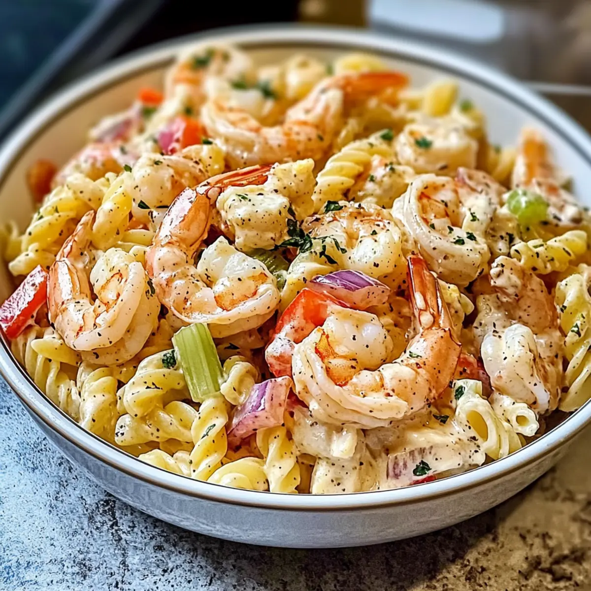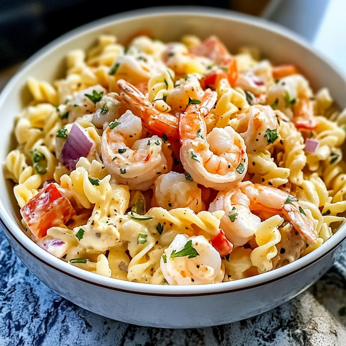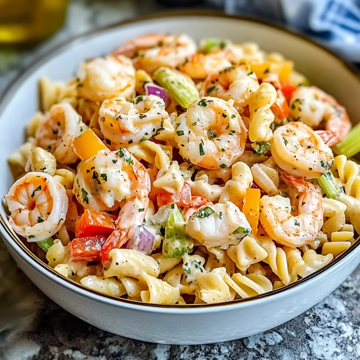 Genieße einen köstlichen Meeresfrüchte Nudelsalat, ideal für alle Sommervergnügungen.