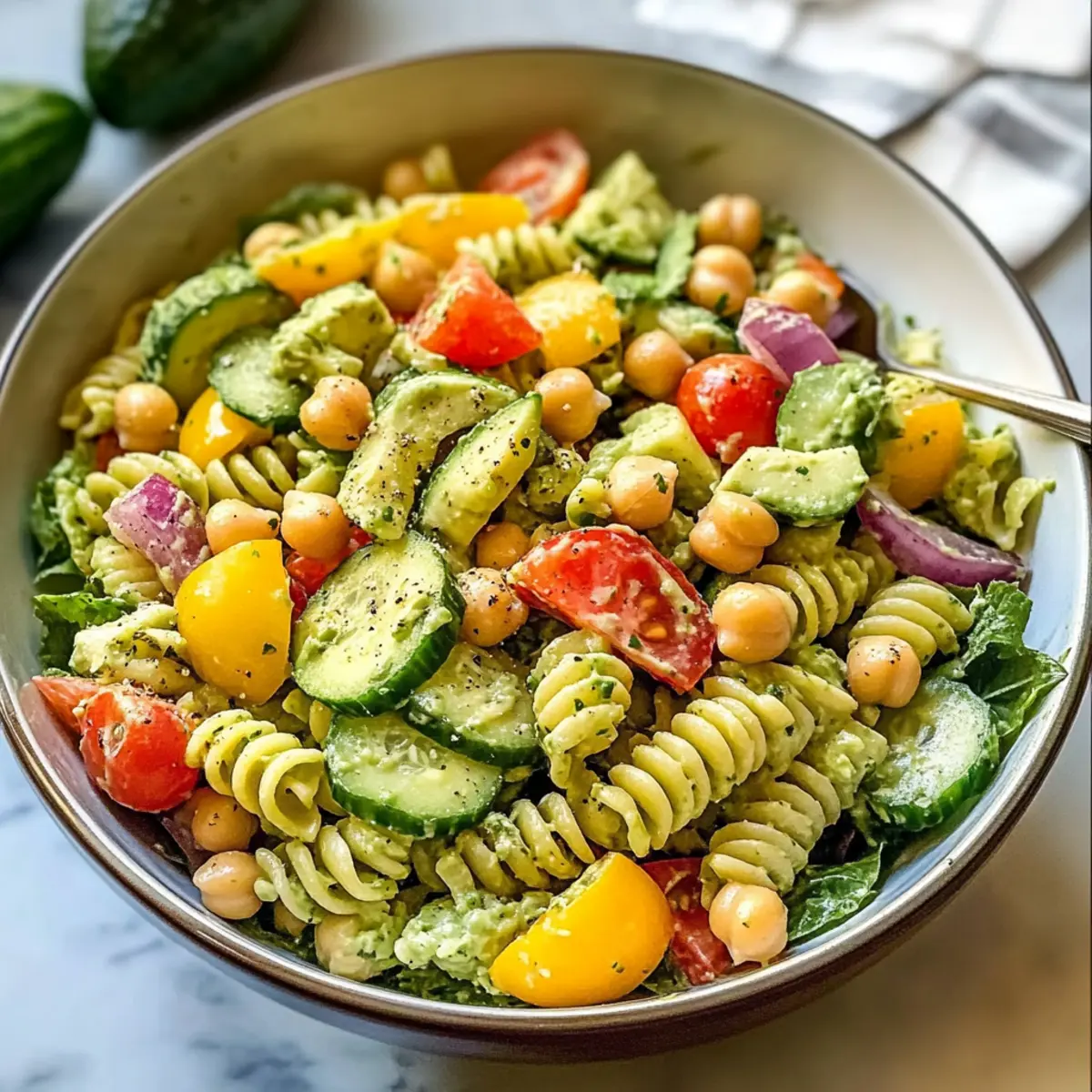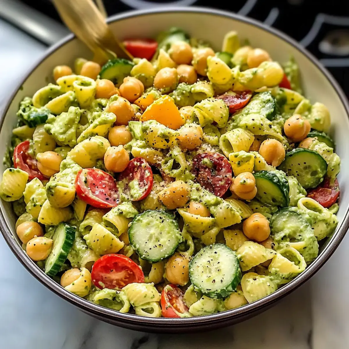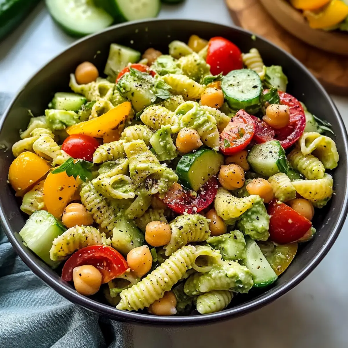 Hatten Sie je das Gefühl, dass den klassischen Pasta-Salaten etwas fehlt? Ich auch! Meine Antwort darauf ist der milchfreie Avocado-Pasta-Salat – ein aufregendes Geschmackserlebnis, das nicht nur köstlich, sondern auch gesund ist. Die cremige Avocado-Soße erzeugt eine buttrige Textur, während knackige frische Gemüse und proteinreiche Kichererbsen den Salat zu einer perfekten Wahl für Sommer-Picknicks oder leichte Abendessen machen. Besonders praktisch: Sie können ihn vorbereiten und im Kühlschrank aufbewahren, sodass er immer bereit ist, wenn der Hunger zuschlägt. Möchten Sie wissen, wie Sie diesen schmackhaften Salat zubereiten können? Warum wird Ihnen dieser Salat gefallen? Frische Aromen: Der milchfreie Avocado-Pasta-Salat bringt Ihren Gaumen mit einer perfekten Mischung aus cremigem Avocado-Dressing und knackigem Gemüse zum Staunen. Einfachheit: Mit nur wenigen Zutaten ist dieser Salat schnell zubereitet und benötigt keine komplizierten Kochtechniken. Ideal für alle Heimköche! Vielseitigkeit: Variieren Sie den Salat mit verschiedenen Gemüsearten oder tauschen Sie die Kichererbsen gegen schwarze Bohnen aus, um ganz neue Geschmackserlebnisse zu kreieren. Gesundheitlich wertvoll: Vollgepackt mit gesunden Fetten, Ballaststoffen und hochwertigem Protein ist dieser Salat nicht nur lecker, sondern auch nährstoffreich und sättigend. Perfekt für jeden Anlass: Ob beim Grillen, auf einer Sommerparty oder als leichtes Abendessen – dieser Salat ist der Hit unter Ihren Freunden und der Familie! Zeitersparnis: Bereiten Sie ihn im Voraus zu und haben Sie immer eine gesunde Option im Kühlschrank bereit. Perfekt für hektische Tage oder Spontanbesuche! Milchfreie Avocado-Pasta-Salat Zutaten Für das Dressing • Avocados – Sorgen für eine cremige Basis; wählen Sie sehr reife Avocados für die beste Textur. • Wasser – Passt die Konsistenz des Dressings an; verwenden Sie es nach Bedarf, um die gewünschte Dicke zu erreichen. • Knoblauch – Fügt eine geschmackliche Tiefe hinzu; frischer Knoblauch wird für den besten Geschmack empfohlen. • Meerrettich – Gibt dem Dressing einen Kick; Keens-Marke liefert eine ausgewogene Schärfe. • Dill – Bringt frische, krautige Noten; kann durch Petersilie ersetzt werden, wenn Dill nicht verfügbar ist. • Salz – Unerlässlich zur Würze; nach Geschmack anpassen. • Schwarzer Pfeffer – Fügt Wärme hinzu; frisch gemahlener Pfeffer liefert das beste Aroma. • Zitronensaft – Bringt Frische in das Dressing und verhindert, dass die Avocado braun wird. Für den Salat • Pasta (Rotini) – Hält die Sauce gut und sorgt für Struktur; kann durch glutenfreie Pasta ersetzt werden. • Kichererbsen – Fügt Protein und Textur hinzu; gut abspülen, um einen wässrigen Salat zu vermeiden. • Gurke – Bietet einen knackigen Biss; verwenden Sie eine große Gurke, gewürfelt in 1,2 cm große Stücke. • Rote Paprika – Gibt Süße und Farbe; in 0,6 cm große Stücke würfeln. • Rote Zwiebel – Liefert einen scharfen Geschmacksakzent; sparsam verwenden oder ganz weglassen für eine mildere Note. • Sellerie – Bietet zarte Knackigkeit; fein schneiden für bessere Textur. • Kirschtomaten – Fügt Saftigkeit und Süße hinzu; vor dem Hinzufügen halbieren. • Nährhefe – Sorgt für einen käsigen Finish; optional für einen herzhaften Akzent. • Frische Petersilie – Perfekt zum Garnieren; fügt Farbe und Frische hinzu. Schritt-für-Schritt-Anleitung für den milchfreien Avocado-Pasta-Salat Step 1: Gemüse vorbereiten Schneiden Sie die Gurke, rote Paprika und den Sellerie in 1,2 cm große Würfel. Halbieren Sie die Kirschtomaten und hacken Sie die frische Petersilie fein. Stellen Sie alle geschnittenen Zutaten beiseite, damit Sie sie später schnell zur Hand haben. Achten Sie darauf, die Zutaten gleichmäßig zu schneiden, um eine ansprechende Optik und Textur im milchfreien Avocado-Pasta-Salat zu gewährleisten. Step 2: Kichererbsen vorbereiten Öffnen Sie die Dose Kichererbsen, gießen Sie den Inhalt in ein Sieb und spülen Sie die Kichererbsen gründlich unter kaltem Wasser ab. Lassen Sie sie anschließend gut abtropfen, um sicherzustellen, dass sie fest bleiben und nicht wässrig werden. Diese Kichererbsen sorgen für eine herzliche Note und eine gute Proteinquelle im Salat. Step 3: Pasta kochen Bringen Sie einen großen Topf mit leicht gesalzenem Wasser zum Kochen. Geben Sie die Rotini-Pasta hinein und kochen Sie sie je nach Packungsanweisung al dente, in der Regel etwa 8-10 Minuten. Rühren Sie gelegentlich um, damit die Pasta nicht aneinander kleben bleibt. Sobald die Pasta gar ist, gießen Sie sie in ein Sieb und lassen Sie sie unter kaltem Wasser abkühlen. Step 4: Dressing zubereiten In einem Mixer oder einer Küchenmaschine die geschälten und entkernten Avocados, Wasser, Knoblauch, Meerrettich, Dill, Salz, Pfeffer und Zitronensaft hinzufügen. Mischen Sie alles zu einer glatten, cremigen Konsistenz. Passen Sie die Wassermenge an, um die gewünschte Dicke des Dressings für den milchfreien Avocado-Pasta-Salat zu erreichen, und schmecken Sie ab, um die Gewürze anzupassen. Step 5: Alles kombinieren In einer großen Schüssel die abgekühlte Rotini-Pasta mit dem vorbereiteten Dressing gut vermengen, bis die Pasta gleichmäßig bedeckt ist. Fügen Sie die geschnittenen Gemüse und die Kichererbsen hinzu und werfen Sie alles vorsichtig zusammen, damit die Texturen erhalten bleiben. Achten Sie darauf, eine gleichmäßige Verteilung der Zutaten zu erzielen, dass der salat frisch und einladend aussieht. Step 6: Servieren Teilen Sie den milchfreien Avocado-Pasta-Salat auf individuelle Schalen auf und garnieren Sie ihn gegebenenfalls mit Nährhefe und frischer Petersilie. Der Salat kann sofort serviert werden, lässt sich aber auch hervorragend für bis zu 2 Stunden im Kühlschrank aufbewahren. Perfekt für einen erfrischenden Sommergenuss oder als leichtes Abendessen mit Freunden! Milchfreier Avocado-Pasta-Salat V