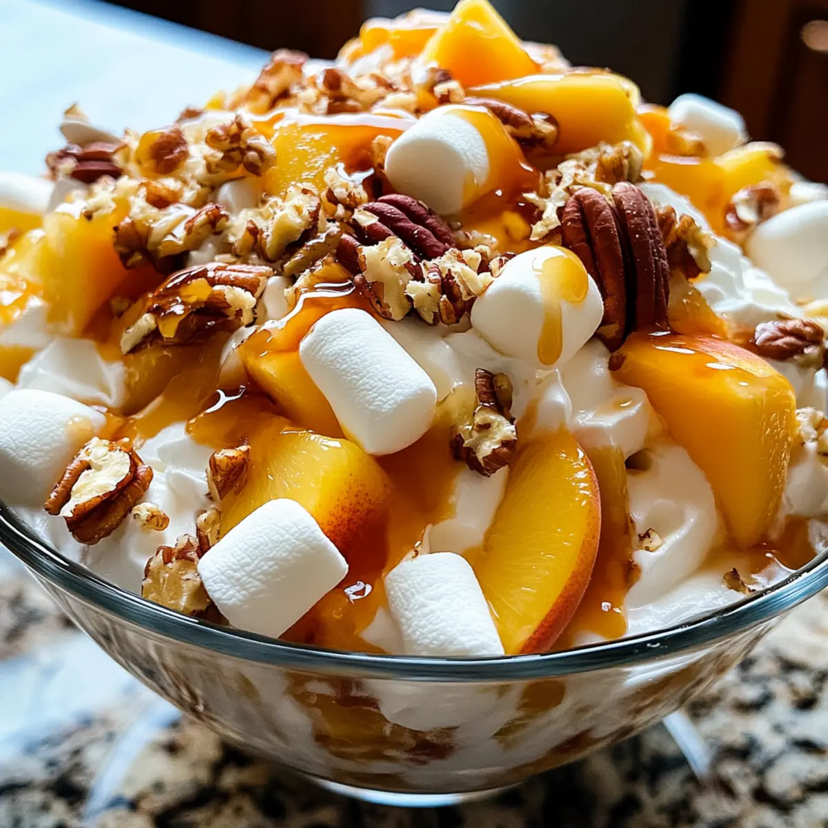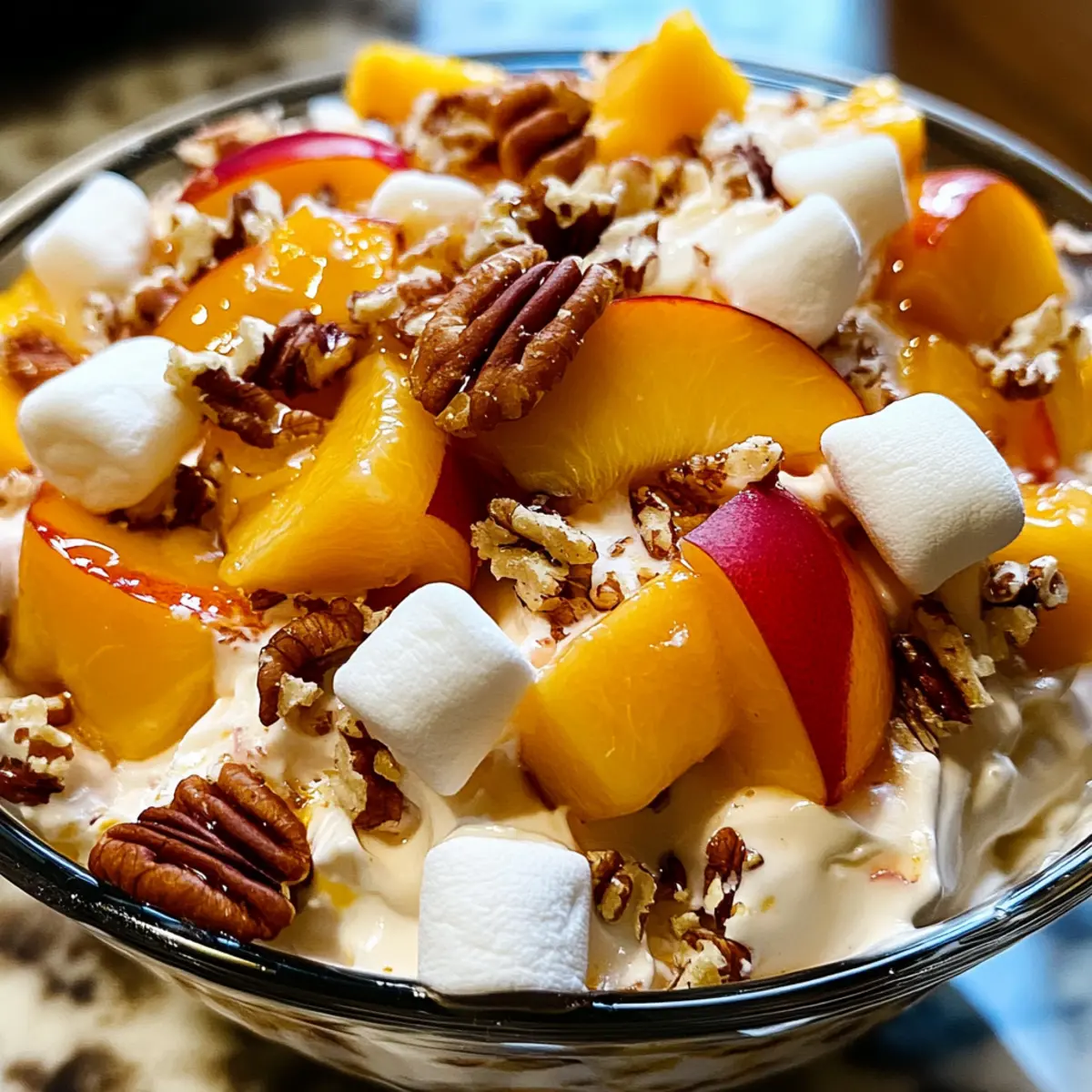 Als ich neulich bei einer Gartenfeier stand und der süße Duft von reifen Pfirsichen durch die Luft schwebte, fiel mir auf, wie sehr ich einen cremigen Millionärspfirsichsalat vermisst hatte. Diese köstliche Kombination aus saftigen Pfirsichen, einer samtigen Puddingbasis und knackigen Pekannüssen ist der perfekte Genuss für jede Gelegenheit. Dieses Rezept für Millionärspfirsichsalat macht nicht nur schnell Freude, sondern beeindruckt auch durch seine Variationsmöglichkeiten. Egal, ob für ein Familienfest oder einen entspannten Abend unter Freunden – diese No-Bake-Spezialität wird bald zum Lieblingsthema. Die cremige Textur ist ein echter Crowd-Pleaser und lässt sich wunderbar im Voraus zubereiten. Bereit, ihn auszuprobieren und die Geschmacksknospen zu verwöhnen? Warum lieben Sie diesen Millionärspfirsichsalat? Einfachheit: Die Zubereitung ist kinderleicht und benötigt nur wenige Schritte. Ideal für alle, die keine aufwendigen Rezepte mögen! Kremige Textur: Der Zusammenschluss aus Puddingbasis und saftigen Pfirsichen sorgt für ein unwiderstehliches Geschmackserlebnis. Anpassungsfähig: Ob mit frischen Früchten oder einem Twist durch die Wahl der Nüsse – dieser Salat lässt sich flexibel gestalten und passt zu jedem Anlass. Ideal für Partys: Perfekt als Dessert für Ihre nächste Gartenfeier oder Familienfeier, da er im Voraus zubereitet werden kann! Beliebter Genuss: Jeder wird diesen Salat mögen, egal ob Kinder oder Erwachsene. Machen Sie ihn zu einem Highlight auf Ihrem Tisch! Millionärspfirsichsalat Zutaten • Der perfekte Ausgangspunkt für Ihre köstliche Kreation! Für den Salat Geschnittene Pfirsiche – sorgen für Süße und Saftigkeit; frische Pfirsiche in der Saison bieten den besten Geschmack. Gehackte Ananas – fügt Süße und Feuchtigkeit hinzu; gut abtropfen lassen, um eine wässrige Konsistenz zu vermeiden. Sofort-Vanille-Puddingpulver – sorgt für Struktur und Cremigkeit; verwenden Sie zuckerfreies Pulver für eine leichtere Variante. Sahnige Topping (Cool Whip) – schafft eine luftige Textur; ein leichteres Topping für weniger Kalorien kann verwendet werden. Mini-Marshmallows – bieten einen chewy Kontrast; können weggelassen oder durch vegane Marshmallows ersetzt werden. Gesüßte Kokosraspeln – tragen zu einer angenehmen Textur und tropischem Geschmack bei; für eine nussfreie Version weglassen. Gehackte Pekannüsse – bringen Nussigkeit und Crunch; können durch Sonnenblumenkerne für eine nussfreie Option ersetzt werden. Sauerrahm – balanciert die Süße mit einer leichten Säure; griechischer Joghurt kann für einen Proteinboost verwendet werden. Vanilleextrakt – verstärkt das gesamte Geschmacksprofil; kann weggelassen werden, um den Geschmack zu vereinfachen. Für die Garnitur Zusätzliche gehackte Pekannüsse – für eine ansprechende Präsentation und zusätzlichen Crunch. Geröstete Kokosraspeln – verleihen dem Dessert eine extra Note und sind eine schöne Dekoration. Viel Spaß beim Zubereiten Ihres köstlichen Millionärspfirsichsalats – ein wahrer Genuss für die Sinne! Schritt-für-Schritt-Anleitungen für Millionärspfirsichsalat Step 1: Obst vorbereiten Schneiden Sie die geschnittenen Pfirsiche in kleine Stücke und lassen Sie die gehackte Ananas gut abtropfen, um eine wässrige Konsistenz zu vermeiden. Achten Sie darauf, dass die Früchte schön saftig sind, um den Geschmack Ihres Millionärspfirsichsalats zu intensivieren. Step 2: Puddingbasis mischen In einer großen Rührschüssel das sofortige Vanille-Puddingpulver mit dem Sahnetopping (Cool Whip) vermengen. Rühren Sie kräftig, bis die Mischung homogen und glatt ist. Dieser Schritt nimmt etwa 2–3 Minuten in Anspruch und sorgt dafür, dass die cremige Textur gut zur Geltung kommt. Step 3: Sauerrahm hinzufügen Fügen Sie nun vorsichtig den Sauerrahm zur Puddingbasis hinzu und falten Sie ihn hinein, bis er gut integriert ist. Achten Sie darauf, die Mischung nicht zu schlagen, um die luftige Konsistenz zu erhalten. Diese Komponente bringt eine angenehme Balance und sorgt dafür, dass Ihr Millionärspfirsichsalat reichhaltig und cremig wird. Step 4: Zutaten kombinieren Falten Sie in die Pudding-Sauerrahm-Mischung die vorbereiteten geschnittenen Pfirsiche, die abgetropfte Ananas, die Mini-Marshmallows, die gesüßte Kokosnuss und die gehackten Pekannüsse. Achten Sie darauf, dass alles gleichmäßig verteilt ist, um den vollen Geschmack in jedem Bissen dieses Millionärspfirsichsalats zu gewährleisten. Step 5: Geschmack hinzufügen und kühlen Geben Sie den Vanilleextrakt in die Mischung und rühren Sie vorsichtig um. Decken Sie den Millionärspfirsichsalat mit Frischhaltefolie ab und lassen Sie ihn mindestens 2 Stunden im Kühlschrank ruhen oder über Nacht, um die Aromen zu verschmelzen. Eine kühle Temperatur sorgt dafür, dass der Salat eine erfrischende Wirkung hat, wenn er serviert wird. Millionärspfirsichsalat Variationen Entdecken Sie die vielen Möglichkeiten, wie Sie dieses Rezept für Millionärspfirsichsalat ganz nach Ihrem Geschmack anpassen können! Frische Früchte: Verwenden Sie saisonale, frisch geschnittene Pfirsiche anstelle von Dosenfrüchten für einen lebendigeren Geschmack. Gesunde Wahl: Tauschen Sie das Instant-Vanille-Puddingpulver gegen eine zuckerfreie Variante aus, um Kalorien zu sparen. Diese Änderung sorgt für einen leichteren Genuss, ohne auf den cremigen Geschmack zu verzichten. Veganer Twist: Ersetzen Sie das Sahnetopping durch Kokoscreme für eine vegane Version, die trotzdem herrlich cremig ist. So bringen Sie eine tropische Note in den Salat! Nussfreier Genuss: Lassen Sie die Pekannüsse weg oder ersetzen Sie sie durch geröstete Sonnenblumenkerne, um eine nussfreie Variante zu kreieren. Diese kleine Abwandlung ist perfekt für Allergiker oder einfach für einen anderen Crunch. Tropische Note: Fügen Sie zusätzlich Ananas oder Mangostücke hinzu, um eine fruchtige, exotische Note zu erhalten. Der zusätzliche Ges