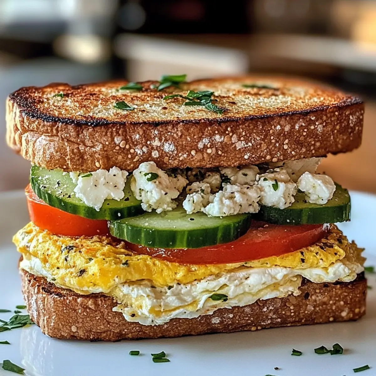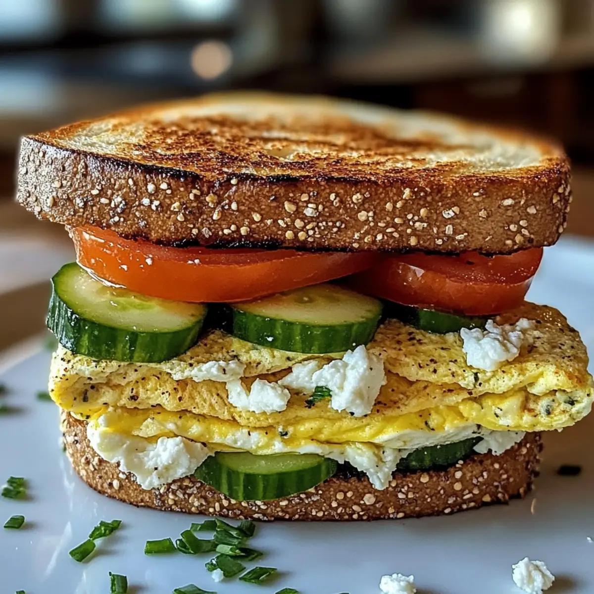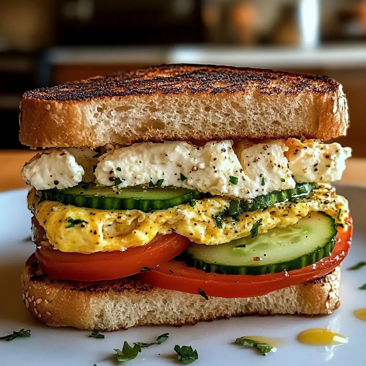 Der Geruch von frisch geröstetem Brot und aromatischen Kräutern hat mich heute Morgen sofort in die mediterrane Küche entführt. Mein Mittelmeer-Frühstückssandwich ist nicht nur ein schnelles Rezept, sondern auch eine wunderbare Möglichkeit, gesund und glücklich in den Tag zu starten. In diesem köstlichen Sandwich treffen cremiger Feta, saftige Tomaten und herzhafte Eier auf knuspriges Brot – perfekt für einen energiegeladenen Beginn oder ein genussvolles Brunch. Und das Beste? Es ist einfach zuzubereiten und voller frischer Zutaten, die nicht nur gut für den Gaumen, sondern auch für den Körper sind. Bist du bereit, dich von diesem mediterranen Genuss verführen zu lassen? Warum wird dieses Sandwich dein Frühstück lieben? Einfachheit: Die Zubereitung ist kinderleicht und erfordert nur grundlegende Kochkünste. Mit wenigen frischen Zutaten zauberst du im Handumdrehen ein köstliches Gericht. Vielseitigkeit: Du kannst die Zutaten nach Lust und Laune anpassen – sei es mit Avocado oder einem pflanzlichen Omelett als vegane Variante. Gesundheit: Vollgepackt mit Gemüse und proteinreichen Eiern ist dieses Sandwich ein gesunder Start in den Tag, den du ohne schlechtes Gewissen genießen kannst. Aromen: Die Kombination von Feta, frischen Kräutern und knusprigem Brot sorgt für ein Geschmackserlebnis, das dich in die Sonne des Mittelmeeres versetzt. Perfekte Portion: Ideal für einen schnellen Frühstück, der dich bis zum Mittag satt hält, oder für einen entspannten Brunch mit Freunden. Entdecke auch unsere empfohlenen Rezepte, wie die Cremige Tomaten Basilikum oder die Geroestete Tomatensuppe Mit, um deine Frühstücksideen zu erweitern! Mittelmeer-Frühstückssandwich Zutaten Für das Omelett • 2 große Eier – Stehen für Protein und Struktur; du kannst sie durch ein Kichererbsenomelett für eine vegane Option ersetzen. • 2 Esslöffel frisch gehackte Petersilie oder Oregano – Verleiht Frische und Geschmack; jede frische Kräutersorte kann als Ersatz verwendet werden. • 1 Prise Salz und schwarzer Pfeffer – Verstärkt den Geschmack; probiere Meersalz für einen intensiveren Genuss. Für das Sandwich • 2 Scheiben Vollkorn- oder Saatenbrot – Dienen als Basis für das Sandwich und vermitteln eine gute Portion Kohlenhydrate; glutenfreies Brot kann für eine glutenfreie Variante genutzt werden. • 2 Scheiben Tomate – Sorgt für Saftigkeit und frischen Geschmack; du kannst Röstpaprika als geschmackliche Abwechslung verwenden. • 4 Scheiben Gurke – Bringt Knusprigkeit und Frische; schaffe eine cremigere Textur, indem du sie durch Avocado ersetzt. • 2 Esslöffel zerbröckelter Feta-Käse – Fügt Cremigkeit und Würze hinzu; Alternativen sind Ziegenkäse oder Mozzarella. • 1 Esslöffel Olivenöl oder Butter – Wird zum Toasten des Brotes und Garen der Eier verwendet; du kannst auch eine Kochspray-Option für weniger Fett nutzen. Mache jeden Biss zu einem Festhalten, indem du dieses Mittelmeer-Frühstückssandwich zubereitest! Verbinde den Geschmack des Mittelmeeres mit frischen, gesunden Zutaten. Schritt-für-Schritt-Anleitung für das Mittelmeer-Frühstückssandwich Schritt 1: Eier vorbereiten In einer Schüssel die Eier aufschlagen und mit gehackter Petersilie oder Oregano, einer Prise Salz und schwarzem Pfeffer verquirlen. Achte darauf, dass die Mischung gut verrührt ist und die Kräuter gleichmäßig verteilt sind. Dies sorgt für ein geschmackvolles Omelett, das sich perfekt in dein Mittelmeer-Frühstückssandwich einfügt. Schritt 2: Omelett garen Erhitze eine beschichtete Pfanne bei mittlerer Hitze und füge das Olivenöl oder die Butter hinzu. Gieße die Eimischung in die Pfanne und lasse sie etwa 2-3 Minuten garen, bis die Ränder fest werden und die Oberfläche leicht blubbert. Überprüfe den Garzustand regelmäßig, um ein Anbrennen zu vermeiden, und forme ein fluffiges Omelett. Schritt 3: Brot toasten Während das Omelett gart, kannst du die Brotscheiben in einer separaten Pfanne oder einem Toaster toasten. Röste das Brot auf mittlerer Hitze für etwa 3-4 Minuten, bis es goldbraun und knusprig ist. Das frisch geröstete Brot ist die perfekte Grundlage für dein Mittelmeer-Frühstückssandwich. Schritt 4: Sandwich zusammensetzen Nehme eine Scheibe des gerösteten Brotes und beginne mit dem Schichten der Zutaten: lege zuerst die Tomatenscheiben darauf, gefolgt von den Gurkenscheiben. Das Gemüse bringt Frische und knusprige Texturen in dein Sandwich, während das Omelett und der Feta die cremigen und herzhaften Elemente hinzufügen. Schritt 5: Feta hinzufügen Sobald das Gemüse geschichtet ist, platziere das Omelett vorsichtig auf die Gurken. Streue die zerbröckelten Feta-Käse über das Omelett, damit sich die Aromen schön vereinen. Achte darauf, dass die Füllung gut verteilt ist, um das köstliche Geschmackserlebnis deines Mittelmeer-Frühstückssandwichs zu maximieren. Schritt 6: Sandwich vollenden Decke das Sandwich mit der zweiten Scheibe des gerösteten Brotes ab und drücke es leicht zusammen. Schneide das Sandwich schräg in zwei Hälften, um die Füllung gut sichtbar zu machen. Serviere das Mittelmeer-Frühstückssandwich warm und genieße jeden Biss mit den frischen und herzhaften Aromen! Bereite dein Mittelmeer-Frühstückssandwich im Voraus vor! Du kannst die Zubereitung deines Mittelmeer-Frühstückssandwich ganz einfach im Voraus planen! Bereite das herzhafte Omelett schon bis zu 24 Stunden im Voraus zu und lagere es in einem luftdichten Behälter im Kühlschrank, um die Frische zu bewahren. Auch das Gemüse wie Tomaten und Gurken kann bereits geschnitten und in einem separaten Behälter aufbewahrt werden; das sorgt dafür, dass sie knackig bleiben. Am Morgen des Genusses musst du nur noch die Brotscheiben rösten, das Omelett und die frischen Zutaten schichten und das Sandwich zusammenbauen. So sparst du wertvolle Zeit und bereitest ein gesundes Frühstück zu, das auch nach dem Vorbereiten noch genauso lecker ist! Was pas