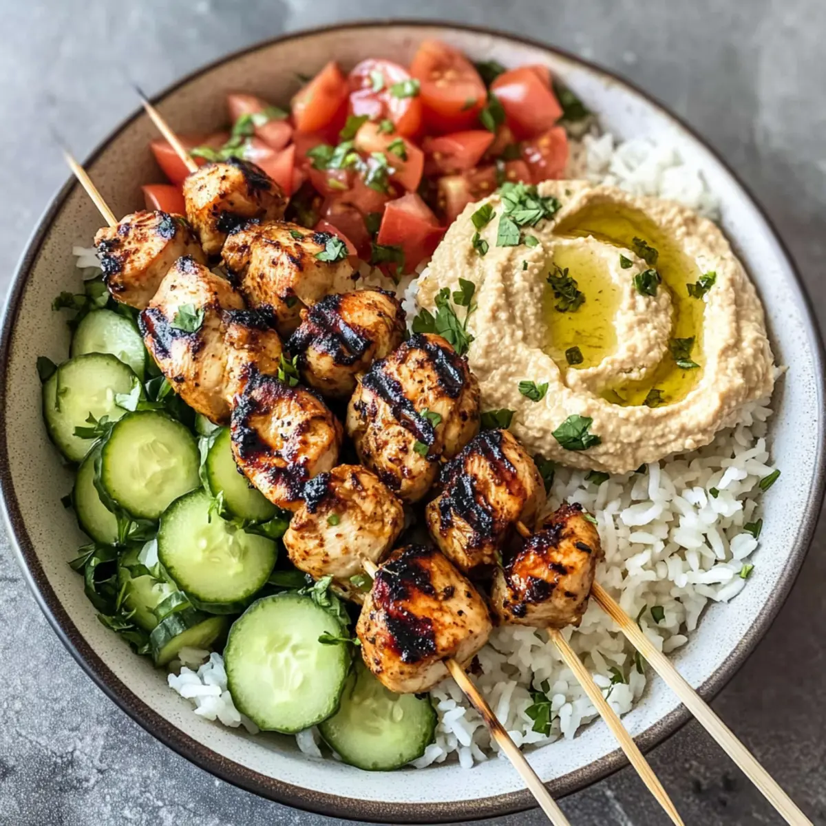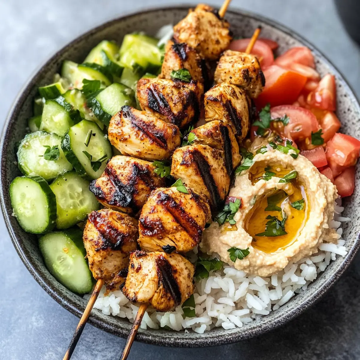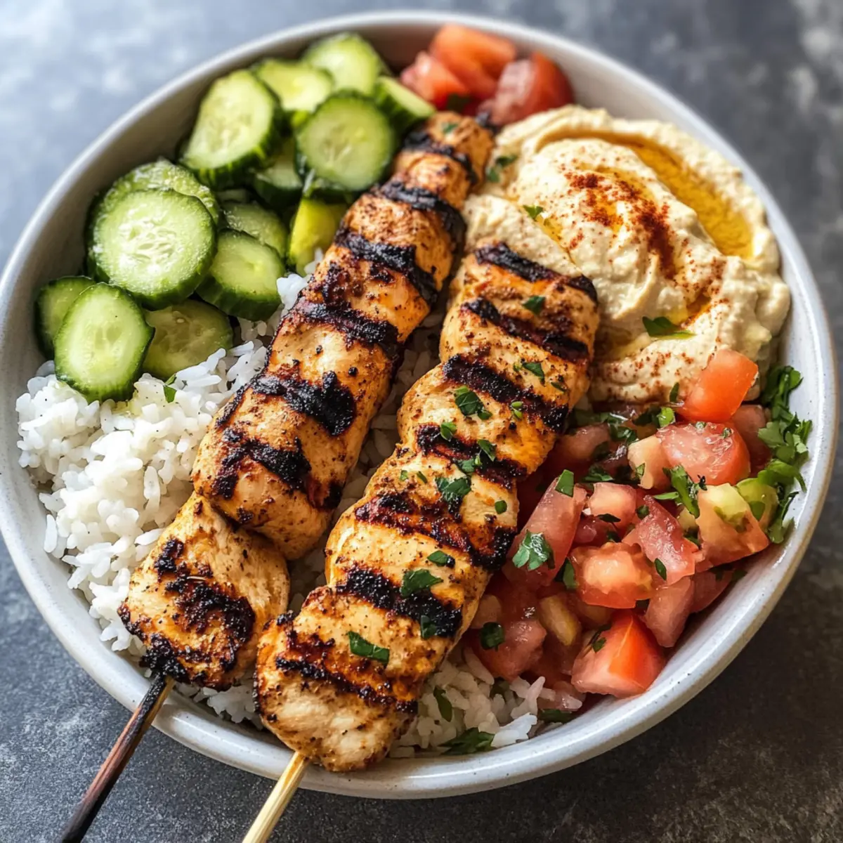Als ich kürzlich am Markt stand und die bunte Auswahl an Gemüsesorten bewunderte, fiel mir auf, wie sehr die mediterrane Küche die Sinne anspricht. Diese Mittelmeer-Reisbowl mit gegrilltem Hühnchen bringt nicht nur lebendige Farben auf den Tisch, sondern ist auch eine wahre Geschmacksexplosion! Mit saftig gegrillten Hühnchen-Tawook-Spießen und einem frischen Salat aus knackigen Gurken und Tomaten ist dieses Gericht sowohl gesund als auch sättigend. Ideal für Meal Prep, kannst du dir eine Woche voller köstlicher Mittagessen sichern, ohne ständig in der Küche stehen zu müssen. Neugierig, wie du dieses köstliche Rezept ganz einfach zubereiten kannst? Lass uns gleich eintauchen! Warum wirst du diese Reisbowl lieben? Einfachheit bei der Zubereitung: Mit nur wenigen frischen Zutaten und einem unkomplizierten Rezept kannst du diese Mittelmeer-Reisbowl schnell zubereiten. Vielseitigkeit: Du kannst die Zutaten nach Belieben anpassen, sei es mit verschiedenen Gemüsesorten oder einer ausgewählten Marinade. Gesunde Geschmacksexplosion: Das Zusammenspiel von saftigem Hühnchen, frischen Tomaten und knackigen Gurken sorgt für ein unvergessliches Geschmackserlebnis. Perfekt für Meal Prep: Diese Reisbowl ist ideal für die Vorbereitungen der Woche – einfach in Portionen aufteilen für gesunde, schnelle Mittagessen! Zugänglichkeit: Egal, ob du ein erfahrener Koch oder ein Kochanfänger bist, dieses Rezept ist leicht nachvollziehbar und macht immer Eindruck. Verpass nicht die Gelegenheit, auch andere mediterrane Klassiker wie Tabbouleh oder Baba Ganoush auszuprobieren! Zutaten für die Mittelmeer-Reisbowl mit gegrilltem Hühnchen Für die Spieße Hühnchenbrust – Hauptprotein für die Spieße; boneless skinless ist am praktischsten. Griechischer Joghurt – Serviert als Marinade und macht das Hühnchen zart; alternativ kannst du auch normalen Joghurt verwenden. Olivenöl – Verleiht der Marinade und dem Dressing eine reichhaltige Note; wähle unbedingt hochwertige Qualität. Knoblauch – Für das besondere Aroma; frisch ist am besten, aber Knoblauchpulver geht auch im Notfall. Zitronensaft – Sorgt für Säure und balanciert die Aromen; frischer Zitronensaft ist sehr empfehlenswert. Tomatenmark – Verstärkt den Geschmack der Marinade; kann durch pürierte Tomaten ersetzt werden. Paprika – Gibt Farbe und milden Geschmack; geräucherte Paprika bringt eine zusätzliche Tiefe. Küchen- oder Meersalz – Zum Würzen; nach Geschmack anpassen. Oregano oder Thymian – Für eine würzige Note; frische Kräuter bringen mehr Frische ins Gericht. Für die Reisbowl Basmati-Reis – Der perfekte Basis für die Bowl; du kannst ihn durch Quinoa ersetzen, wenn du einen nussigen Geschmack wünschst. Hühnerbrühe – Zum Kochen des Reises; sorgt für zusätzlichen Geschmack. Alternativ kannst du Gemüsebrühe verwenden. Für den Salat Gurke und Tomaten – Unentbehrlich für Frische in der Bowl; saisonale Sorten sorgen für den besten Geschmack. Frische Kräuter (Minze oder Petersilie) – Bringen Farbigkeit und Frische; beide Kräuter harmonieren gut zusammen. Beilagen Naan oder Pita-Brot – Ideal, um die Zutaten aufzusaugen; jede Art von Fladenbrot funktioniert auch. Hummus – Fügt eine cremige Textur hinzu; selbstgemacht oder gekauft – ganz nach deinem Geschmack. Diese Mittelmeer-Reisbowl mit gegrilltem Hühnchen wird deine Geschmacksknospen begeistern! Schritt-für-Schritt-Anleitung für die Mittelmeer-Reisbowl mit gegrilltem Hühnchen Step 1: Hühnchen marinieren Schneide die Hühnchenbrust in 2,5 cm große Würfel. Vermische in einer Schüssel die Zutaten für die Marinade: griechischen Joghurt, Olivenöl, Knoblauch, Zitronensaft, Tomatenmark, Paprika, Salz und Oregano. Gib das Hühnchen dazu und stelle sicher, dass alle Stücke gut mit der Marinade bedeckt sind. Lasse das Hühnchen mindestens 1 Stunde, idealerweise bis zu 24 Stunden, im Kühlschrank marinieren. Step 2: Hühnchen grillen Heize den Grill auf mittlere bis hohe Hitze (ca. 200°C) vor. Stecke die marinierten Hühnchenwürfel auf Spieße, um sie gleichmäßig zu grillen. Lege die Spieße auf den Grill und grille sie für 5–7 Minuten pro Seite, bis sie goldbraun sind und eine Innentemperatur von 74°C erreicht haben. Achte darauf, sie nicht zu übergrillen, damit sie saftig bleiben. Step 3: Reispilaf zubereiten Während das Hühnchen grillt, erhitze einen großen Topf bei mittlerer Hitze und gib etwas Olivenöl hinzu. Füge eine gehackte Zwiebel hinzu und dünste sie 3–4 Minuten, bis sie weich und durchscheinend ist. Gib den Basmati-Reis dazu und rühre alles 2 Minuten um. Fülle dann mit Hühnerbrühe auf, füge etwas Salz hinzu, bringe alles zum Kochen, decke den Topf ab und lasse den Reis bei schwacher Hitze 15 Minuten köcheln. Step 4: Salat zubereiten Während der Reis kocht, bereite den frischen Salat vor. Schneide die Gurke und die Tomaten in kleine Stücke und gib sie in eine Schüssel. Füge die gehackten frischen Kräuter (Minze oder Petersilie) hinzu und beträufle alles mit einem Schuss Olivenöl. Würze den Salat mit Salz und Pfeffer nach Geschmack und mische alles gut durch. Step 5: Bowls anrichten Sobald der Reis gar ist, nimm ihn vom Herd und lasse ihn 5 Minuten ruhen, bevor du ihn auflockerst. Verteile die Reisportionen gleichmäßig auf Schüsseln. Lege die gegrillten Hühnchenspieße darauf und füge eine großzügige Portion des frischen Salats hinzu. Ergänze jede Bowl mit einem Klecks Hummus und serviere die Mittelmeer-Reisbowl mit gegrilltem Hühnchen zusammen mit Naan oder Pita-Brot. Mittelmeer-Reisbowl mit gegrilltem Hühnchen: Variationen Lass deiner Kreativität freien Lauf und passe dieses köstliche Rezept nach deinem Geschmack an! Hühnchenvariationen: Ersetze die Hühnchenbrust durch Hähnchenschenkel für einen noch saftigeren Biss. Vegetarische Option: Verwende gegrillte Zucchini und Auberginen zur Abwechslung oder für eine vegetarische Version. Alternative Getreide: Wechsle den Basma