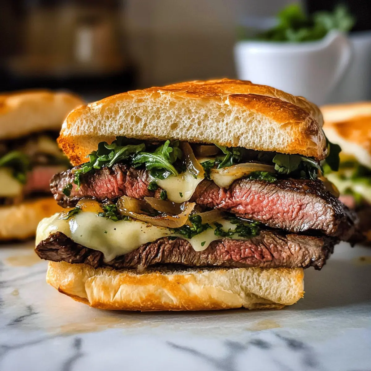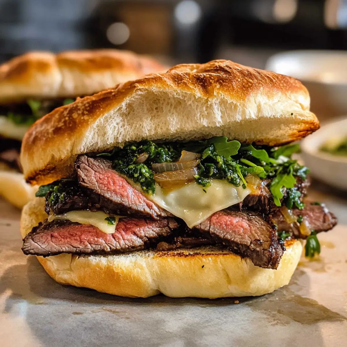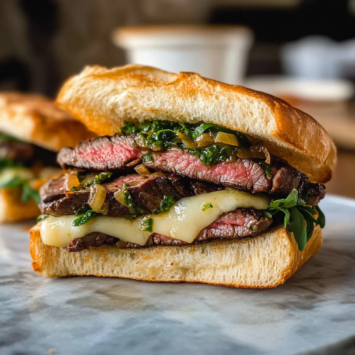Die Grillglut knistert leise, während ich die letzten Vorbereitungen für meinen Ribeye-Steak-Sandwich mit Chimichurri treffe. Der Duft von frisch gegrilltem Rindfleisch mischt sich mit dem Aroma von karamellisierten Zwiebeln und der lebendigen Frische des Chimichurris – eine Kombination, die einfach standhalten muss. Diese Sandwiches sind nicht nur schnell zubereitet, sondern auch ein echter Publikumsmagnet, perfekt für ein entspanntes Abendessen oder ein Mittagessen mit Freunden. Wenn du also Lust auf ein herzhaftes Gericht hast, das sowohl Geschmack als auch Gemütlichkeit vereint, bist du hier genau richtig! Bereit, dein eigenes Meisterwerk zu kreieren und den Grillspaß in dein Zuhause zu bringen? Warum werden Sie dieses Rezept lieben? Einfachheit pur: Die Zubereitung ist unkompliziert und erfordert nur grundlegende Kochfähigkeiten, perfekt für alle, die in der Küche glänzen möchten. Würzige Frische: Das aromatische Chimichurri bringt lebhafte Aromen mit, die das zarte Ribeye-Steak wunderbar ergänzen. Vielseitige Zutaten: Egal, ob du die leckeren karamellisierten Zwiebeln oder die cremige Havarti magst, die Variationsmöglichkeiten sind endlos – wie wäre es mit einem Hauch von Blauer Käse, um das Ganze aufzupeppen? Schnelle Zubereitung: In weniger als 30 Minuten kannst du ein außergewöhnliches Sandwich kreieren, das für Freunde und Familie perfekt geeignet ist. Ein echter Publikumsmagnet: Probiere es einmal aus und du wirst sehen, wie schnell die Teller leer sind. Du kannst das Sandwich auch später mit einer frischen Peach and Burrata Salad kombinieren, um ein komplettes Menü zu genießen. Ribeye-Steak-Sandwich mit Chimichurri Zutaten • Für das Chimichurri: Petersilie – bringt Frische und kräutrige Aromen. Ersetze sie mit Koriander für eine andere Note. Rotweinessig – sorgt für die nötige Säure und einen würzigen Kick. Apfelessig ist ein guter Ersatz, falls nötig. Knoblauch – fügt Tiefe und Aroma hinzu. Vermeide Substitutionen; gerösteter Knoblauch kann jedoch milder wirken. Getrockneter Oregano – verleiht zusätzliche Kräuteraromen. Italienische Gewürzmischung ist ein brauchbarer Ersatz. Zerstoßener roter Pfeffer – bringt die gewünschte Schärfe. Passe die Menge nach Geschmack an oder lasse ihn für eine mildere Variante weg. Kochsalz – hebt den Geschmack aller Zutaten hervor. Meersalz oder Tafelsalz können ebenfalls verwendet werden. Schwarzer Pfeffer – sorgt für das nötige Würzen. Frisch gemahlener bietet einen intensiveren Geschmack. Olivenöl – dient als Basis für das Chimichurri. Avocadoöl ist eine interessante Alternative. • Für das Sandwich: Gelbe Zwiebeln – bringen süße, karamellisierte Aromen. Süße Zwiebeln oder Schalotten sind ebenso geeignet. Ribeye-Steaks – zarte Fleischsorte mit marmoriertem Fett für zusätzlichen Geschmack. Flank- oder Schwanzsteak sind mögliche Alternativen. Ciabatta-Brötchen – die perfekte Basis für das Sandwich. Baguette oder Vollkornbrötchen sind ebenfalls Optionen. Havarti-Käse – cremige Textur und Geschmack. Monterey Jack oder Gouda können ähnlich verwendet werden. Mayonnaise – sorgt für die nötige Cremigkeit. Griechischer Joghurt ist eine leichtere Alternative. Rucola – bringt eine pfeffrige Frische ins Sandwich. Spinat oder gemischte Blätter sind gute Ersatzoptionen. Schritt-für-Schritt-Anleitung für Ribeye-Steak-Sandwich mit Chimichurri Step 1: Chimichurri vorbereiten Zuerst das Chimichurri zubereiten. Petersilie, Rotweinessig, Knoblauch, getrockneten Oregano, zerstoßenen roten Pfeffer, Salz, Pfeffer und Olivenöl in eine Küchenmaschine geben. Die Mischung pürieren, bis sie eine grobe Konsistenz erreicht. Dies dauert etwa 1 bis 2 Minuten. Danach in eine Schüssel umfüllen und beiseite stellen, damit sich die Aromen entfalten können. Step 2: Zwiebeln karamellisieren Eine große Pfanne bei niedriger Hitze aufsetzen und einen Esslöffel Olivenöl hinzufügen. Die in Ringe geschnittenen gelben Zwiebeln gleichmäßig in die Pfanne legen und alle paar Minuten umrühren. Etwa 20 Minuten garen, bis sie weich und goldbraun sind. Zum Schluss mit Salz und Pfeffer würzen, um die Aromen zu intensivieren und das Sandwich perfekt zu ergänzen. Step 3: Steak braten Den Ofen auf 200°C vorheizen. Inzwischen die Ribeye-Steaks mit Salz und Pfeffer würzen. Eine große Pfanne auf hoher Hitze erhitzen und die Steaks jeweils 2 Minuten pro Seite anbraten, bis sie eine schöne Kruste haben. Für ein medium-rare Steak sollte die Kerntemperatur 49°C betragen. Nach dem Braten die Steaks 5 bis 10 Minuten ruhen lassen, damit die Säfte sich setzen können. Step 4: Brötchen toasten und Käse schmelzen Die Ciabatta-Brötchen längs aufschneiden und auf ein Backblech legen. Eine Scheibe Havarti-Käse auf jede Brötchenhälfte legen. Im vorgeheizten Ofen 3 bis 5 Minuten rösten, bis der Käse geschmolzen und die Brötchen leicht goldbraun sind. Dies gibt dem Sandwich eine köstliche cremige Note. Step 5: Sandwich zusammenstellen Die frisch gerösteten Ciabatta-Brötchen mit einer Schicht Mayonnaise bestreichen. Die saftig geschnittenen Ribeye-Steaks gleichmäßig darauflegen, gefolgt von einer Prise Meersalz. Die karamellisierten Zwiebeln und das Chimichurri großzügig darüber geben. Zum Abschluss eine Handvoll Rucola darauflegen und das Sandwich umklappen. Sofort servieren und genießen. Lagerungstipps für Ribeye-Steak-Sandwich mit Chimichurri Raumtemperatur:: Die Sandwiches sollten nicht länger als 2 Stunden bei Raumtemperatur gelagert werden, um die Frische und Sicherheit der Zutaten zu gewährleisten. Kühlschrank:: Bewahre Reste in einem luftdichten Behälter im Kühlschrank auf, wo sie bis zu 3 Tage haltbar sind. Denke daran, das Sandwich vor dem Verzehr leicht aufzuwärmen. Gefrierschrank:: Du kannst das Ribeye-Steak vor dem Zusammenstellen des Sandwichs einfrieren. Wickele es gut in Frischhaltefolie ein, damit es bis zu 3 Monate haltbar ist. Vor dem Gebrauch vollstä