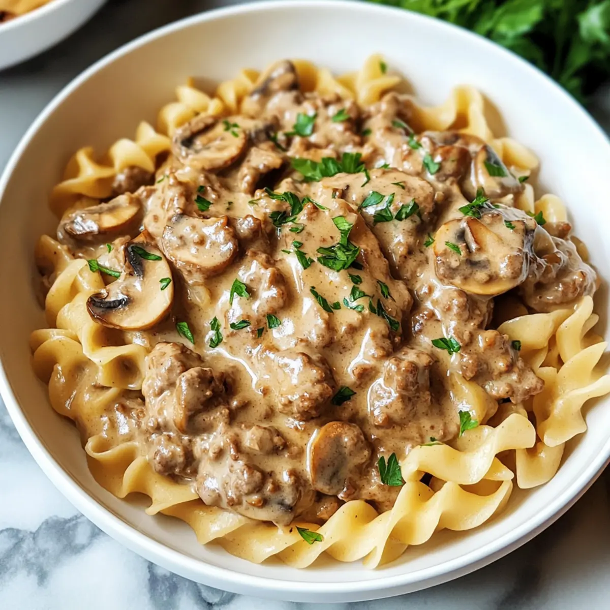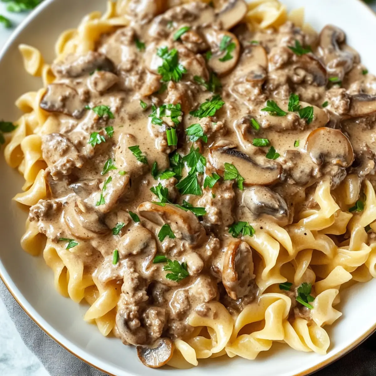 Ein köstliches Aroma zieht durch die Küche, als ich die ersten Zutaten für mein Rindfleisch Stroganoff vorbereite. In diesem wunderbaren, ein-Topf-Rezept vereinen sich zarte, krümelige Rinderhackfleischstücke mit erdigen Cremini-Pilzen und einer cremigen Sauce, die perfekt zu al dente gekochten Eiernudeln passt. Es ist nicht nur ein absoluter Familienliebling, sondern auch budgetfreundlich und macht das Abendessen an stressigen Wochentagen zum Kinderspiel. Während es den Geschmack von Restaurantkultur auf den Tisch bringt, bleibt der Abwasch minimal – ein echter Gewinn! Wenn du auf der Suche nach einer schnellen Lösung für das Abendessen bist, wirst du lieben, wie einfach und köstlich dieses Gericht ist. Habt ihr schon Ideen, wie ihr dieses Rezept nach eurem Geschmack anpassen könnt? Warum wirst du dieses Rezept lieben? Schnelligkeit und Einfachheit: Mit nur einem Topf ist dieses Rindfleisch Stroganoff im Handumdrehen zubereitet, ideal für stressige Wochentage. Vielseitigkeit: Du kannst das Hackfleisch ganz einfach durch Hähnchen oder Gemüse ersetzen, um den Bedürfnissen deiner Familie gerecht zu werden. Reichhaltiger Geschmack: Die Kombination aus zartem Rinderhack, würzigen Pilzen und einer cremigen Sauce sorgt für ein intensives Geschmackserlebnis. Familienfreundlich: Kinder und Erwachsene genießen die herzhaften Aromen gleichermassen, was es zum perfekten Abendessen für die ganze Familie macht. Einfache Anpassungen: Ob mit griechischem Joghurt für eine leichtere Variante oder durch das Hinzufügen von frischem Gemüse – es gibt viele Möglichkeiten, dieses Rezept zu personalisieren. Probiere es auch mit einer Beilage wie glasierten Karotten für eine vollständige Mahlzeit! Rindfleisch Stroganoff Zutaten • Für ein unkompliziertes und köstliches Gericht: Ungesalzene Butter – sorgt für Reichtum und Tiefe im Geschmack. Cremini-Pilze – bringen einen umami-reichen Geschmack und Textur; ersetze sie durch Champignons, wenn nötig. Süße Zwiebel – verstärkt den Grundgeschmack; gelbe oder weiße Zwiebeln sind ebenfalls geeignet. Grobes Salz & Pfeffer – unverzichtbar für die Würze; nach Geschmack anpassen. Mageres Rinderhackfleisch – die Hauptproteinquelle; kann durch Hähnchen- oder Putenhackfleisch ersetzt werden. Knoblauch – bringt ein aromatisches Element; fein gehackt. Getrockneter Thymian – für herzhafte Noten; frischer Thymian kann dreimal verwendet werden. Allzweckmehl – verdickt die Sauce; glutenfreies Mehl ist ebenfalls eine Option. Trocken Weißwein – fügt Säure und Tiefe hinzu; ersetze es durch zusätzliche Rinderbrühe für eine alkoholfreie Variante. Rinderbrühe – die Basis der Sauce; wähle natriumarme Varianten, um den Salzgehalt zu kontrollieren. Worcestershire-Sauce – sorgt für eine pikante Note; kann durch eine Mischung aus Sojasoße und Balsamico-Essig ersetzt werden. Dijon-Senf – verbessert den Geschmack mit einer subtilen Schärfe. Ungekochte Eiernudeln – kochen in der Sauce und nehmen die Aromen auf; verwende Vollkorn- oder glutenfreie Pasta, wenn gewünscht. Sauerrahm – sorgt für Cremigkeit; griechischer Joghurt ist eine gesündere Option. Frische Petersilie – für Garnierung und Frische. Entdecke, wie du diese Zutaten nutzen kannst, um ein köstliches Rindfleisch Stroganoff zu kreieren, das nicht nur deinen Gaumen verwöhnt, sondern auch für die ganze Familie geeignet ist! Schritt-für-Schritt-Anleitung für Rindfleisch Stroganoff Step 1: Butter schmelzen Erhitze eine große Pfanne bei mittlerer Hitze und lasse die ungesalzene Butter darin schmelzen. Achte darauf, dass sie nicht braun wird. Die Butter sorgt dafür, dass das Rindfleisch Stroganoff reichhaltig und geschmackvoll wird und bildet die Basis für die anderen Zutaten. Step 2: Pilze und Zwiebel anbraten Füge die geschnittenen Cremini-Pilze und die gehackte süße Zwiebel hinzu und brate sie für etwa 3-5 Minuten an, bis die Pilze zart und goldbraun sind. Rühre gelegentlich um und würze mit grobem Salz und Pfeffer, um die Aromen während des Kochens zu intensivieren. Step 3: Rindfleisch anbraten Gib das magere Rinderhackfleisch in die Pfanne und brate es für weitere 3-5 Minuten, bis es gut durchgegart und leicht gebräunt ist. Zerbrich es mit einem Kochlöffel in kleine Stücke. Mit Knoblauch und getrocknetem Thymian würzen und rühre alles um, bis die Aromen etwa eine Minute lang duften. Step 4: Mehl einrühren Streue das Allzweckmehl über die Fleischmischung und rühre gründlich um. Lass das Mehl für ca. eine Minute mitbraten, bis es leicht bräunlich wird. Dies hilft, die Sauce für das Rindfleisch Stroganoff zu verdicken und verleiht zusätzliche Tiefe an Geschmack. Step 5: Wein hinzufügen Gieße den trockenen Weißwein in die Pfanne und benutze einen Holzlöffel, um den Boden von etwaigen angebratenen Reste abzukratzen. Lasse die Mischung 1-2 Minuten köcheln, bis der Wein etwas reduziert ist und der Alkohol verdampft. Dies sorgt für eine geschmackvolle Grundlage. Step 6: Brühe und Gewürze hinzufügen Füge die Rinderbrühe, Worcestershire-Sauce, Dijon-Senf und die ungekochten Eiernudeln hinzu. Rühre alles gut durch und würze nach Geschmack mit Salz und Pfeffer. Die Mischung sollte gut vermengt sein, bevor das Rindfleisch Stroganoff köcheln kann. Step 7: Kochen lassen Bringe die Mischung zum Kochen, decke die Pfanne ab und reduziere die Hitze auf niedrig. Lasse alles für 9-10 Minuten köcheln, bis die Nudeln al dente sind und die Sauce eingedickt ist. Überprüfe zwischendurch, ob du eventuell mehr Flüssigkeit hinzufügen musst. Step 8: Sauerrahm einrühren Nehme die Pfanne vom Herd und rühre den Sauerrahm ein, bis er gleichmäßig verteilt ist und die Sauce cremig wird. Erhitze die Mischung für 1-2 Minuten, um sicherzustellen, dass der Sauerrahm gut integriert ist. So erhältst du die ideale Cremigkeit für dein Rindfleisch Stroganoff. Step 9: Garnieren und servieren Gebe frische, gehackte Petersilie über das fertige G