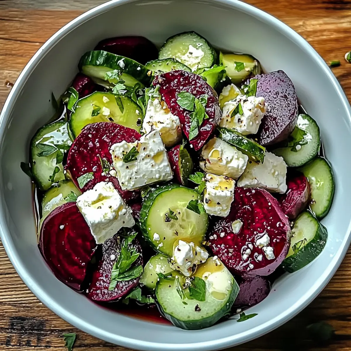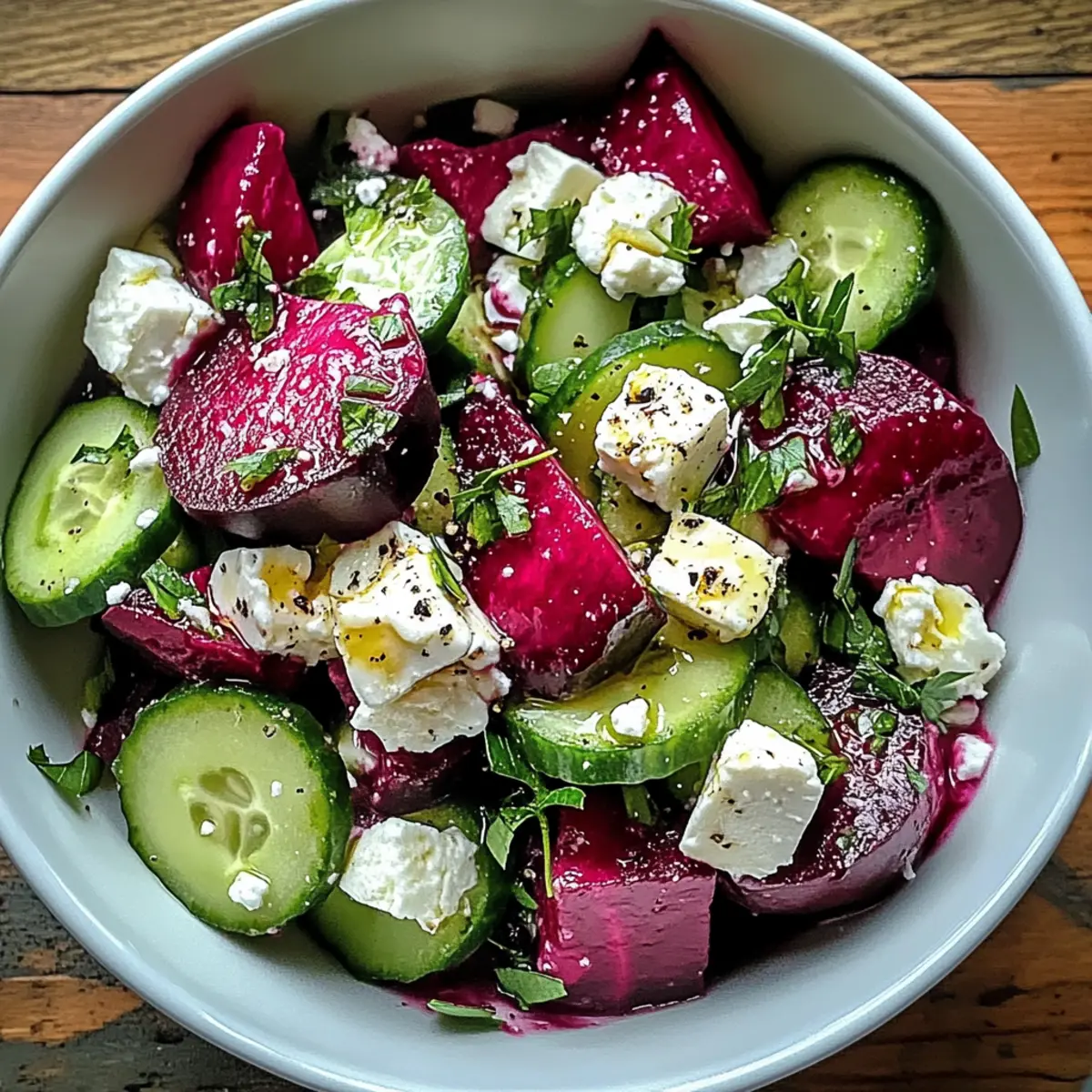 Als ich letzte Woche auf dem Wochenmarkt stand, erblickte ich die tiefroten, prallen Rüben, die mir sofort ins Auge sprangen. Es war der perfekte Moment, um einen köstlichen Rote-Bete-Salat mit Feta und Gurken zu zaubern. Diese bunte Komposition vereint die erdige Süße der Rote Bete mit dem cremigen, würzigen Feta und dem knackigen Gurkensalat – ein Genuss sowohl für die Augen als auch für den Gaumen! In nur wenigen Minuten zubereitet, ist dieser Salat ein wunderbares Gericht für ein leichtes Mittagessen oder als Beilage zum Abendessen. Freuen Sie sich zudem auf die vielseitigen Variationen, die Sie je nach Lust und Laune hinzufügen können. Neugierig geworden, wie Sie dieses Geschmackserlebnis selbst kreieren können? Warum werden Sie diesen Rote-Bete-Salat lieben? Frische Geschmacksexplosion: Die Kombination aus erdiger Süße der Rote Bete und cremigem Feta sorgt für ein unverwechselbares Erlebnis. Einfache Zubereitung: In weniger als 30 Minuten zaubern Sie einen gesunden Salat, ideal für unter der Woche. Vielseitig und Anpassbar: Fügen Sie nach Belieben Nüsse, frische Kräuter oder sogar Obst für einen zusätzlichen Kick hinzu. Perfekte Beilage: Dieser Salat passt hervorragend zu Gegrilltem oder als leichter Snack. Nährstoffreich: Vollgepackt mit Vitaminen, unterstützt er Ihre Gesundheit und ist ein wahres Superfood. Entdecken Sie auch die Varianten für ein schnelles und einfaches Hühnchen Ranch Salat Rezept oder probieren Sie mal das Chili Hühnchen Rezept für eine herzhafte Abwechslung! Rote-Bete-Salat Zutaten Für den Salat • Rote Bete – der Hauptbestandteil, der diesem Salat seine erdige Süße verleiht; frische Rüben sorgen für den besten Geschmack. • Feta-Käse – dieser cremige und würzige Käse gibt dem Salat eine besondere Note; für eine vegane Variante können Sie pflanzliche Käsesorten verwenden. • Gurke – sorgt für einen erfrischenden Crunch; wählen Sie eine feste Gurke für optimale Textur. • Rote Zwiebel – fügt Schärfe und Geschmack hinzu; für einen milderen Geschmack können Sie Frühlingszwiebeln verwenden. • Olivenöl – zur Dressing-Basis, die die Aromen verstärkt; kann durch Avocadoöl ersetzt werden. • Balsamico-Essig – sorgt für Säure und Tiefe; alternativ ist auch Apfelessig geeignet. • Zitronensaft – bringt Frische und Helligkeit; dieser Schritt ist zwar optional, aber sehr zu empfehlen. • Salz und Pfeffer – unverzichtbare Gewürze zur Abrundung des Geschmacks; nach Geschmack anpassen. • Frische Petersilie oder Minze – dient als optionale Garnitur für zusätzlichen Geschmack und Farbe. Lassen Sie sich von dieser köstlichen Rezeptur inspirieren und entdecken Sie die Freude am gesund essen mit diesem Rote-Bete-Salat! Step-by-Step Instructions for Rote-Bete-Salat mit Feta und Gurken Step 1: Ofen vorheizen Heizen Sie den Ofen auf 200°C (400°F) vor. Dies ist der ideale Zeitpunkt, um den Geschmack der Rote Bete zu intensivieren und sie auf die perfekte Zartheit zu bringen. Stellen Sie sicher, dass Ihr Backblech bereit ist, bevor Sie mit den Beeten fortfahren. Step 2: Rote Bete vorbereiten Waschen und schrubben Sie die Rote Bete gründlich, um Schmutz und Rückstände zu entfernen. Wickeln Sie jede Rübe einzeln in Aluminiumfolie ein. Dies sorgt dafür, dass die Beeten beim Rösten ihren Saft behalten und gleichmäßig garen. Step 3: Rote Bete rösten Legen Sie die eingewickelten Rüben auf ein Backblech und rösten Sie sie im vorgeheizten Ofen für etwa 45 Minuten. Die Rote Bete ist fertig, wenn sie mit einer Gabel leicht durchstochen werden kann. Während sie rösten, können Sie die anderen Zutaten vorbereiten. Step 4: Rote Bete abkühlen lassen Nehmen Sie das Backblech aus dem Ofen und lassen Sie die Rote Bete für ungefähr 15 Minuten abkühlen. Dadurch wird es einfacher, die Haut zu entfernen, ohne sich die Hände zu verbrennen. Step 5: Rote Bete schälen Schälen Sie die Rote Bete, indem Sie die Haut mit Ihren Händen abziehen. Diese sollte sich leicht lösen lassen, wenn die Beete gut geröstet sind. Achten Sie darauf, nicht zu viel Saft zu verlieren, und machen Sie bei Bedarf eine kleine Schüssel zur Hand. Step 6: Rote Bete schneiden Schneiden Sie die geschälten Rüben in mundgerechte Stücke. Die leuchtende Farbe macht den Rote-Bete-Salat besonders ansprechend. Achten Sie darauf, die Stücke gleichmäßig zu schneiden, damit sie schön vermischt werden können. Step 7: Zutaten kombinieren In einer großen Schüssel vermischen Sie die geschnittenen Rote Bete, gewürfelte Gurke, zerbröckelten Feta und fein geschnittene rote Zwiebel. Diese Kombination bringt eine schöne Mischung aus Farben und Texturen in Ihren Rote-Bete-Salat mit Feta und Gurken. Step 8: Dressing zubereiten In einer kleinen Schüssel verrühren Sie Olivenöl, Balsamico-Essig, Zitronensaft, Salz und Pfeffer. Das Dressing spielt eine wesentliche Rolle in Ihrem Rote-Bete-Salat, um die Aromen der frischen Zutaten zu verstärken und das Gericht zu harmonisieren. Step 9: Salat anrichten Gießen Sie das Dressing über den Salat und vermengen Sie alles vorsichtig, damit die Zutaten gut durchgezogen und gleichmäßig benetzt sind. Achten Sie darauf, dass die Rote Bete nicht zerdrückt wird, um die schön geschnittenen Stücke zu erhalten. Step 10: Garnieren Vor dem Servieren können Sie den Rote-Bete-Salat mit frischen Kräutern wie Petersilie oder Minze garnieren. Dies bringt nicht nur Farbe, sondern auch zusätzliche Frische in das Gericht. Servieren Sie den Salat entweder frisch oder lassen Sie ihn im Kühlschrank für eine Stunde ziehen, um die Aromen zu intensivieren. Tipps für den besten Rote-Bete-Salat • Rote Bete perfekt rösten: Achten Sie darauf, die Rüben ausreichend lange zu rösten, bis sie zart sind. Zu kurze Röstdauer kann zu einem matschigen Ergebnis führen. • Konsistenz beachten: Verwenden Sie frische, knackige Gurken für den besten Biss. Weiche Gurken können den Salat wässrig und unappetitlich mache