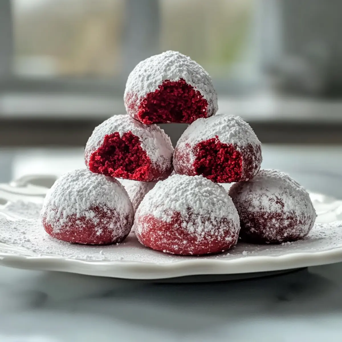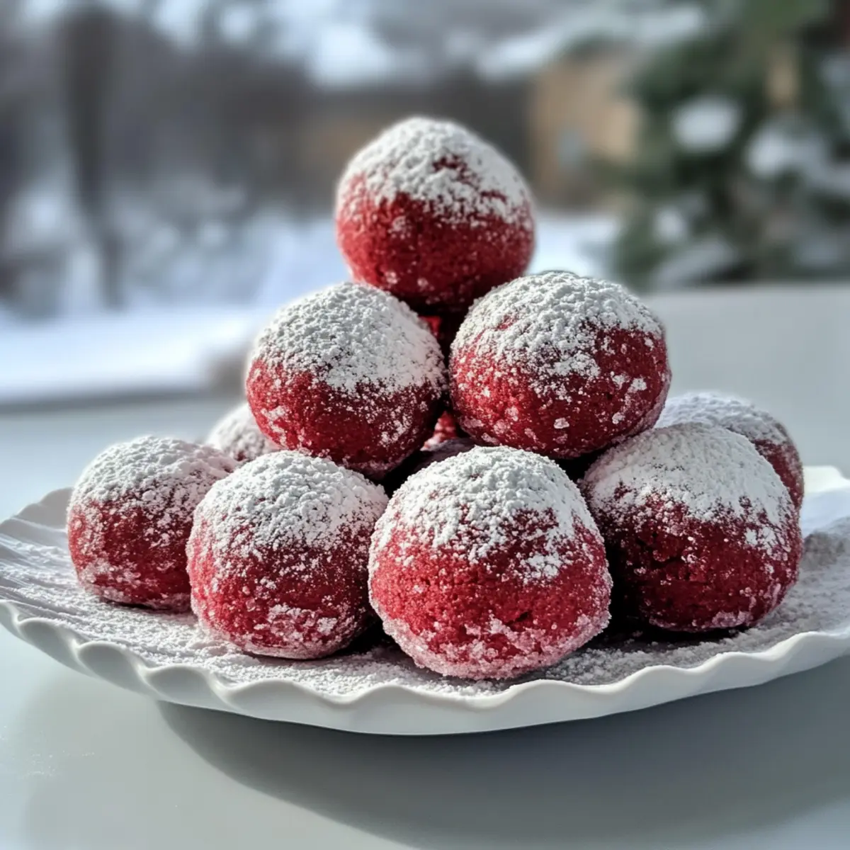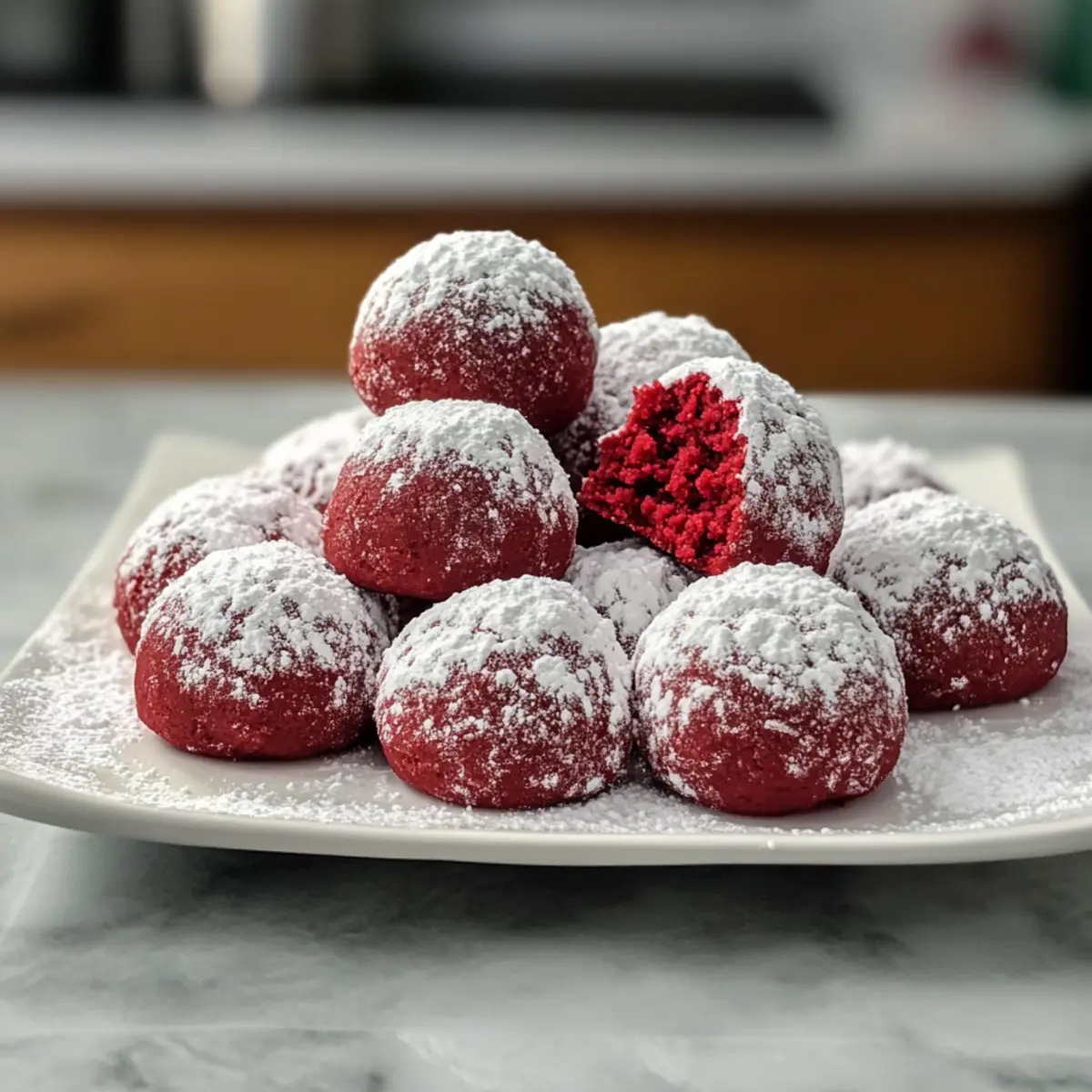 Ich muss euch etwas erzählen: Es gibt nichts Schöneres, als in der festlichen Jahreszeit etwas Aufregendes zu zaubern. Stellt euch vor, ihr beißt in einen süßen, weichen Keks, der mit einem Hauch von Puderzucker bestäubt ist und wie ein kleiner Traum aussieht – das sind die Rote Samtschneebälle! Diese ohne Backen zubereiteten Köstlichkeiten sind nicht nur ein echter Hingucker auf jeder Weihnachtstafel, sondern auch so einfach zuzubereiten, dass ihr sie problemlos in euer Repertoire aufnehmen könnt. Perfekt für den Cookie-Austausch oder als kleines Geschenk, sind sie auch ein Zauberwerk für alle, die sich nach einer süßen Abwechslung sehnen. Neugierig, wie ihr diese festlichen Schneiderlinge in eurer Küche zum Strahlen bringen könnt? Lasst uns gemeinsam die Geheimnisse hinter diesen unwiderstehlichen Keksen entdecken! Warum sind Rote Samtschneebälle ein Muss? Einfachheit im Fokus: Diese Rote Samtschneebälle sind kinderleicht zuzubereiten und benötigen keine Backkünste. Festliche Farben: Ihr strahlendes Rot und die pudrige Zuckerschicht bringen jede Feier zum Leuchten. Vielseitige Füllungen: Experimentiere mit köstlichen Füllungen wie Frischkäse oder Nutella, um deinen persönlichen Twist hinzuzufügen. Perfekte Geschenke: Ideal, um sie in dekorativen Dosen zu verschenken – ein süßes Dankeschön für Familie und Freunde. Lange Haltbarkeit: Bewahre sie in einem luftdichten Behälter auf und genieße sie bis zu 5 Tage lang! Und falls du nach weiteren leckeren Rezepten suchst, schau dir auch die Wuerzige Tortilla Suppe und die Kaese Lauch Suppe an! Rote Samtschneebälle Zutaten • Für den Keks-Teig Butter – sorgt für Reichtum und Feuchtigkeit; verwende weiche Butter für ein einfaches Mixen. Zucker – verleiht Süße und unterstützt die Textur; du kannst auch braunen Zucker nutzen für einen intensiveren Geschmack. Vanilleextrakt – verstärkt den Geschmack; alternativ kannst du auch Mandelaroma verwenden für eine andere Note. Rote Lebensmittelfarbe – wichtig für die ikonische rote Farbe; empfiehlt sich Gel-Lebensmittelfarbe für leuchtende Ergebnisse ohne Beeinträchtigung der Textur. Mehl – sorgt für Struktur; ersetze es durch eine glutenfreie Mehlmischung für eine glutenfreie Version. Kakaopulver – trägt zum Schokoladengeschmack und zur Farbbalance bei; achte darauf, ein helleres Kakaopulver zu verwenden, um das Rot zu bewahren. Backpulver – sorgt dafür, dass die Kekse aufgehen; stelle sicher, dass es frisch ist für die besten Ergebnisse. Salz – hebt den Gesamtgeschmack; ein Prise genügt, um die Süße zu verstärken. • Für die Zuckerschicht Puderzucker – verleiht den köstlichen, schneebedeckten Look; verwende ihn großzügig für ein festliches Finish. Nun, wo du die Zutaten kennst, bist du bereit, diese köstlichen Rote Samtschneebälle selbst zu zaubern! Schritt-für-Schritt-Anleitung für Rote Samtschneebälle Schritt 1: Butter und Zucker cremig schlagen In einer großen Schüssel die weiche Butter zusammen mit dem Zucker mit einem Handmixer oder einer Küchenmaschine cremig schlagen, bis die Mischung leicht und luftig ist – etwa 3-5 Minuten. Achte darauf, dass keine Klumpen mehr vorhanden sind und die Masse eine hellgelbe Farbe erreicht. Schritt 2: Vanille und Lebensmittelfarbe hinzufügen Füge nun den Vanilleextrakt hinzu und mische gut. Gib dann die Gel-Lebensmittelfarbe dazu und arbeite weiter, bis die Mischung eine tiefrote, gleichmäßige Farbe hat. Hierbei kann es hilfreich sein, einen Teigschaber zu verwenden, um alles gut einzuarbeiten und ein homogenes Ergebnis zu erhalten. Schritt 3: Trockene Zutaten kombinieren In einer separaten Schüssel das Mehl, Kakaopulver, Backpulver und Salz gut vermischen. Diese Zutaten sollten gleichmäßig verteilt sein, um sicherzustellen, dass alle Kekse beim Backen die richtige Textur und Geschmack haben. Nach dem Mischen die trockenen Zutaten nach und nach in die feuchte Mischung einarbeiten, bis ein gleichmäßiger Teig entsteht. Schritt 4: Kekse formen Den fertigen Teig in gleichmäßige Portionen teilen und mit den Händen kleine Kugeln von etwa 2,5 cm Durchmesser formen. Diese Kugeln dann auf ein mit Backpapier ausgelegtes Blech setzen und darauf achten, dass sie genug Abstand haben, damit sie beim Backen nicht zusammenkleben. Schritt 5: Backen Die Rote Samtschneebälle im vorgeheizten Ofen bei 175°C (350°F) für 10–12 Minuten backen. Die Kekse sollten am Rand fest, aber in der Mitte noch leicht weich sein – so erhalten sie ihre typisch chewy Konsistenz. Schritt 6: Abkühlen und Zuckerschicht Die Kekse nach dem Backen leicht abkühlen lassen, bevor du sie vorsichtig in Puderzucker wälzt. Für einen besonders schneebedeckten Look kannst du sie sogar zweimal wälzen. Lasse die Kekse anschließend vollständig auf einem Gitterrost auskühlen, damit sie ihre perfekte Form und Textur behalten. Rote Samtschneebälle Variationen & Alternativen Lass deiner Kreativität freien Lauf und customize diese köstlichen Kekse nach deinem Geschmack! Frischkäse-Füllung: Füge ein kleines Stück Frischkäse in die Mitte der Keks-Kugeln hinzu für einen cremigen Biss. Er macht die Kekse besonders käsig und lecker. Weiße Schokolade: Ersetze die Füllung durch ein Stück weiße Schokolade, die während des Backens schmilzt und einen süßen Kontrast zur roten Färbung bietet. Diese Variante ist für die Schokoladenliebhaber unter euch! Nuss-Nougat-Creme: Verwende Nutella als Füllung für einen schokoladigen und nussigen Geschmack. Es verleiht jedem Keks eine tolle, klebrige Überraschung. Glutenfrei: Tausche das Weizenmehl gegen eine glutenfreie Mehlmischung aus, damit auch glutenempfindliche Freunde genießen können. Diese Variante hält die weichen, chewy Eigenschaften der Kekse bei. Aromatische Gewürze: Experimentiere mit einem Hauch Zimt oder Muskatnuss im Teig für ein zusätzliches aromatisches Element. Diese Gewürze bringen eine warme Würze, die perfekt zur festlichen Jahresz