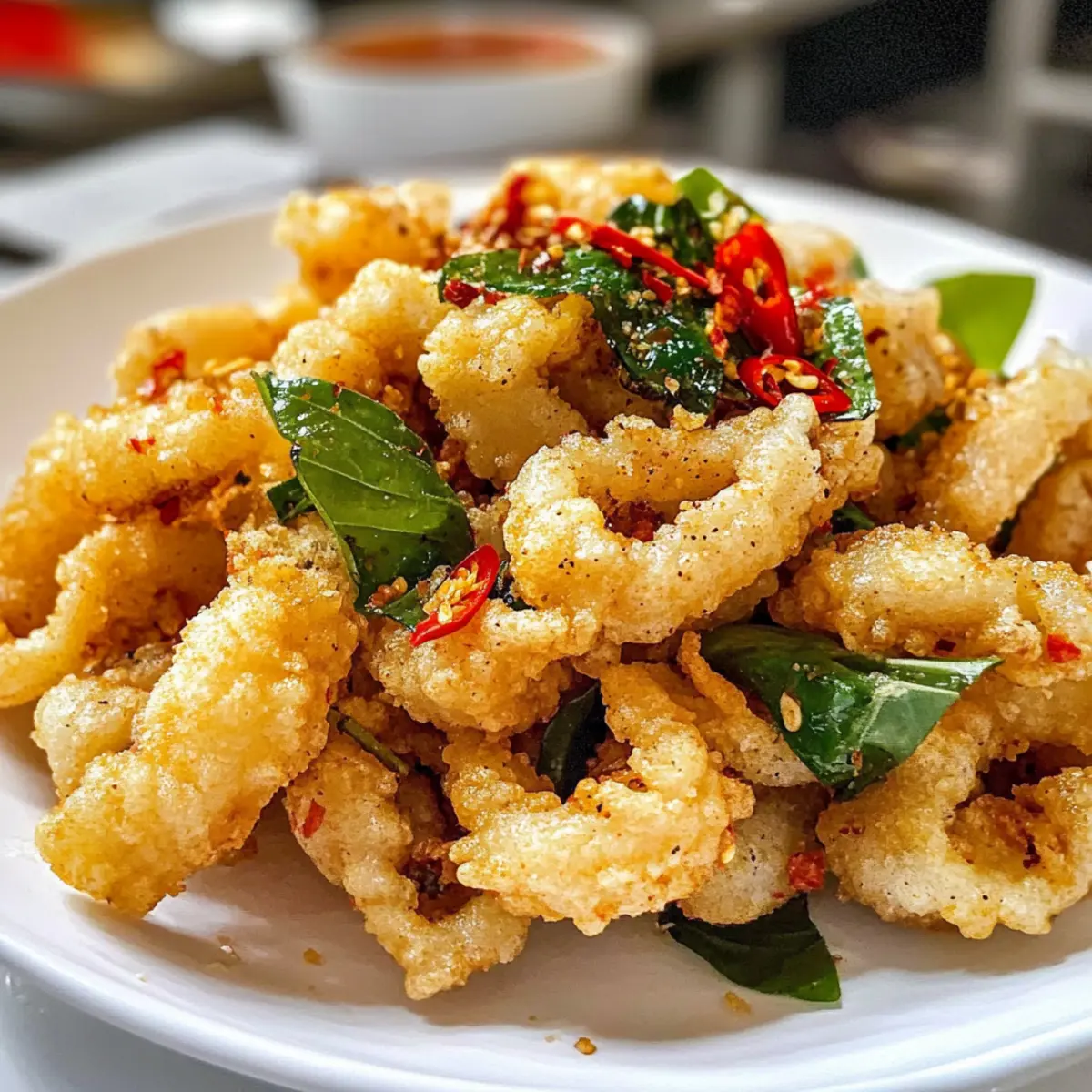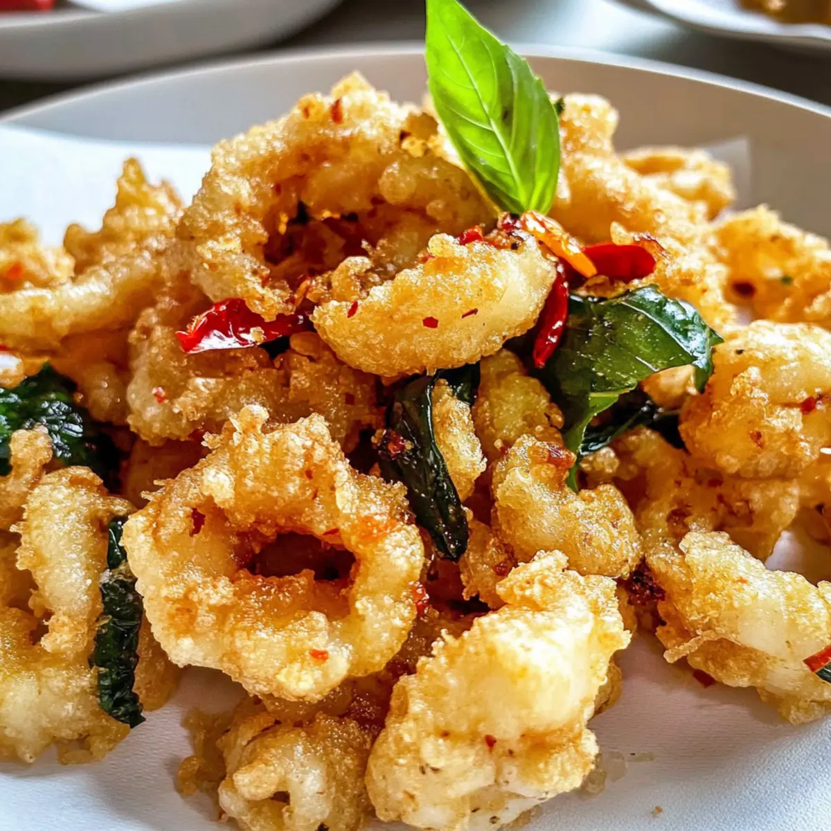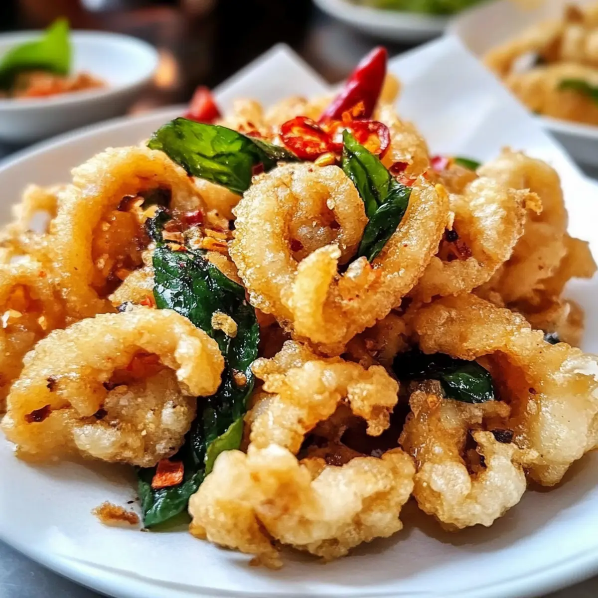 Die lebhaften Straßenmärkte Taiwans sind ein wahres Fest der Aromen und Düfte, die den Gaumen verführen. Wenn ich an diese Orte denke, kommt mir sofort der köstliche Salz und Pfeffer Tintenfisch in den Sinn – so zart, dass er förmlich auf der Zunge zergeht. In meinem Rezept vereinen sich knackige, frittierte Teigstückchen mit aromatischem Knoblauch und frischem Basilikum zu einer unwiderstehlichen Mischung. Diese Speise ist nicht nur ein echter Hit als Appetizer, sondern auch im Handumdrehen zubereitet – perfekt für spontane kulinarische Abenteuer. Ich lade euch ein, die Aromen Taiwans in eurer eigenen Küche zu entdecken. Seid ihr bereit, euren Gästen diesen köstlichen Genuss zu servieren? Warum ist dieser Tintenfisch so besonders? Knusprig und aromatisch: Dieser Salz und Pfeffer Tintenfisch ist nicht nur ein wahres Geschmackserlebnis, sondern bietet auch eine herrlich knusprige Textur, die jeder lieben wird. Schnell und einfach: Mit nur wenigen Zutaten und einer unkomplizierten Zubereitung ist dieses Rezept ideal für spontane Abende. Vielseitig: Egal, ob ihr ihn alleine snackt oder als Teil einer festlichen Mahlzeit serviert – er passt perfekt zu jedem Anlass. Inspiration aus Taiwan: Die Kombination aus frischem Basilikum und geröstetem Knoblauch bringt ein unverwechselbares taiwanesisches Flair direkt auf euren Tisch. Beliebter Genuss: Dieser Appetizer sorgt garantiert für Begeisterung bei euren Gästen und lässt sich hervorragend mit verschiedenen Dips kombinieren. Taucht ein in die Herrlichkeiten der asiatischen Küche und probiert diesen Klassiker . Zutaten für Salz und Pfeffer Tintenfisch • Damit ihr sofort loslegen könnt, hier sind die Zutaten für dieses köstliche Gericht: Für den Tintenfisch Tintenfisch (Calamari) – Frisch oder gefroren; frischer Tintenfisch sorgt für ein besseres Aroma. Shaoxing Wein – Für einen Hauch von Süße und zur Milderung von Fischgeruch; kann durch trockenen Sherry ersetzt werden. Meersalz & weißer Pfeffer – Wichtig für die Würze; ihr könnt auch normalen Salz oder schwarzen Pfeffer verwenden. Für die Panade Mehl – Bildet die Grundlage der knusprigen Kruste; keine Substitution nötig. Speisestärke – Sorgt für zusätzliche Knusprigkeit; keine Substitution nötig. Für das Frittieren Pflanzenöl (Sonnenblumen- oder Rapsöl) – Zum Frittieren in ausreichender Menge; sorgt dafür, dass der Tintenfisch vollständig eingetaucht ist. Für die Aromatisierung Knoblauch – Gibt Aroma und wird kross frittiert; muss dünn geschnitten und gut getrocknet werden. Frische Chili – Für eine würzige Note; kann je nach Geschmack weggelassen oder angepasst werden. Frische Basilikumblätter – Verstärkt das Aroma; frisch verwenden, um die besten Ergebnisse zu erzielen. Schritt-für-Schritt-Anleitung für Salz und Pfeffer Tintenfisch Step 1: Tintenfisch vorbereiten Reinigt den Tintenfisch gründlich und schneidet ihn in mundgerechte Stücke. Macht dazu kreuzweise Einschnitte in die Haut, um ein gleichmäßiges Frittieren zu gewährleisten. So sorgt ihr dafür, dass der Tintenfisch beim Frittieren zart bleibt und die Aromen gut aufnimmt. Step 2: Marinieren In einer Schüssel vermischt ihr den vorbereiteten Tintenfisch mit Shaoxing Wein, Meersalz und weißem Pfeffer. Lasst die Mischung abgedeckt für 15 Minuten im Kühlschrank marinieren. Diese kurze Zeit hilft, den Geschmack zu intensivieren und die zarte Textur des Salz und Pfeffer Tintenfisch zu verbessern. Step 3: Panade vorbereiten Während der Tintenfisch mariniert, kombiniert ihr in einer Schüssel Mehl, Speisestärke, Meersalz und weißen Pfeffer zu einer homogenen Mischung. Diese Mischung sorgt für die knusprige Panade, die unser Gericht perfekt ergänzt. Stellt die Panade in der Nähe des Frittierbereichs bereit. Step 4: Öl erhitzen In einem tiefen Topf oder einer Fritteuse erhitzt ihr reichlich Pflanzenöl auf etwa 180°C (350°F). Verwendet ein Küchenthermometer, um die Temperatur zu überprüfen. Wenn das Öl heiß genug ist, entsteht eine zarte Blasenbildung, wenn ihr einen Holzlöffel hineinhalte. Step 5: Tintenfisch panieren Nehmt die marinierten Tintenfischstücke aus dem Kühlschrank und taucht sie in die vorbereitete Panade. Schüttelt überschüssiges Mehl ab, damit die Panade gleichmäßig auf dem Tintenfisch haftet. Diese Schicht sorgt für die gewünschte Knusprigkeit beim Frittieren. Step 6: Frittieren Lasst den panierte Tintenfisch vorsichtig in das heiße Öl gleiten und frittiert ihn circa 2 Minuten lang. Wendet die Stücke einmal in der Mitte der Frittierzeit, um eine gleichmäßige Bräunung zu erreichen. Achte darauf, dass die Kruste goldbraun wird und der Tintenfisch zart bleibt. Step 7: Aromatisierung hinzufügen Nach ca. 2 Minuten fügt ihr dünn geschnittenen Knoblauch, Basilikumblätter und frische Chili hinzu. Diese Zutaten verleihen dem Salz und Pfeffer Tintenfisch eine zusätzliche aromatische Note und sollten für ungefähr eine weitere Minute mitfrittiert werden, bis sie knusprig sind. Step 8: Servieren Entfernt den knusprigen Tintenfisch aus dem Öl und lasst ihn auf Küchenpapier abtropfen. Dadurch wird überschüssiges Öl entfernt, und der Tintenfisch bleibt knusprig. Serviert ihn sofort, garniert mit zusätzlichem weißen Pfeffer für eine geschmackliche Verstärkung und genießt das Aroma! Tipps zur Vorbereitung für Salz und Pfeffer Tintenfisch Diese Salz und Pfeffer Tintenfisch sind perfekt für die Vorbereitung im Voraus! Ihr könnt den Tintenfisch bis zu 24 Stunden im Voraus marinieren und im Kühlschrank aufbewahren, um die Aromen tief einzuziehen und die zarte Textur zu erhalten. Währenddessen könnt ihr die Panade (Mehl und Speisestärke) ebenfalls vorab mischen und in einem luftdichten Behälter aufbewahren, um in hektischen Momenten Zeit zu sparen. Beim Frittieren einfach das Öl auf die richtige Temperatur bringen und den vorbereiteten Tintenfisch panieren sowie frittierten, bis er knusprig (ca. 2 Minuten) ist. Acht