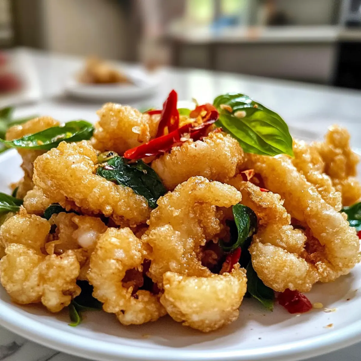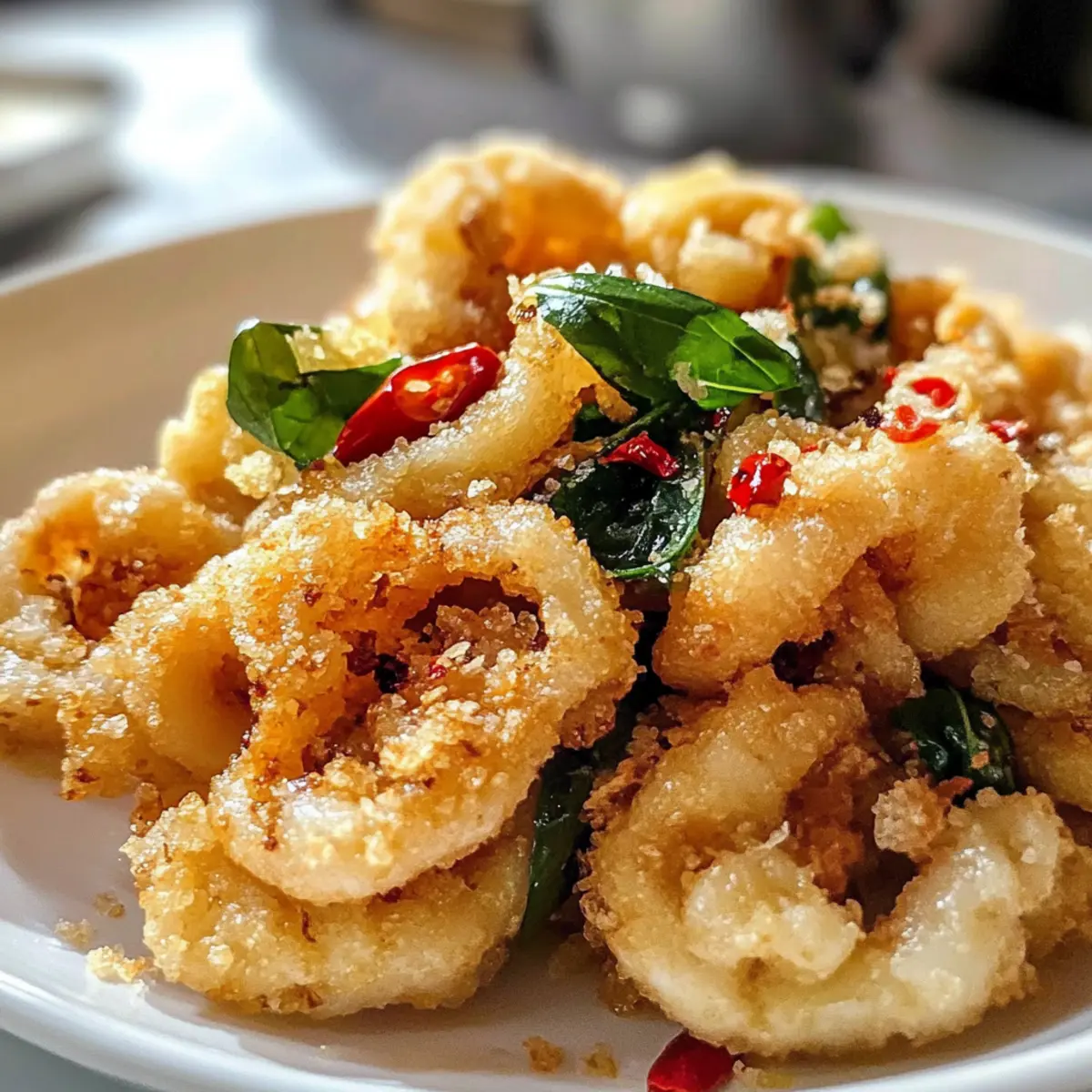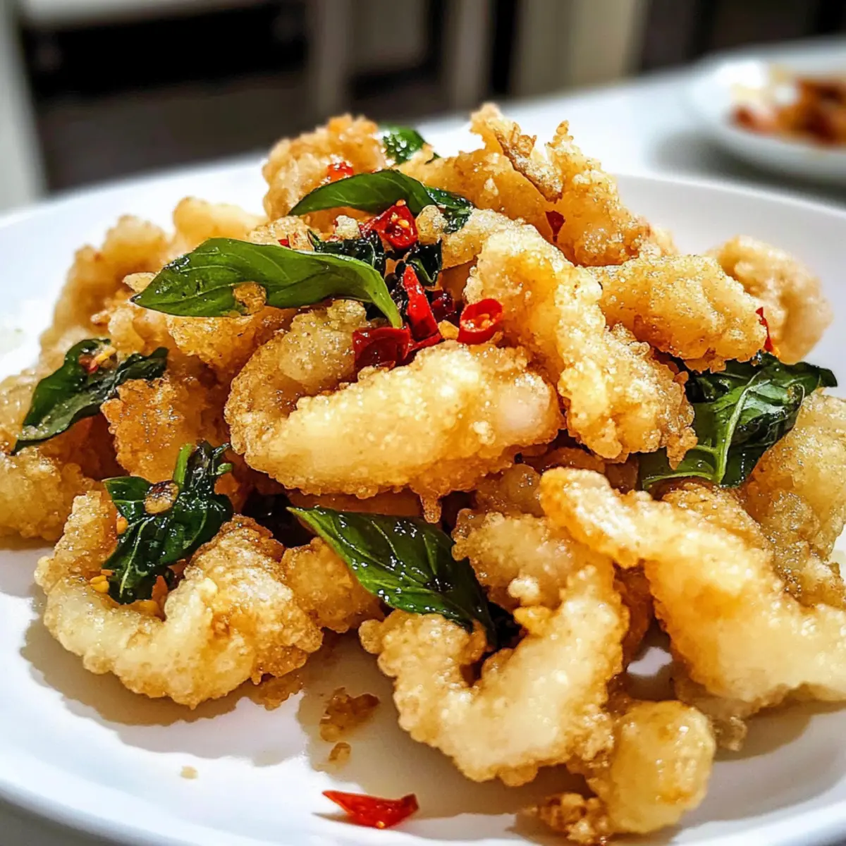 Die Vorstellung, wie sich der Geschmack des krabbeligen Tintenfischs auf meiner Zunge entfaltet, lässt mein Herz höher schlagen. Unser Rezept für Salz und Pfeffer Tintenfisch im taiwanesischen Stil kombiniert die perfekte Knusprigkeit mit einer zarten Textur und einem Hauch von aromatischem Knoblauch und frischem Basilikum. Dieses Gericht ist nicht nur wahnsinnig lecker, sondern auch blitzschnell zuzubereiten – ideal für alle, die müde von Fast-Food sind und stattdessen etwas Außergewöhnliches auf den Tisch bringen möchten. Egal, ob als aufregende Vorspeise oder als fulminante Beilage, der Salz und Pfeffer Tintenfisch wird ohne Zweifel die Geschmäcker Ihrer Freunde und Familie begeistern. Neugierig, wie Sie dieses sensationelle Gericht ganz einfach selbst zubereiten können? Lassen Sie uns gleich loslegen! Warum Salz und Pfeffer Tintenfisch lieben? Einfachheit: Die Zubereitung ist unkompliziert und erfordert keine besonderen Kochkünste, sodass jeder diesen köstlichen Tintenfisch meistern kann. Köstlicher Geschmack: Die Kombination aus herzhaftem Knoblauch und aromatischem Basilikum verleiht dem Tintenfisch eine geschmackliche Tiefe, die begeistert. Perfekte Textur: Die knusprige Hülle um den zarten Tintenfisch sorgt für ein unverwechselbares Genusserlebnis bei jedem Bissen. Vielseitigkeit: Dieses Gericht lässt sich wunderbar mit verschiedenen Dips servieren, wie einer würzigen Aioli oder einer süßen Chili-Sauce. Schnelle Zubereitung: Mit wenigen Schritten können Sie in weniger als 30 Minuten ein außergewöhnliches Gericht auf den Tisch bringen – perfekt für spontane Dinnerpartys oder gemütliche Abende. Beliebtheit: Ob als Vorspeise oder Hauptgericht, dieser Salz und Pfeffer Tintenfisch wird bei Ihren Gästen garantiert für Begeisterung sorgen! Besuchen Sie auch unser Rezept für Spinat Feta Auflauf für eine köstliche Ergänzung zu Ihrem Menü. Salz und Pfeffer Tintenfisch Zutaten • Entdecken Sie die essenziellen Zutaten für dieses köstliche Gericht: Für den Tintenfisch Tintenfisch (Calamari) – Hauptzutat; sorgt für die zarte, kautschukartige Textur, die nur durch richtiges Garen erreicht wird. Frischer oder aufgetauter Tintenfisch liefert die besten Ergebnisse. Shaoxing Wein – Verwendet in der Marinade; verleiht Geschmackstiefe und neutralisiert den fischigen Geschmack. Sie können ihn durch trockenen Sherry ersetzen, wenn nötig. Meersalz – Verstärkt den Geschmack; sollte nicht ersetzt werden, da es für die Würze unerlässlich ist. Weißer Pfeffer – Sorgt für milden Geschmack und Aroma; bei Bedarf kann schwarzer Pfeffer verwendet werden, aber der Geschmack ist dann anders. Für die knusprige Panade Mehl – Teil der knusprigen Hülle; gibt Struktur. Allzweckmehl ist geeignet. Maisstärke – Fügt der Panade Knusprigkeit hinzu; unerlässlich für die gewünschte Textur. Für das Frittieren Pflanzenöl (Sonnenblumen- oder Rapsöl) – Wird zum Frittieren verwendet; achten Sie darauf, dass das Öl hohe Temperaturen verträgt. Für den aromatischen Geschmack Knoblauch – Verleiht Aroma und Geschmack; sollte dünn geschnitten und vor dem Frittieren trocken getupft werden, um überschüssige Feuchtigkeit zu vermeiden. Frische Chili – Sorgt für Schärfe und Geschmack; entkernen Sie sie für weniger Schärfe. Frische Basilikumblätter – Gibt beim Frittieren ein herrliches Aroma; für einen anderen Geschmack können auch getrocknete Basilikum verwendet werden, frisch wird jedoch empfohlen. Schritt-für-Schritt-Anleitung für Salz und Pfeffer Tintenfisch Step 1: Tintenfisch vorbereiten Schneiden Sie den Tintenfisch in kleine, mundgerechte Stücke, indem Sie kreuzweise Schlitze in die Oberfläche machen. Diese Technik hilft, die Aromen der Marinade besser aufzunehmen. Lassen Sie die geschnittenen Stücke etwa 15 Minuten im Kühlschrank ruhen, während Sie die restlichen Vorbereitungen treffen. Step 2: Marinade zubereiten Marinieren Sie die Tintenfischnuggets in einer Mischung aus Shaoxing Wein, Meersalz und weißem Pfeffer. Diese Marinade sorgt dafür, dass der Tintenfisch zart und geschmackvoll wird. Lassen Sie die Tintenfischstücke für 15 Minuten im Kühlschrank ziehen, damit sie den vollen Geschmack aufnehmen können. Step 3: Panade vorbereiten Mischen Sie in einer Schüssel Mehl, Maisstärke, eine Prise Meersalz und weißen Pfeffer für die knusprige Panade. Ein gut vermischter Teig sorgt dafür, dass der Tintenfisch gleichmäßig ummantelt wird. Stellen Sie die Panade bereit, während Sie das Öl für das Frittieren erhitzen. Step 4: Öl erhitzen Erhitzen Sie in einem tiefen Topf oder einer Fritteuse Pflanzenöl auf 180 °C (350 °F). Verwenden Sie ein Küchenthermometer oder einen Holzlöffel-Trick – wenn sich Blasen um den Griff bilden, ist das Öl heiß genug. Achten Sie darauf, dass genügend Öl vorhanden ist, um die Tintenfischstücke vollständig einzutauchen. Step 5: Tintenfisch frittieren Tauchen Sie die marinierten Tintenfischstücke in die vorbereitete Panade und frittieren Sie sie in kleinen Portionen für etwa 2 Minuten. Wenden Sie die Stücke einmal während des Frittiervorgangs, bis sie goldbraun und knusprig sind. Fügen Sie in den letzten 30 Sekunden den vorbereiteten Knoblauch, das Basilikum und die frische Chili hinzu, um ein intensives Aroma zu erzielen. Step 6: Abtropfen und servieren Nehmen Sie die frittierten Tintenfischstücke mit einem Schaumlöffel aus dem Öl und lassen Sie sie auf Küchenpapier abtropfen, um überschüssiges Öl zu entfernen. Servieren Sie den Salz und Pfeffer Tintenfisch sofort, damit er schön heiß und knusprig bleibt. Genießen Sie ihn als aufregende Vorspeise oder Beilage zu Ihrem Lieblingsgericht! Was passt zu Salz und Pfeffer Tintenfisch? Die perfekte Begleitung für unseren knusprigen Tintenfisch macht Ihr Essen zu einem unvergesslichen Erlebnis. Pikante Chili-Aioli: Diese cremige Aioli bringt eine extra Schärfe, die wunderbar mit dem knusprigen Tintenfisch harmoniert. Ein wahrer Ge