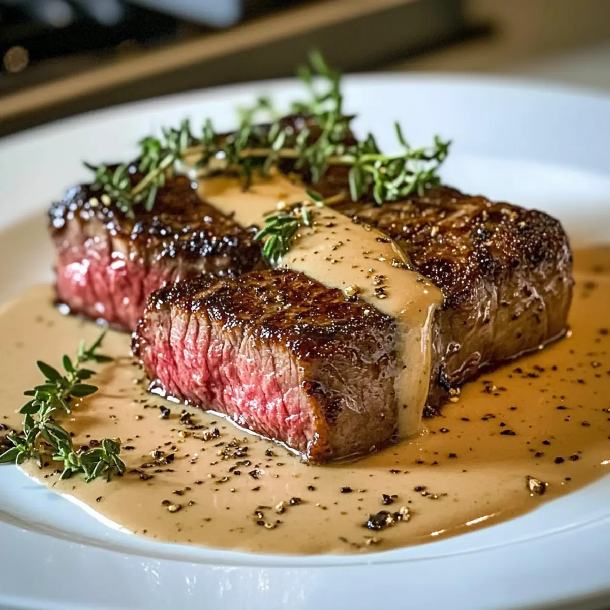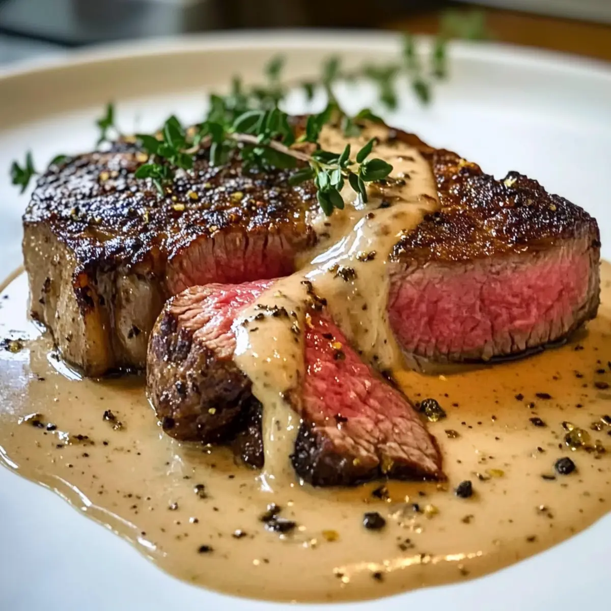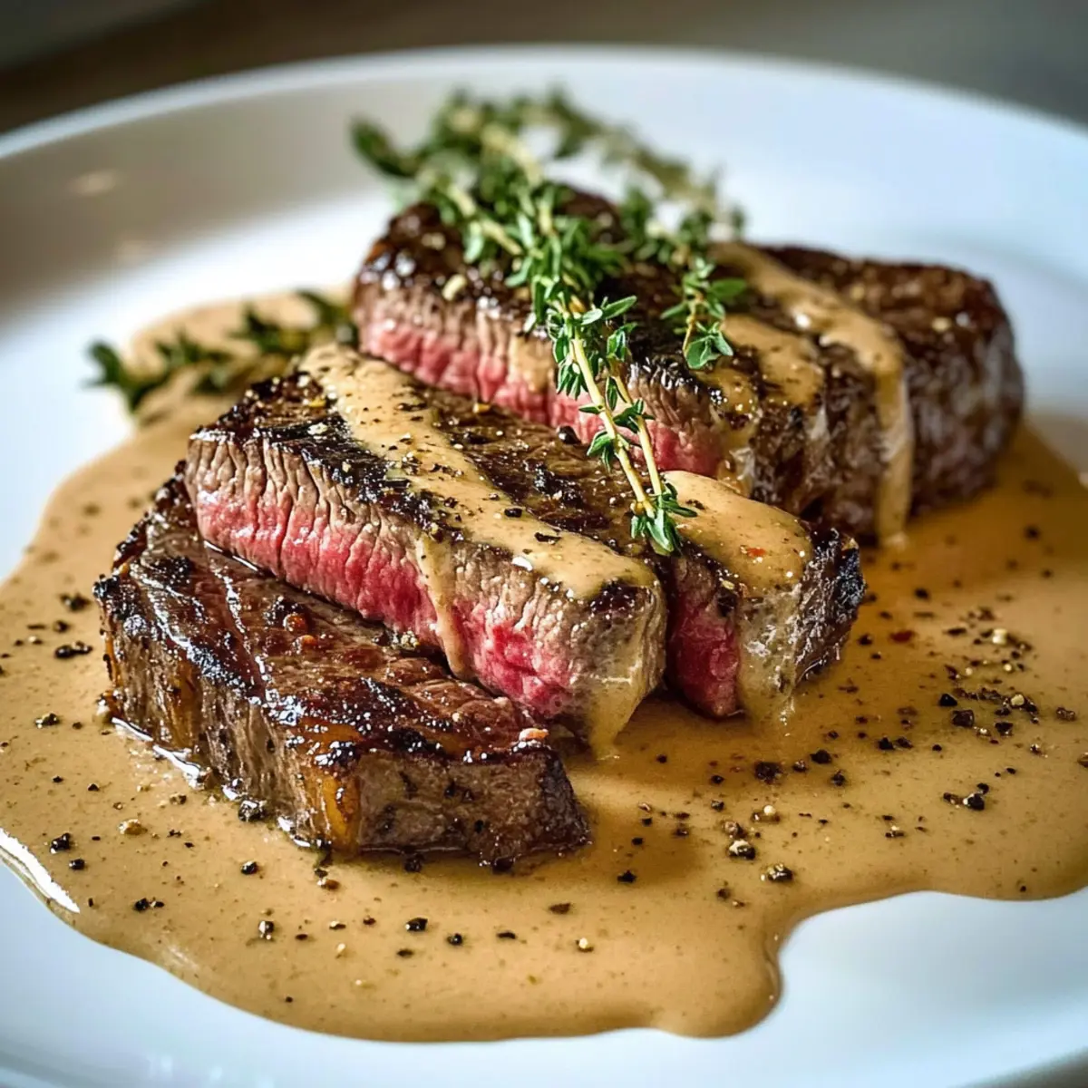 Das Sizzling und der verführerische Duft von frisch gebratenem Fleisch – wenn ich das höre, beginne ich sofort zu träumen von einem wirklich großartigen Gericht: Scharf gebratenes Steak mit Cognac-Sahnesauce. Dieses Rezept kombiniert die Einfachheit einer schnellen Zubereitung mit dem Hauch von Luxus, den wir uns alle hin und wieder gönnen sollten. Die Zubereitung eines perfekt gegarten Steaks, umhüllt von einer cremigen und aromatischen Sauce, lässt mich nicht nur das Chaos des Alltags vergessen, sondern zaubert auch ein Stück gehobene französische Küche auf unseren Tisch. Egal, ob für ein romantisches Dinner oder einen besonderen Anlass – dieses Gericht begeistert jeden. Sind Sie bereit, Ihre Gäste (oder sich selbst) mit einem unvergesslichen Geschmackserlebnis zu verwöhnen? Lassen Sie uns die Kochschürze schnappen und loslegen! Warum wird dieses Steak Sie verführen? Einfachheit lehren: Die Zubereitung ist unkompliziert und erfordert keine speziellen Kochkünste – perfekt für alle, die sich an ein gehobenes Gericht wagen möchten. Reichhaltiger Geschmack: Die Kombination aus saftigem Steak und der cremigen Cognac-Sahnesauce sorgt für ein Geschmackserlebnis, das jedes Restaurant mühelos übertrifft. Ideale für jeden Anlass: Ob für ein romantisches Dinner oder ein festliches Essen mit Freunden – dieses Gericht zieht alle in seinen Bann. Kreative Vielseitigkeit: Sie können das Steak mit verschiedenen Beilagen kombinieren, sodass es immer wieder neu interpretiert werden kann. Experimentieren Sie auch mit Variationen wie Scharfe Knoblauch Rindersteak oder genießen Sie es mit einem frischen Salat! Zeitersparnis: Trotz seiner luxuriösen Erscheinung ist dieses Rezept schnell zubereitet – Ihr Abendessen ist in kürzester Zeit auf dem Tisch! Scharf gebratenes Steak Zutaten • Entdecken Sie die besten Zutaten für Ihr perfektes Steak. Für das Steak Ribeye oder New York Strip Steaks – Wählen Sie hochwertige Cuts für den besten Geschmack und die zarte Zubereitung. Koshersalz – Verstärkt die natürlichen Aromen des Steaks. Frisch gemahlener schwarzer Pfeffer – Für zusätzlichen Geschmack und eine würzige Kruste. Neutrales Öl (z.B. Raps- oder Traubenkernöl) – Ideal zum Anbraten, um eine goldbraune Kruste zu erreichen. Ungesalzene Butter – Fügt eine reiche Tiefe hinzu, während das Steak gebraten wird. Für die Sauce Knoblauch (zerdrückt) – Verleiht dem Steak und der Sauce ein aromatisches Aroma. Frischer Thymian – Hebt das Geschmackserlebnis der Sauce hervor. Cognac oder Brandy – Essenziell für die Sauce und sorgt für eine geschmackliche Tiefe; Bourbon oder Weißwein sind mögliche Alternativen, können aber den Geschmack verändern. Schlagsahne – Sorgt für die cremige und luxuriöse Textur der Sauce. Dijon Senf – Fügt eine pikante Komponente hinzu und verstärkt den Geschmack der Sauce. Zerstoßene schwarze Pfefferkörner – Für mehr Textur und einen extra würzigen Kick. Garnierung Frische Thymianzweige – Perfekt zur Verschönerung des Gerichts und für einen frischen, kräuterigen Geschmack. Zerstoßener Pfeffer (für die Garnierung) – Eine optionale Garnierung für zusätzlichen Geschmack. Flockiges Meersalz (optional) – Ideal zum Verfeinern der Aromen. Bereiten Sie sich auf ein unvergessliches kulinarisches Erlebnis vor – mit diesem scharf gebratenen Steak gelingt Ihnen jedes Dinner! Schritt-für-Schritt-Anleitung für Scharf gebratenes Steak mit Cognac-Sahnesauce Step 1: Steaks vorbereiten Tupfen Sie die Ribeye- oder New York Strip Steaks gründlich mit einem Küchentuch trocken und würzen Sie sie großzügig mit Koshersalz und frisch gemahlenem schwarzem Pfeffer. Lassen Sie die gewürzten Steaks etwa 30–45 Minuten bei Raumtemperatur ruhen, damit sie gleichmäßiger garen. Diese Pause ist entscheidend, um ein perfekt zartes scharf gebratenes Steak zu erhalten. Step 2: Steaks anbraten Erhitzen Sie eine gusseiserne Pfanne auf hoher Stufe, bis sie rauchend heiß ist. Geben Sie etwas neutrales Öl (wie Rapsöl) hinzu, um die Fläche gut zu bedecken. Legen Sie die Steaks vorsichtig in die Pfanne und braten Sie sie ungestört 2–3 Minuten auf jeder Seite an, bis eine goldbraune Kruste entsteht. Dies sorgt für den charakteristischen Geschmack und die Textur des scharf gebratenen Steaks. Step 3: Steaks basten Fügen Sie ungesalzene Butter, zerdrückten Knoblauch und frischen Thymian in die Pfanne hinzu. Kippen Sie die Pfanne leicht und verwenden Sie einen Löffel, um die geschmolzene Butter über die Steaks zu löffeln. Basten Sie die Steaks für etwa 3–5 Minuten, bis sie eine interne Temperatur von 130°F (54°C) für medium-rare erreichen. So wird jedes Stück saftig und aromatisch. Step 4: Steaks ruhen lassen Nehmen Sie die Steaks aus der Pfanne und legen Sie sie auf ein Schneidebrett. Lassen Sie sie 5–10 Minuten ruhen, damit sich die Säfte gleichmäßig verteilen können. Dieses Ruhen ist entscheidend, um ein schmackhaftes und saftiges Ergebnis zu erzielen, das bei jedem Biss überzeugt. Step 5: Sauce zubereiten Gießen Sie das überschüssige Fett aus der Pfanne ab und stellen Sie die Hitze auf mittlere Stufe. Fügen Sie den Cognac hinzu, um die Pfanne abzulöschen und die aromatischen Rückstände zu lösen. Rühren Sie Dijon-Senf und zerstoßene schwarze Pfefferkörner ein und lassen Sie die Mischung 3–5 Minuten sanft köcheln, bis die Sauce etwas eingedickt ist und eine cremige Konsistenz aufweist. Step 6: Servieren Schneiden Sie die Steaks gegen die Faser in dünne Scheiben und richten Sie diese auf einem Teller an. Löffeln Sie reichlich von der Cognac-Sahnesauce über das Steak und garnieren Sie es optional mit frischen Thymianzweigen und zerstoßenem Pfeffer. Servieren Sie das Gericht heiß und genießen Sie die Kombination aus einem perfekten scharf gebratenen Steak und der luxuriösen Sauce. Vorbereitung für Scharf gebratenes Steak mit Cognac-Sahnesauce Dieses scharf gebratene Steak mit Cognac-Sahne
