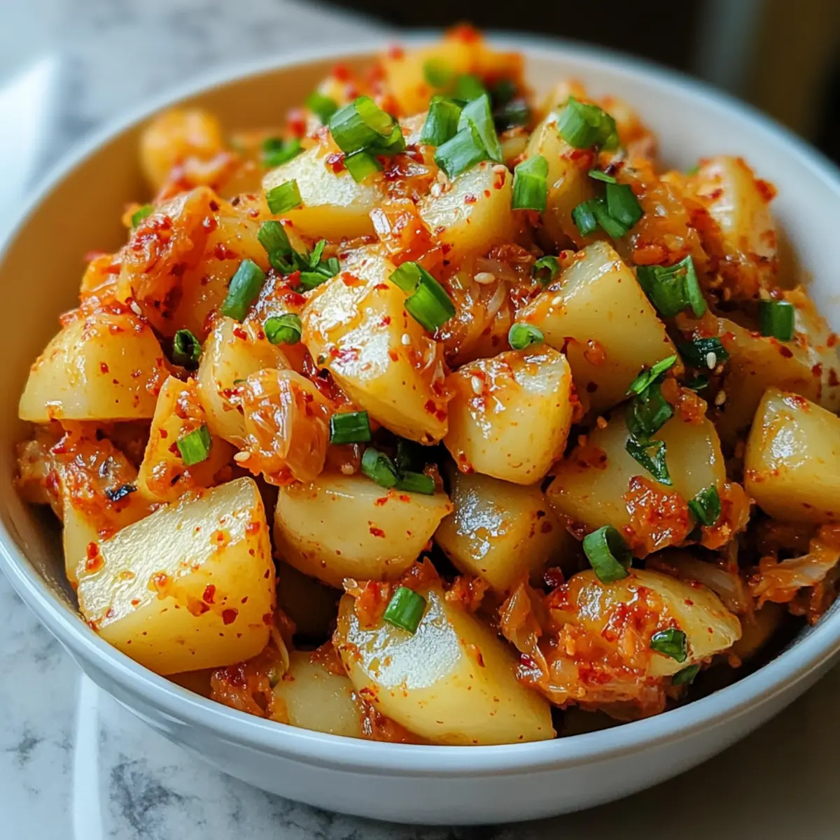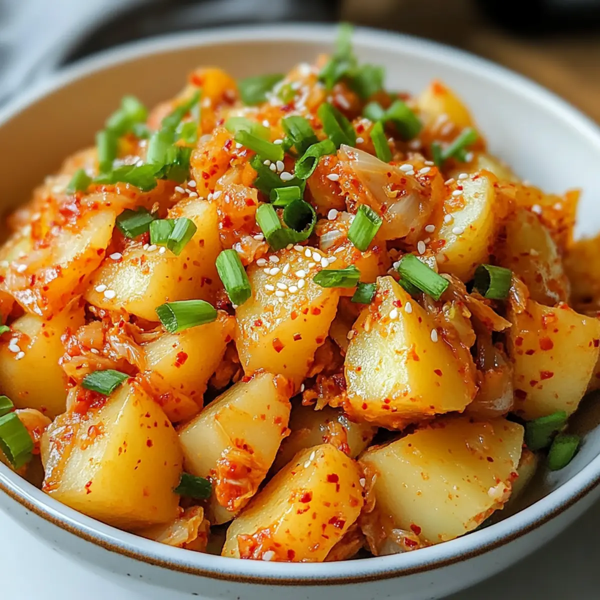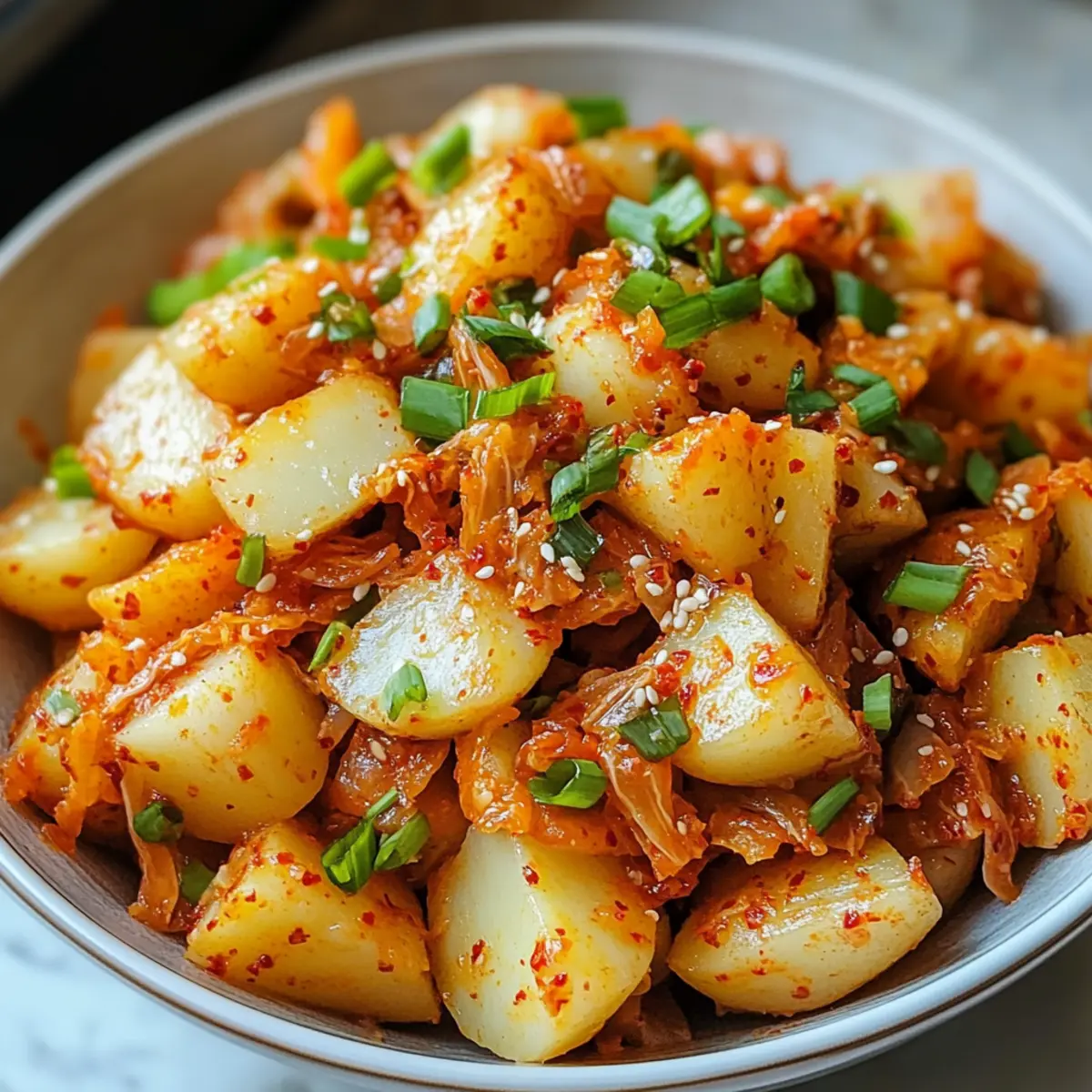 Der Duft von frisch gekochten Kartoffeln und scharfer Paprika zieht durch die Küche und weckt heitere Erinnerungen an fröhliche Grillabende mit Freunden. Unser Rezept für einen scharfen Kimchi Kartoffelsalat vereint die cremigen Yukon Gold Kartoffeln mit der knackigen Würze von klassischem Kimchi und einem zusätzlichen Kick durch Gochujang. Diese einfache und köstliche Beilage sorgt nicht nur für Beißen von Geschmacksexplosionen, sondern hat auch einen gesundheitlichen Bonus durch die Probiotika im Kimchi! Ideal für BBQs, Picknicks oder sogar für eine aufregende Abwechslung im Alltag – dieser Salat wird garantiert zum Star jeder Feierlichkeit. Was hältst du von einer geschmackvollen Reise in die koreanische Küche? Warum wirst du diesen Salat lieben? Einfachheit des Rezepts: Die Zubereitung ist unkompliziert und benötigt nur wenige Schritte, die selbst Anfänger mühelos meistern können. Würzige Geschmacksexplosion: Die Kombination aus cremigen Kartoffeln, würzigem Kimchi und dem feurigen Gochujang sorgt für einen einzigartigen, unvergesslichen Geschmack. Vielseitig einsetzbar: Dieser Salat ist nicht nur perfekt für BBQs, sondern auch ein aufregender Begleiter zu vielen Gerichten. Gesundheitsvorteil: Dank der Probiotika im Kimchi unterstützt der Salat die Verdauung und sorgt für Wohlergehen. Beeindruckend für Gäste: Serviere ihn bei deinem nächsten Picknick oder Grillabend und mache Eindruck mit einem asiatischen Twist auf den klassischen Kartoffelsalat. Scharfer Kimchi Kartoffelsalat Zutaten Für den Salat Yukon Gold Kartoffeln – sorgen für Cremigkeit und eine perfekte Struktur; verwende wachsende Sorten für die beste Textur. Napa-Kohl Kimchi – fügt Würze und knackigen Biss hinzu; wähle eine klassische Sorte für Authentizität. Frühlingszwiebeln – bringen Frische und einen milden Zwiebelgeschmack; sie können durch Schnittlauch ersetzt werden. Für das Dressing Mayonnaise – verleiht der Mischung Cremigkeit; griechischer Joghurt ist eine kalorienärmere Alternative. Gochujang – gibt dem Salat seine Schärfe und Umami-Geschmack; passe die Menge je nach deinem Schärfewunsch an. Dijon-Senf – sorgt für eine angenehme Säure im Dressing; du kannst auch gelben Senf verwenden. Sesamöl – intensiviert den Geschmack mit nussigen Noten; ist optional, wird aber empfohlen. Salz & schwarzer Pfeffer – zum Abschmecken nach deinem Geschmack. Bewahre dieses Rezept für den scharfen Kimchi Kartoffelsalat sicher auf und finde heraus, wie einfach es ist, ein bisschen koreanische Würze in deinen Alltag zu bringen! Schritt-für-Schritt-Anleitung für den Scharfen Kimchi Kartoffelsalat Step 1: Kartoffeln kochen Die Yukon Gold Kartoffeln ungeschält in einem großen Topf mit Salzwasser zum Kochen bringen und etwa 15-20 Minuten kochen, bis sie mit einer Gabel zart sind. Achte darauf, dass sie nicht zu weich werden. Nach dem Kochen die Kartoffeln abgießen und etwas abkühlen lassen, bevor du sie halbierst, schälst und in kleine Würfel schneidest. Step 2: Dressing zubereiten In einer großen Schüssel die Mayonnaise, Gochujang, Dijon-Senf und das Sesamöl gut vermengen. Rühre kräftig, bis eine glatte, cremige Konsistenz entsteht. Diese Mischung ist die geschmackvolle Basis für deinen scharfen Kimchi Kartoffelsalat und sorgt für die nötige Cremigkeit, um die Kartoffeln perfekt zu umhüllen. Step 3: Gemüse hinzufügen Füge das Napa-Kimchi und die gehackten Frühlingszwiebeln zur Dressing-Mischung hinzu. Rühre alles vorsichtig um, bis das Gemüse gleichmäßig verteilt ist. Achte darauf, dass das Kimchi in die Sauce eingearbeitet wird, um den Geschmack des Salats zu intensivieren und eine köstliche Würze zu bringen. Step 4: Kartoffeln einarbeiten Jetzt kommen die gewürfelten Kartoffeln dazu. Vorsichtig unter das Dressing heben, bis alle Kartoffelstücke gleichmäßig mit der cremigen Mischung bedeckt sind. Dies sorgt dafür, dass jeder Bissen deines scharfen Kimchi Kartoffelsalats voller Geschmack ist. Nach Belieben mit Salz und Pfeffer abschmecken. Step 5: Kühlen und Servieren Den Salat abdecken und mindestens eine Stunde im Kühlschrank kalt stellen, um die Aromen gut durchziehen zu lassen. Ideal ist es, ihn über Nacht ziehen zu lassen, damit sich die Geschmacksexplosionen noch besser entfalten können. Vor dem Servieren noch einmal gut umrühren; dein scharfer Kimchi Kartoffelsalat ist nun bereit für das BBQ oder ein festliches Essen! Aufbewahrungstipps für Scharfen Kimchi Kartoffelsalat Kühlschrank: Bewahre den Salat in einem luftdichten Behälter auf, um die Frische und den Geschmack für bis zu 3-5 Tage zu erhalten. Gefrierschrank: Du kannst den Scharfen Kimchi Kartoffelsalat auch bis zu 2 Monate einfrieren. Stelle sicher, dass er in einem geeigneten Behälter gut verpackt ist, um Gefrierbrand zu vermeiden. Auftauen: Um die beste Textur und den besten Geschmack zu gewährleisten, lass den Salat über Nacht im Kühlschrank auftauen, bevor du ihn servierst. Wiedererwärmen: Diese Salatbeilage wird am besten kalt serviert, aber wenn du ihn aufwärmen möchtest, erwärme ihn vorsichtig in der Mikrowelle, um die Cremigkeit nicht zu verlieren. Expertentipps für den Scharfen Kimchi Kartoffelsalat Kartoffeln richtig kochen: Achte darauf, die Kartoffeln nicht zu lange zu kochen, damit sie fest bleiben und nicht zerfallen. Gochujang dosieren: Fange mit einer kleinen Menge Gochujang an und taste dich langsam an deinen bevorzugten Schärfegrad heran, um das perfekte Gleichgewicht zu finden. Kombinationen probieren: Nutze die Gelegenheit, um mit verschiedenen Gemüsesorten zu experimentieren. Zusätzliche Paprika oder Gurke bringen eine erfrischende Note in deinen scharfen Kimchi Kartoffelsalat. Vorbereitung ist alles: Bereite den Salat idealerweise einen Tag im Voraus zu, damit die Aromen gut durchziehen können – so schmeckt er gleich noch besser! Vegetarische Option: Wenn du veganen Gästen dienen möchtest, ersetze die Mayonnaise durch eine pflanzli