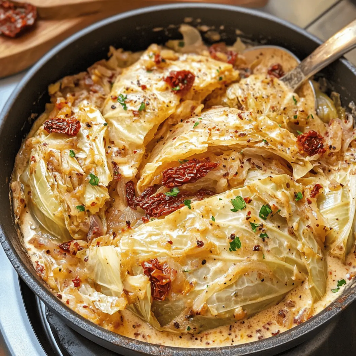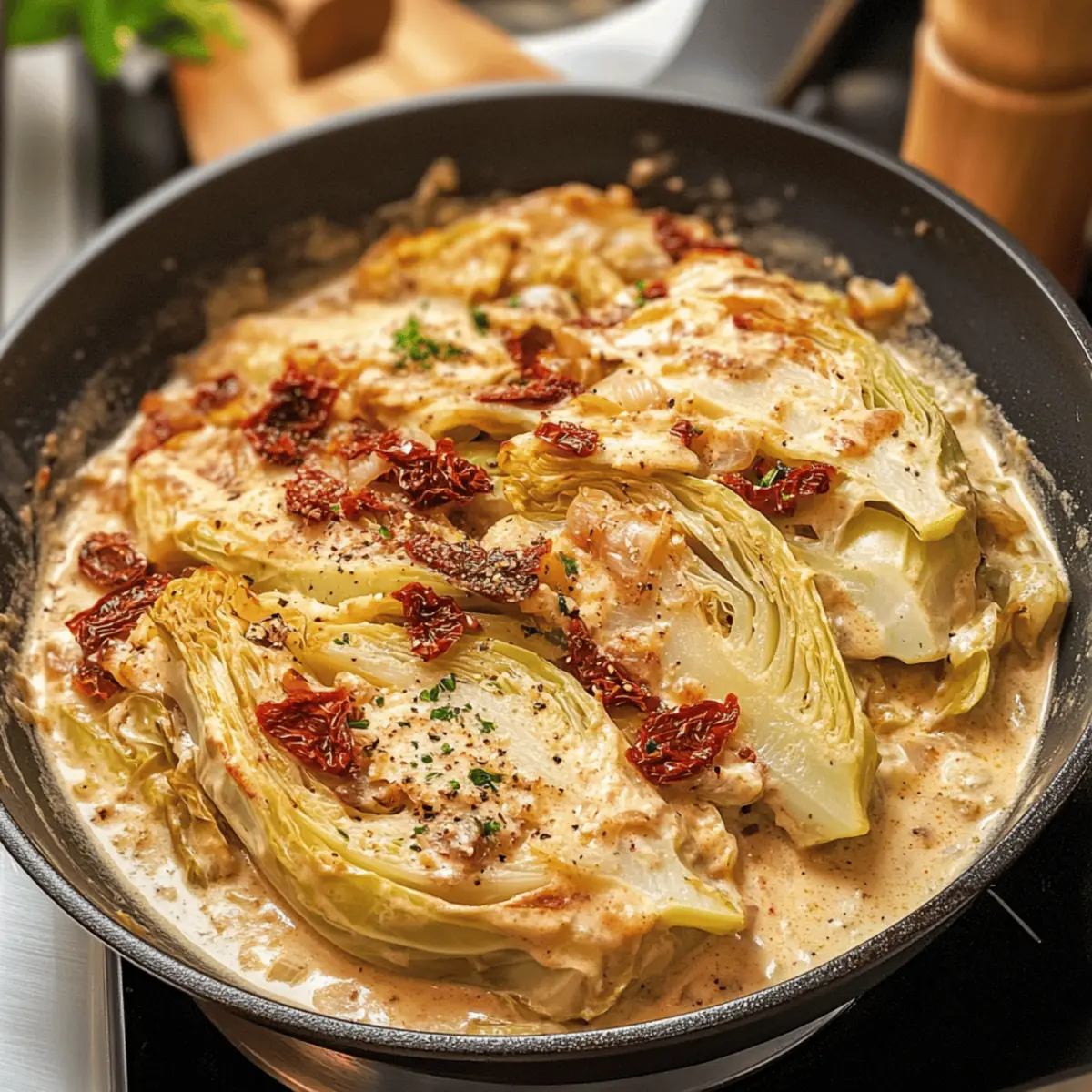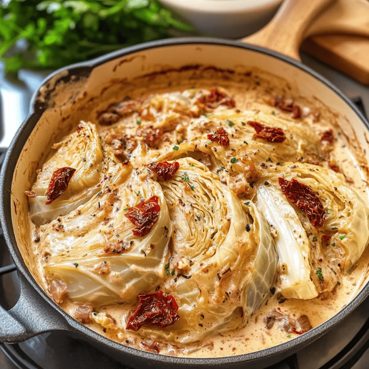 Als der Duft von frisch gebratenem Gemüse durch meine Küche zog, wusste ich sofort, dass dies der perfekte Moment für mein nächstes kulinarisches Abenteuer war: Marry Me Melting Cabbage mit cremiger Toskanasauce. Diese Kombination aus zartem, karamellisiertem Kohl und einer reichhaltigen, aromatischen Sauce ist nicht nur ein Genuss für die Sinne, sondern auch ein unkompliziertes Gericht, das in einer einzigen Pfanne zubereitet wird. Ideal für alle, die sich nach etwas Hausgemachtem sehnen, bietet dieses Rezept eine gesunde Alternative zu Fast Food und verwandelt Grünkohl in ein echtes Geschmackserlebnis. Sind Sie bereit, Ihre Lieben mit dieser überraschend einfachen, aber beeindruckenden Köstlichkeit zu verwöhnen? Warum werden Sie dieses Rezept lieben? Einzigartig und köstlich: Diese Kombination aus zartem Kohl und cremiger Toskanasauce ist ein absoluter Gaumenschmaus. Einfache Zubereitung: Mit nur einer Pfanne zubereitet, ist es ideal für viel beschäftigte Tage und spart Ihnen Zeit beim Aufräumen. Vielfältig: Ob als Beilage oder Hauptgericht – passen Sie das Rezept leicht an, zum Beispiel mit dem Austausch von Hühnerbrühe gegen Gemüsebrühe für eine vegetarische Version. Himmlischer Geschmack: Die reichhaltigen Aromen von Sonnengetrockneten Tomaten und Parmesan machen jedes Bissen zu einem kleinen Fest der Sinne. Gesundheitlich und befriedigend: Schlemmen Sie ohne schlechtes Gewissen – dieses Rezept bietet eine gesunde Alternative zu Fast Food. Zutaten für Schmelzenden Kohlsalat • Diese köstlichen Zutaten machen das Rezept zu einem besonderen Genuss! Für den Kohl Grünkohl – Die Hauptzutat, in Wedges geschnitten, sorgt für zarte Schmelztextur. Olivenöl – Zum Anbraten des Kohls, verstärkt den Geschmack und hilft beim Bräunen. Butter – Fügt Reichtum hinzu; kann für eine milchfreie Version durch mehr Olivenöl ersetzt werden. Rote Zwiebel – Sorgt für Süße und geschmackliche Tiefe; bei Bedarf durch Schalotten ersetzen. Knoblauch – Verleiht aromatischen Geschmack; unbedingt fein hacken für gleichmäßige Verteilung. Für die Sauce Niedrig-Natrium Hühnerbrühe – Spendet Feuchtigkeit und Geschmack; verwenden Sie Gemüsebrühe für eine vegetarische Option. Frischkäse – Sorgt für cremige Reichhaltigkeit und verdickt die Sauce; kann durch pflanzlichen Frischkäse ersetzt werden. Schlagsahne – Trägt zur reichen, cremigen Textur bei; milchfreie Alternativen wie Kokoscreme sind ebenfalls möglich. Sonnengetrocknete Tomaten in Öl – Steigern den Geschmack der Sauce mit einer würzigen Note; frische Tomaten können im Notfall verwendet werden. Getrockneter Oregano, Thymian und Rosmarin – Kräuter für Geschmackskomplexität; frische Kräuter können in größeren Mengen verwendet werden. Salz und schwarzer Pfeffer – Wesentlich für die Würze; nach Geschmack anpassen. Rote Pfefferflocken (optional) – Für eine leichte Schärfe; nach Belieben weglassen. Geriebener Parmesan – Der krönende Abschluss für Geschmack und Textur; verwenden Sie bei Bedarf eine vegane Käsealternative. Frisch gehackte Petersilie – Für Garnierung und Frische; optional, aber empfohlen. Schritt-für-Schritt-Anleitung für Schmelzenden Kohlsalat mit cremiger Toscansauce Schritt 1: Ofen vorheizen Heizen Sie den Ofen auf 190°C vor. Diese Temperatur ist ideal, um den Kohl gleichmäßig zu garen und die Aromen der cremigen Toskanasauce zu intensivieren. Während der Ofen aufheizt, können Sie sich um die Vorbereitung der anderen Zutaten kümmern. Schritt 2: Kohl vorbereiten Schneiden Sie den Grünkohl in 8 Wedges und lassen Sie den Kern intakt. Dadurch bleibt der Kohl während des Kochens zusammen und perfekt zart. Die Wedges sollten gleichmäßig sein, damit sie gleichmäßig garen und köstlich schmelzen. Schritt 3: Kohl anbraten Erhitzen Sie Olivenöl in einer gusseisernen Pfanne bei mittlerer bis hoher Hitze. Fügen Sie die Kohlwedges hinzu und braten Sie sie 2-3 Minuten pro Seite, bis sie goldbraun sind. Diese Bräunung gibt zusätzlichen Geschmack und sorgt für eine schöne Textur in Ihrem Schmelzenden Kohlsalat. Schritt 4: Zwiebeln und Knoblauch anbraten Reduzieren Sie die Hitze und fügen Sie die Butter in die Pfanne hinzu. Sobald die Butter geschmolzen ist, geben Sie die rote Zwiebel hinzu und braten Sie sie, bis sie weich und leicht karamellisiert ist. Fügen Sie den gehackten Knoblauch hinzu und braten Sie ihn kurz mit, bis er aromatisch ist. Schritt 5: Brühe hinzufügen Löschen Sie die Mischung mit der Niedrig-Natrium Hühnerbrühe ab, indem Sie kräftig den Boden der Pfanne abkratzen, um die angebratenen Stücke zu lösen. Rühren Sie den Frischkäse ein, bis er vollständig geschmolzen und die Sauce glatt ist. Diese Mischung wird eine cremige Grundlage für Ihren Schmelzenden Kohlsalat bilden. Schritt 6: Sauce verfeinern Rühren Sie die Schlagsahne, die Sonnengetrockneten Tomaten, die Kräuter, Salz, schwarzen Pfeffer und die optionalen roten Pfefferflocken in die Sauce ein. Lassen Sie die Mischung bei geringer Hitze köcheln, bis sie leicht eingedickt ist, was etwa 5-7 Minuten dauern sollte. Dies verbessert die Konsistenz und die Aromen intensivieren sich. Schritt 7: Kohl in die Sauce legen Fügen Sie den geriebenen Parmesan hinzu und rühren Sie, bis er geschmolzen ist. Legen Sie die vorbereiteten Kohlwedges vorsichtig in die Sauce und löffeln Sie etwas Sauce über den Kohl. So wird jede Wedge gut mit der cremigen Toskanasauce umhüllt und erhält den vollen Geschmack. Schritt 8: Backen Decken Sie die Pfanne mit Alufolie ab und backen Sie das Ganze 45 Minuten lang im vorgeheizten Ofen. Nehmen Sie die Folie dann ab, beträufeln Sie den Kohl mit der Sauce und backen Sie weitere 15-20 Minuten, bis der Kohl gabelzart ist. Diese Backzeit sorgt dafür, dass der Kohl perfekt gegart ist und die Aromen sich miteinander verbinden. Schritt 9: Anrichten und servieren Lassen Sie den Schmelzenden Kohlsalat nach dem Backen 5 Minuten ruhen. Garnieren Sie ihn