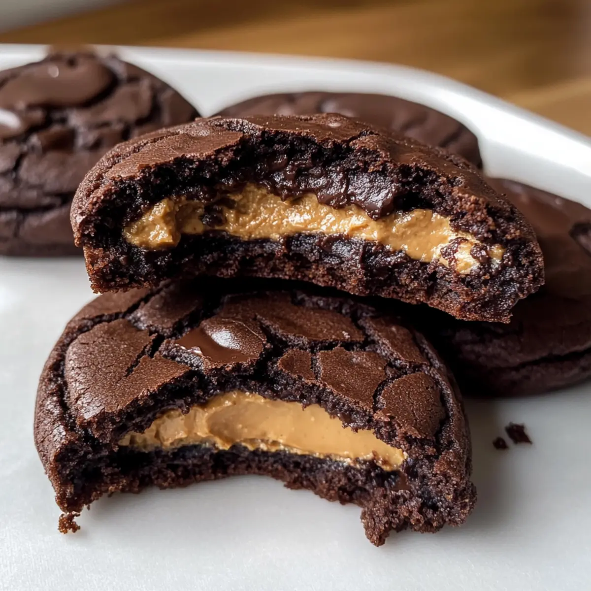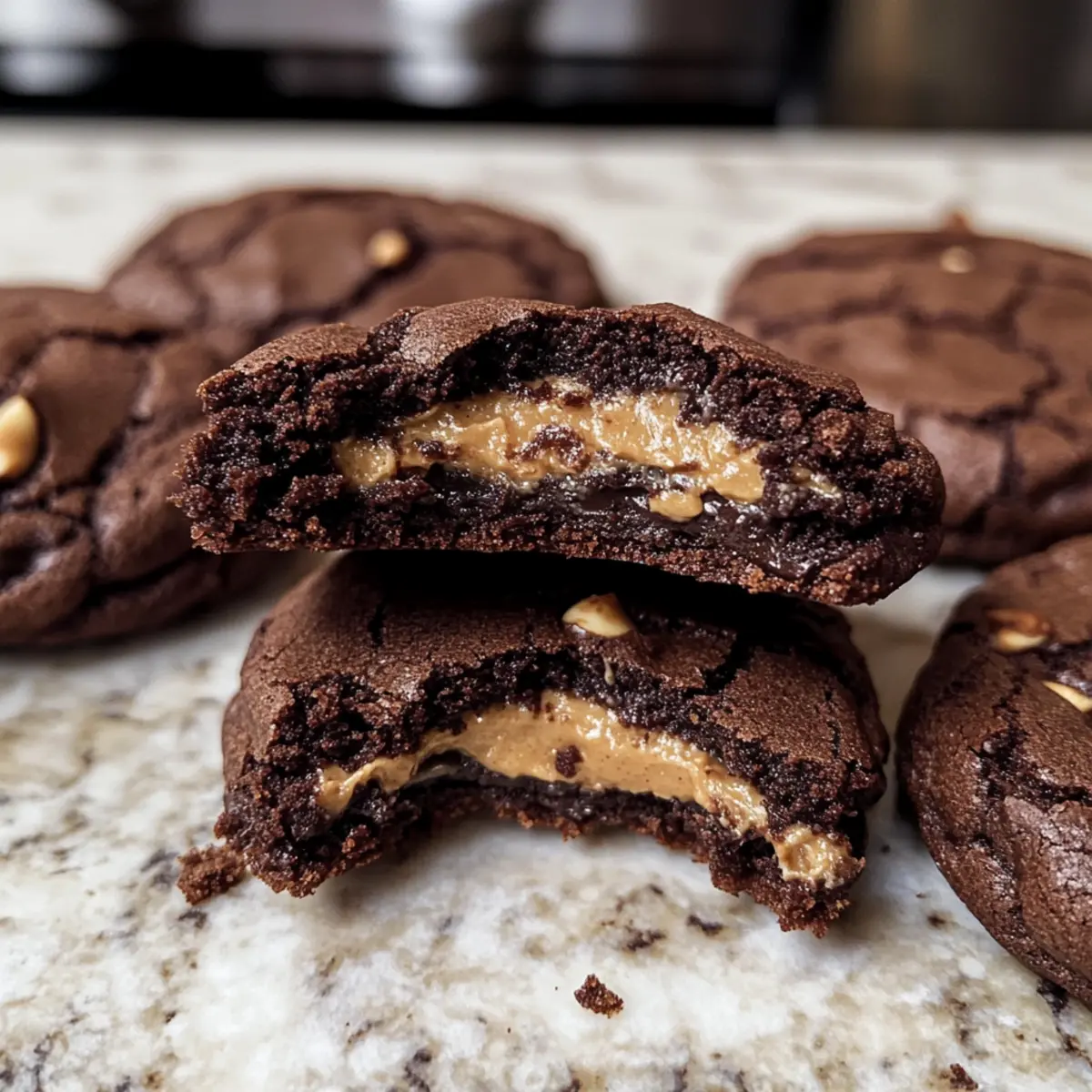 Eines Nachmittags, während ich in der Küche experimentierte, hatte ich diese grandiose Idee, die meine Geschmacksknospen völlig überwältigte. Die Kombination aus Schokolade und Erdnussbutter ist einfach unwiderstehlich, und genau das wird in meinen Schokoladen-Erdnussbutter gefüllten Keksen lebendig. Jeder Biss eines dieser Kekse enthüllt eine köstliche Erdnussbutterfüllung, perfekt umhüllt von einem weichen, schokoladigen Teig. Diese Kekse sind nicht nur ein wahrer Genuss, sondern auch schnell zubereitet und sicher ein Hit bei jedem Kaffeeklatsch oder Familientreffen. Bei der nächsten Gelegenheit – vielleicht für einen Besuch oder ein gemütliches Zuhause – solltest du diese süße Verführung unbedingt probieren! Welche Geheimnisse du vielleicht noch entdecken könntest, wirst du gleich erfahren! Warum sind diese Kekse unwiderstehlich? Einzigartige Kombination: Die Kombination aus reichhaltiger Schokolade und cremiger Erdnussbutter sorgt für ein Geschmackserlebnis, das man einfach lieben muss. Einfach und schnell: Die Zubereitung erfordert keine komplizierten Techniken – perfekt für jeden, der Lust auf etwas Selbstgemachtes hat. Vielseitige Variationen: Mit ein paar einfachen Änderungen kannst du die Füllung variieren, zum Beispiel mit Mandelbutter oder sogar Nutella. Perfekt für jede Gelegenheit: Ob für einen Kaffeeklatsch mit Freunden oder gemütliche Abende mit der Familie – diese Kekse sind immer ein Hit! Nach dem Genuss fühlst du dich sofort zufrieden, was diese Kekse zu einem idealen Dessert macht. Probiere auch meine Linsensuppe Mit Zitrone für eine herzhaft gesunde Option! Schokoladen-Erdnussbutter gefüllte Kekse Zutaten • Hier sind die Zutaten, die du für diese köstlichen Kekse benötigst. Für die Füllung Erdnussbutter – Cremige JIF oder Skippy sorgt für die reichhaltige Füllung; kannst auch Mandelbutter für eine interessante Wendung verwenden. Puderzucker – Fügt der Füllung Süße hinzu; stelle sicher, dass er gesiebt ist, um Klumpen zu vermeiden. Gemahlener Zimt – Verstärkt den Geschmack der Erdnussbutterfüllung; kann bei Bedarf weggelassen werden. Für den Keks Mehl – Schafft die Struktur der Kekse; löffle und leve das Mehl beim Messen, um Kompaktierung zu vermeiden. Dutch Process Kakaopulver – Sorgt für einen tiefen Schokoladengeschmack; kann durch ungesüßtes Kakaopulver ersetzt werden. Backnatron – Wirkt als Treibmittel für eine leichtere Textur. Salz – Balanciert die Süße; unverzichtbar für die Geschmackssteigerung. Ungesalzene Butter – Fügt Reichhaltigkeit hinzu; sollte geschmolzen werden; Margarine ist hier nicht empfehlenswert. Brauner Zucker – Sorgt für Feuchtigkeit und einen Melassegeschmack; du kannst hellen oder dunklen braunen Zucker verwenden. Kristallzucker – Fügt Süße hinzu; balanciert den Melassegeschmack des braunen Zuckers. Reines Vanilleextrakt – Verleiht Wärme und Tiefe; verwende reine Vanille für den besten Geschmack. Große Eier – Binden die Zutaten und tragen zur Textur bei; achte darauf, dass sie Zimmertemperatur haben. Halbsüße Schokoladenstückchen – Fügen zusätzlichen Schokoladengeschmack hinzu; können durch Zartbitterschokolade ersetzt werden. Schritt-für-Schritt-Anleitung für Schokoladen-Erdnussbutter gefüllte Kekse Step 1: Erdnussbutterfüllung vorbereiten Erwärme in einer mikrowellengeeigneten Schüssel die Erdnussbutter für etwa 20-30 Sekunden, bis sie leicht Flüssig wird. Mische gesiebten Puderzucker und gemahlenen Zimt gründlich unter, bis eine glatte Masse entsteht. Verwende einen Teelöffel, um 20 kleine Portionen auf Wachspapier zu formen und stelle sie für 1 Stunde in das Gefrierfach, damit sie fest werden. Step 2: Trockene Zutaten mischen Sifte in einer großen Schüssel das Mehl, das Kakaopulver, das Backnatron und das Salz zusammen. Achte darauf, alles gut zu vermengen, um Klumpen zu vermeiden und eine gleichmäßige Mischung zu erzielen. Dies sorgt für eine optimale Textur deiner Schokoladen-Erdnussbutter gefüllten Kekse, die gleichmäßig aufgeht und gut aussieht. Step 3: Feuchte Zutaten kombinieren In einer separaten Schüssel gib die geschmolzene Butter, den braunen Zucker, den Kristallzucker, das Vanilleextrakt und die Zimmertemperatur-Eier hinzu. Mit einem Schneebesen verrühre die Mischung gut für etwa 1-2 Minuten, bis sie schön glatt und cremig ist. Diese feuchten Zutaten sind entscheidend für den Geschmack und die Textur der Kekse. Step 4: Mischungen kombinieren Falte langsam die trockenen Zutaten in die feuchten Zutaten, bis sie gerade so vermischt sind. Achte darauf, nicht zu übermixen, um die Chewy-Textur der Schokoladen-Erdnussbutter gefüllten Kekse zu bewahren. Rühre nun die halbsüßen Schokoladenstückchen vorsichtig unter, um eine zusätzliche Schokoladen-Note einzubringen. Step 5: Kekse formen Verwende einen Esslöffel oder einen 2-TBSP-Keksausstecher, um gleich große Portionen des Teigs auf ein Backblech zu setzen. Drücke die Teigportion leicht flach und forme eine Mulde in der Mitte. Platziere einen gefrorenen Erdnussbutterdollop in der Mulde und decke ihn mit etwas Teig ab, sodass die Füllung vollständig umschlossen ist. Step 6: Backen Heize den Ofen auf 175°C (350°F) vor und lege ein Backblech mit Backpapier aus. Platziere die geformten Kekse mit genügend Abstand auf dem Blech. Backe die Kekse für 13 bis 15 Minuten, bis sie am Rand fest, aber in der Mitte noch etwas weich sind. Lass sie nach dem Backen 5 Minuten auf dem Blech auskühlen, bevor du sie auf ein Kuchengitter zur vollständigen Abkühlung legst. Was passt zu Schokoladen-Erdnussbutter gefüllten Keksen? Genieße ein rundum köstliches Erlebnis mit diesen unwiderstehlichen Keksen, die deine Sinne verwöhnen werden. Kalte Milch: Die Süße der Kekse harmoniert perfekt mit einem Glas kalter Milch, die die cremige Erdnussbutterfüllung abrundet. Schokoladeneiscreme: Eine Kugel Schokoladeneis verleiht dem Dessert zusätzlichen Genuss. Die Kombinat