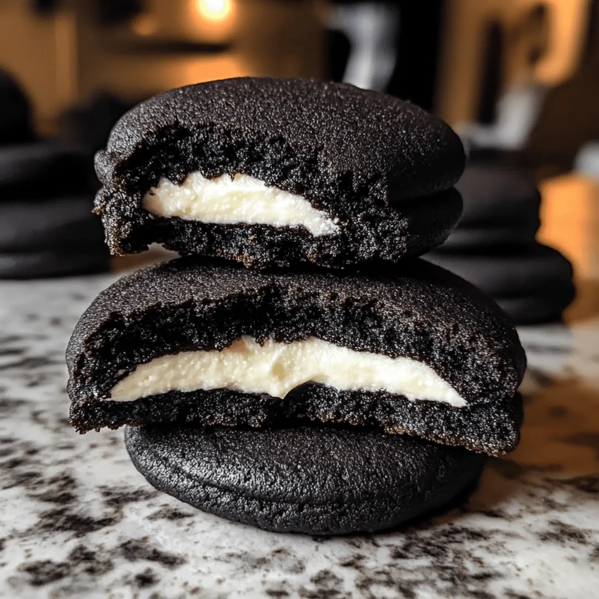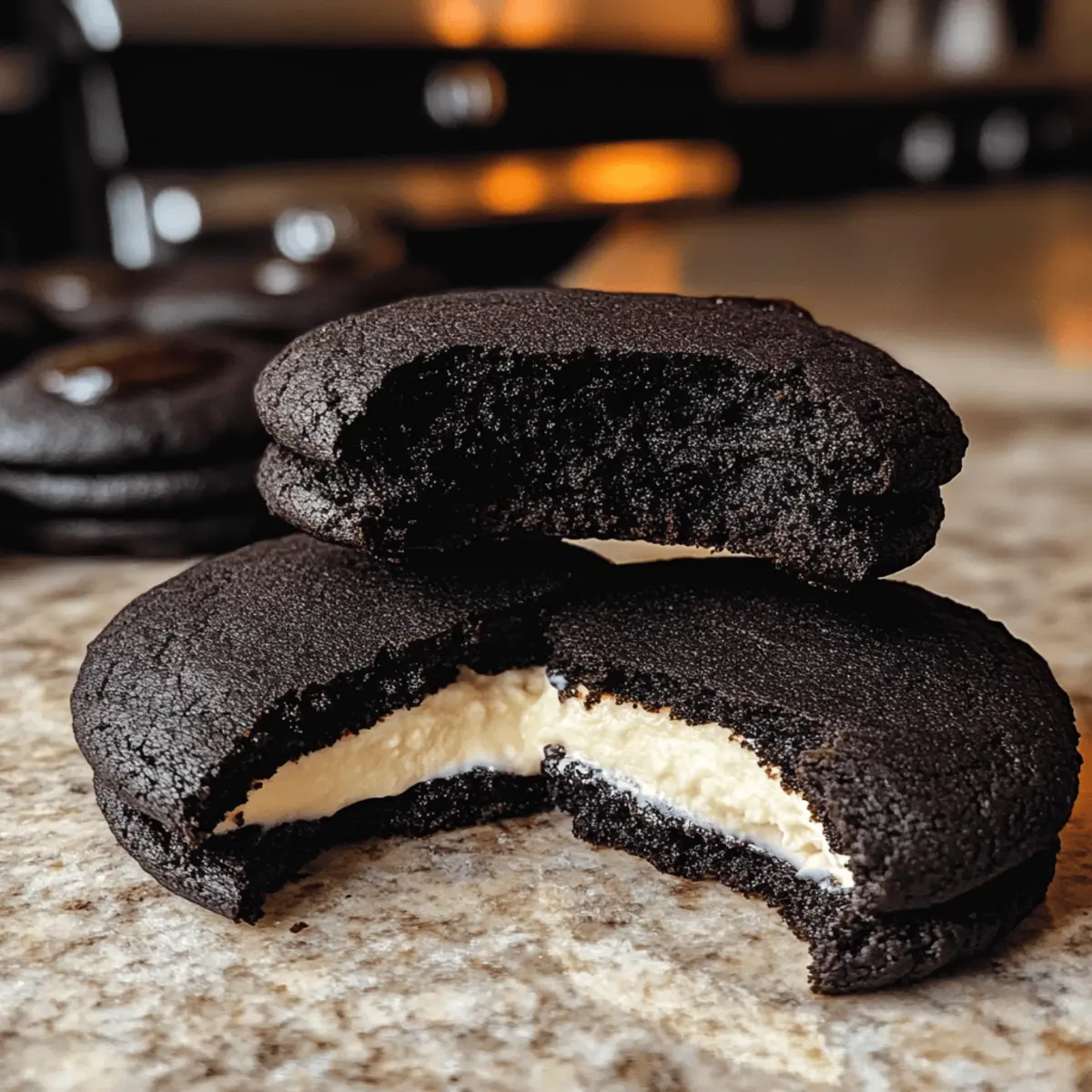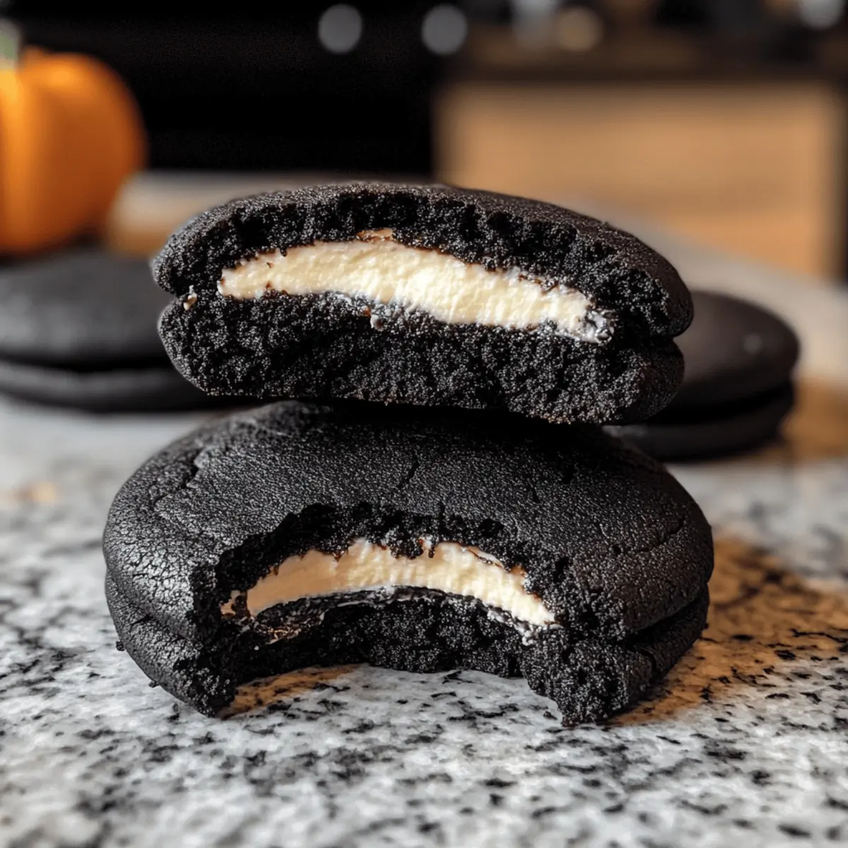Letzte Halloween-Feiern erinnere ich mich an diese unvergesslichen Black Velvet Cheesecake Cookies, die mir das Herz erwärmten. Mit ihrem tiefschwarzen Erscheinungsbild und dem cremigen Käsekuchen-Innenleben bringen sie nicht nur ein visuelles Highlight, sondern auch ein Geschmackserlebnis, das seinesgleichen sucht. Diese Kekse sind perfekt für alle, die nach einem schnellen und beeindruckenden Dessert suchen, das garantiert für Staunen sorgt. Zudem sind sie ein hervorragender Ersatz für die üblichen Süßigkeiten und verleihen jeder Halloween-Feier das gewisse Etwas. Neugierig, wie man diese Leckerbissen zubereitet? Lass uns gemeinsam in die Keksbäckerei eintauchen! Warum wirst du diese Kekse lieben? Einzigartiger Genuss: Diese schwarzen Samt Cheesecake Kekse kombinieren die besten Aspekte klassischer Cookies und zarten Käsekuchenfüllung. Unwiderstehlicher Geschmack: Mit ihrem reichhaltigen, schokoladigen Aroma und der cremigen Mitte sind sie eine wahre Gaumenfreude. Festliche Optik: Ihr auffälliges Aussehen macht sie zu einem perfekten Hingucker auf jeder Halloween-Party. Schnelle Zubereitung: Mit einfachen Zutaten und unkomplizierten Schritten sind sie schnell gemacht und ideal für spontane Gelegenheiten. Vielseitige Variationen: Probiere sie mit verschiedenen Füllungen oder Toppings, um deine Gäste zu überraschen. Verpasse nicht die Chance, diese köstlichen Kekse bei deinem nächsten Fest zu servieren – sie sind ein absolutes Muss! Zutaten für schwarze Samt Cheesecake Kekse • Diese leckeren Kekse erfordern einige essentielle Zutaten, die perfekt harmonieren! Für die Käsekuchenfüllung Frischkäse – sorgt für eine cremige Füllung; kalt verwenden für einfacheres Mischen. Zucker – süßt die Käsekuchenfüllung und den Keks Teig; kann durch hellbraunen Zucker ersetzt werden. Vanilleextrakt – verleiht Tiefe; für die besten Ergebnisse verwende reinen Vanilleextrakt. Für die Keksmischung Allzweckmehl – sorgt für Struktur; abmessen durch Löffeln und Nivellieren; kann durch glutenfreies Mehl ersetzt werden. Schwarzes Kakaopulver – sorgt für tiefen Schokoladengeschmack und die schwarze Farbe; daher nicht durch normales Kakaopulver ersetzen. Backpulver – fungiert als Treibmittel; überprüfe die Frische für optimales Aufgehen. Salz – verstärkt den Geschmack; kann durch koscheres Salz ersetzt werden. Ungesüßte Butter – fügt Reichtum und Geschmack hinzu; weich gemacht für einfachereres Mischen. Hellbrauner Zucker – sorgt für Feuchtigkeit und einen Hauch von Karamell; kann durch weißen Zucker ersetzt werden, aber der Geschmack ändert sich. Eigelb – sorgt für Reichhaltigkeit und bindet die Zutaten; das Verwenden von nur Eigelben hält die Kekse feuchter. Schritt-für-Schritt-Anleitung für schwarze Samt Cheesecake Kekse Schritt 1: Käsekuchenfüllung herstellen Schlage den Frischkäse, Zucker und Vanilleextrakt in einer Schüssel mit einem Handmixer, bis die Mischung cremig und luftig ist. Portioniere die Füllung in 16 gleichmäßige Kleckse auf ein mit Backpapier ausgelegtes Blech und friere sie für mindestens 1 Stunde ein, bis sie fest sind. Schritt 2: Trockene Mischung zubereiten In einer großen Schüssel das Allzweckmehl, das schwarze Kakaopulver, Backpulver und Salz mit einem Schneebesen gut vermischen. Achte darauf, dass keine Klumpen entstehen, und stelle die Mischung beiseite. Diese trockenen Zutaten werden später mit der nassen Mischung kombiniert, um die Basis für die schwarzen Samt Cheesecake Kekse zu bilden. Schritt 3: Keks-Teig herstellen Schlage die weichgemachte, ungesalzene Butter zusammen mit dem weißen und hellbraunen Zucker in einer großen Schüssel mit einem Handmixer cremig, bis die Mischung leicht und luftig ist. Füge die Eigelbe und den Vanilleextrakt hinzu und mixe sie auf mittlerer Stufe, bis die Masse eine helle Farbe erreicht. Jetzt ist der Keks-Teig bereit zur Weiterverarbeitung. Schritt 4: Zutaten kombinieren Gib die trockenen Zutaten nach und nach zu der Keks-Mischung und rühre sie bei niedriger Geschwindigkeit ein, bis alles gut vermischt ist. Achte darauf, nicht zu lange zu mixen, um die Konsistenz der schokoladigen Kekse zu bewahren. Die Teigkonsistenz sollte dick und gut zusammenhaltend sein, bereit für die Formgebung. Schritt 5: Kekse zusammenstellen Nimm mit einem Esslöffel kleine Portionen des Keks-Teigs und forme sie zu flachen Scheiben. Platziere einen gefrorenen Klecks der Käsekuchenfüllung in die Mitte, umhülle ihn mit dem Keks-Teig und forme daraus eine Kugel. Wälze die Kugeln anschließend in einer Mischung aus schwarzem Kakaopulver und Zucker, um eine schöne Oberfläche zu erhalten. Schritt 6: Kekse backen Verräume die Kekse auf einem mit Backpapier ausgelegten Backblech, dabei genügend Platz zwischen ihnen lassen, damit sie ausdehnen können. Backe die Kekse im vorgeheizten Ofen bei 175 °C (350 °F) für 10-11 Minuten oder bis die Ränder fest sind. Achte darauf, sie rechtzeitig herauszunehmen, um die innere Füllung cremig zu halten. Schritt 7: Abkühlen lassen Lass die Kekse nach dem Backen für etwa 10 Minuten auf dem Blech auskühlen, damit sie stabiler werden. Übertrage die Kekse anschließend vorsichtig auf ein Drahtgitter, wo sie vollständig abkühlen können. Dies sorgt dafür, dass die cheesecakige Füllung fest bleibt und sich die Aromen vollständig entfalten. Was passt zu schwarzen Samt Cheesecake Keksen? Diese köstlichen Kekse mit ihrer cremigen Füllung und dem schokoladigen Aroma sind wunderbar vielseitig und lassen sich hervorragend mit verschiedenen Beilagen kombinieren. Festliche Getränke: Ein Gläschen cremiger Eierlikör ergänzt die süßen Noten der Kekse und sorgt für ein herbstliches Flair. Süße Herbstäpfel: Frisch geschnittene Äpfel verleihen einen knackigen Kontrast und einen fruchtigen Geschmack, der die Schokoladigkeit ergänzt. Kürbis-Cappuccino: Dieses herbstliche Getränk mit Gewürzen harmoniert perfekt mit dem tiefen Geschmack der Ke
