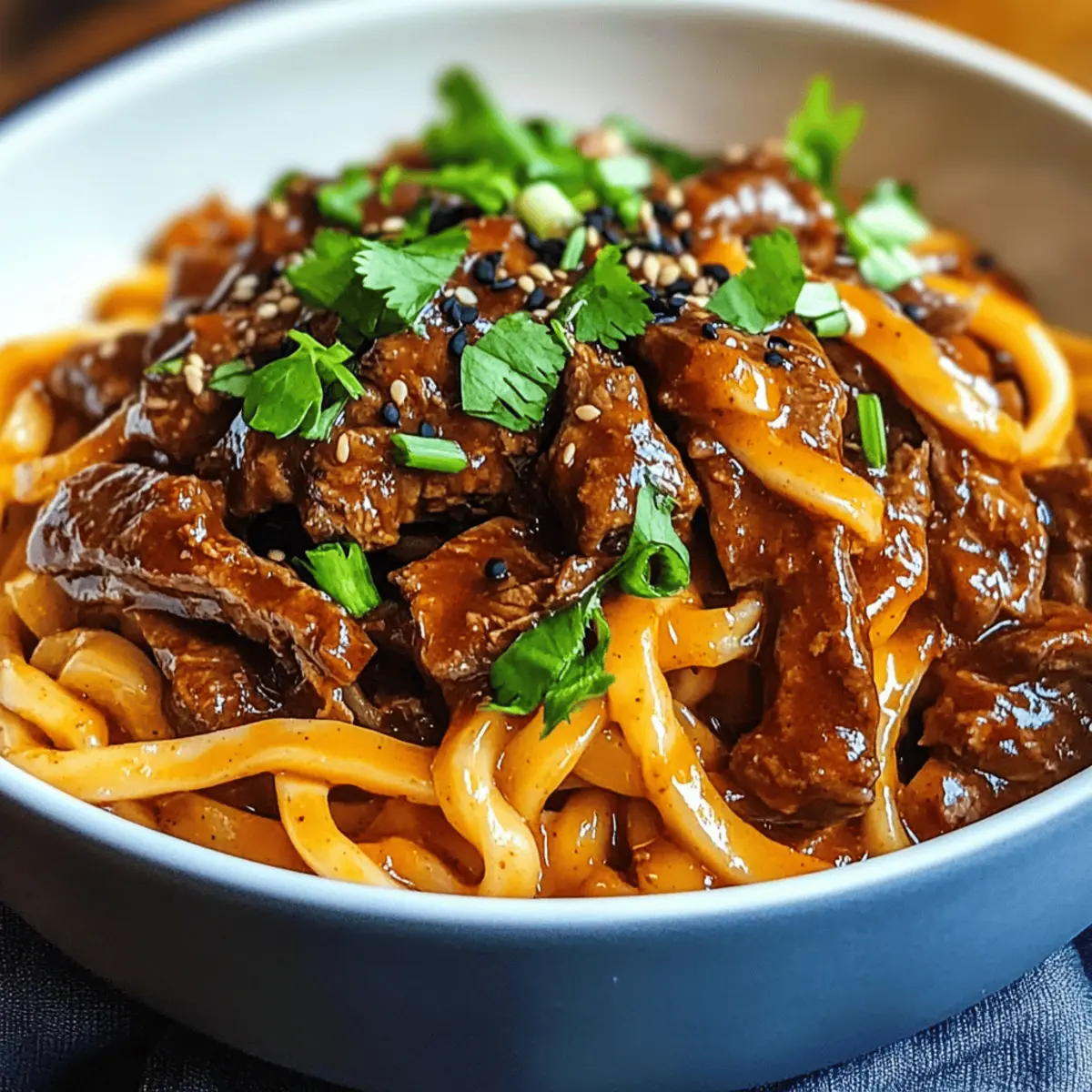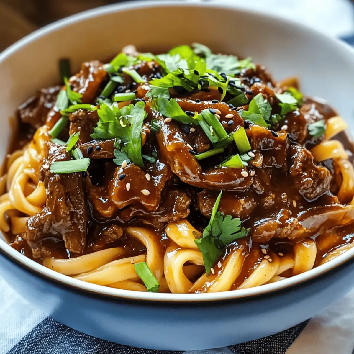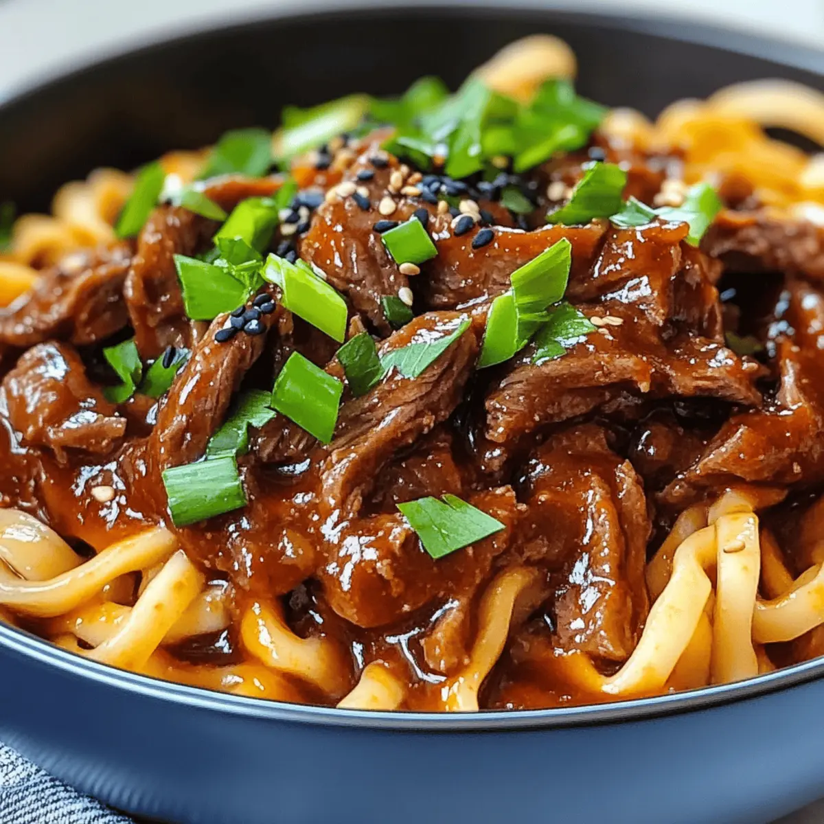 Es war ein regnerischer Abend und ich saß am Küchentisch, als der betörende Duft von langsam gekochtem Rindfleisch durch das Haus zog. Mein neustes Meisterwerk, die Slow Cooker Korean Beef Noodles, war gerade fertig und ich konnte es kaum erwarten, es zu probieren. Dieses Gericht entführt dich mit zartem Rindfleisch und knackigen Udon-Nudeln in eine Welt voller köstlicher koreanischer Aromen. Optimal für stressfreie Wochentage, bietet dieses Rezept nicht nur eine Vielzahl von Geschmackselementen, sondern ist auch glutenfrei und lässt sich einfach anpassen, sollte dir die eine oder andere Zutat fehlen. Die unkomplizierte Zubereitung lädt dazu ein, das Kochen wieder zu genießen – denn wer kann schon einem köstlichen, warmen Nudelgericht widerstehen? Was hältst du davon, dich dem Duft von Gochujang und frischen Kräutern hinzugeben? Warum wirst du dieses Rezept lieben? Einfachheit: Der gesamte Kochprozess ist unkompliziert und benötigt nur grundlegende Kochkenntnisse. Ideal für Anfänger oder vielbeschäftigte Köche, die ein schmackhaftes Essen zubereiten wollen. Reichhaltiger Geschmack: Die Kombination von Gochujang mit zartem Rindfleisch und herzhaften Udon-Nudeln kreiert ein umami-geladenes Geschmackserlebnis, das deine Geschmacksknospen verzaubert. Vielseitigkeit: Dieses Rezept lässt sich leicht anpassen! Ob du oxtail, kurz gebratenes Rindfleisch oder sogar Gemüse verwenden möchtest – die Optionen sind vielfältig. Familienfreundlich: Jeder wird dieses Gericht lieben! Egal ob für Familienessen oder ein Get-together mit Freunden, Slow Cooker Korean Beef Noodles sind der Hit. Entdecke auch meine anderen köstlichen Gerichte wie den Koreanischen Chili Blumenkohl, um dein asiatisches Menü zu erweitern! Der Ausgang: Koreanische Rindernudeln Zutaten • Entdecke die notwendigen Zutaten für deine köstlichen Koreanischen Rindernudeln! Für die Sauce Diced Onion – sorgt für Süße und Tiefe im Geschmack. Verwende gelbe oder weiße Zwiebeln. Gochujang – bringt Schärfe und Umami; passe die Menge je nach gewünschtem Schärfegrad an. Dark Soy Sauce – verleiht eine tiefere Farbe und herzhaften Geschmack; reguläre Sojasauce kann verwendet werden, wenn du eine etwas andere Note möchtest. Rice Vinegar – bietet Säure, um die Süße auszubalancieren; kann auch durch Apfelessig ersetzt werden. Packed Brown Sugar – süßt das Gericht und balanciert die Würze; weißer Zucker ist eine mögliche Substitution. Garlic-Ginger Paste – bringt traditionelle Aromen, frisch gehackter Knoblauch und Ingwer sind jedoch auch eine gute Wahl. Tomato Paste – verleiht Tiefe und Reichhaltigkeit; kein direkter Ersatz vorhanden, aber passierte Tomaten können im Notfall verwendet werden. Beef Stock – dient als Flüssigkeits- und Geschmacksbasis; für eine leichtere Variante einfach Gemüsebrühe verwenden. Ox Cheek (oder gewählter Fleischschnitt) – die Hauptproteinquelle; specified für reichhaltigen Geschmack; Alternativen sind Chuck Roast oder Rinderbrust für ähnliche Zartheit. Für die Nudeln und Garnitur Udon Noodles – die Basis des Gerichts; für die perfekte, zähe Textur. Soba, Reisnudeln oder Ramen sind ebenfalls geeignete Alternativen. Chopped Coriander – für Frische und Garnierung; optional ganz nach Vorliebe. Black Sesame Seeds – sorgt für einen nussigen Abschluss; kann durch geröstete Sesamsamen ersetzt werden. Sliced Green Onions – zur Garnierung; verstärkt die visuelle Attraktivität und den Geschmack. Jede Zutat trägt zur Harmonie der Aromen bei, die dich auf eine geschmackliche Reise durch Korea mitnehmen! Schritt-für-Schritt-Anleitung für Slow Cooker Korean Beef Noodles Step 1: Sauce vorbereiten Schneide die Zwiebel würfelig und gebe sie zusammen mit Gochujang, dunkler Sojasauce, Reisessig, braunem Zucker, Knoblauch-Ingwer-Paste, Tomatenmark und Rinderbrühe in den Slow Cooker. Rühre alles gut um, bis eine homogene Sauce entsteht, die eine kräftige Farbe annimmt und aromatisch duftet. Step 2: Rindfleisch hinzufügen Lege das Stück Ochsenbacke oder dein gewähltes Rindfleisch vorsichtig auf die Soße im Slow Cooker. Stelle sicher, dass das Fleisch gut mit der Mischung bedeckt ist, damit es während des Kochens saftig bleibt. Das Fleisch sollte teilweise in der Sauce eingetaucht sein, um den besten Geschmack zu entfalten. Step 3: Langsam kochen Setze den Deckel auf den Slow Cooker und stelle die Temperatur auf niedrig. Lasse das Rindfleisch für etwa 8 Stunden begleiten, bis es zart ist und sich leicht zerzupfen lässt. Der köstliche Duft wird dein Zuhause durchdringen und Vorfreude auf die Mahlzeit wecken. Step 4: Rindfleisch zerkleinern Nehme das gegarte Rindfleisch vorsichtig aus dem Slow Cooker und lege es auf ein Schneidebrett. Mit zwei Gabeln zerrupfst du das Fleisch in gleichmäßige Stücke. Gib das zerkleinerte Rindfleisch zurück in den Slow Cooker, um die Aromen zu bündeln, und füge die Udon-Nudeln und den gehackten Koriander hinzu. Step 5: Nudeln garen Erhöhe die Temperatur des Slow Cookers auf hoch und lasse die Udon-Nudeln für zusätzliche 25 Minuten mitgaren. Rühre gelegentlich um, bis die Nudeln heiß sind und die kräftigen Aromen der Sauce aufgenommen haben. Achte darauf, dass die Nudeln al dente bleiben, um ihre Struktur zu bewahren. Step 6: Würzen und garnieren Probiere die Korean Beef Noodles und passe die Gewürze nach deinem Geschmack an, indem du Salz und Pfeffer hinzufügst. Serviere das Gericht heiß und garniere es mit schwarzen Sesamsamen und frischen Frühlingszwiebeln, um einen zusätzlichen Crunch und eine ansprechende Optik zu schaffen. Lagerungstipps für Koreanische Rindernudeln Raumtemperatur: Die koreanischen Rindernudeln sollten nicht länger als 2 Stunden bei Raumtemperatur stehen gelassen werden, um Lebensmittelvergiftungen zu vermeiden. Kühlschrank: Bewahre die Rindernudeln in einem luftdichten Behälter bis zu 3 Tage im Kühlschrank auf. Die Aromen entwickeln sich weiter, während sie kühlen. G