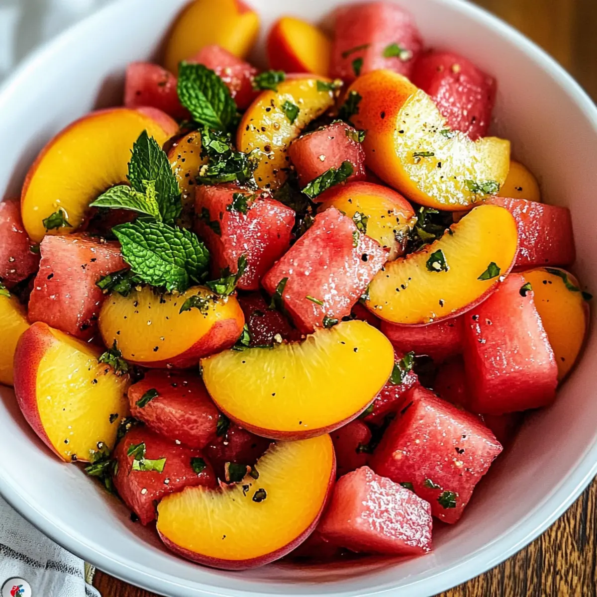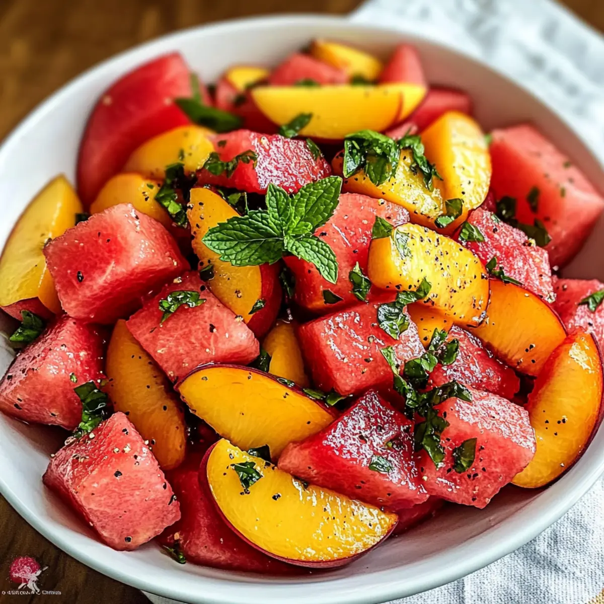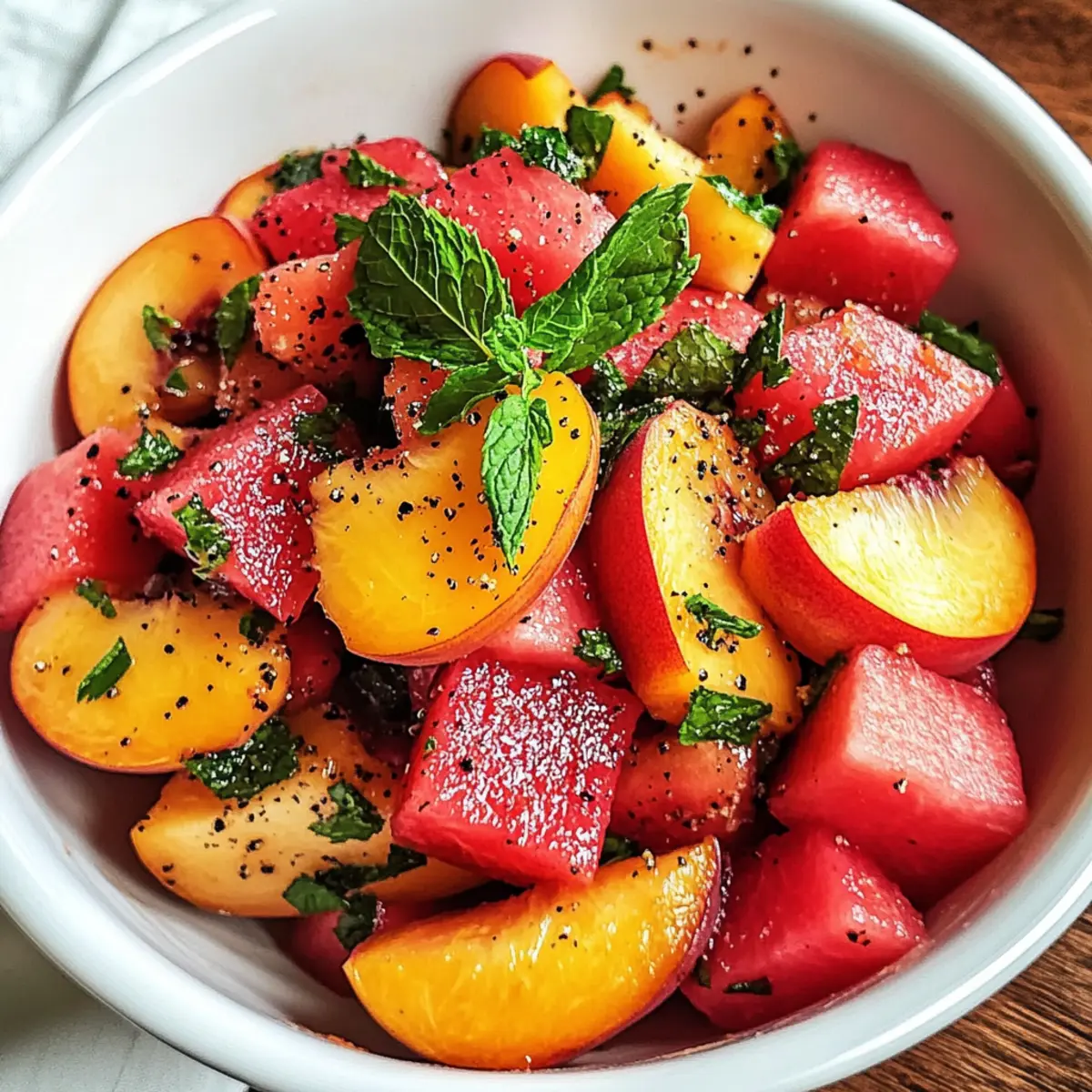 Es war ein heißer Sommertag, und ich fand mich auf der Terrasse, während ein sanfter Wind die Blätter der Bäume streichelte. An solchen Tagen träume ich von erfrischenden Gerichten, die mir die Hitze vergessen lassen. Genau deshalb teile ich heute mit euch mein Rezept für den Sommer-Pfirsich-Wassermelonen-Salat. Diese unkomplizierte, no-cook Salat-Kreation bringt die Süße reifer Pfirsiche und die erfrischende Knackigkeit von Wassermelonen zusammen – perfekt für Picknicks oder als leichte Beilage zu Grillgerichten. Nicht nur ist dieser Salat überraschend schnell zubereitet, er ist auch vegan und glutenfrei, was ihn zu einem idealen Sommergenuss macht. Wollt ihr wissen, wie ihr mit nur wenigen Zutaten diese leckere Komposition zaubern könnt? Lasst uns gemeinsam in die Welt der fruchtigen Aromen eintauchen! Warum ist dieser Salat der perfekte Sommergenuss? Frisch und knackig: Dieser Sommer-Pfirsich-Wassermelonen-Salat vereint die süßeste Frische mit dem knackigen Biss von saftiger Wassermelone. Einfach zuzubereiten: Binnen Minuten habt ihr ein erfrischendes Gericht, das ideal für heiße Tage oder ein Picknick ist. Vielseitig verwendbar: Ob als leichte Beilage zu euren Grillgerichten oder als Hauptgericht beim Sommerbrunch – dieser Salat passt immer. Gesund und leicht: Mit nur frischen Zutaten zaubert ihr einen kalorienarmen Snack, der voller Vitamine steckt. Wenig Aufwand, großer Geschmack: Ihr könnt ihn nach Belieben anpassen, indem ihr Zutaten wie gegrillte Garnelen oder geröstete Nüsse hinzufügt. Ihr könnt zudem weitere spannende Rezepte wie Karamellisierte Rosenkohl Mit oder Garnelen Sushi Stapel ausprobieren! Zutaten für den Sommer-Pfirsich-Wassermelonen-Salat • Für die Hauptzutaten: Freestone-Pfirsiche – Sie verleihen dem Salat die gewünschte Süße und Saftigkeit; wählt reife, duftende Früchte für den besten Geschmack. Kernlose Wassermelone – Sorgt für eine erfrischende Knackigkeit und viel Flüssigkeit; sucht ein schweres Exemplar mit einem cremigen gelben Fleck. Frische Minze – Entfaltet ein herrliches Aroma und Frische; nutzt bestenfalls Spearmint, da kräftigeres Pfefferminzaroma dominieren kann. • Für das Dressing: Zitronen- oder Limettensaft – Bringt die Aromen zum Strahlen, ohne sie zu überwältigen; kann bei Bedarf mit etwas Olivenöl ersetzt werden. Meersalz & frisch gemahlener schwarzer Pfeffer – Balanciert die Süße der Obstzutaten; nach Belieben anpassen. Mit diesen einfachen Zutaten zaubert ihr euren eigenen Sommer-Pfirsich-Wassermelonen-Salat, der für Erfrischung an heißen Tagen sorgt! Schritt-für-Schritt-Anleitung für den Sommer-Pfirsich-Wassermelonen-Salat Schritt 1: Pfirsiche schneiden Wascht die reifen Freestone-Pfirsiche gründlich und schneidet sie in dünne Spalten oder mundgerechte Stücke. Es ist optional, die Schale zu entfernen, je nach persönlicher Vorliebe. Dieser Schritt dauert etwa 5 Minuten und sorgt für die saftige Süße, die den Sommer-Pfirsich-Wassermelonen-Salat lebendig macht. Schritt 2: Wassermelone würfeln Nehmt eine kernlose Wassermelone und schneidet sie in etwa 1-Zoll große Würfel. Achtet darauf, die Kerne zu entfernen, falls vorhanden. Dieser Schritt erfordert einige Minuten, um die knackige Fruchtigkeit zu erhalten, die perfekte Ergänzung zum Pfirsich in eurem Sommer-Pfirsich-Wassermelonen-Salat. Schritt 3: Minze vorbereiten Erntet eine Handvoll frischer Minzblätter, spült sie leicht ab und tupft sie trocken. Zerkleinert die Blätter grob, indem ihr sie mit den Händen zerreißt oder mit einem Messer hackt. Der süße Duft der Minze wird eure Sinne erfreuen und etwa 3 Minuten Zeit in Anspruch nehmen. Schritt 4: Zutaten vermengen Nehmt eine große Schüssel und gebt die vorbereiteten Pfirsiche, Wassermelonenwürfel und die gehackte Minze hinein. Seid vorsichtig, beim Mischen, um die zarten Früchte nicht zu zerdrücken. Dieser Schritt dauert ungefähr 2 Minuten und bringt die Farben und Aromen für euren Sommer-Pfirsich-Wassermelonen-Salat zusammen. Schritt 5: Würzen Streut eine Prise Meersalz und frisch gemahlenen schwarzen Pfeffer über die Obstmischung. Diese Würze wird die Süße der Früchte hervorheben und dem Salat eine leichte Tiefe verleihen. Nehmt euch 1-2 Minuten Zeit, um die Würzung gleichmäßig zu verteilen. Schritt 6: Dressing hinzufügen Träufelt den frisch gepressten Saft einer Zitrone oder Limette über den Salat und fügt optional einen Hauch von Olivenöl hinzu. Das säuerliche Aroma wird die verschiedenen Geschmäcker harmonisieren. Dieser Schritt sollte etwa 2 Minuten in Anspruch nehmen und bringt den Sommer-Pfirsich-Wassermelonen-Salat zum Strahlen. Schritt 7: Sanft vermengen Verwendet eure Hände oder einen großen Löffel, um alle Zutaten vorsichtig zu vermengen. Achtet darauf, die Früchte nicht zu zerdrücken, sondern nur ein leichtes Tossing zu machen, damit die Frische erhalten bleibt. Dieser Schritt dauert rund 2 Minuten und verbindet die Aromen auf perfekte Weise. Schritt 8: Kühlen und Servieren Lasst den Salat für 15-20 Minuten im Kühlschrank ruhen, damit sich die Aromen setzen und der Salat schön kühl wird. Dies ist der letzte Schritt, um euren Sommer-Pfirsich-Wassermelonen-Salat frisch und erfrischend zu genießen, perfekt für heiße Tage! Aufbewahrungstipps für den Sommer-Pfirsich-Wassermelonen-Salat Raumtemperatur:: Am besten frisch genießen, da die Früchte bei Raumtemperatur an Geschmack verlieren. Vermeide es, den Salat länger als 1-2 Stunden ungekühlt zu lassen. Kühlschrank:: Im Kühlschrank hält sich der Sommer-Pfirsich-Wassermelonen-Salat bis zu 2 Tage in einem luftdichten Behälter. Achte darauf, überschüssige Feuchtigkeit zu vermeiden, damit die Früchte frisch bleiben. Vorbereitung:: Wenn du den Salat im Voraus zubereiten möchtest, lagere die Zutaten getrennt, bis kurz vor dem Servieren. So bleibst du der Erfrischung treu. Servieren:: Vor dem Servieren den Salat leicht umrühren, um die Aromen neu zu entfalten, und optio