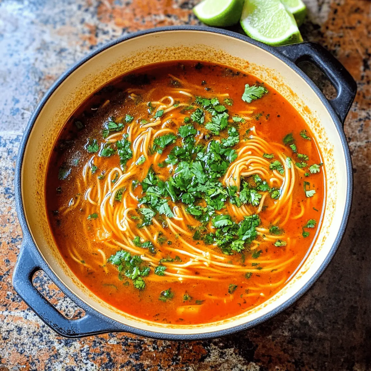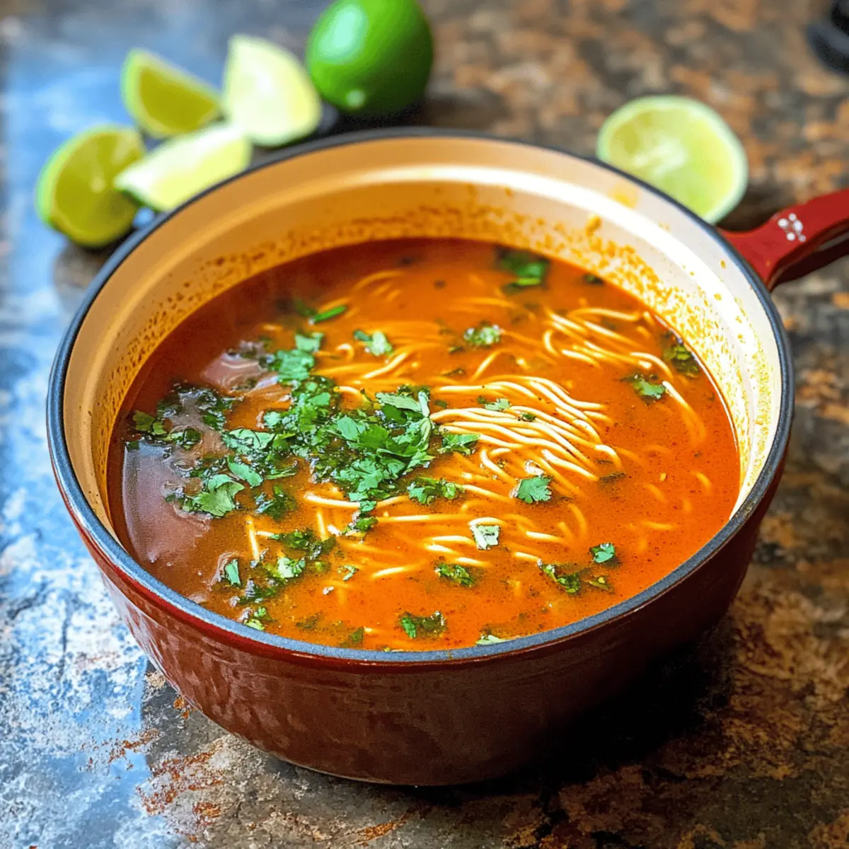 „Kann ich das wirklich schaffen?“ hörte ich jemanden in der Küche murmeln, während ich an meinem neuen Rezept arbeitete. Die authentische Sopa de Fideo, eine exquisite mexikanische Nudelsuppe, ist die Antwort auf die Frage nach einer schnellen, herzhaften Mahlzeit. In nur 20 Minuten vereint diese köstliche Suppe den vollen Geschmack von sonnengereiften Tomaten und zarten Fideo-Nudeln. Sie ist nicht nur kinderfreundlich und budgetschonend, sondern erlaubt auch kreative Variationen wie das Hinzufügen von extra Gemüse oder einen spicy Kick. Und das Beste? Sie schmeckt so gut, dass sie selbst die Fast-Food-Liebhaber umstimmen wird! Bist du bereit, diese wohltuende Umarmung von einer Suppe zu entdecken? Lass uns gemeinsam in die Zubereitung eintauchen! Warum ist Sopa de Fideo so besonders? Schnelligkeit: In nur 20 Minuten zauberst du ein leckeres Gericht, das perfekt für hektische Wochentage ist. Vielseitigkeit: Du kannst die Suppe nach Belieben anpassen – füge gemischtes Gemüse hinzu oder genieße sie spicy mit etwas Chili. Herzhaft und sättigend: Die Kombination aus zarten Nudeln und reichhaltiger Tomatensauce sorgt für ein wohltuendes Erlebnis. Einfache Zutaten: Mit alltäglichen Zutaten aus deiner Küche gelingt diese Suppe ganz leicht – ideal für Budgetbewusste! Familienfreundlich: Die Aromen der Sopa de Fideo begeistern nicht nur Erwachsene, sondern sind auch bei Kindern sehr beliebt. Entdecke die unterschiedlichen Variationen und serviere sie mit frischem Koriander oder Limetten für einen zusätzlichen Kick. Du wirst sehen, diese Suppe wird schnell zu einem Favoriten in deinem Haushalt! Sopa de Fideo Zutaten • Hier sind die Zutaten, die du benötigst, um diese köstliche Sopa de Fideo zuzubereiten. Für die Brühe Diced Tomatoes – Basisgeschmack und Farbe für die Suppe; nimm frische oder Konserventomaten, am besten reif. Vegetable or Chicken Broth – Flüssigkeitsbasis; für die vegane Option nutze Gemüsebrühe, die auch selbstgemacht sein kann. Für die Nudeln Fideo Noodles – Schlüsselkomponente für die Textur; dünne Spaghetti-Stücke, die du auch durch geschnittene Spaghetti ersetzen kannst. Olive Oil – Fett zum Kochen und für zusätzlichen Geschmack; kann durch ein anderes Speiseöl ersetzt werden, falls gewünscht. Für den Geschmack Garlic – Verbessert das gesamte Aroma; frischer Knoblauch ist ideal, aber getrockneter ist auch eine Möglichkeit, achte dann auf die Menge. Oregano – Fügt einen Kräutergeschmack hinzu; mexikanischer Oregano ist vorzuziehen, funktioniert aber auch mit italienischem. Salt & Cumin – Unverzichtbar für die Würze; passe die Mengen nach deinem Geschmack an und nutze diese, um die Sopa de Fideo zu perfektionieren. Für die Garnitur Chopped Cilantro – Frische Garnierung für zusätzliche Frische; optional, aber sehr empfehlenswert. Limes – In Scheiben geschnitten zum Servieren; verleiht der Suppe mit einem Spritzer zusätzlichen Frischekick. Mit diesen einfachen Zutaten kannst du schnell und einfach eine köstliche Sopa de Fideo kreieren, die jedem Genuss verspricht! Schritt-für-Schritt-Anleitung für die sinnliche Sopa de Fideo Step 1: Tomatenmischung zubereiten Mische die gewürfelten Tomaten, 60 ml Olivenöl, den Knoblauch, Oregano, Salz und Kreuzkümmel in einem Mixer, bis die Mischung schön glatt ist. Das dauert etwa 2-3 Minuten. Stelle die fertige Tomatenmischung beiseite, sodass sie während der Zubereitung der Nudeln bereit ist. Step 2: Nudeln rösten Erhitze in einem großen Topf 45 ml Olivenöl bei mittlerer Hitze. Füge die Fideo-Nudeln hinzu und röste sie unter ständigem Rühren, bis sie gleichmäßig goldbraun sind. Dieser Vorgang kann ungefähr 3-5 Minuten dauern. Achte darauf, dass die Nudeln nicht anbrennen und eine knusprige Textur annehmen. Step 3: Tomatenmischung hinzufügen Gieße die vorbereitete Tomatenmischung vorsichtig in den Topf, der die gerösteten Fideo-Nudeln enthält. Rühre alles gut um, damit die Nudeln gleichmäßig mit der Tomatenmischung überzogen werden. Lass die Mischung etwa 1-2 Minuten köcheln, damit die Aromen sich verbinden. Step 4: Brühe hinzufügen und kochen Füge nun die Gemüse- oder Hühnerbrühe in den Topf hinzu und bringe die Mischung zum Kochen. Reduziere die Hitze, decke den Topf ab und lasse die Sopa de Fideo für etwa 5 Minuten köcheln, bis die Nudeln zart sind und die Suppe eine schöne Konsistenz hat. Step 5: Servieren Nimm den Topf vom Herd und rühre den frisch gehackten Koriander unter die Suppe. Serviere die Sopa de Fideo sofort in Schalen und garniere jede Portion mit Limettenscheiben. Ein Spritzer Limette über der Suppe verleiht einen frischen Geschmack und hebt die Aromen hervor! Was passt gut zur Sopa de Fideo? Die perfekte Ergänzung zu deiner köstlichen und wohltuenden Suppe macht dein Essen erst richtig besonders. Frischer Koriander: Ein wenig von diesem zarten Kraut bringt Frische und hebt die Aromen der Suppe noch mehr hervor. Limettenviertel: Ein Spritzer frischer Limette sorgt für einen erfrischenden Kick und perfektioniert das Geschmackserlebnis. Avocado-Würfel: Cremige Avocado ergänzt die zarten Nudeln und fügt einen geschmeidigen Texturkontrast hinzu. Einfach köstlich! Queso Fresco: Dieser milde, bröckelige Käse passt wunderbar zur Süße der Tomaten und bringt zusätzliche Hartnäckigkeit. Röstbrot: Ein paar Scheiben knuspriges Brot zum Dippen machen die Mahlzeit noch herzlicher und sättigender. Gemischte Salate: Ein frischer, knackiger Salat mit einer leichten Vinaigrette sorgt für eine perfekt ausgewogene Mahlzeit mit frischen Aromen. Fruchtiger Cocktail: Ein erfrischender Margarita oder Agua Fresca rundet das Essen ab, bieten eine süße Erfrischung, die super harmoniert. Dessert: Optiere für eine leichte Tortilla mit Zimt und Zucker – ein süßer Abschluss für dein mexikanisches Menü! Nützliche Tipps für die Sopa de Fideo Sofort servieren: Die Sopa de Fideo kann schnell dick werden. Serviere sie daher dire
