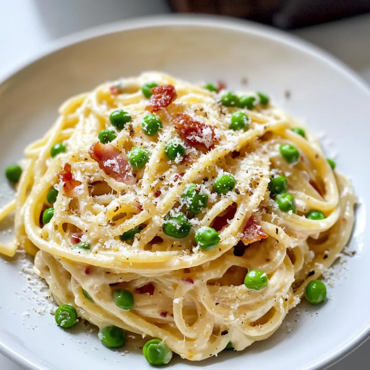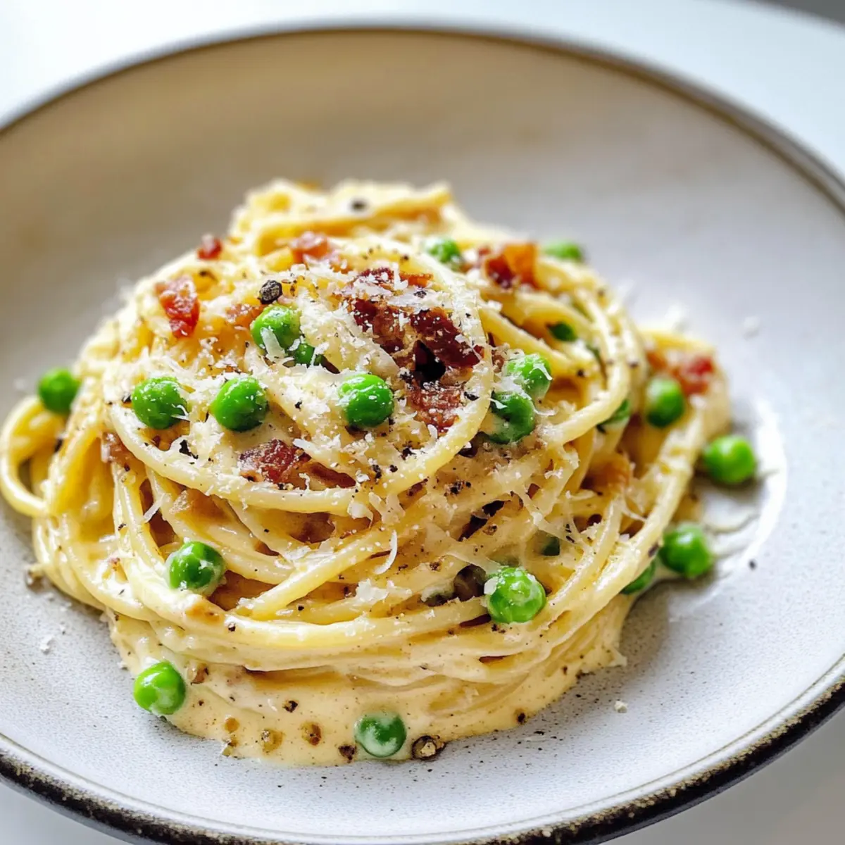 Die Küche ist wie ein Reiseführer durch Erinnerungen; jede Zutat erzählt ihre eigene Geschichte. Heute lade ich euch ein, die Klassiker der italienischen Küche neu zu entdecken mit meiner Spaghetti Carbonara – und zwar nicht alleine, sondern mit einer unerwarteten süßen Note dank grüner Erbsen. Dieses Rezept vereint in kurzer Zeit nicht nur die herzhaften Aromen von knusprigem Pancetta und cremigem Käse, sondern bringt auch eine frische, bunte Note auf den Tisch. Perfekt für ein schnelles Abendessen unter der Woche, braucht es nur einfache Zutaten und ein paar unkomplizierte Schritte. Neugierig, wie ihr diese köstliche Kombination zaubern könnt? Lass uns gleich loslegen! Warum wirst du dieses Rezept lieben? Einfachheit, die begeistert: Das Rezept ist unkompliziert und erfordert nur grundlegende Kochfähigkeiten. Reiche Aromen: Die Kombination aus rauchigem Pancetta und cremigem Käse sorgt für einen vollen Geschmack, der jede Geschmacksknospe erfreut. Vielseitigkeit: Du kannst die Erbsen nach Belieben gegen saisonales Gemüse wie Spargel oder Spinat austauschen. Schnelle Zubereitung: Perfekt für hektische Wochentage, ist dieses Gericht in kürzester Zeit fertig. Familienfreundlich: Jeder wird dieses köstliche, herzhafte Gericht lieben, egal ob Groß oder Klein. Entdecke auch meine anderen Pasta-Rezepte für noch mehr Inspiration: einfache Pasta Rezepte und schnelle Abendessen Ideen. Zutaten für Spaghetti Carbonara • Für die Sauce: Large Eggs & Egg Yolks – Sorgt für die cremige Konsistenz der Sauce; achte darauf, dass sie Zimmertemperatur haben. Grated Pecorino Romano – Verleiht der Sauce einen salzigen, scharfen Geschmack; Parmesan kann als Ersatz verwendet werden, jedoch ändert sich der Geschmack. Grated Parmesan – Fügt zusätzliche Tiefe und Cremigkeit hinzu; kann auch weggelassen werden, wenn du es bevorzugst. • Für das Gericht: Pancetta – Bietet eine rauchige Note und reichhaltigen Geschmack; kann durch Speck oder Prosciutto ersetzt werden. Spaghetti – Die klassische Pasta-Basis; jede andere lange Pasta kann ebenfalls verwendet werden. English Peas – Bringen eine süße Note und Farbe; gefrorene Erbsen sind eine praktische Alternative. Coarsely Ground Pepper – Gibt der Carbonara die nötige Würze; frisch gemahlener Pfeffer ist am besten. Olive Oil – Dient zum Anbraten von Pancetta und Erbsen; kann durch Butter ersetzt werden, um den Geschmack zu variieren. Ganz einfach, oder? Mit diesen Zutaten kannst du deine eigene köstliche Spaghetti Carbonara zubereiten und deine Familie in wenigen Minuten begeistern! Schritt-für-Schritt-Anleitung für Spaghetti Carbonara mit Erbsen Step 1: Wasser zum Kochen bringen Bringe einen großen Topf mit leicht gesalzenem Wasser zum Kochen. Achte darauf, dass das Wasser stark sprudelnd ist, bevor du die Spaghetti hinzufügst. Dies dauert in der Regel etwa 10 Minuten bei hoher Hitze. Während das Wasser kocht, kannst du die anderen Schritte vorbereiten, um alles pünktlich zu haben. Step 2: Eiermischung zubereiten In einer großen Schüssel verquirlst du die Eier, Eigelb, geriebenen Pecorino und Parmesan. Füge eine Prise Salz und frisch gemahlenen schwarzen Pfeffer hinzu. Rühre alles gut um, bis eine homogene Mischung entsteht. Diese cremige Basis wird das Herz deiner Spaghetti Carbonara und sollte bereit sein, wenn die Pasta fertig ist. Step 3: Pancetta anbraten Erhitze in einer großen Pfanne bei mittlerer Hitze etwas Olivenöl. Füge die gewürfelte Pancetta hinzu und brate sie an, bis sie knusprig und goldbraun ist, was etwa 5-7 Minuten dauern sollte. Wenn die Pancetta fertig ist, nimm sie aus der Pfanne und lege sie auf ein Küchenpapier, um das überschüssige Fett abtropfen zu lassen. Step 4: Erbsen sautieren In der gleichen Pfanne füge bei Bedarf etwas mehr Olivenöl hinzu und gib die Erbsen dazu. Brate sie 2-3 Minuten lang an, bis sie weich sind und eine leuchtende grüne Farbe annehmen. Achte darauf, die Erbsen nicht zu lange zu garen, damit sie schön knackig bleiben. Nimm die Pfanne dann vom Herd. Step 5: Spaghetti kochen Wenn das Wasser kocht, gib die Spaghetti hinzu und koche sie nach Packungsanweisung, bis sie „al dente“ sind (normalerweise etwa 8-10 Minuten). Denke daran, ein Tasse des Kochwassers aufzuheben, bevor du die Spaghetti abgießt. Das stärkehaltige Wasser hilft, die Sauce zu binden, wenn du die Zutaten kombinierst. Step 6: Zutaten kombinieren Füge die frisch abgegossenen Spaghetti zurück in die Pfanne, wo sich bereits Olivenöl, knusprige Pancetta und sautierte Erbsen befinden. Mische alles gut durch, damit sich die Aromen gleichmäßig verteilen. Dies sollte sofort nach dem Abgießen der Pasta geschehen, um die Wärme zu nutzen. Step 7: Sauce hinzufügen Langsam die Eier- und Käsesauce in die warme Pasta einrühren. Dabei solltest du das reservierte Kochwasser nach und nach hinzufügen, um die gewünschte Cremigkeit zu erzielen. Rühre alles schnell um und achte darauf, dass die Eier nicht stocken, sondern eine glatte, cremige Sauce bilden. Step 8: Anrichten und Servieren Serviere die Spaghetti Carbonara sofort auf Tellern und garniere sie nach Belieben mit zusätzlichem geriebenem Käse und frisch gemahlenem Pfeffer. Die Kombination aus der cremigen Sauce, der leckeren Pancetta und den süßen Erbsen macht dieses Gericht zu einem unvergesslichen Erlebnis. Lass dir diese köstliche Mahlzeit schmecken! Lagerungstipps für Spaghetti Carbonara Kühlschrank: Lagere übrig gebliebene Spaghetti Carbonara in einem luftdichten Behälter im Kühlschrank, wo sie bis zu 2 Tage frisch bleiben. Wiedererwärmen: Erhitze die Reste sanft in einer Pfanne auf niedriger Hitze. Füge einen Spritzer Nudelwasser oder Olivenöl hinzu, um die Cremigkeit der Sauce zu regenerieren. Frezer: Gefrorene Spaghetti Carbonara sollten idealerweise innerhalb von 1 Monat verbraucht werden. Lagere sie in einem luftdichten Behälter oder Gefrierbeutel, um Gefrierbrand zu vermeiden. Raumtemperatur: Lass die Spag