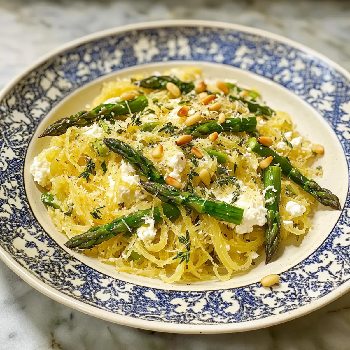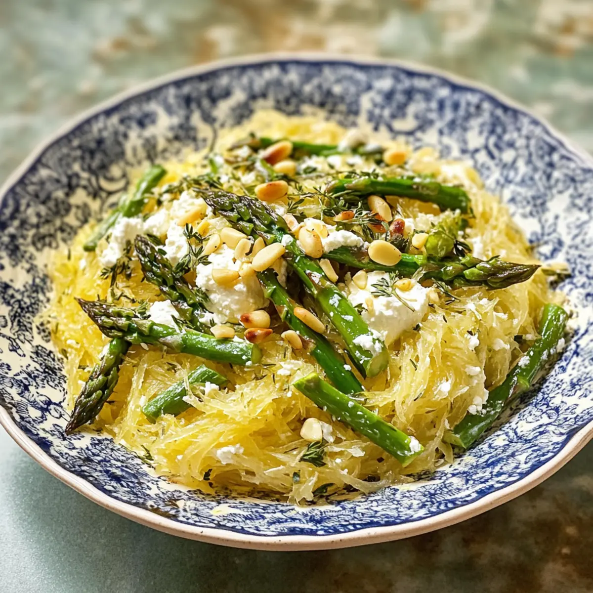 Als ich neulich in meinem Garten stand und die ersten frischen Gemüse des Frühlings erntete, fiel mir die Idee für ein leichtes, fröhliches Gericht ein: Spaghetti Squash mit spargeligem Gemüse, Ricotta, Zitrone und Thymian. Diese vegetarische Mahlzeit bringt nicht nur Farbe und Geschmack auf den Teller, sondern hat auch den Vorteil, dass sie glutenfrei und gesund ist. Die zarten Stränge der Spaghetti Squash bieten eine wunderbare Alternative zu herkömmlicher Pasta und machen das Gericht besonders leicht und bekömmlich. Perfekt für all jene, die frische, hausgemachte Küche lieben und Lust auf etwas Neues haben! Neugierig, wie einfach und schnell Sie dieses pflanzliche Highlight zubereiten können? Lassen Sie uns gemeinsam in die Zubereitung eintauchen! Warum werden Sie dieses Rezept lieben? Einfachheit: Die Zubereitung ist kinderleicht, auch für Kochanfänger geeignet! Mit nur wenigen Schritten können Sie dieses leckere Gericht zaubern. Frische Aromen: Die Kombination aus zarten Spargel, cremiger Ricotta und spritziger Zitrone sorgt für einen Geschmack, der nach Frühling schreit. Vielseitigkeit: Variieren Sie die Zutaten ganz nach Ihrem Geschmack – probieren Sie zum Beispiel Mexikanische Tostadas Rotisserie oder unsere Hähnchen Quinoa Einfach für weitere leckere Optionen! Gesund und schmackhaft: Mit einem niedrigen Kaloriengehalt von nur 219 pro Portion ist dieses Gericht perfekt für ein leichtes Abendessen. Ein Blickfang: Die leuchtenden Farben machen das Gericht nicht nur schmackhaft, sondern auch optisch ansprechend – ideal für Ihre nächste Dinnerparty! Spaghetti-Kürbis Zutaten • Entdecken Sie die frischen Zutaten, die dieses Gericht so lecker machen! Für die Hauptzutaten Spaghetti-Kürbis – Die perfekte kohlenhydratarme Pasta-Alternative, die das Gericht leicht und bekömmlich macht. Olivenöl – Verleiht Würze und hilft beim Rösten der Gemüse. Avocadoöl kann als Alternative verwendet werden. Knoblauch (zerdrückt) – Bringt aromatische Tiefe in den Kürbis. Frische Zehen bieten den besten Geschmack. Spargel – Gibt einen knackigen Biss und frischen Geschmack. Kann durch grüne Bohnen ersetzt werden, wenn nötig. Ricotta – Sorgt für eine cremige Textur und gibt dem Gericht eine gute Portion Protein. Für eine milchfreie Variante verwenden Sie pflanzlichen Ricotta. Zitronensaft – Bringt frische Säure ins Spiel. Limettensaft ist eine gute Alternative. Zitronenschale – Intensiviert den zitronigen Geschmack, am besten Bio-Zitronen verwenden. Frische Thymianblätter – Aromatisches Kraut, das perfekt zu diesem Frühling-Gericht passt. Kann mit getrocknetem Thymian ersetzt werden (weniger verwenden!). Koshersalz – Verstärkt den Geschmack des Gerichts. Normales Salz kann ebenfalls verwendet werden. Frisch gemahlener schwarzer Pfeffer – Fügt Wärme und Komplexität hinzu. Je nach Vorliebe anpassen. Pinienkerne (geröstet) – Sorgen für einen nussigen Crunch, der das Gericht abrundet. Kann durch Mandeln oder Walnüsse ersetzt werden. Das Rezept vertieft sich in den frischen und köstlichen Geschmack von Frühjahr und bietet Ihnen die Möglichkeit, schnelle und einfache Gerichte zu genießen – ideal für gesundheitsbewusste Genießer! Schritt-für-Schritt-Anleitung für Spaghetti-Kürbis mit Ricotta und Frühlingsgemüse Step 1: Ofen vorheizen Heizen Sie Ihren Ofen auf 190°C vor. Dies stellt sicher, dass der Spaghetti-Kürbis gleichmäßig und schön geröstet wird, was zu einer zart-köstlichen Konsistenz führt. Während der Ofen aufheizt, können Sie bereits mit der Vorbereitung des Kürbisses beginnen. Step 2: Kürbis vorbereiten Schneiden Sie den Spaghetti-Kürbis in der Mitte durch und entfernen Sie die Kerne mit einem Löffel. Bestreichen Sie die Schnittflächen großzügig mit ½ Esslöffel Olivenöl und platzieren Sie ihn mit der Schnittseite nach unten auf ein mit Backpapier ausgelegtes Backblech. Rösten Sie ihn im Ofen für 35 Minuten, bis die Schale leicht goldbraun ist. Step 3: Spargel hinzufügen Während der Kürbis im Ofen röstet, schneiden Sie den Spargel in kleine Stücke. Vermengen Sie die Spargelstücke mit dem verbleibenden Olivenöl in einer Schüssel. Legen Sie den vorbereiteten Spargel daneben auf das Backblech und fügen Sie zerdrückte Knoblauchzehen unter jede Hälften des Kürbisses hinzu. Die Aromen können dann während des Röstens wunderbar miteinander harmonieren. Step 4: Gemeinsam rösten Nehmen Sie das Backblech nach 35 Minuten aus dem Ofen und stellen Sie den Spargel darauf für weitere 10 Minuten. Achten Sie darauf, dass der Spargel zart, aber noch leicht knackig bleibt; er sollte beim Gabeltest biegsam, aber nicht matschig sein. Der Spaghetti-Kürbis sollte dann mit einer Gabel leicht aufschlitzbar sein. Step 5: Füllung zubereiten Mischen Sie in einer separaten Schüssel den Ricotta, Zitronensaft, Zitronenschale, Thymianblätter, Koshersalz und frisch gemahlenen schwarzen Pfeffer. Diese cremige Füllung bringt Frische und Kräuteraroma in Ihr Rezept und ergänzt perfekt die leichten Aromen des Spaghetti-Kürbis mit dem Frühlingsgemüse. Step 6: Gericht vollenden Nehmen Sie den Spaghetti-Kürbis aus dem Ofen und entfernen Sie vorsichtig die Knoblauchzehen. Fügen Sie diese zur Ricotta-Mischung hinzu und verrühren Sie alles gut. Jetzt verwenden Sie eine Gabel, um die Stränge des Kürbisses aufzulockern und mischen sie mit der Ricotta-Füllung. Servieren Sie das Gericht dann garniert mit dem zarten Spargel und den gerösteten Pinienkernen für den perfekten Crunch. Was passt zu Spaghetti-Kürbis mit Ricotta? Möchten Sie die perfekte Begleitung für dieses luftige Gericht finden? Frisches Baguette: Ein knuspriges Baguette ergänzt wunderbar die cremige Ricotta und bietet eine perfekte Möglichkeit, die köstlichen Aromen aufzusaugen. Zitronenwasser: Ein erfrischendes Zitronenwasser rundet die Frische des Gerichts ab und bringt eine extra Portion Zitrusgeschmack in die Kombination. Rucola-Salat: Der 