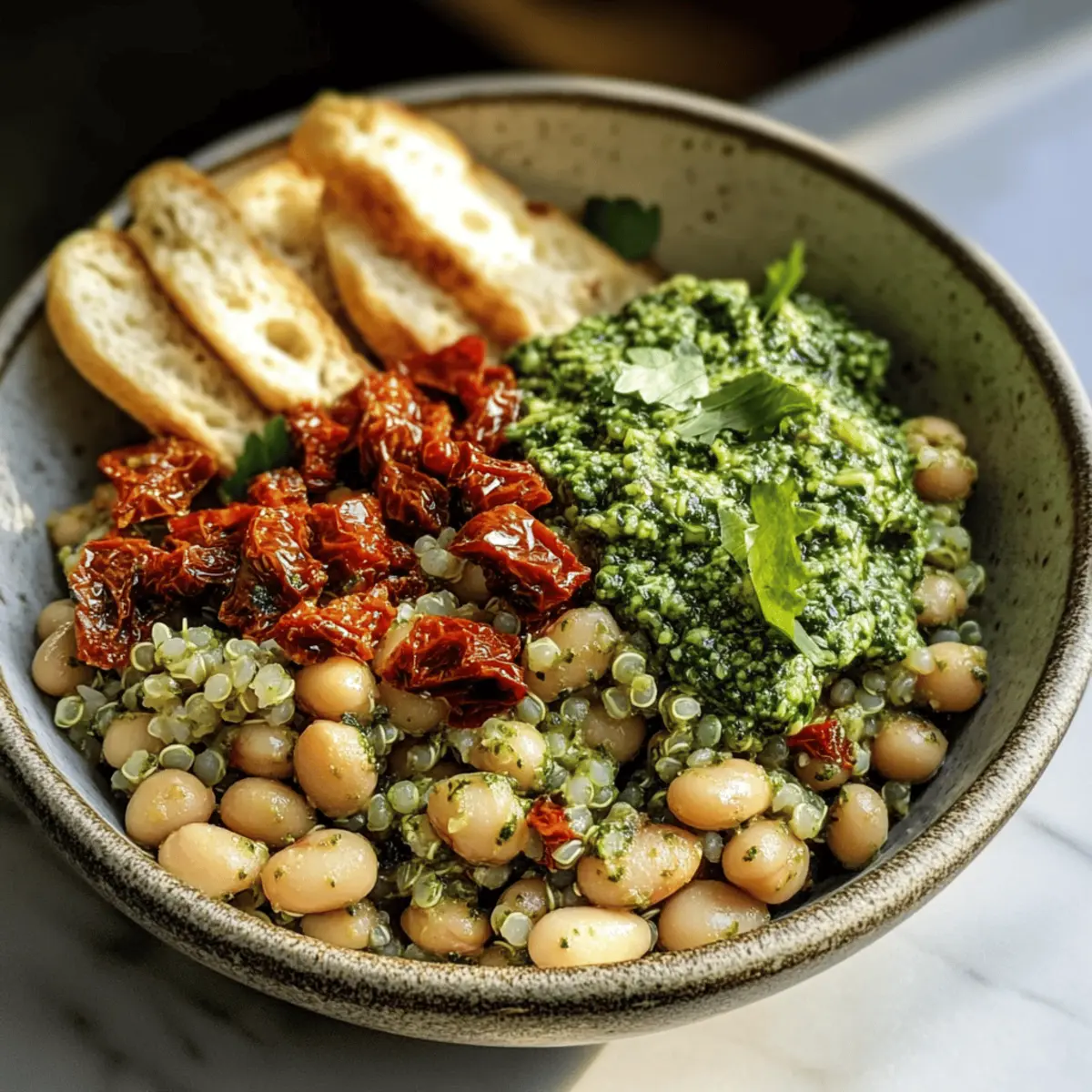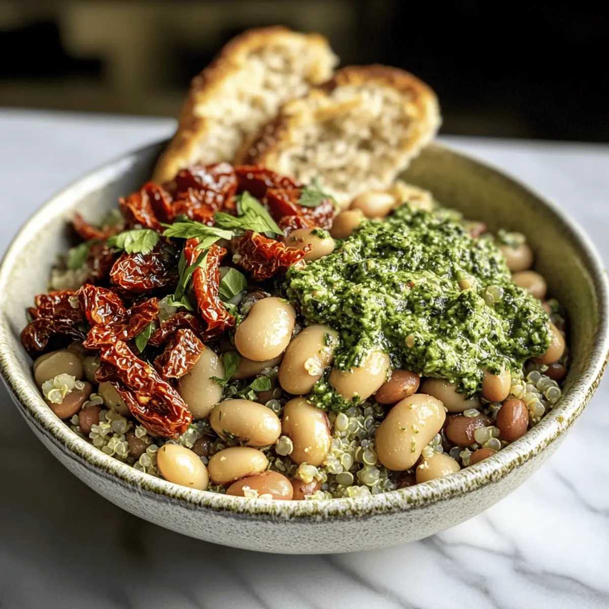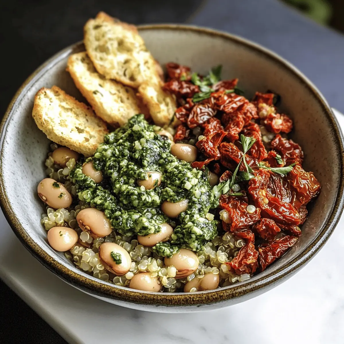 Beim Zubereiten von Mahlzeiten kann es manchmal zu einem kleinen Schockmoment kommen – man steht in der Küche und fragt sich, was man zaubern soll. Ich habe genau das mit einem leuchtenden Gericht namens „Spinach Pesto Butter Bean Lentil Quinoa Bowls mit getrockneten Tomaten“ erlebt. Diese vollen Schalen sind nicht nur vegan und glutenfrei, sie sind auch ein wahres Nährstoffpaket und bieten dir die perfekte Möglichkeit, deinen Heißhunger in weniger als 30 Minuten zu stillen. Stell dir vor, cremige Butterbohnen und herzhafte Linsen vereinen sich mit einer hausgemachten, nußfreien Spinach-Pesto und den süßen, würzigen Aromen getrockneter Tomaten. Das Ergebnis? Ein köstlicher Genuss, der sowohl Körper als auch Seele nährt und all deine Gäste beeindrucken wird. Möchtest du mehr über diese geschmackliche Entdeckung erfahren? Warum du dieses Rezept lieben wirst Einzigartiges Geschmackserlebnis: Die Kombination aus cremigen Butterbohnen und herzhaften Linsen wird durch das frisch zubereitete Spinats-Pesto und die intensiven getrockneten Tomaten zu einem Fest der Aromen. Einfache Zubereitung: In nur 30 Minuten zauberst du ein nahrhaftes Gericht, das perfekt für beschäftigte Tage geeignet ist. Vielseitigkeit: Probiere variierte Beilagen wie Knoblauch Butter Rinderfilet oder serviere es mit Crispy Tofu, um den Genuss zu bereichern! Nährstoffreich: Vollgepackt mit pflanzlichem Protein, Ballaststoffen und gesunden Fetten unterstützt dieses Gericht eine ausgewogene Ernährung. Crowd-Pleaser: Dieses bunte Gericht wird selbst die Skeptiker von veganer Küche begeistern und ist ideal für deine nächsten Gäste! Spinach Pesto Bowls Zutaten Für die Quinoa-Basis • Quinoa – Die perfekte Grundlage; sorgt für eine tolle Textur und Ballaststoffe. Verwende eine schnelle Kochvariante für weniger Wartezeit. • Butterbohnen – Verleihen Cremigkeit und einen buttrigen Geschmack; bei Bedarf können sie durch Kichererbsen ersetzt werden. • Linsen – Reich an Protein und Ballaststoffen; die Verwendung von Dosenlinsen spart Zeit. Für das Spinats-Pesto • Frischer Spinat – Hauptbestandteil des Pestos; auch gefrorener Spinat kann verwendet werden, jedoch variiert die Menge. • Frisches Basilikum – Unerlässlich für den authentischen Geschmack; getrocknetes Basilikum ist eine mögliche Alternative. • Frische Petersilie – Bringt Frische ins Pesto; sowohl italienische als auch krause Sorten sind geeignet. • Rohe Sonnenblumenkerne – Eine nußfreie Alternative zu traditionellen Pinienkernen; kann durch Cashews oder Pinienkerne ersetzt werden, wenn keine Allergie vorliegt. • Nährhefe – Gibt einen käseähnlichen Geschmack ohne Milchprodukte; kann weggelassen werden, wenn nicht verfügbar. • Minced Knoblauch – Für zusätzliche Tiefe; vorgehackten Knoblauch kannst du ebenfalls zur Vereinfachung verwenden. • Zitronensaft – Fügt Säure hinzu; frischer Zitronensaft ist ideal, aber auch abgefüllter tut seinen Dienst. • Olivenöl (EVOO) – Sorgt für reichhaltigen Geschmack im Pesto; wähle hochwertiges Öl für besten Geschmack. • Salz & Pfeffer – Grundlegende Gewürze; passe sie nach deinem Geschmack an. Für die Garnitur • Getrocknete Tomaten – Fügen eine süßliche, würzige Note hinzu; julienniert für einfache Handhabung. Step-by-Step Instructions for Spinat-Pesto Quinoa Bowl mit Bohnen und Linsen Step 1: Quinoa kochen Koche 1/2 Tasse Quinoa in einem Topf mit der doppelten Menge Wasser. Bring das Wasser zum Kochen und reduziere die Hitze auf niedrige Stufe. Lass die Quinoa 15 Minuten köcheln, bis sie weich und das Wasser vollständig aufgesogen ist. Danach nimm den Topf vom Herd und lass die Quinoa abgedeckt noch 5 Minuten ruhen, um sie locker zu machen. Step 2: Bohnen und Linsen vorbereiten Während die Quinoa kocht, öffne eine Dose Butterbohnen und eine Dose Linsen. Gieße diese ab und spüle sie unter kaltem Wasser ab, um überschüssiges Natrium zu entfernen. Setze sie zur Seite, damit sie für die Mischung in deiner Spinat-Pesto Quinoa Bowl bereitstehen. Step 3: Pesto zubereiten Für das Spinat-Pesto gib frischen Spinat, Basilikum, Petersilie, Knoblauch, Zitronensaft, Nährhefe, Sonnenblumenkerne, Olivenöl, Salz und Pfeffer in einen Mixer. Mixe alles auf hoher Stufe, bis die Mischung schön glatt ist. Wenn das Pesto zu dickflüssig ist, füge etwas mehr Olivenöl hinzu, um die gewünschte Konsistenz zu erreichen. Step 4: Zutaten kombinieren In einer großen Schüssel vermische die gekochte Quinoa, die Butterbohnen, die Linsen und die gehackten getrockneten Tomaten. Füge dann etwa 1/3 Tasse des frisch zubereiteten Spinat-Pestos hinzu und mische alles gut, bis die Zutaten gleichmäßig verteilt sind und das Pesto sie umhüllt. Step 5: Abschmecken und servieren Schmecke die Mischung mit zusätzlichem Salz und Pfeffer ab. Teile die Spinat-Pesto Quinoa Bowl auf Schalen auf und serviere sie warm. Diese köstlichen Schalen passen hervorragend zu gegrilltem glutenfreiem Brot, Naan oder Fladenbrot als Beilage für ein rundes Dinner-Erlebnis. Expert Tips for Spinach Pesto Quinoa Bowl Frische Kräuter verwenden: Verleihe deinem Pesto einen intensiveren Geschmack, indem du frische Kräuter anstelle von getrockneten verwendest. Pesto-Konsistenz anpassen: Wenn dein Pesto zu dick ist, füge schrittweise mehr Olivenöl hinzu, bis die gewünschte Cremigkeit erreicht ist. Vorbereitung erleichtern: Nutze Dosenlinsen und Butterbohnen, um die Zubereitungszeit zu verkürzen; so bist du schneller mit deinem Spinach Pesto Quinoa Bowl fertig. Variation ausprobieren: Experimentiere mit verschiedenen Hülsenfrüchten wie Kichererbsen oder schwarzen Bohnen für unterschiedliche Texturen in diesem nahrhaften Rezept. Richtig lagern: Bewahre Reste in einem luftdichten Behälter im Kühlschrank auf und genieße die köstlichen Aromen für bis zu drei Tage! Was passt gut zu Spinach Pesto Butter Bean Lentil Quinoa Bowls? Stelle dir vor, ein Farbspektrum aus Aromen und Text