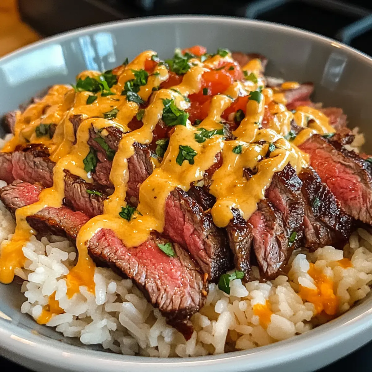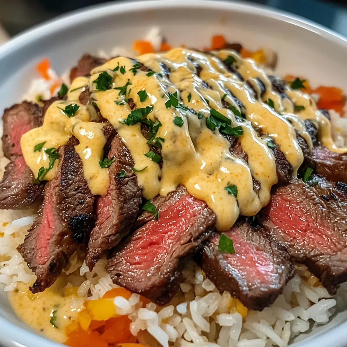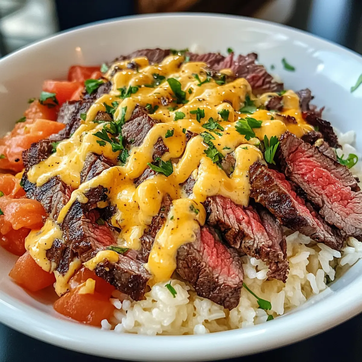 Egal, ob ich nach einem langen Tag nach Hause komme oder nur Lust auf etwas richtig Leckerem habe, das Steak Queso Reis ist mein unverzichtbarer Begleiter. Diese herzhafte Schüssel vereint zartes Steak, cremigen Queso und aromatischen Reis zu einem wahren Gaumenschmaus, der in nur einer Pfanne zubereitet wird. Es ist das perfekte Rezept, um einem hektischen Abend Abhilfe zu schaffen – schnell zubereitet und dabei ganz nach dem Geschmack deiner Familie anpassbar. Zudem eignet sich dieses Gericht wunderbar als tröstliche Mahlzeit, die alle nach mehr verlangen lässt. Neugierig, wie du dieses köstliche Erlebnis in deiner eigenen Küche kreieren kannst? Warum wirst du dieses Rezept lieben? Einfachheit: Das Rezept für Steak Queso Reis ist unkompliziert und schnell zuzubereiten – perfekt für hektische Wochentage! Wohltuende Aromen: Die Kombination aus zartem Steak und cremigem Queso sorgt für ein wahres Geschmackserlebnis, das die Gemüter erwärmt. Vielseitigkeit: Du kannst die Zutaten nach Lust und Laune variieren, sei es mit Hühnchen oder einer vegetarischen Variante mit schwarzen Bohnen. Minimaler Aufwand: Da alles in einer einzigen Pfanne zubereitet wird, bleibt der Abwasch überschaubar und die Freude am Essen steht im Vordergrund. Beliebtheit: Dieses Gericht ist ein Hit beim Mittag- oder Abendessen – es ist so köstlich, dass deine Familie mehr verlangen wird! Weitere tolle Ideen findest du auch in meinem Rezept für Balsamico Steak Gorgonzola und Tropisches Ananas Hähnchen mit Reis. Steak Queso Reis Zutaten • Entdecke die köstlichen Zutaten für dein Steak Queso Reis, das immer ein Hit bei der Familie ist. Für das Steak Steak (Ribeye, Sirloin oder Flank) – liefert zartes, geschmackvolles Protein; du kannst auch gegrilltes Hühnchen oder sautierte Garnelen verwenden. Olivenöl – zum Anbraten des Steaks; jede hitzebeständige Kochöl-Variante funktioniert prima. Für den Reis Reis (Jasmin oder Basmati) – ist die perfekte Basis, die die Aromen gut aufnimmt; verwende Langkornreis für eine fluffige Textur. Rinderbrühe – sorgt für tiefen Geschmack; kannst sie durch Gemüsebrühe ersetzen, um es vegetarisch zu gestalten. Butter – bringt Reichhaltigkeit; optional, wenn du eine milchfreie Alternative verwendest. Salz, schwarzer Pfeffer, Knoblauchpulver, Paprika, Kreuzkümmel – die Gewürzmischung, die den Geschmack des Steaks verstärkt; nach Belieben anpassen. Für die Queso-Sauce Schlagsahne und Frischkäse – bilden die Basis für die cremige Queso-Sauce; ersetze sie durch eine milchfreie Variante, wenn gewünscht. Cheddar- und Monterey Jack Käse – sorgen für Geschmack und Cremigkeit in der Queso; verwenden vorgeriebenen Käse für praktische Zubereitung oder veganen Käse als Ersatz. Für die Garnierung Optionales Topping (Koriander, Tomaten, Jalapeños, saure Sahne) – verleiht der Geschmackskombination den letzten Schliff; frische Kräuter oder deine Lieblingssalsa sorgen für zusätzliche Frische. Schritt-für-Schritt-Anleitung für Steak Queso Reis Step 1: Reis zubereiten Bringe in einem mittelgroßen Topf die Rinderbrühe zusammen mit Butter, Salz, Knoblauchpulver und Paprika zum Kochen. Füge dann den Reis hinzu, reduziere die Hitze, decke den Topf ab und lasse den Reis 15-18 Minuten köcheln, bis die Flüssigkeit aufgesogen ist. Nimm den Topf vom Herd und lockere den Reis mit einer Gabel auf, bevor du ihn beiseitest stellst. Step 2: Steak braten Würze die Steakstreifen großzügig mit Salz, Pfeffer, Knoblauchpulver, Paprika und Kreuzkümmel. Erhitze in einer großen Pfanne etwas Olivenöl bei mittlerer bis hoher Hitze. Brate das Steak 3-4 Minuten pro Seite, bis es schön gebräunt ist und den gewünschten Gargrad erreicht hat. Nimm das Steak aus der Pfanne und lasse es 5 Minuten ruhen, damit sich die Säfte verteilen können. Step 3: Queso-Sauce herstellen In einem kleinen Topf erwärmst du die Schlagsahne bei niedriger Hitze. Rühre den Frischkäse unter, bis er geschmolzen ist, und füge dann nach und nach den Cheddar- und Monterey Jack Käse hinzu, bis die Mischung schön cremig und glatt ist. Würze die Sauce mit etwas Knoblauchpulver und Cayennepfeffer für zusätzlichen Geschmack und halte sie warm, während du die nächsten Schritte machst. Step 4: Schüssel zusammenstellen Verteile den lockeren Reis gleichmäßig auf Servierschalen. Platziere die Steakstreifen darauf und beträufle alles großzügig mit der warmen Queso-Sauce. Garniere die Schüsseln nach Belieben mit frischem Koriander, gehackten Tomaten, Jalapeños oder einem Klecks saurer Sahne. Serviere das Steak Queso Reis sofort für ein unvergessliches Geschmackserlebnis. Aufbewahrungstipps für Steak Queso Reis Zimmertemperatur: Halte das Steak Queso Reis nicht länger als 2 Stunden bei Zimmertemperatur, um die Lebensmittelqualität zu sichern. Kühlschrank: Bewahre die einzelnen Komponenten, wie Steak, Reis und Queso-Sauce, in luftdichten Behältern im Kühlschrank für bis zu 3 Tage auf, um die Frische zu erhalten. Gefrierer: Du kannst die Queso-Sauce auch in einem gefrierfesten Behälter bis zu 3 Monate einfrieren. Vor dem Servieren einfach über Nacht im Kühlschrank auftauen und sanft erhitzen. Wiedererwärmung: Erhitze das Steak Queso Reis in der Mikrowelle oder in einer Pfanne, bis es gleichmäßig warm ist. Füge ggf. einen Schuss Brühe oder Sahne hinzu, um die Sauce wieder cremig zu machen. Steak Queso Reis Variationen und Alternativen Lass deiner Kreativität freien Lauf und passe dieses Rezept nach deinem Geschmack an! Hier sind einige köstliche Variationen, die dir helfen, noch mehr aus deinem Steak Queso Reis herauszuholen. Hühnchen: Ersetze das Steak durch gegrilltes Hühnchen für eine leichtere Option, die ebenso viel Geschmack bietet. Garnelen: Tausche Steak gegen sautierte Garnelen aus; ihre zarte Textur passt perfekt zur cremigen Queso-Sauce. Vegetarisch: Verwandle es in ein vegetarisches Gericht, indem du das Steak durch schwarze Bohnen und gegrilltes Gem