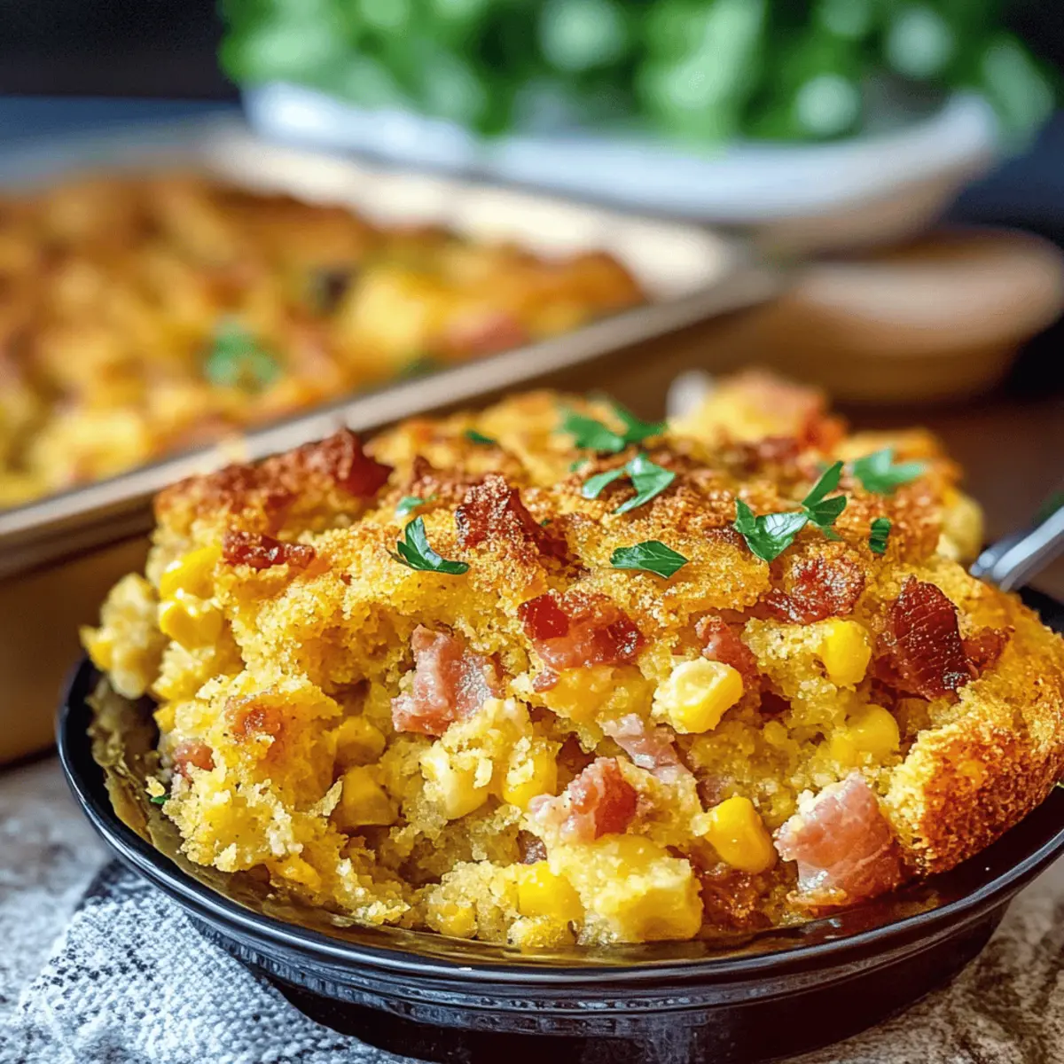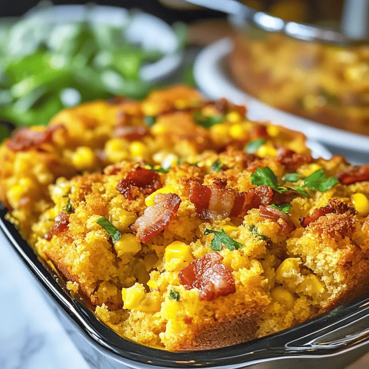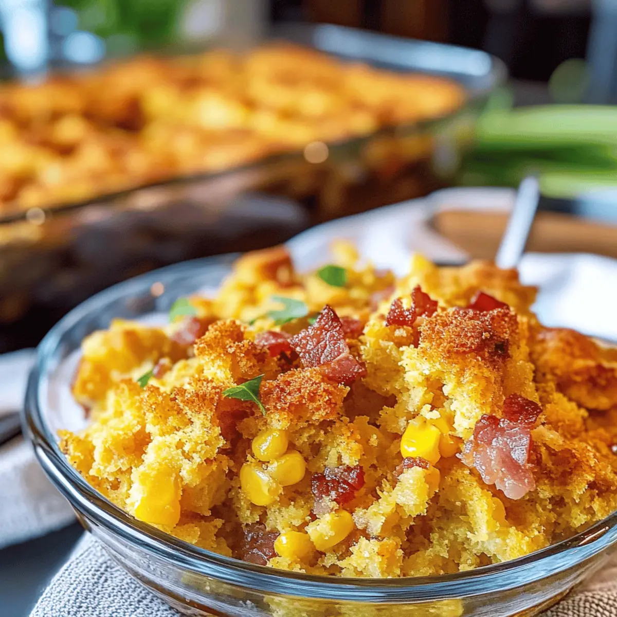 In der kühnen Welt der südlichen Küche gibt es einen Star, der oft im Schatten der Hauptgerichte steht: das Southern Cornbread Dressing. Doch dieses Gericht ist mehr als nur ein einfacher Beilagenklassiker! Angereichert mit knusprigem Speck und cremigem Mais, bringt es die perfekte Balance aus Textur und Geschmack auf den Tisch. Die Kombination aus saftigem Brot und aromatischen Gemüsen macht diese Dressing zu einer unschlagbaren Wahl für Feiertage und festliche Anlässe. Es ist nicht nur schnell zubereitet, sondern begeistert auch jeden, der es probiert. Wer kann da widerstehen, wenn eine köstliche, duftende Schüssel rund um die Festtafel aufwartet? Bereitet euch darauf vor, eure Gäste mit dieser herzhaften, traditionell inspirierten Speise zu überraschen – ich verspreche euch, sie werden um das Rezept bitten! Warum sollten Sie dieses Rezept lieben? Einfache Zubereitung: Die Schritte sind unkompliziert und erfordern keinerlei komplizierte Kochtechniken. Reichhaltiger Geschmack: Mit knusprigem Speck und aromatischen Kräutern verwandelt diese Füllung jedes Festessen in ein Geschmackserlebnis. Vielseitig einsetzbar: Perfekt als Beilage zu Truthahn oder als Teil eines Buffets, ergänzt es jede Mahlzeit. Bestehende Klassiker aufpeppen: Diese Variante verleiht dem traditionellen Gericht einen modernen Twist, der Ihre Gäste begeistern wird. Und wenn Sie mehr über das Zubereiten von Klassikern mit einem modernen Touch erfahren möchten, sollten Sie sich meine anderen Rezepte ansehen! Zutaten für die Südliche Maisbrotfüllung • Diese Zutatenliste wird Ihnen helfen, die perfekte Südliche Maisbrotfüllung zuzubereiten! Für die Füllung Bacon – sorgt für würzigen Geschmack und knusprige Textur; verwenden Sie normalen Speck für das beste Ergebnis. Süße Zwiebel – bringt Süße und Geschmackstiefe; kann durch gelbe Zwiebel ersetzt werden. Sellerie – verleiht Frische und Crunch; kein direkter Ersatz möglich, da er für die Textur wichtig ist. Gemahlener Salbei – gibt eine warme, erdige Note; kann durch Thymian für eine andere Geschmacksnote ersetzt werden. Kochsalz – hebt alle Aromen hervor; verwenden Sie auch Meersalz als Alternative. Schwarzer Pfeffer – fügt eine milde Schärfe hinzu; passen Sie die Menge nach Belieben an. Knoblauch – bringt ein duftendes Aroma; frischer, gehackter Knoblauch ist ideal. Maisbrot – bildet die Basis und sorgt für Textur; verwenden Sie ungesüßtes, gekauftes oder selbstgemachtes. Eintags-Weißbrot – gibt Struktur und saugt Feuchtigkeit auf; kann durch Sauerteigbrot ersetzt werden. Petersilie – bringt frische Kräuternote; kann durch Schnittlauch ersetzt werden, falls nicht verfügbar. Eier – binden alle Zutaten zusammen; für eine vegane Variante einfach Flax-Eier verwenden. Cremiger Mais – hält die Füllung feucht und fügt Süße hinzu; unbedingt verwenden, da Dosenmais kein Ersatz ist. Ungesalzene Hühnerbrühe – sorgt für Feuchtigkeit und Geschmack; Gemüsebrühe als fleischloser Ersatz geeignet. Salzbutter – verleiht dem Gericht eine reichhaltige Note; nutzen Sie ungesalzene Butter oder Olivenöl für eine gesündere Option. Schritt-für-Schritt-Anleitung für die Südliche Maisbrotfüllung mit Speck und Sahne-Mais Step 1: Ofen vorheizen und Backform vorbereiten Heizen Sie den Ofen auf 175 °C vor und fetten Sie eine 23×33 cm große Backform mit Antihaftspray ein. Dies sorgt dafür, dass Ihre Südliche Maisbrotfüllung gleichmäßig gart und sich später leicht aus der Form lösen lässt. Step 2: Speck anbraten Braten Sie den gewürfelten Speck in einer großen Pfanne bei mittlerer Hitze, bis er knusprig ist (ca. 15 Minuten). Rühren Sie regelmäßig um, um ein gleichmäßiges Braten zu gewährleisten. Lassen Sie den Speck auf einem Küchentuch abtropfen und bewahren Sie das Fett in der Pfanne für die nächste Zubereitung auf. Step 3: Gemüse sautieren Geben Sie die gehackte Zwiebel und den Sellerie in die gleiche Pfanne mit dem Speckfett. Fügen Sie gemahlenen Salbei, Salz und Pfeffer hinzu und sautieren Sie die Mischung, bis die Zwiebel durchsichtig ist (ca. 10 Minuten). Geben Sie anschließend den Knoblauch für weitere 30 Sekunden dazu, bis er duftet. Step 4: Brotmischung vorbereiten In einer großen Schüssel kombinieren Sie das zerbröselte Maisbrot, das gewürfelte Weißbrot, den knusprigen Speck, die sautierten Gemüse und die gehackte Petersilie. Mischen Sie alles gründlich, sodass sich die Zutaten gut verteilen und die Brotstücke feucht werden. Step 5: Eier-Mischung anrühren In einer separaten Schüssel die Eier aufschlagen und gut verquirlen. Fügen Sie den cremigen Mais und 500 ml Hühnerbrühe hinzu und rühren Sie alles gut zusammen, bis die Mischung gut vermengt ist. Diese Mischung wird die Füllung binden und für zusätzliche Feuchtigkeit sorgen. Step 6: Zutaten kombinieren Gießen Sie die Eier-Mischung über die Brotmischung und verrühren Sie alles ordentlich. Passen Sie die Konsistenz an, indem Sie weitere Hühnerbrühe hinzufügen, bis die Mischung feucht, aber nicht zu nass ist. Dies ist entscheidend, um eine schmackhafte Südliche Maisbrotfüllung zu erhalten. Step 7: Füllung in die Backform geben Füllen Sie die vorbereitete Backform mit der Mischung und drücken Sie diese leicht an, um eine gleichmäßige Schicht zu erhalten. Gießen Sie geschmolzene Butter über die Füllung, um zusätzlichen Geschmack und eine goldene Kruste zu erzielen. Step 8: Backen und abkühlen lassen Backen Sie die Südliche Maisbrotfüllung für 60-70 Minuten, bis sie fest ist und eine goldene Oberfläche hat. Lassen Sie das Gericht nach dem Backen 15-20 Minuten ruhen, bevor Sie es servieren. Dadurch können sich die Aromen setzen und die Textur stabilisieren. Was passt zu Südlicher Maisbrotfüllung mit Speck und Sahne-Mais? Die perfekte Kombination aus herzhaften und süßen Aromen macht jede Mahlzeit unvergesslich und sorgt für Harmonien am Tisch. Gegrilltes Hähnchen: Die saftigen Aromen des Hä