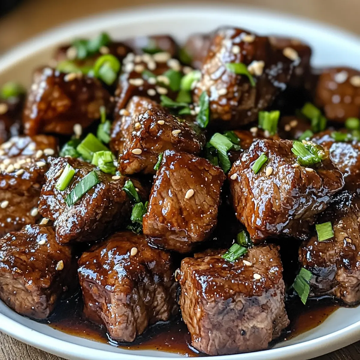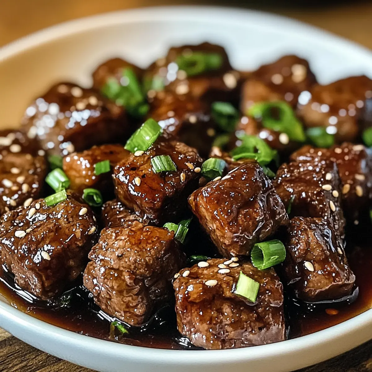Nimm die Pfanne vom Herd und garniere die süßen und klebrigen Steakstücke mit frisch gehackten Frühlingszwiebeln und Sesamkörnern. Serviere sie sofort, damit sie warm und glänzend sind. Diese köstlichen Bissen sind perfekt als Hauptgericht oder Snack, ideal für jede Gelegenheit.