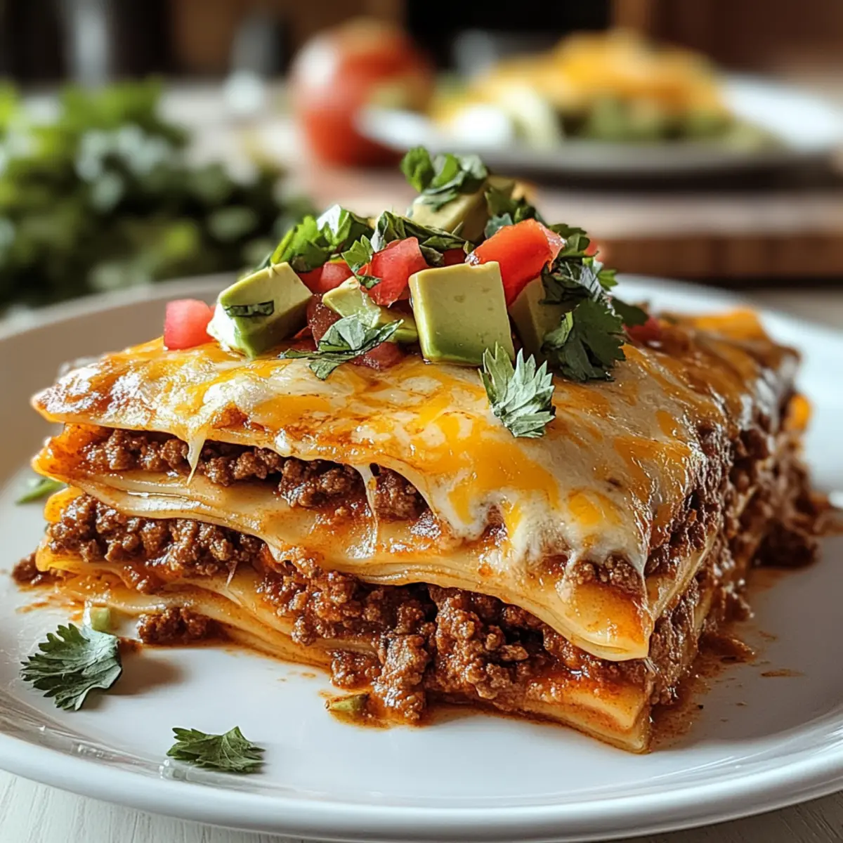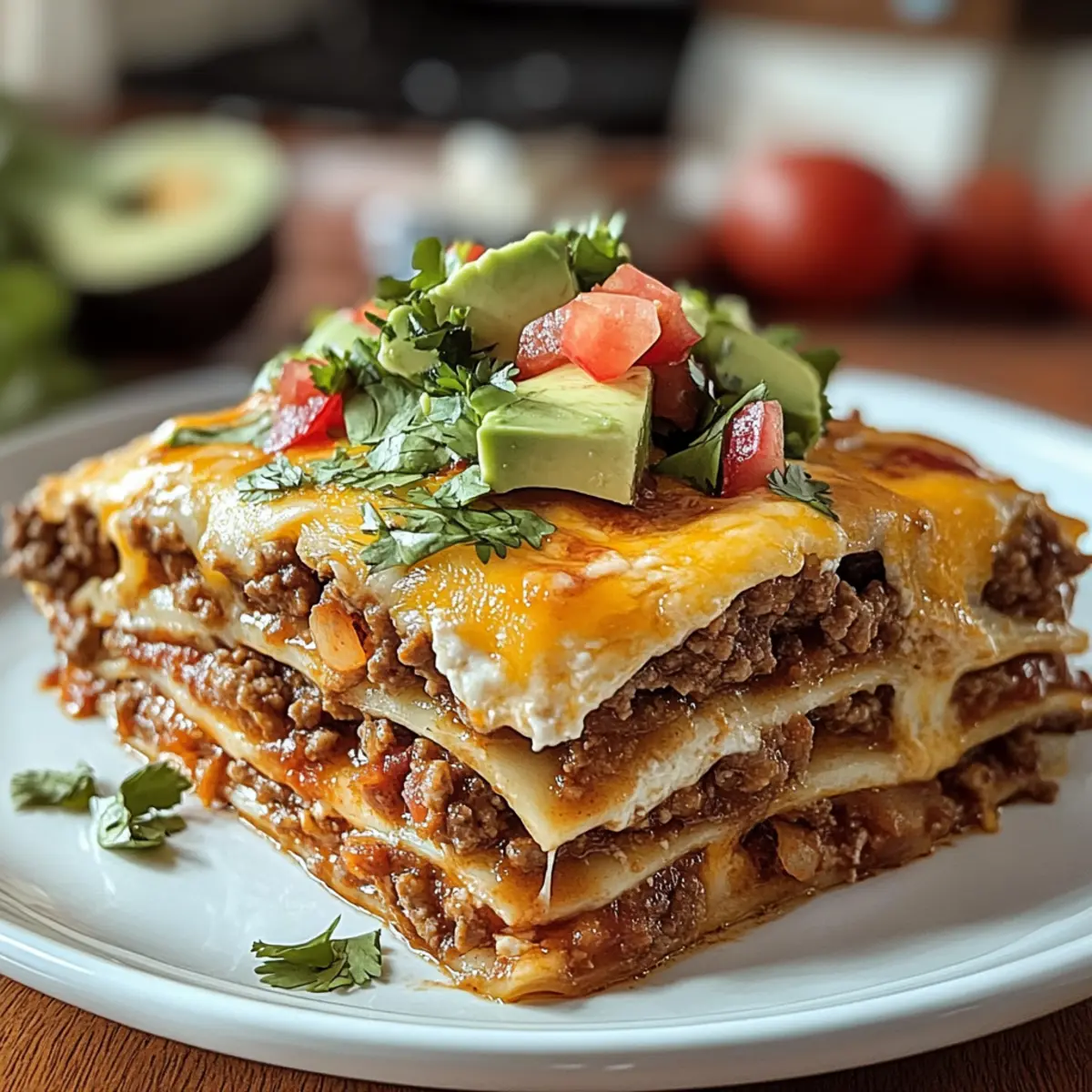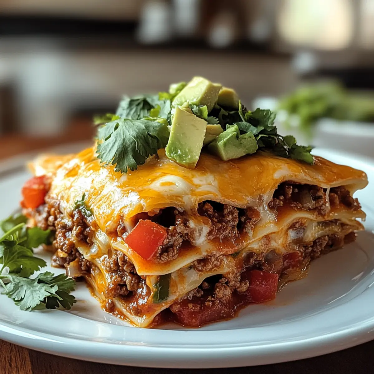 Jeden von uns hat diese Tage, an denen das Kochen nicht nur eine Notwendigkeit, sondern ein kleiner Kreativitätsausbruch sein sollte. Warum also nicht die Versuchung der klassischen Lasagne mit den lebendigen Aromen von Tacos verbinden? Mit dieser Easy Taco Lasagna bringe ich euch ein einfaches und köstliches Abendessen, das nicht nur schnell zubereitet ist, sondern auch als wahrer Publikumsliebling gilt. Schichtet köstlichen Käse, würziges Rinderhack und frische Zutaten zwischen Tortillas und genießt die perfekte Mischung aus Komfort und Abenteuer. Egal, ob ihr Gäste habt oder einfach nur eine stressige Woche hinter euch lassen wollt, dieses Gericht wird euch in der Küche zum Star machen. Wer kann schon einem duftenden Biss widerstehen? Lasst uns entdecken, welche überraschenden Variationen und Geheimtipps diese Rezeptperle noch bereit hält! Warum ist Taco Lasagne so beliebt? Einfachheit: Dieses Rezept verlangt nur grundlegende Kochkenntnisse und ist in kürzester Zeit zubereitet, ideal für stressige Abende. Vielfältig: Du kannst die Zutaten ganz nach deinem Geschmack anpassen, ob vegetarisch oder mit mehr Würze – die Möglichkeiten sind endlos! Ein Publikumsliebling: Mit seinen üppigen Käseschichten und dem würzigen Rinderhack ist es ein Hit auf jeder Feier, egal ob im kleinen Kreise oder mit großen Gästen. Komfort und Abenteuer: Es kombiniert die besten Eigenschaften von Lasagne und Tacos – ein echtes Geschmackserlebnis! Überreste verwenden: Perfekt zum Vorbereiten, die Reste lassen sich hervorragend aufbewahren oder aufwärmen. Dieser Mix aus Italien und Mexiko ist eine wahre Gaumenfreude, die nicht nur deinen Hunger stillt, sondern auch deinen kreativen Geist anregt! Taco Lasagne Zutaten • Die Basis für ein köstliches Abendessen! Für die Füllung Rinderhackfleisch – sorgt für eine proteinreiche und würzige Grundlage. Eine vegetarische Option können sautierte Gemüse oder pflanzliches Hackfleisch sein. Zwiebel, gewürfelt – bringt aromatische Tiefe; gelbe oder weiße Zwiebelsorten passen hervorragend. Knoblauch – verstärkt den Geschmack; frischer Knoblauch ist bevorzugt für beste Ergebnisse. Taco-Gewürz – sorgt für das essentielle Taco-Aroma; selbstgemacht erlaubt es, die Schärfe individuell anzupassen. Refried Beans – bildet eine cremige Schicht, die zusätzliche Textur hinzufügt; schwarze Bohnen können ebenfalls verwendet werden. Für die Schichten Weizentortillas – geben Struktur und halten die Schichten zusammen; Mais-Tortillas können verwendet werden, benötigen aber eventuell ein kurzes Einweichen. Salsa – bringt Feuchtigkeit und eine würzige Note ein; wähle zwischen milder, mittlerer oder scharfer Salsa, abhängig vom gewünschten Schärfegrad. Geriebener Cheddar- und Monterey Jack-Käse – kreiert eine schmelzige und reichhaltige Käsekruste; jede schmelzfähige Käsesorte ist willkommen. Für das Topping Frischer Koriander, Avocado und Frühlingszwiebeln – diese Toppings fördern Frische und Geschmacksvielfalt; optional, aber sehr empfehlenswert! Mit all diesen Zutaten zauberst du eine unwiderstehliche Taco Lasagne, die die Herzen deiner Familie im Sturm erobern wird! Schritt-für-Schritt-Anleitung für Taco Lasagne Step 1: Ofen vorheizen Heize deinen Ofen auf 190 °C vor. Während der Ofen sich aufheizt, kannst du alle Zutaten vorbereiten, um den Kochprozess zu beschleunigen. Das Vorheizen ist entscheidend, damit die Taco Lasagne gleichmäßig gart und der Käse wunderbar schmilzt. Step 2: Rinderhack anbraten Erhitze eine große Pfanne bei mittlerer Hitze und füge das Rinderhackfleisch, die gewürfelte Zwiebel und den gehackten Knoblauch hinzu. Brate die Mischung etwa 5-7 Minuten lang an, bis das Rindfleisch braun und durchgegart ist. Vergiss nicht, überschüssiges Fett abzugießen, um eine fettige Lasagne zu vermeiden. Step 3: Taco-Gewürz hinzufügen Streue das Taco-Gewürz über die Fleischmischung und füge einen Schuss Wasser hinzu. Rühre alles gut um und lasse es für weitere 2-3 Minuten köcheln, damit die Gewürze ihre Aromen entfalten können. Diese Mischung wird das Herzstück deiner Taco Lasagne ausmachen. Step 4: Erste Schicht vorbereiten Fette eine große Auflaufform mit etwas Öl ein. Beginne, indem du die Refried Beans gleichmäßig auf dem Boden der Form verteilst. Diese cremige Schicht sorgt nicht nur für Geschmack, sondern auch für eine angenehme Textur in deiner Taco Lasagne. Step 5: Tortillas schichten Lege die Weizentortillas direkt über die Schicht der Refried Beans. Achte darauf, dass sie gut nebeneinander liegen und den Boden vollständig abdecken. Diese Struktur ist wichtig, um die verschiedenen Schichten zusammenzuhalten und die typischen Lasagnen-Elemente beizubehalten. Step 6: Füllung und Käse hinzufügen Verteile die Hälfte der Rinderhackgemisch und dann die Hälfte des geriebenen Cheddar- und Monterey Jack-Käses gleichmäßig über die Tortillas. Diese Schicht sorgt für die würzige Tiefe deiner Taco Lasagne und verleiht dem Gericht ein köstliches Käsearoma. Step 7: Salsa und Wiederholung Gieße eine Schicht Salsa über die Käseschicht. Wiederhole die vorherigen Schritte, indem du erneut Tortillas, die restliche Fleischmischung, Käse und Salsa hinzufügst. Diese wiederholten Schichten sind entscheidend für den Aufbau von Geschmack und Textur in deiner Taco Lasagne. Step 8: Abschluss der Schichtung Für die letzte Schicht, lege erneut eine Schicht Tortillas auf und bedecke die Oberseite mit dem restlichen Käse. Diese Käseschicht wird im Ofen schön schmelzen und eine goldene, leckere Kruste bilden, die das Gericht vollendet. Step 9: Backen Decke die Auflaufform mit Aluminiumfolie ab und backe die Taco Lasagne für 20 Minuten im vorgeheizten Ofen. Nach dieser Zeit entferne die Folie und lasse die Lasagne für weitere 10 Minuten backen, bis sie sprudelt und die Oberseite goldbraun ist. Step 10: Lassen Sie es ruhen Nimm die Taco Lasagne aus dem Ofen und lasse sie für einig